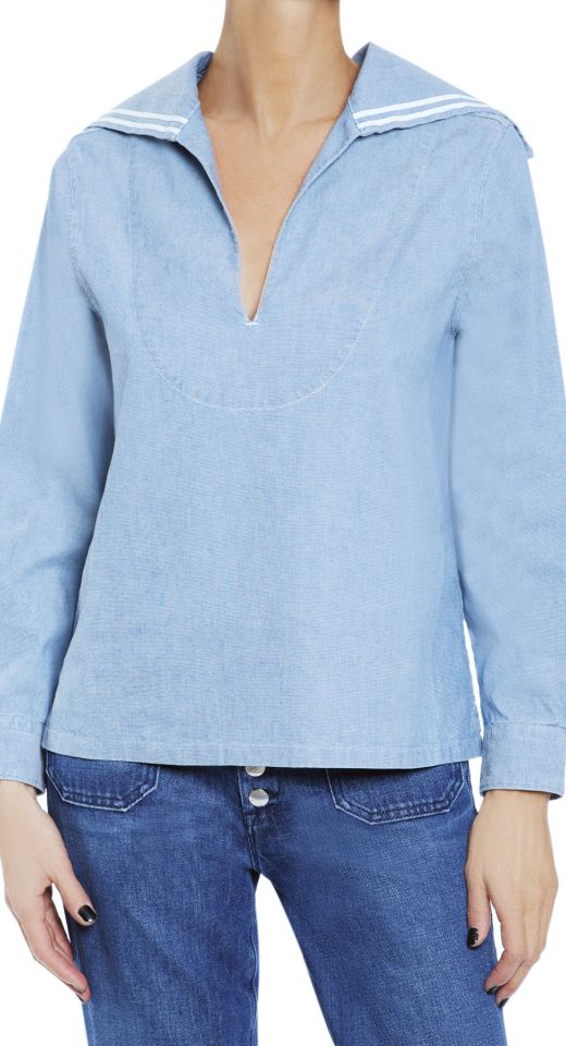 Envie de prendre le large? On se la joue marin d’eau douce avec la blouse en chambray Ariel, qui reprend tous les codes de la marque Seafarer.