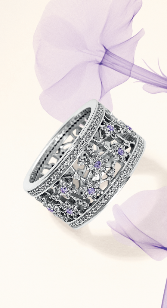 Délicate et féminine, la bague Myosotis de Pandora célèbre le printemps avec son motif floral et son esprit dentelle fine.