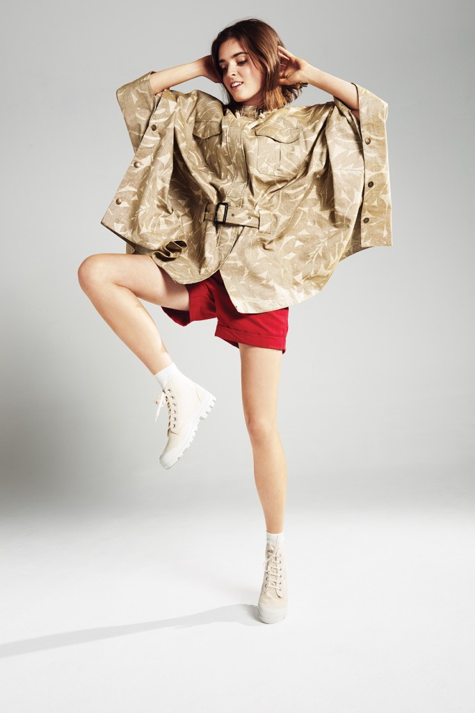 Cette saison on se couvre d’une veste entre la cape et le kimono, à l’imprimé végétal. En plus d’être esthétique, la matière ultra respirante composée d’un mélange de coton et de lin, protège aussi des intempéries.