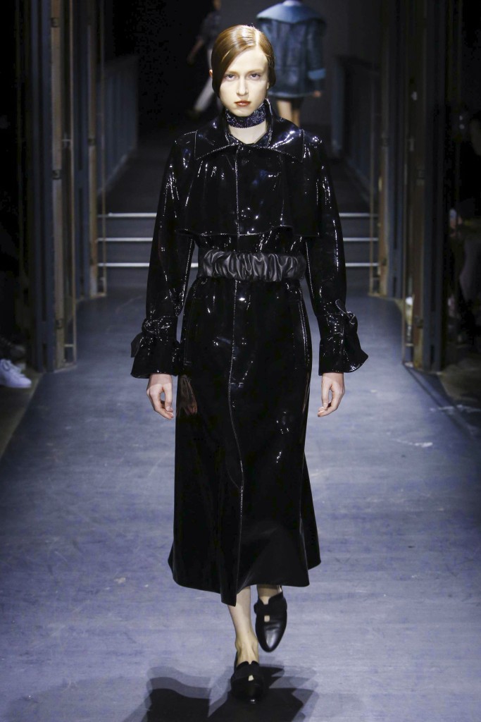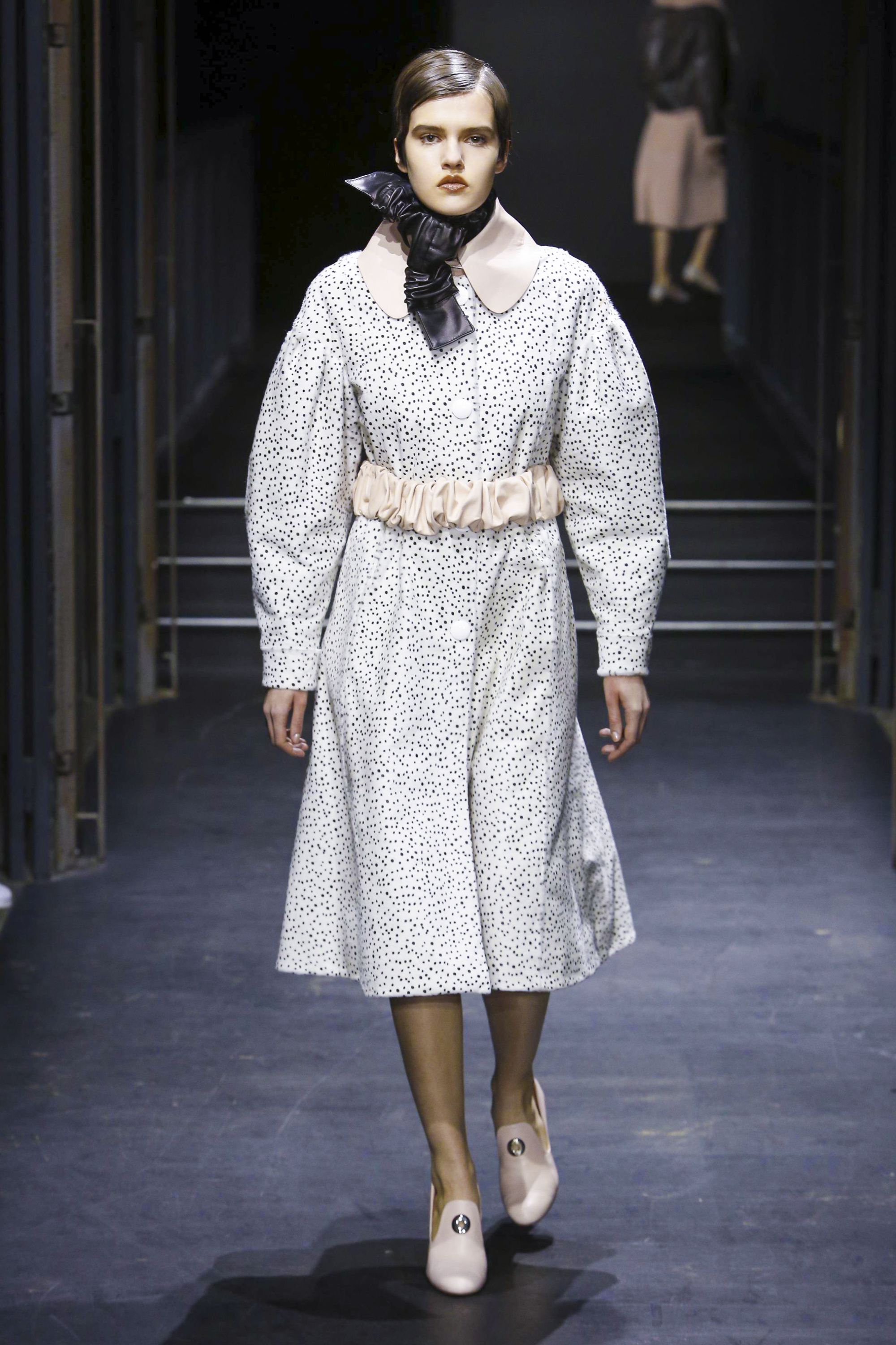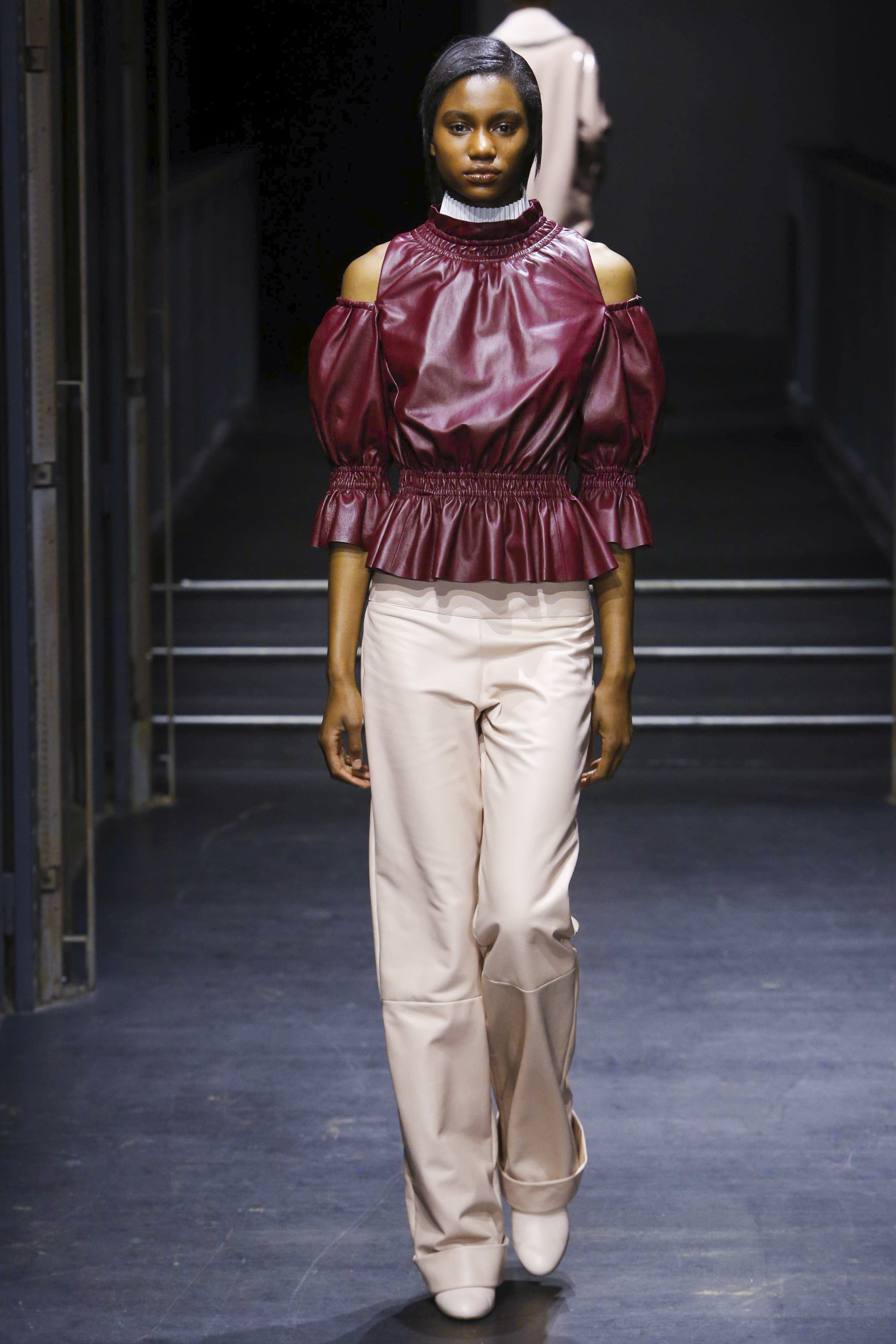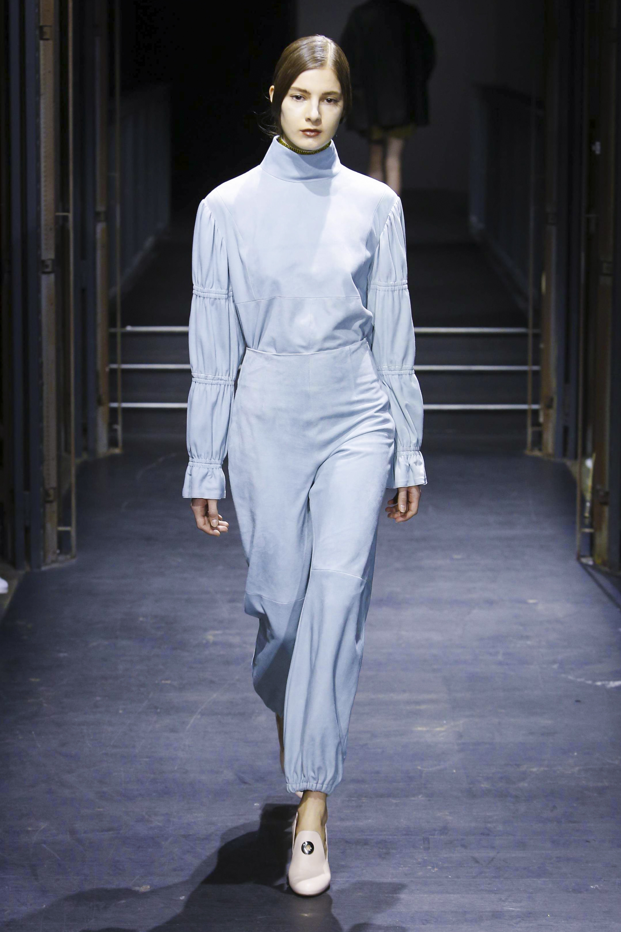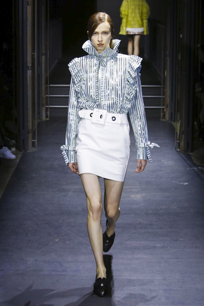 Les manches des trenchs font écho aux années 40 de par leur forme d’un style nouveau, elles deviennent ainsi plus féminines grâce aux surfaces plissées. Des épaules à effet tombant et des manches dotées de franges en cuir verni extrêmement longues caractérisent le nouveau bomber. Des cols resserrés, rappelant ceux des chemises des écolières, encadrent le visage. Cette rigueur crée un contraste fort avec les pantalons palazzo ou à pattes d’éléphant extra-larges.