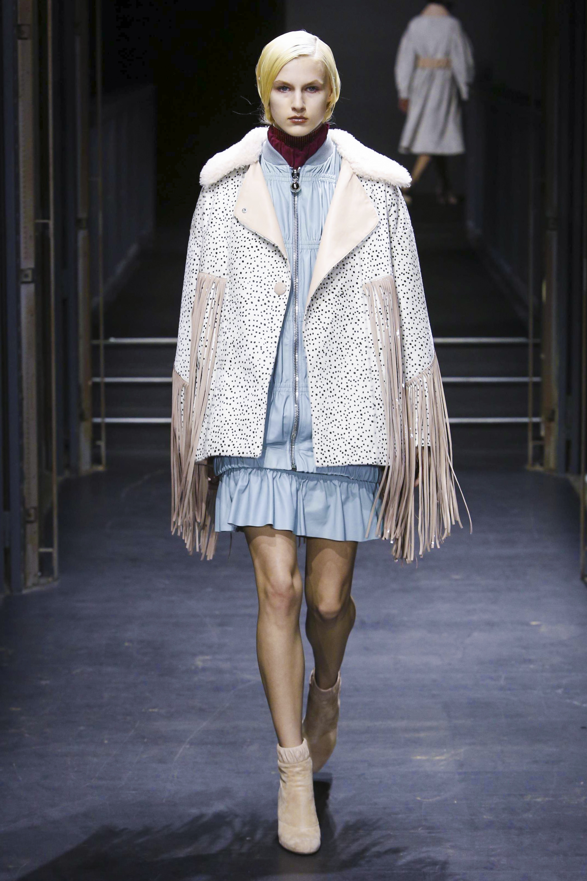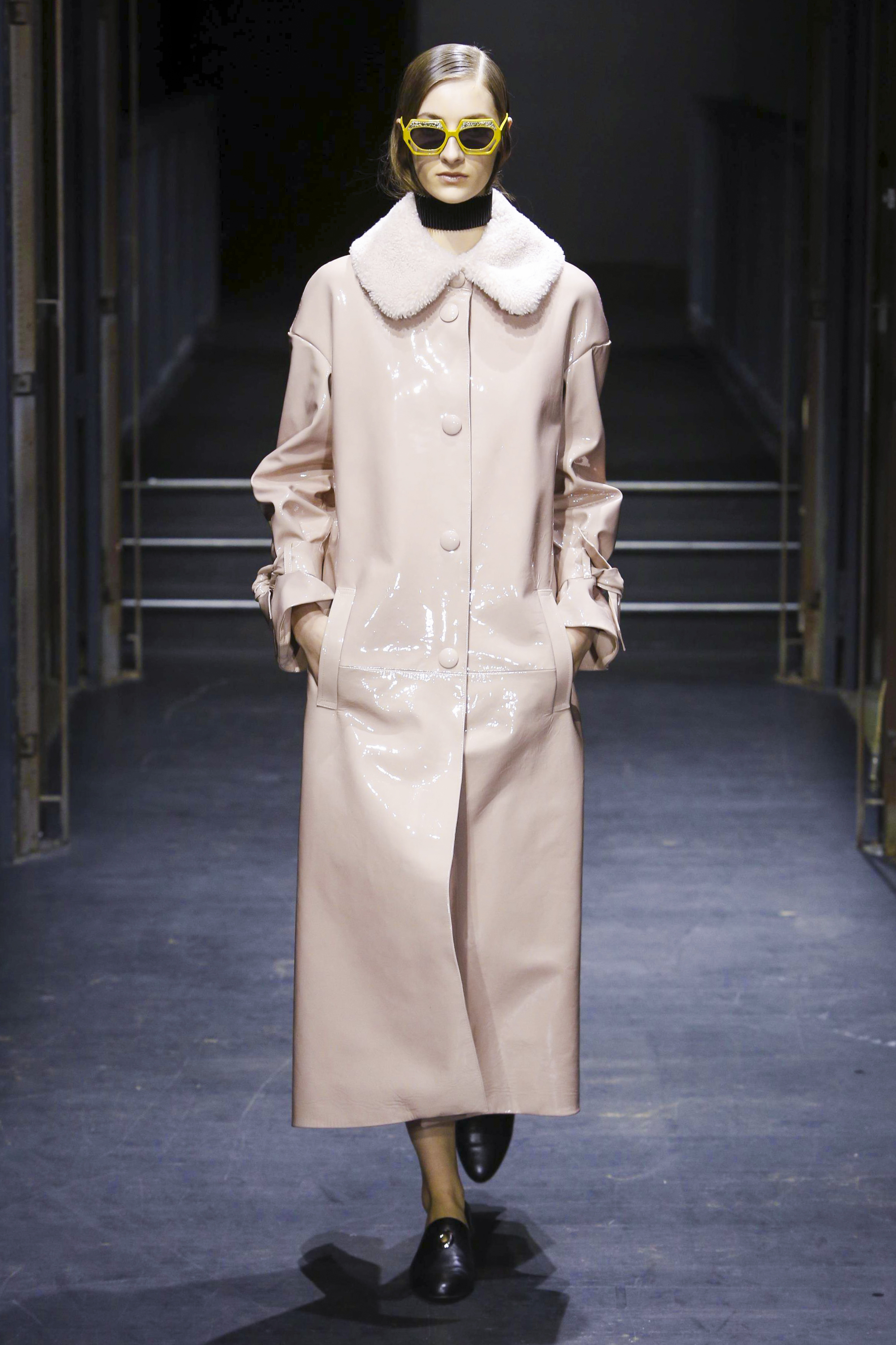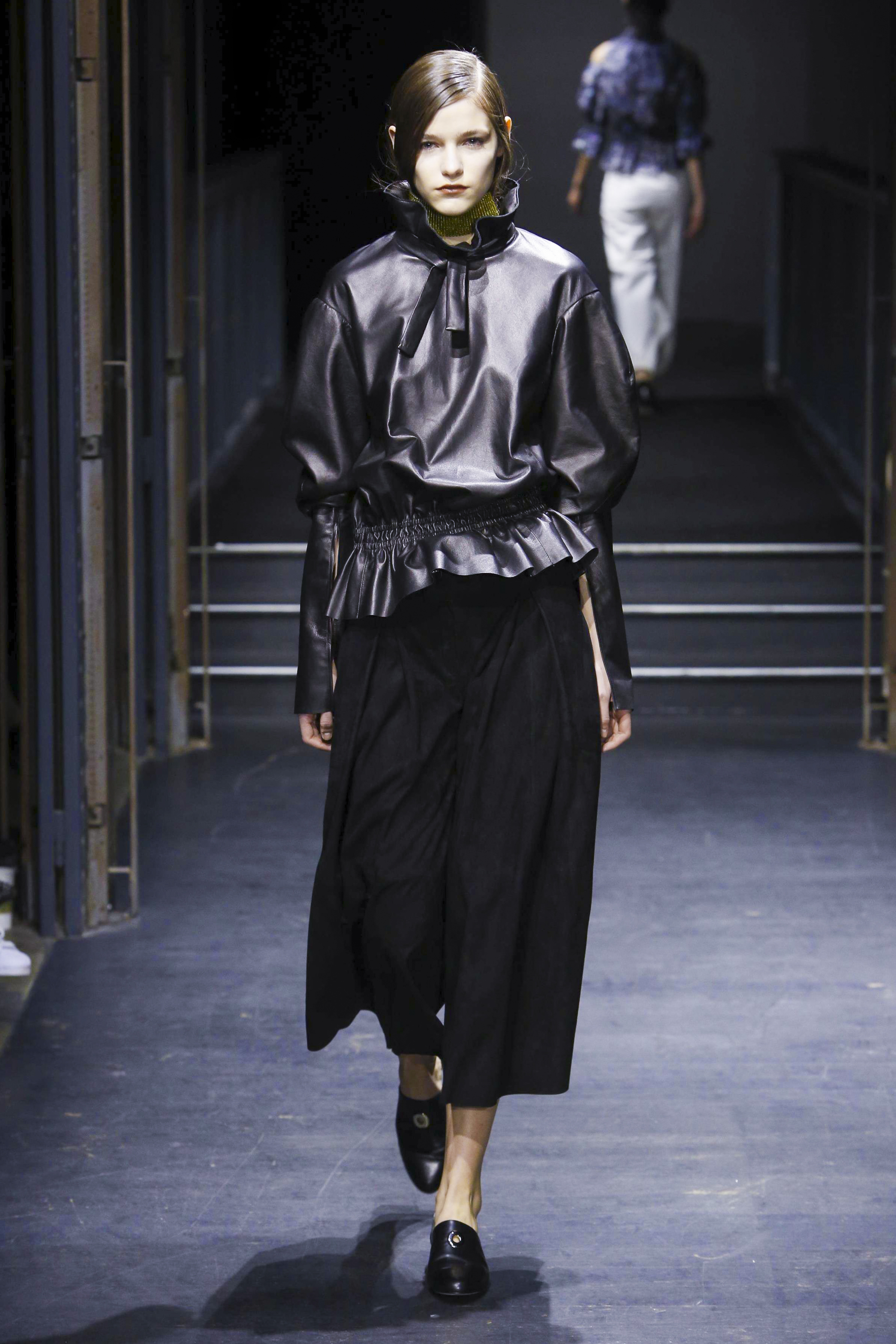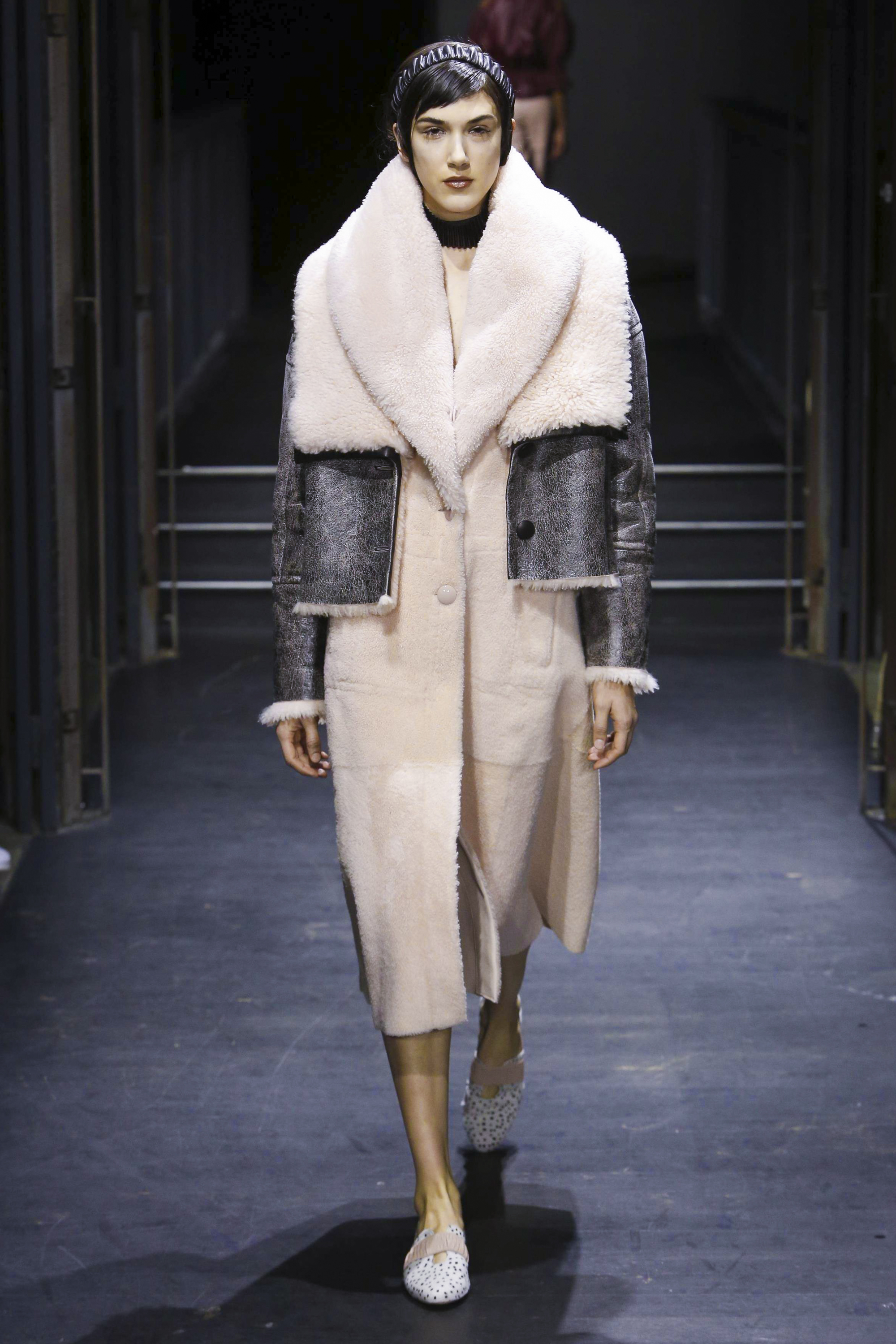 Les manches des trenchs font écho aux années 40 de par leur forme d’un style nouveau, elles deviennent ainsi plus féminines grâce aux surfaces plissées. Des épaules à effet tombant et des manches dotées de franges en cuir verni extrêmement longues caractérisent le nouveau bomber. Des cols resserrés, rappelant ceux des chemises des écolières, encadrent le visage. Cette rigueur crée un contraste fort avec les pantalons palazzo ou à pattes d’éléphant extra-larges.