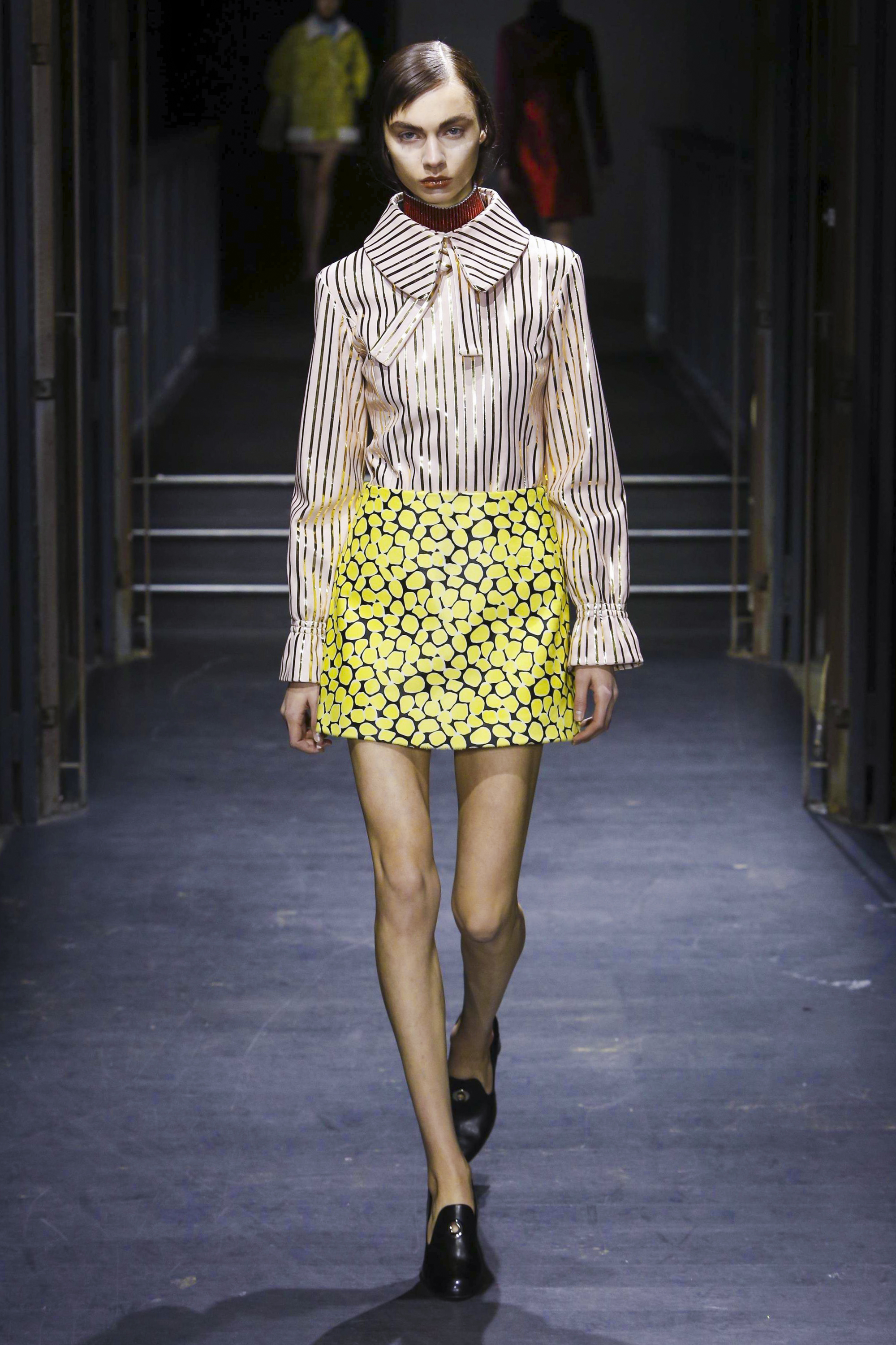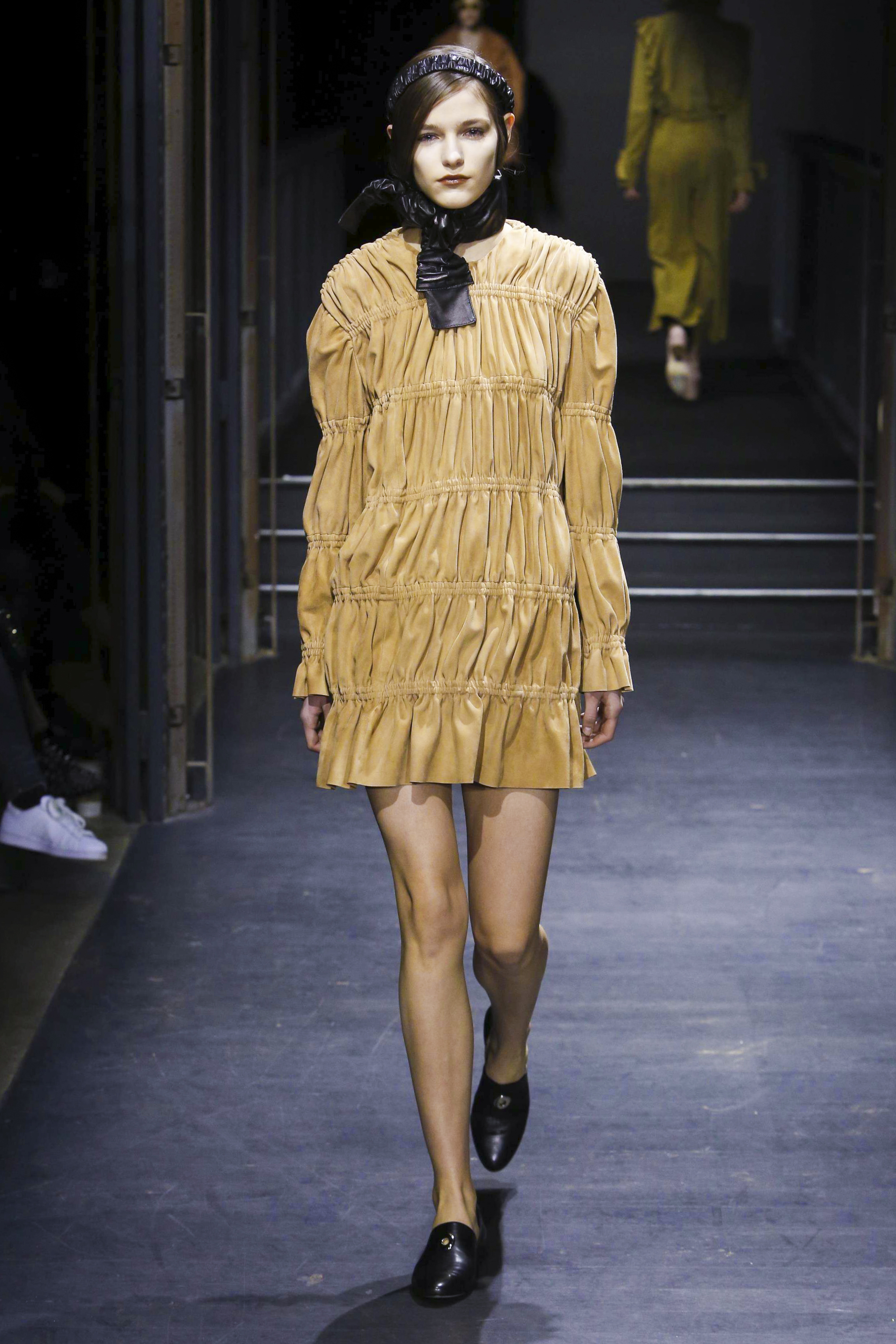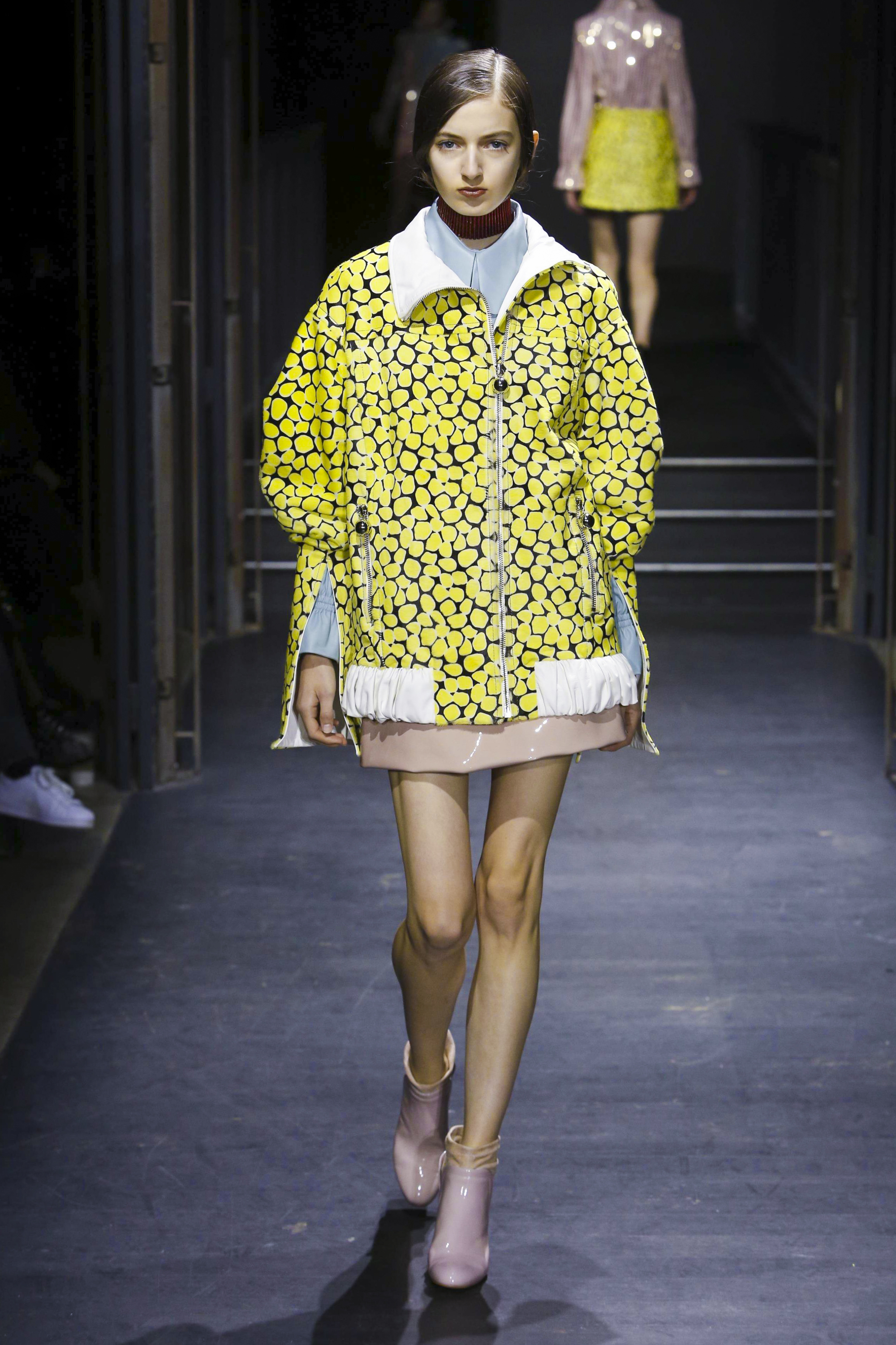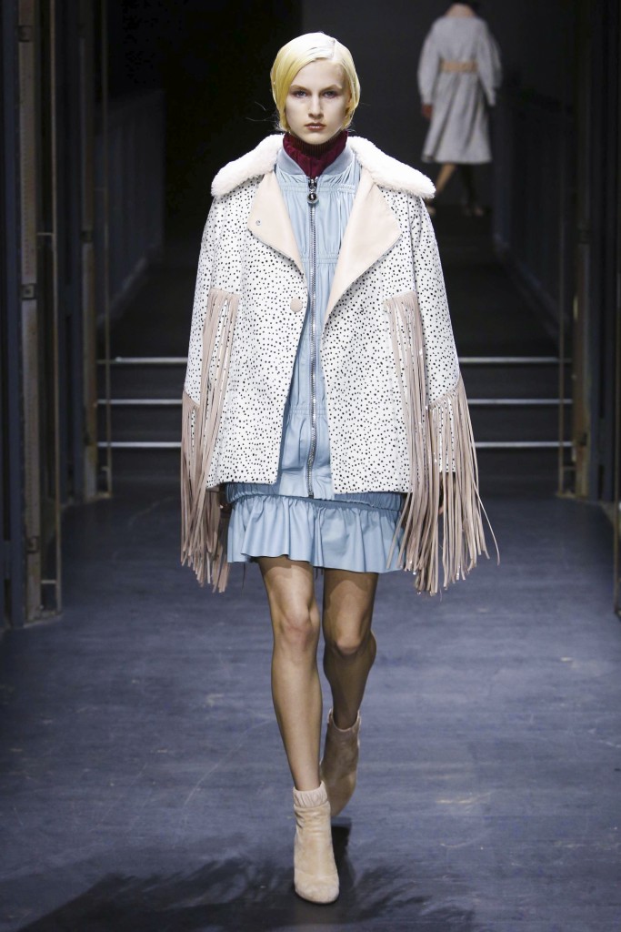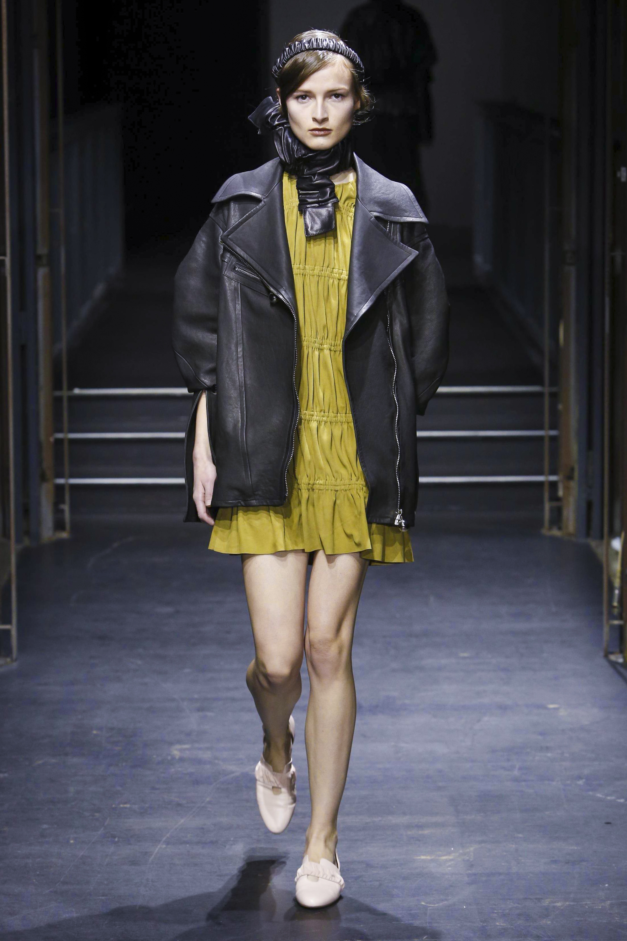 Les manches des trenchs font écho aux années 40 de par leur forme d’un style nouveau, elles deviennent ainsi plus féminines grâce aux surfaces plissées. Des épaules à effet tombant et des manches dotées de franges en cuir verni extrêmement longues caractérisent le nouveau bomber. Des cols resserrés, rappelant ceux des chemises des écolières, encadrent le visage. Cette rigueur crée un contraste fort avec les pantalons palazzo ou à pattes d’éléphant extra-larges.