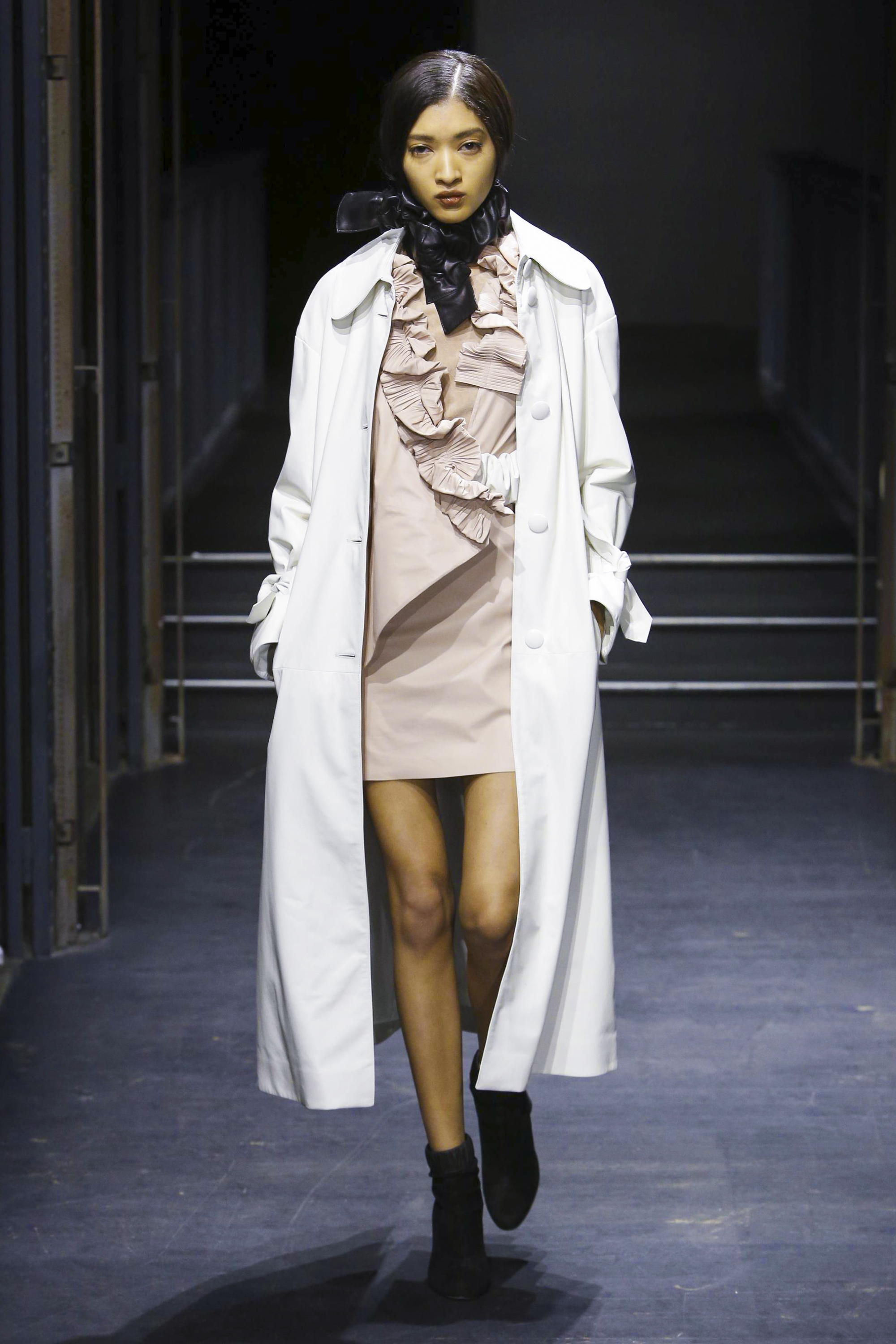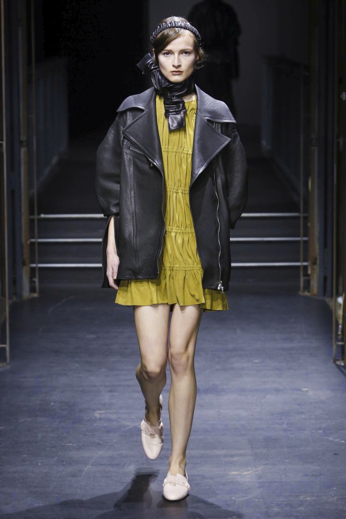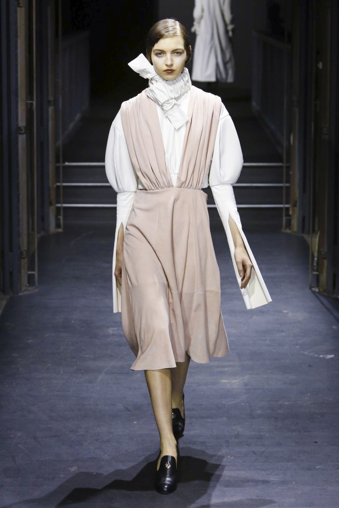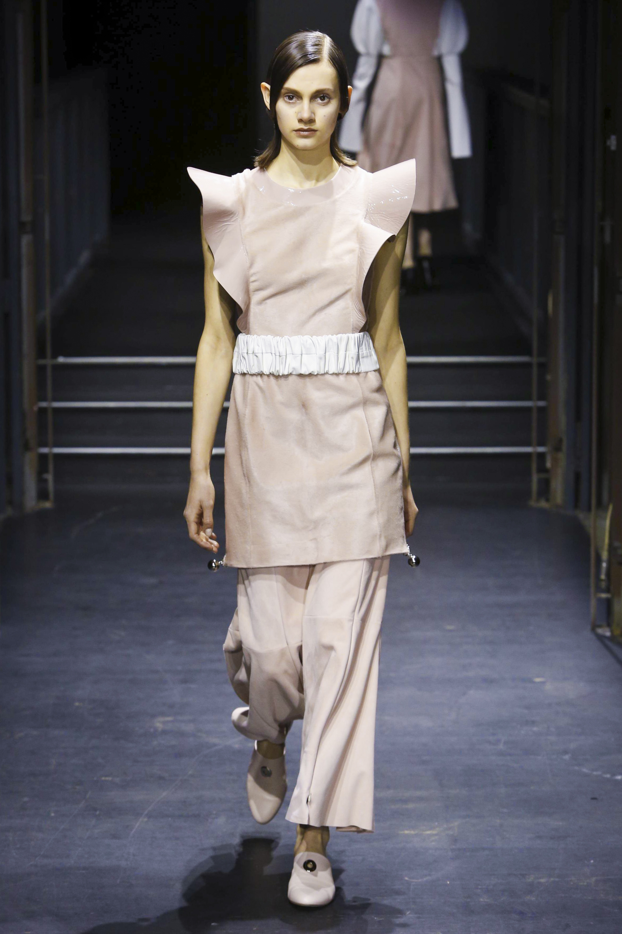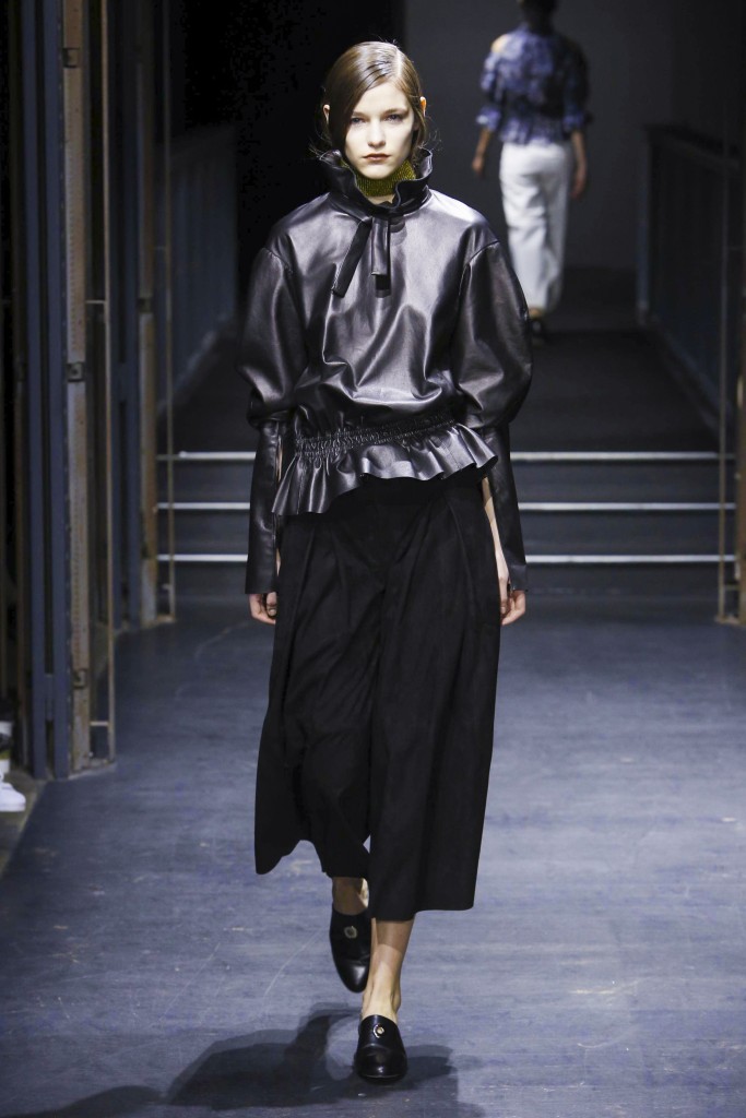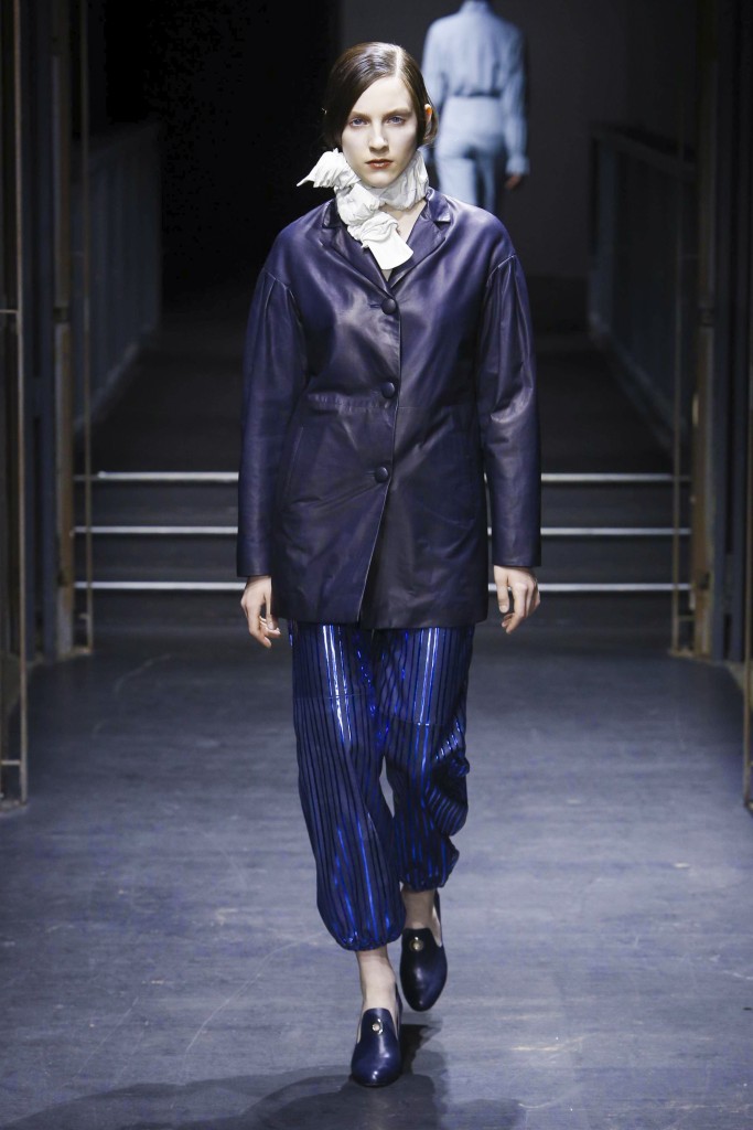 Affirmée et incisive, la silhouette est aérodynamique, volumineuse en haut et plus près du corps en bas. Et vice versa. La lumière est mise sur des pièces outerwear aux manches extra longues ou extra larges, associés à des vêtements ultra légers pratiquement impalpables, dans un jeu de références où les formes sont coupées, ouvertes, retournées, doublées et en évolution. Les éléments récurrents sont la texture et la consistance, différentes longueurs et largeurs, plusieurs constructions et solutions. Un soupçon de romantisme tribal apparaît de-ci de-là dans le cuir par le biais d’une enfilade de fronces rigides, tandis que des détails élastiqués mettent en exergue les lignes oversize des vestes chemises et des trenchs.
