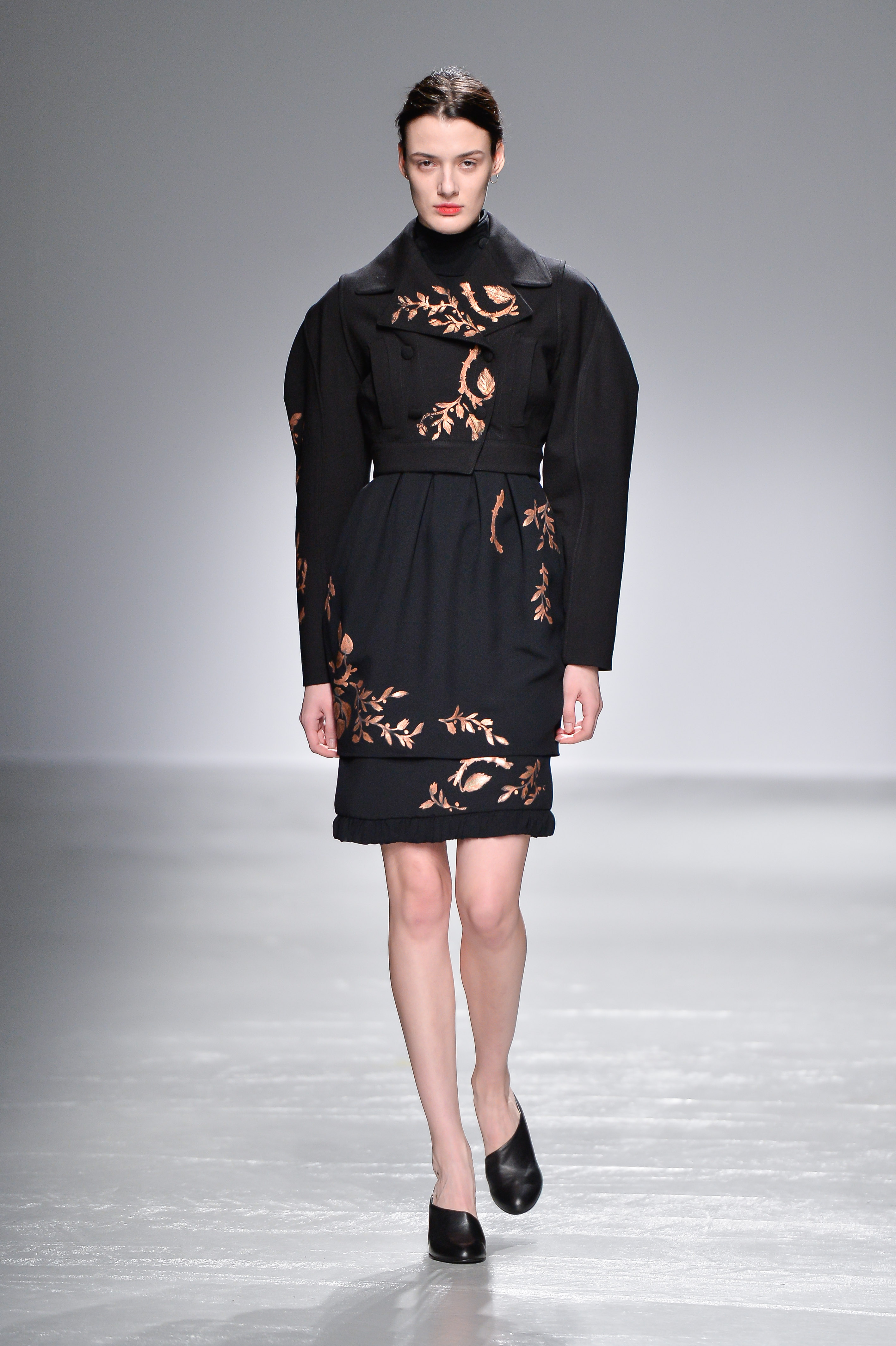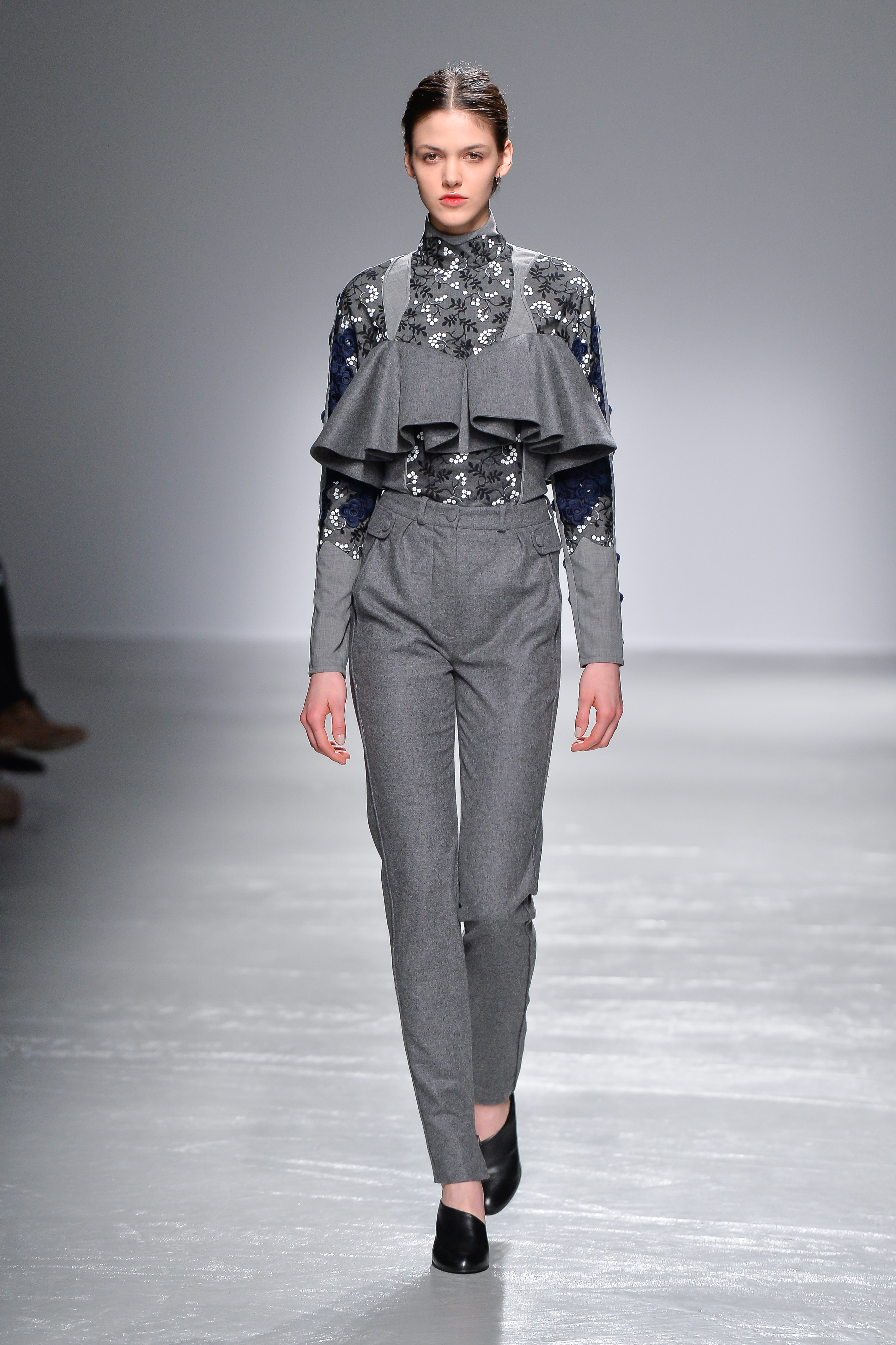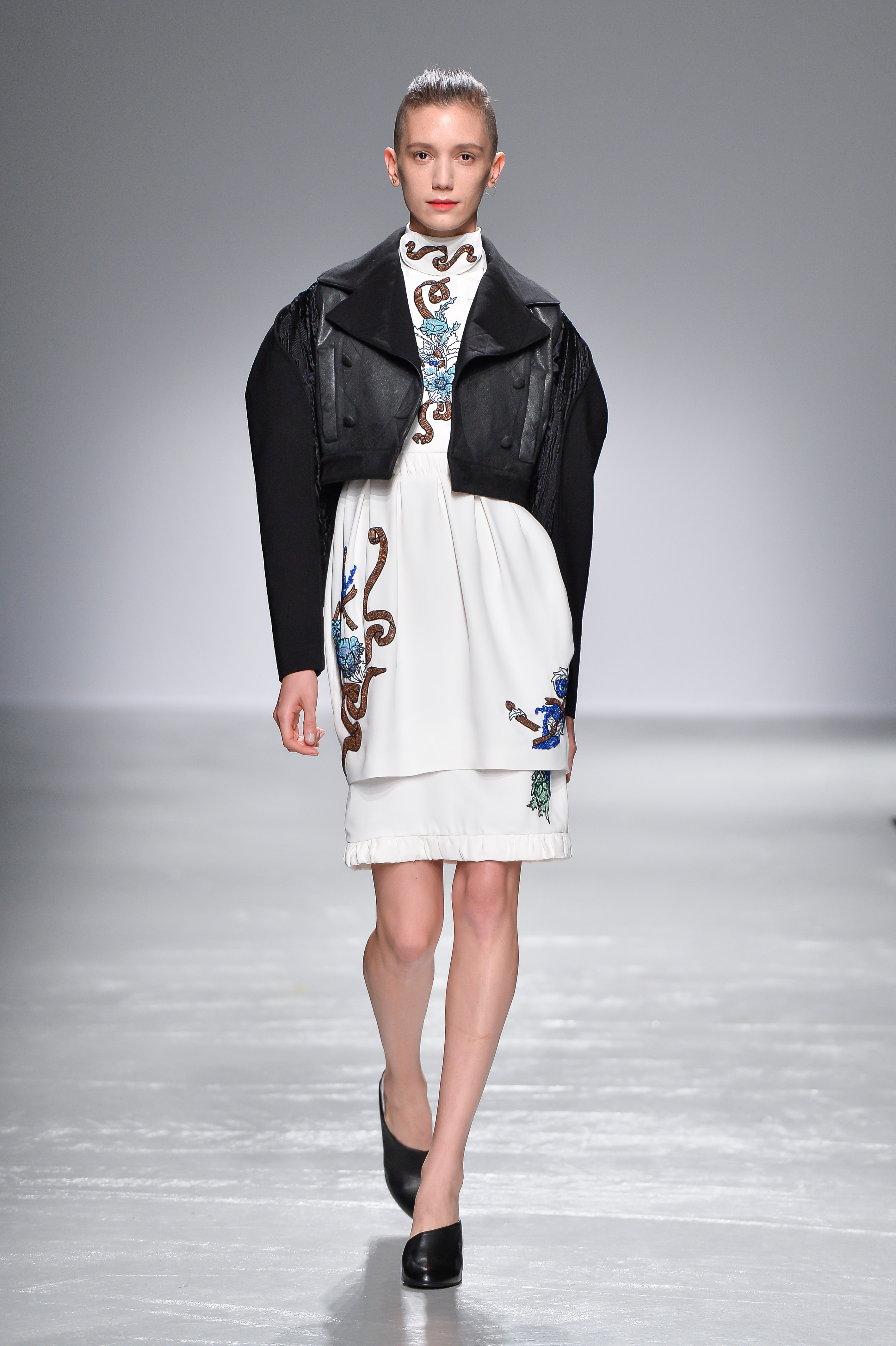 Fidèle à l’histoire Guy Laroche, les éléments des silhouettes sont explorés et remis à jour : cette fois-ci, un look monochrome est composé d’une jupe crayon et d’une blouse coupe Empire ; les structures militaires sont secouées par des froufrous et des volumes cocon. Un blouson noir est relevé de détails floraux, transformant la fonctionnalité intrinsèque de chaque pièce en manifestation luxueuse.