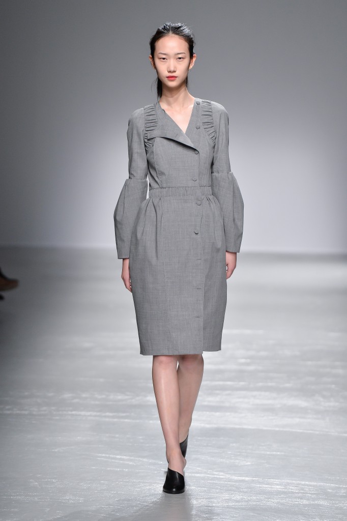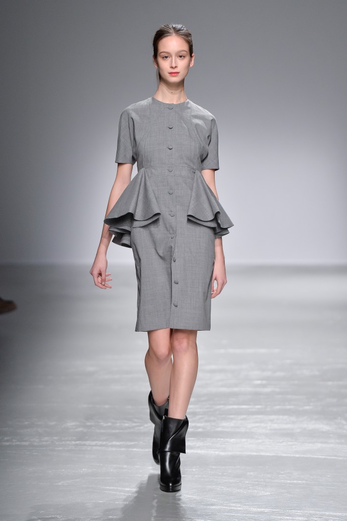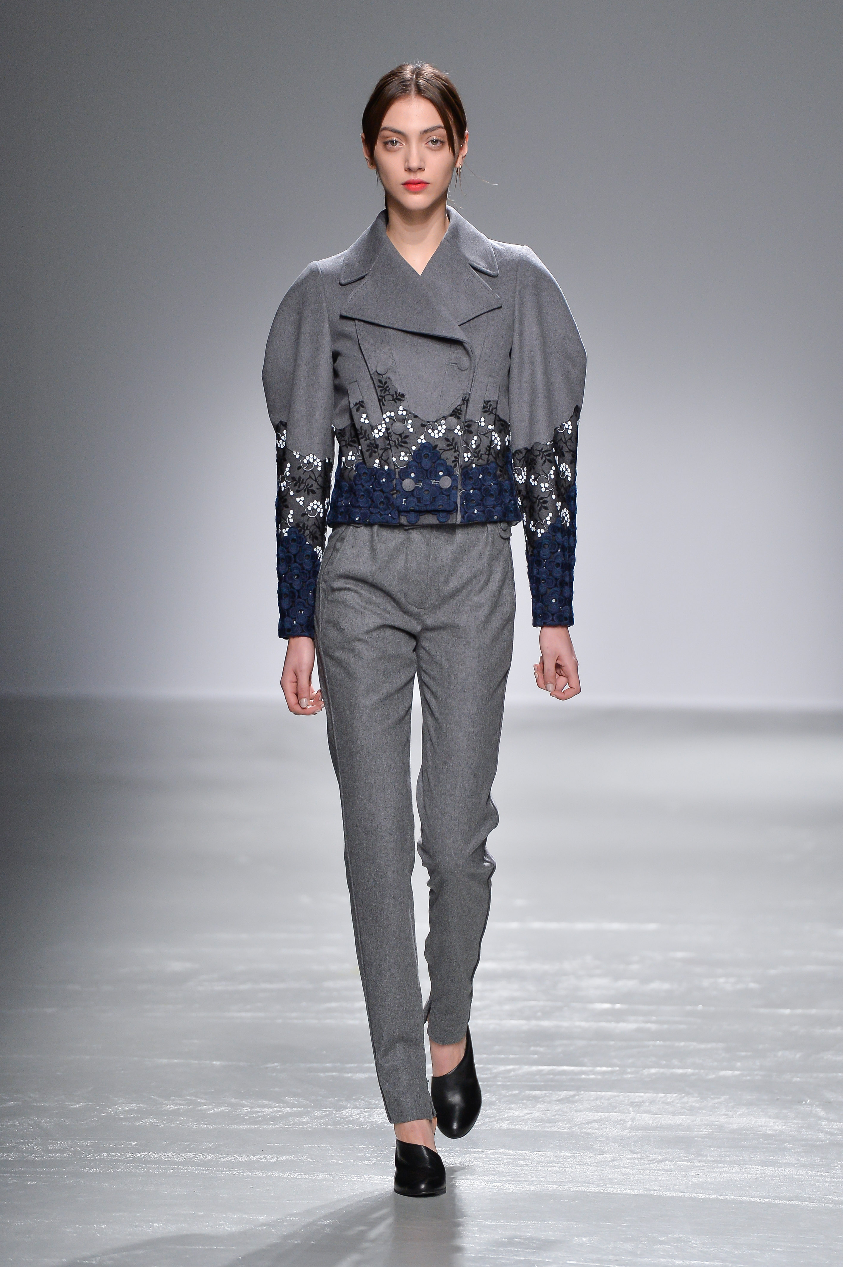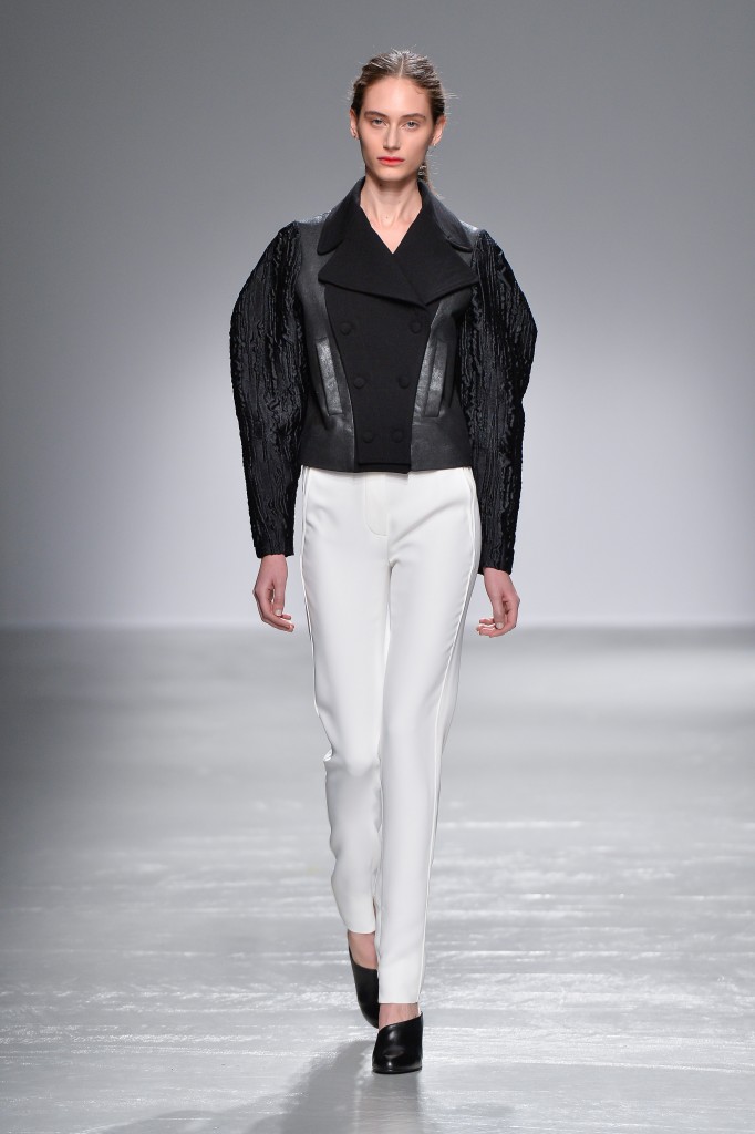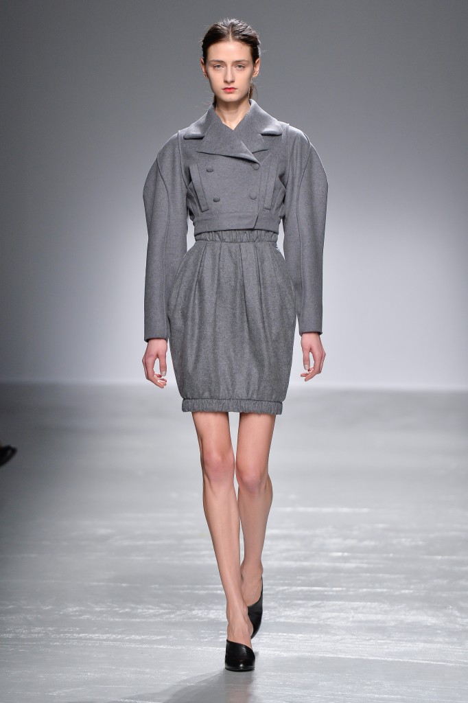 Une palette charbon, cendre et ivoire habille et repense les classiques de la Maison. Une veste d’aviateur revisitée est taillée courte avec des manches doucement bouffantes, et assortie à un pantalon cigarette à la taille extra-haute.