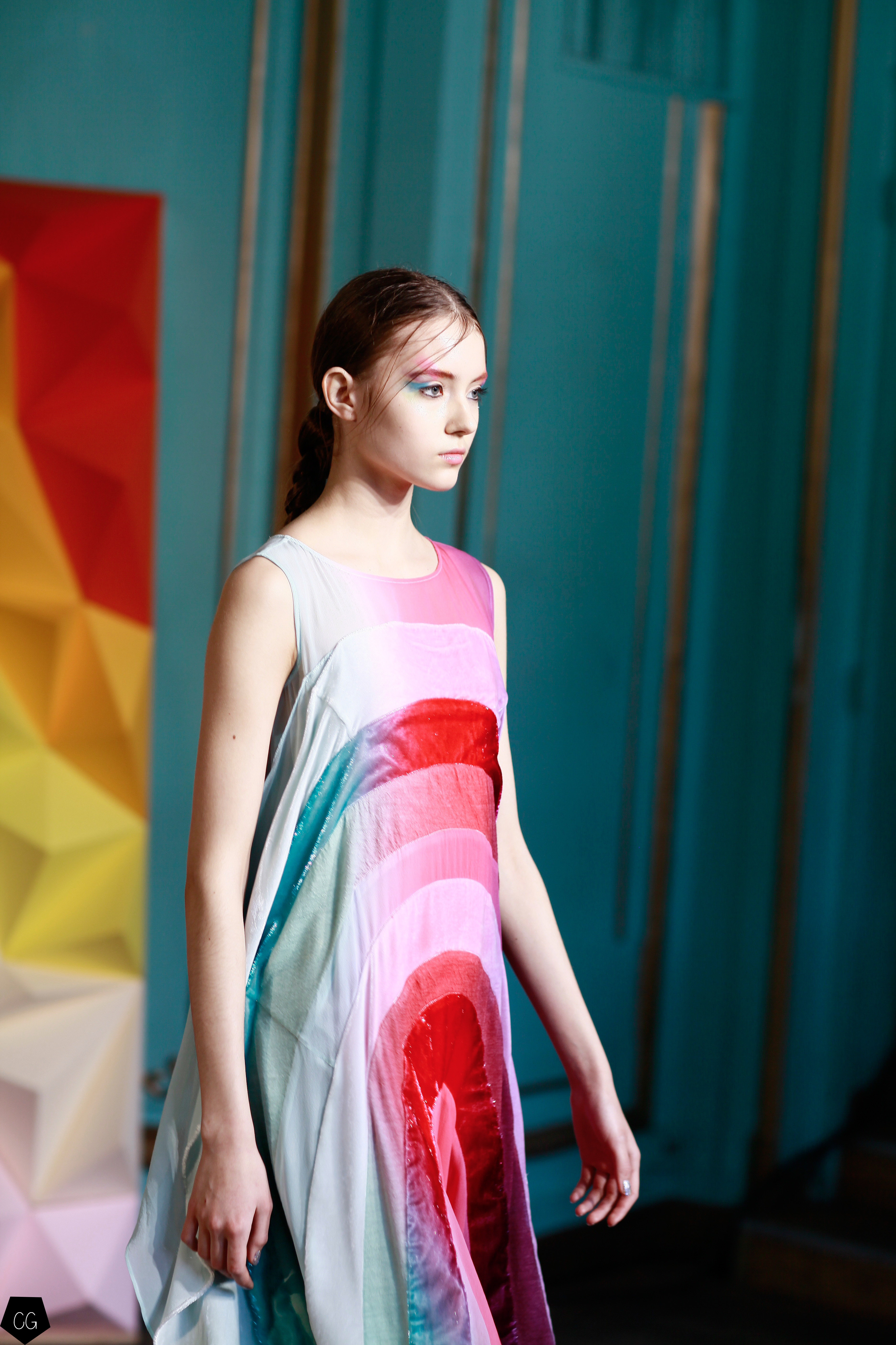 Des vagues filantes tressées dessinent des arcs-en-ciel dont les couleurs teintes à la main se graduent de vives notes sur soie et velours.