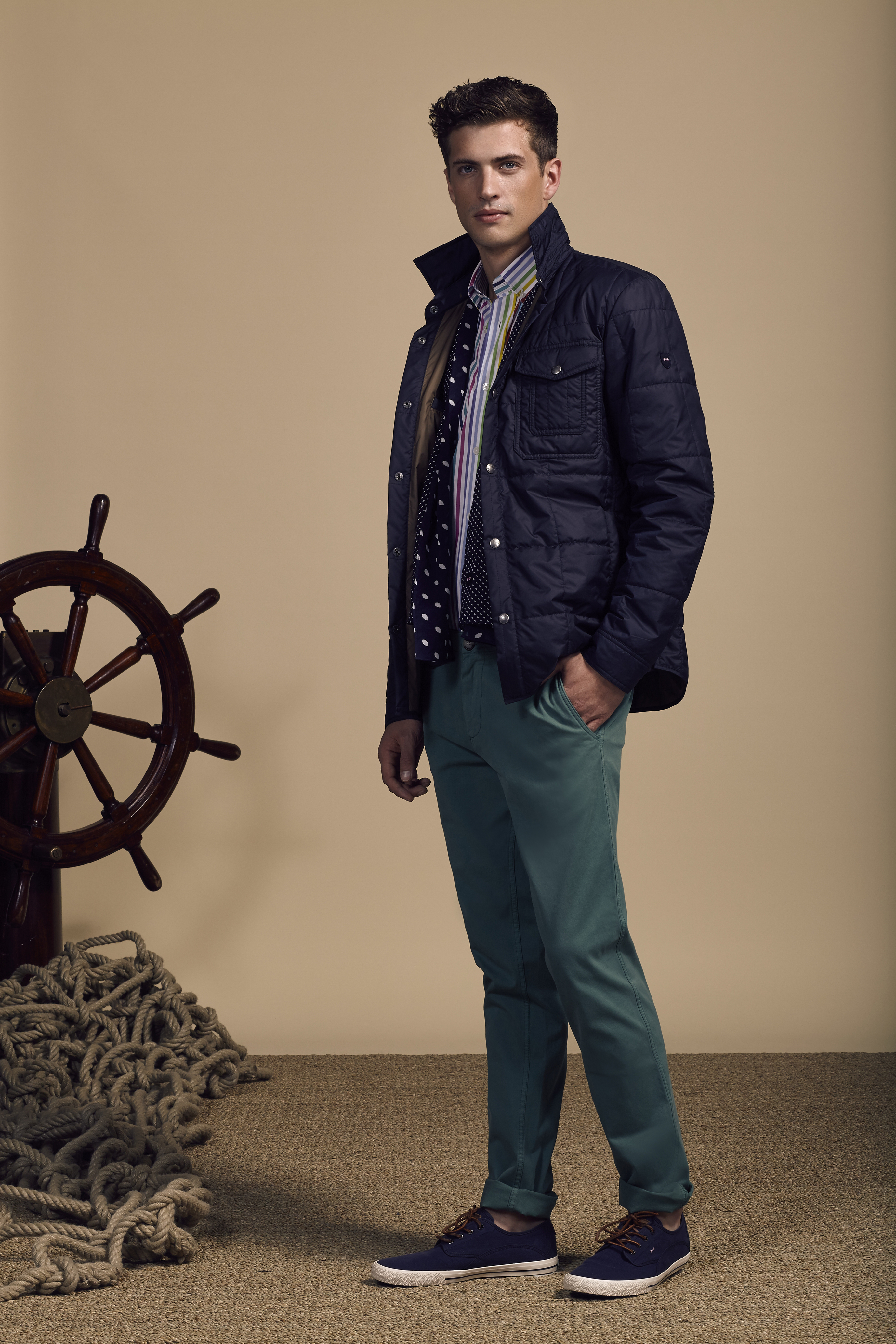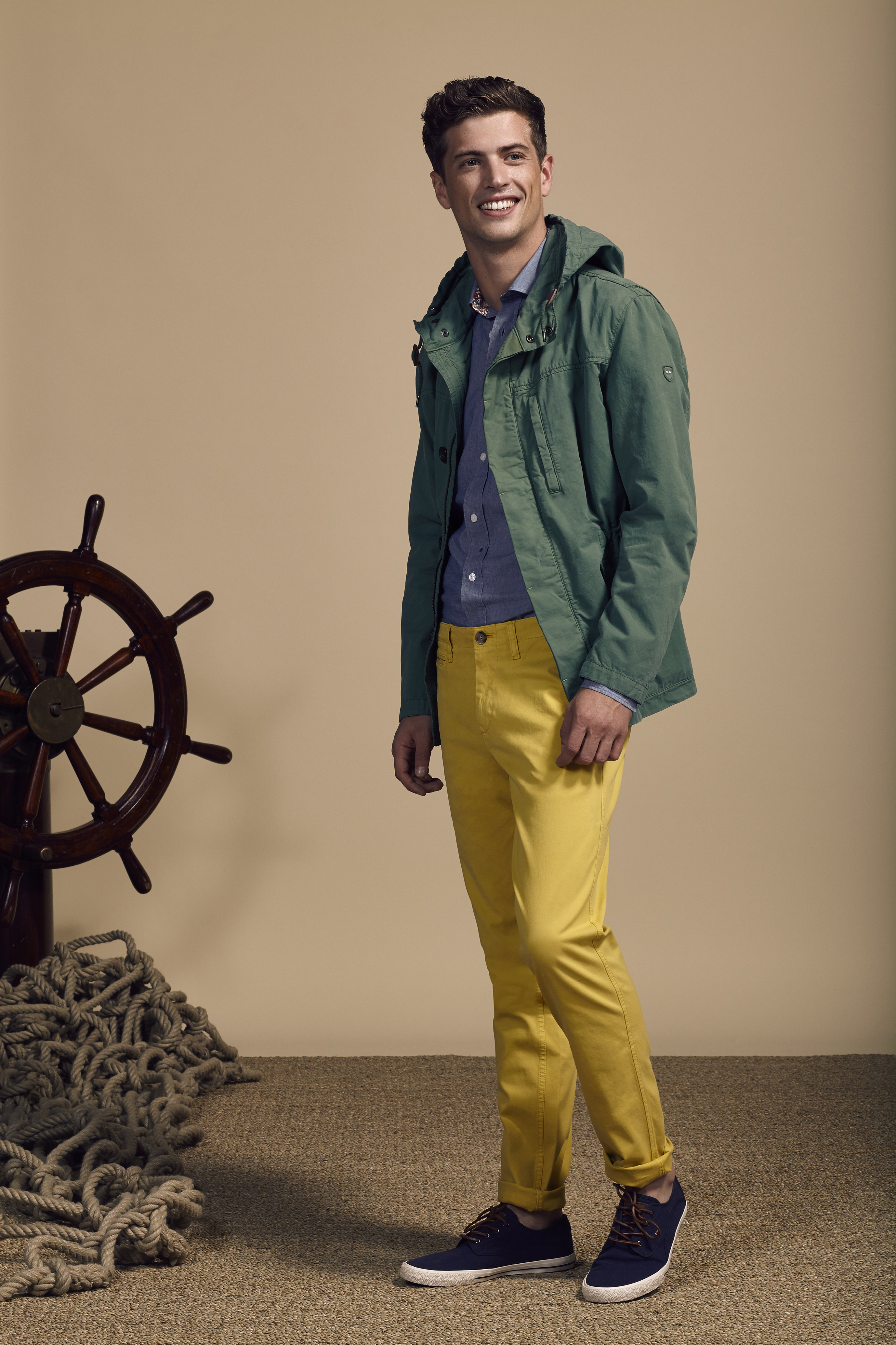 - COM 2015 : Look-book Homme Printemps-Eté 2016 – Look 9 – chemise en coton, parka vert en coton sur pantalon jaune en coton. Eden Park Spring-Summer 2016 Mens look-book – Look 9 – denim cotton shirt and green cotton parka on yellow cotton trousers.