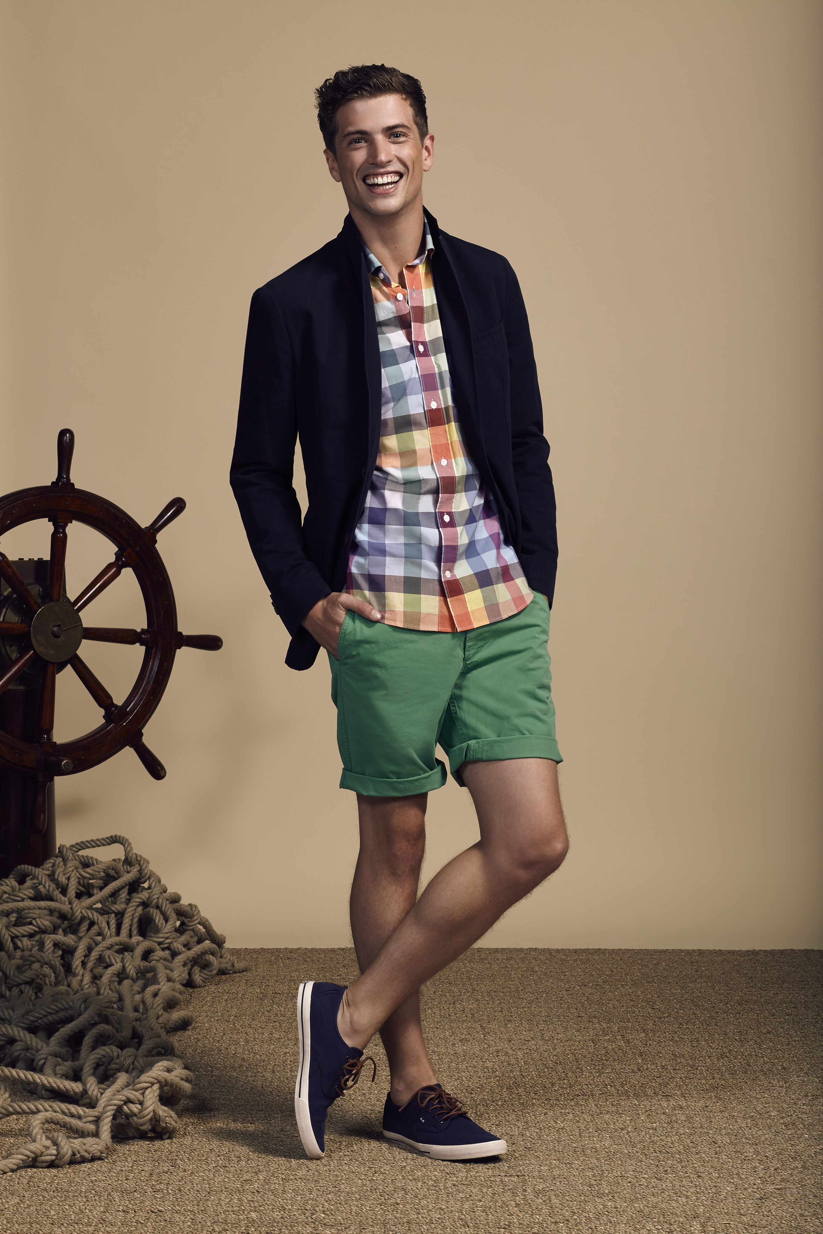 - COM 2015 : Look-book Homme Printemps-Eté 2016 – Look 16 – chemise à carreaux veste marine en coton et short vert. Eden Park Spring-Summer 2016 Mens look-book – Look 16 – Check shirt, navy blue cotton jacket on green shorts.