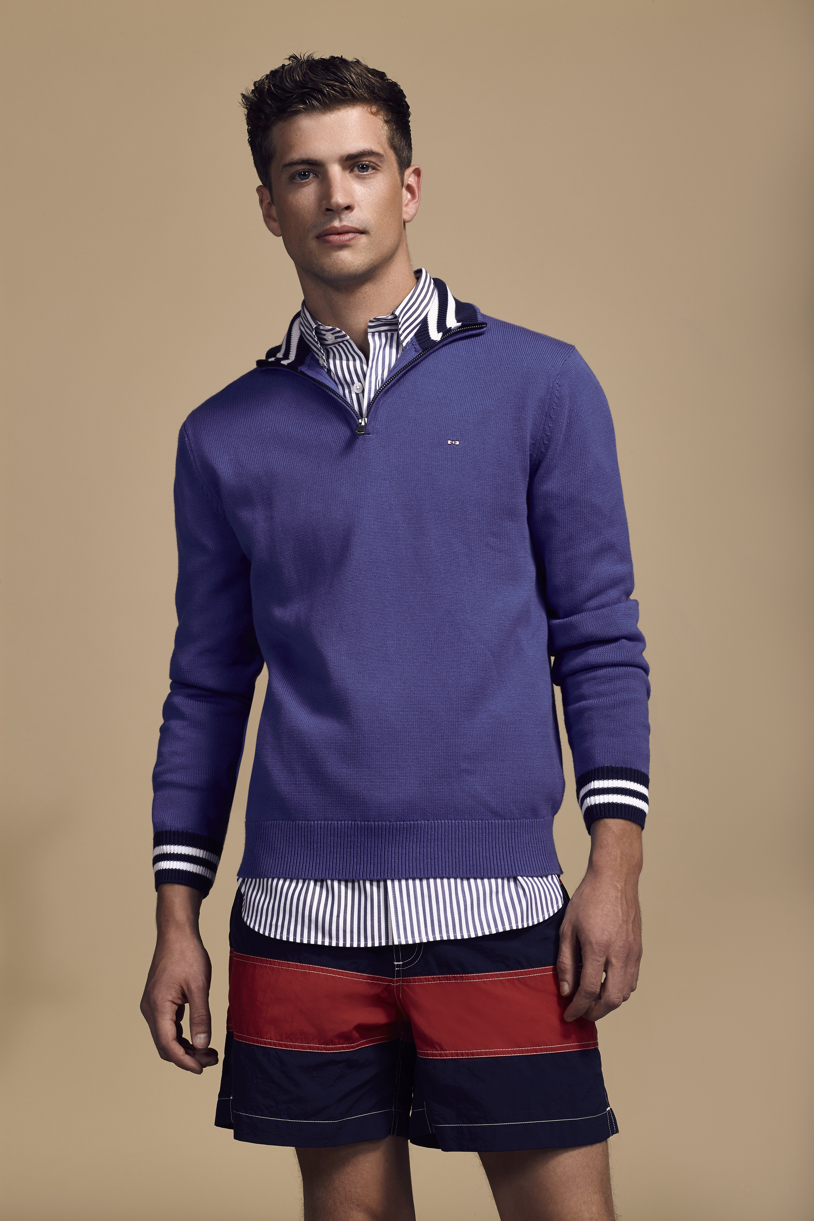 - COM 2015 : Look-book Homme Printemps-Eté 2016 – Look 2 – chemise rayée bleu en coton et pull coton sur short de bain en polyamide . Eden Park Spring-Summer 2016 Mens look-book – Look 2 – blue stripe cotton shirt and cotton sweater on polyamide swim shorts.
