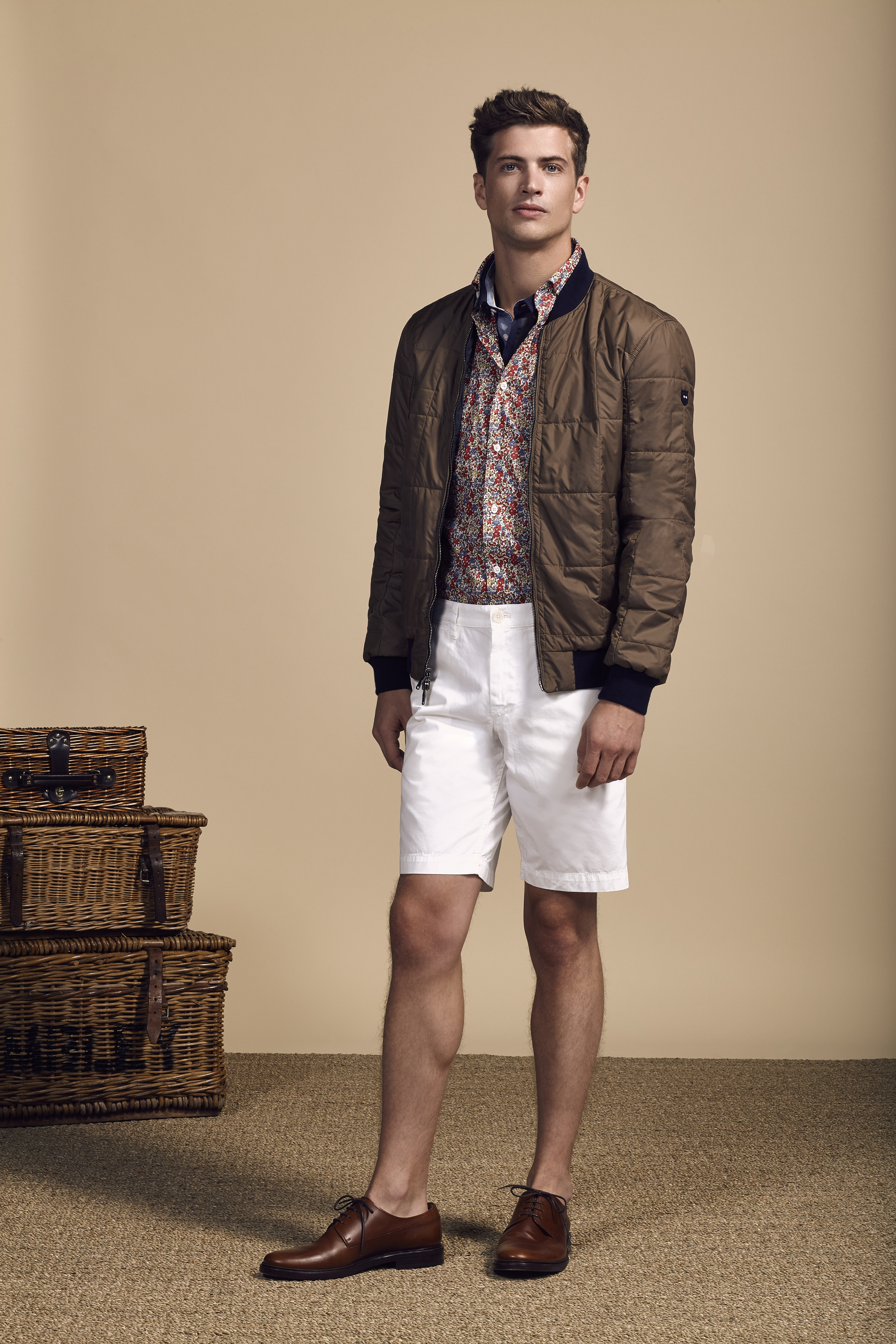 - COM 2015 : Look-book Homme Printemps-Eté 2016 – Look 4 – polo cendre, chemise Liberty en coton et bombers polyester sur short blanc en coton.. Eden Park Spring-Summer 2016 Mens look-book – Look 4 – Ash grey cotton polo shirt and Liberty cotton shirt with polyester Bomber jacket on white cotton bermuda shorts.