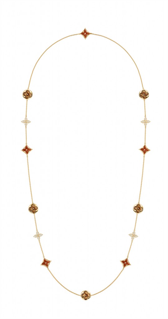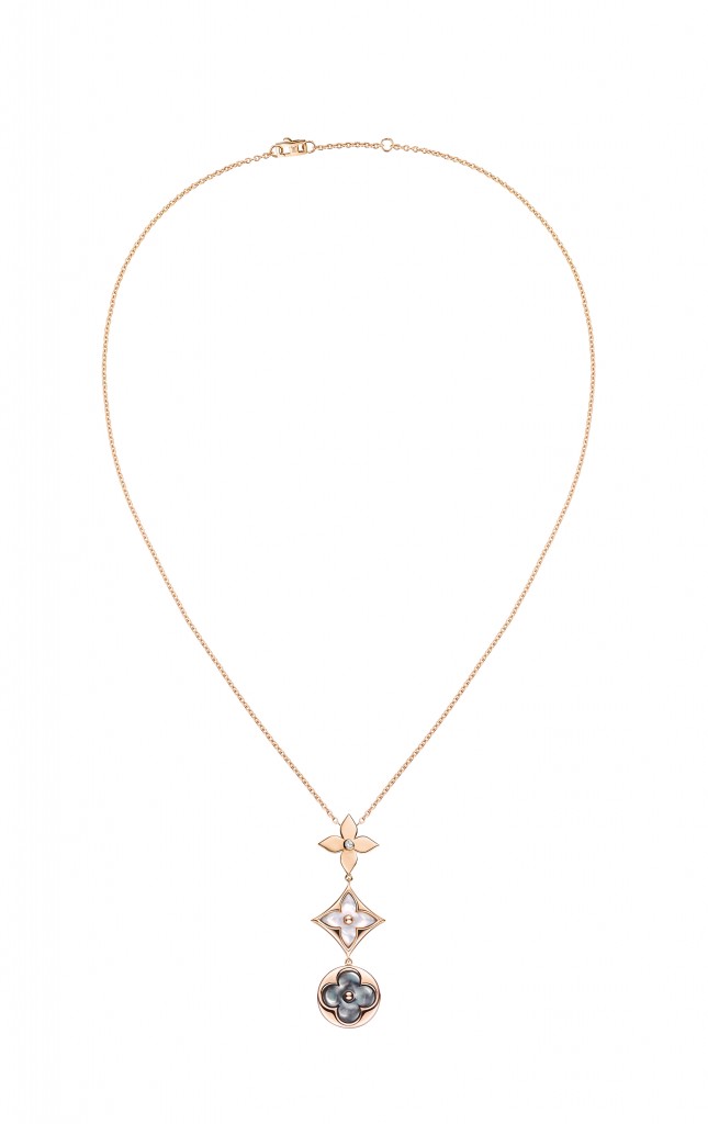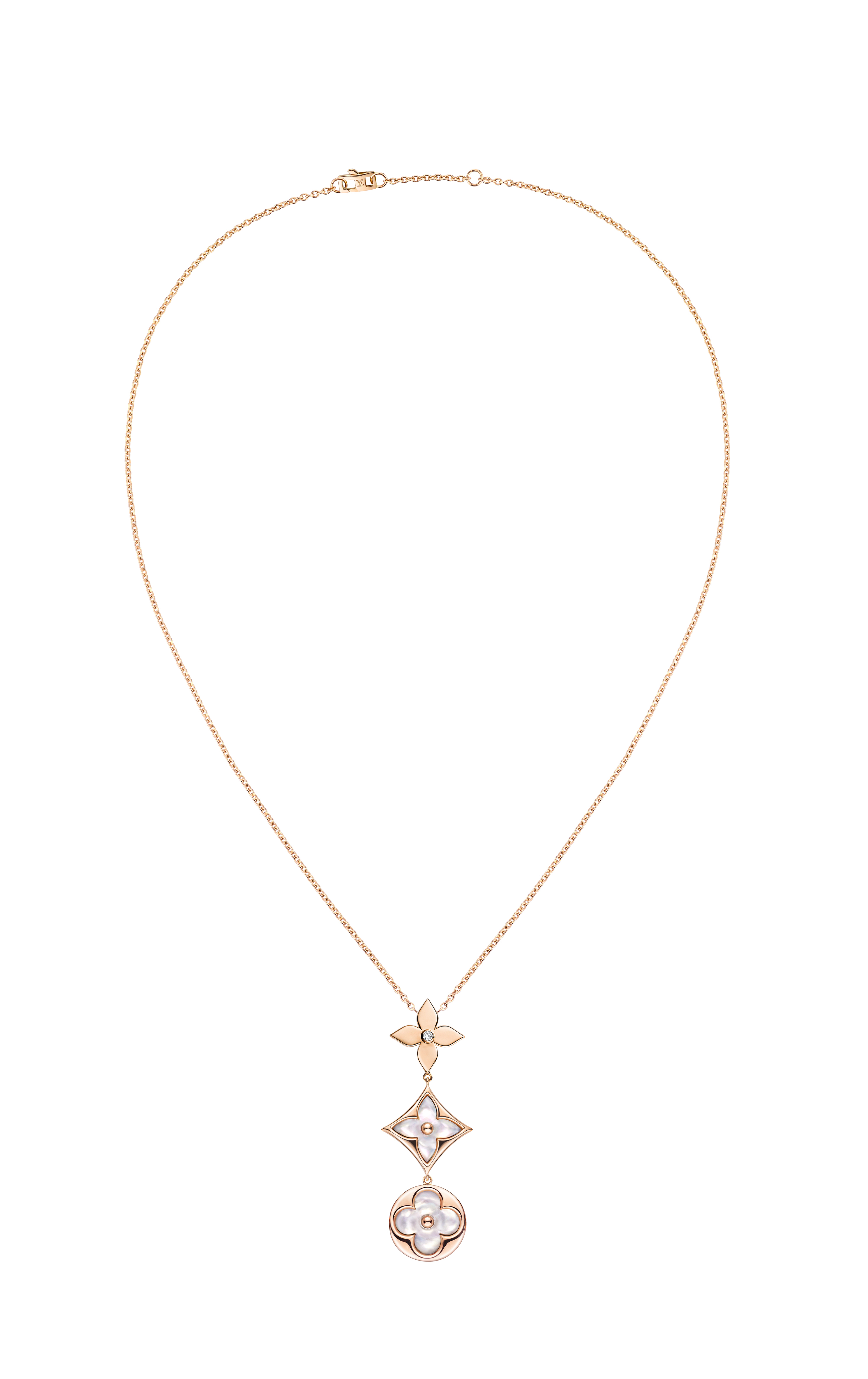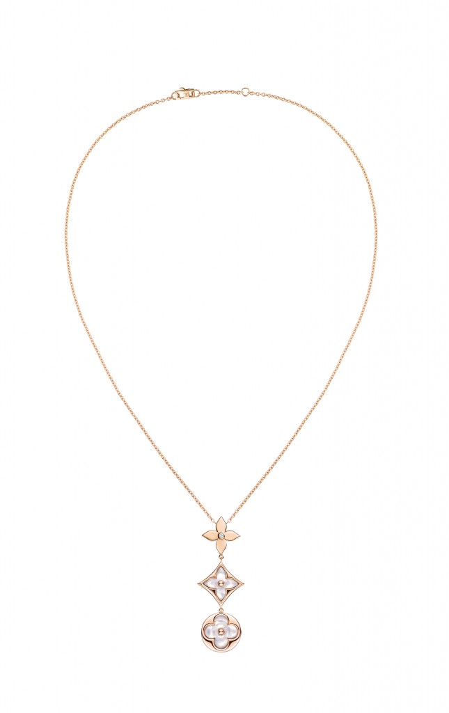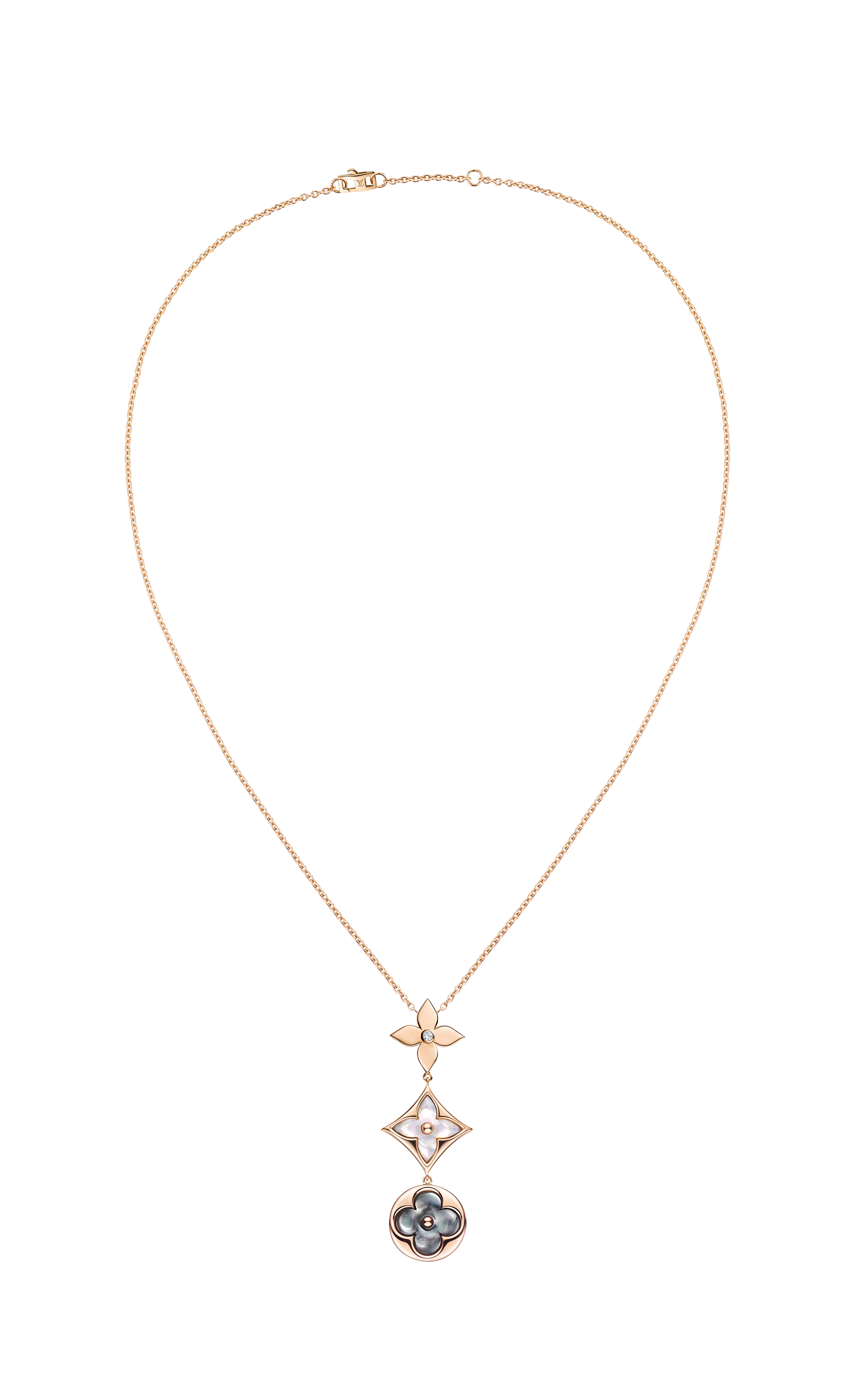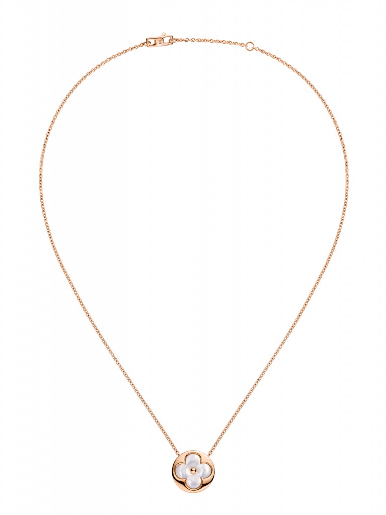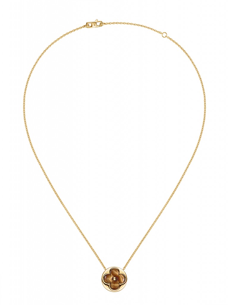 Un travail en trois dimensions de la nacre et de la pierre dure permet de faire s’épanouir la Fleur de Monogram sur les sautoirs, colliers, bracelets et boucles d’oreilles de la ligne de joaillerie Blossom. Nacre grise ou blanche, cornaline ou œil-de-tigre s’associent pour faire écho au colorama de la Maison Louis Vuitton, une harmonie chaleureuse de brun et d’or. Douceur que l’on retrouve dans le toucher des pièces : sculptées et polies à la main, pierres et nacre proposent un profil tout en bombé qui contraste avec la finesse des chaines en or jaune ou rose. Un clou doré, évocation de ceux utilisés sur les malles Louis Vuitton, vient se piquer au cœur de certains pétales. Enchâssée dans un cercle ou un losange, la Fleur de Monogram incarne à la fois le patrimoine et le savoir-faire de la Maison. Un éloge de la subtilité, sublimé par deux pièces de haute joaillerie dont un sautoir entièrement pavé de diamants et un collier aux médaillons de nacre sculptés sur un rang de perles de Tahiti. Entre harmonie et sensualité, la collection Blossom permet de faire fleurir l’un des grands symboles de Louis Vuitton dans les règles absolues de son art de la joaillerie.
