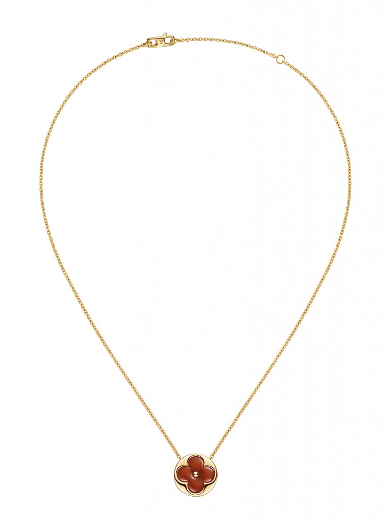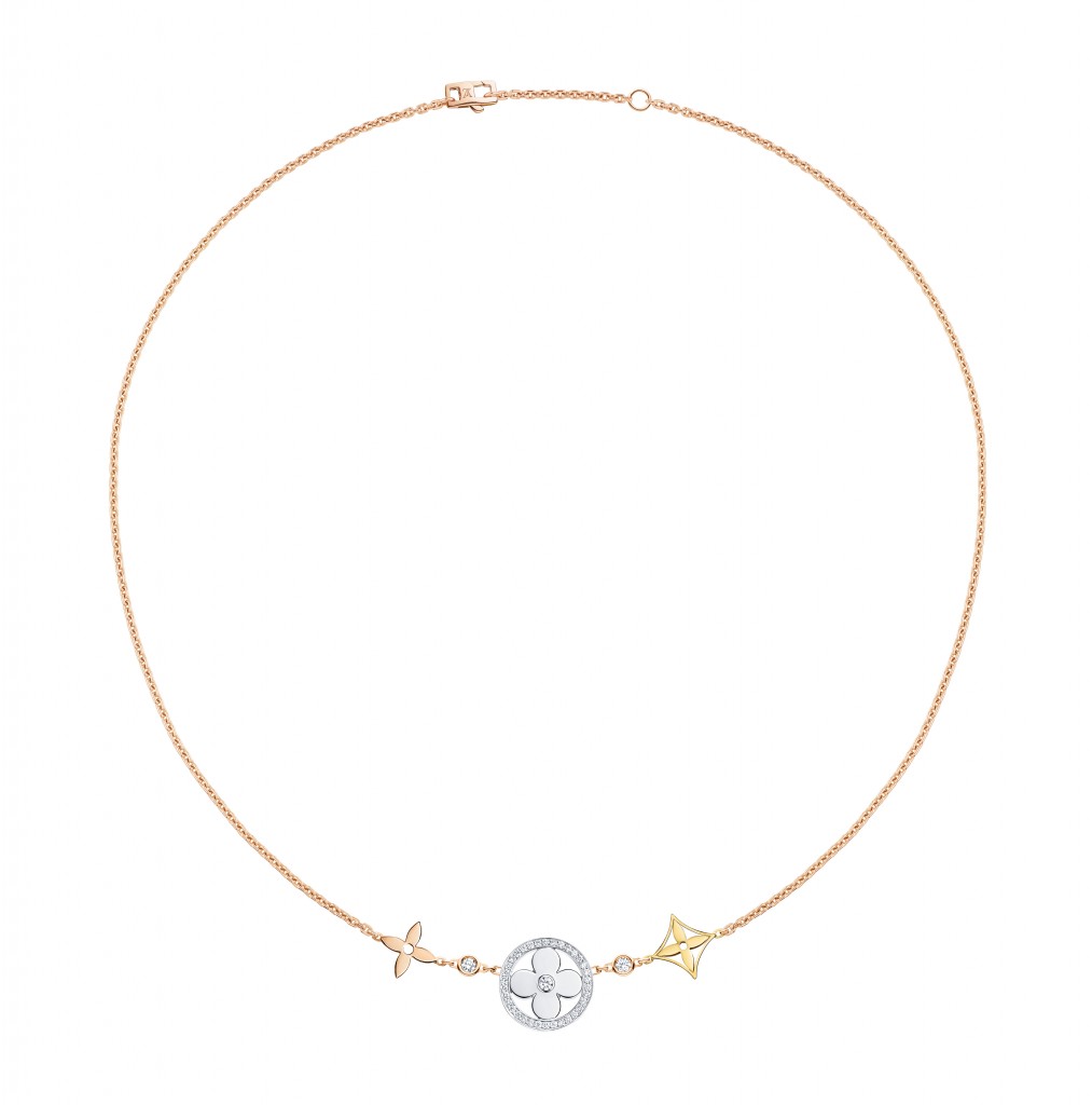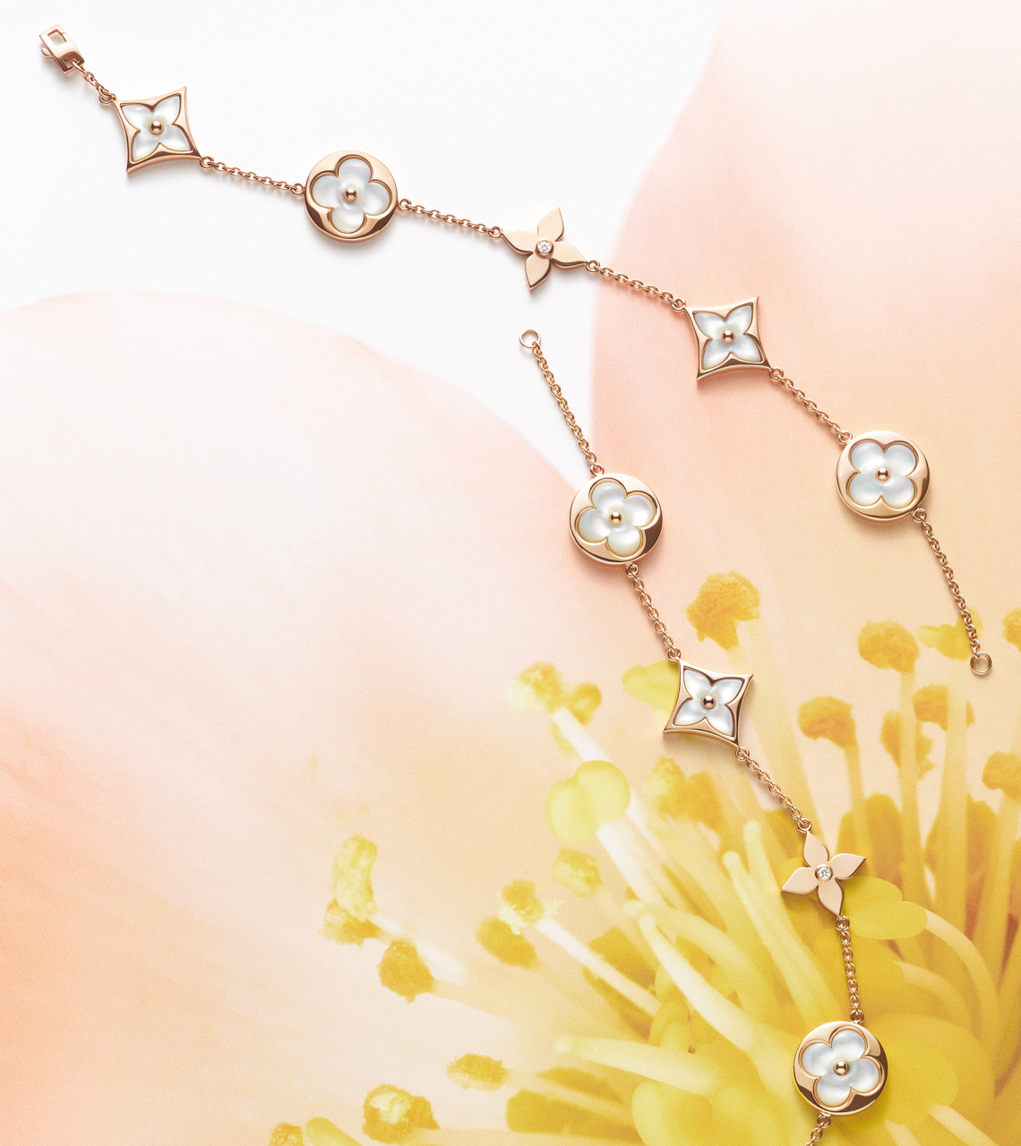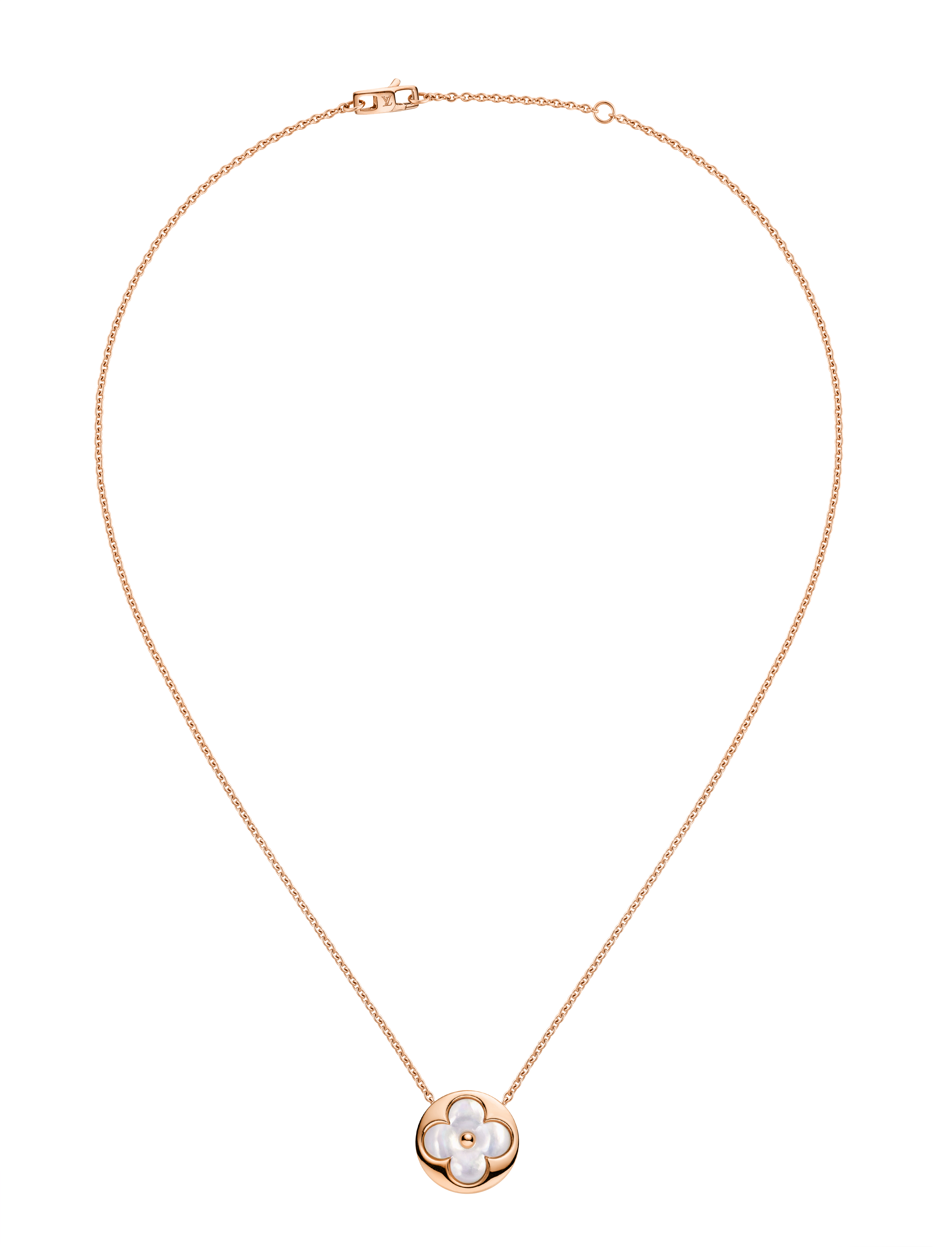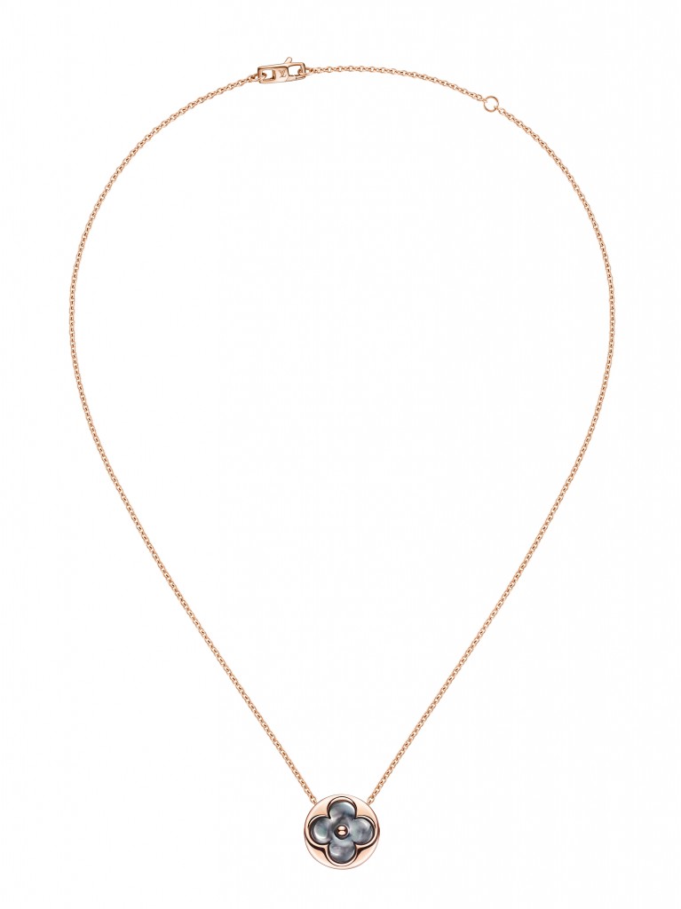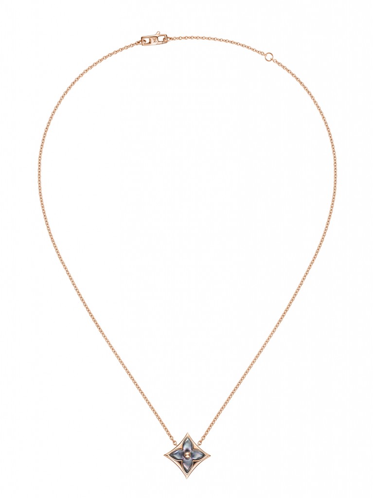 Un travail en trois dimensions de la nacre et de la pierre dure permet de faire s’épanouir la Fleur de Monogram sur les sautoirs, colliers, bracelets et boucles d’oreilles de la ligne de joaillerie Blossom. Nacre grise ou blanche, cornaline ou œil-de-tigre s’associent pour faire écho au colorama de la Maison Louis Vuitton, une harmonie chaleureuse de brun et d’or. Douceur que l’on retrouve dans le toucher des pièces : sculptées et polies à la main, pierres et nacre proposent un profil tout en bombé qui contraste avec la finesse des chaines en or jaune ou rose. Un clou doré, évocation de ceux utilisés sur les malles Louis Vuitton, vient se piquer au cœur de certains pétales. Enchâssée dans un cercle ou un losange, la Fleur de Monogram incarne à la fois le patrimoine et le savoir-faire de la Maison. Un éloge de la subtilité, sublimé par deux pièces de haute joaillerie dont un sautoir entièrement pavé de diamants et un collier aux médaillons de nacre sculptés sur un rang de perles de Tahiti. Entre harmonie et sensualité, la collection Blossom permet de faire fleurir l’un des grands symboles de Louis Vuitton dans les règles absolues de son art de la joaillerie.