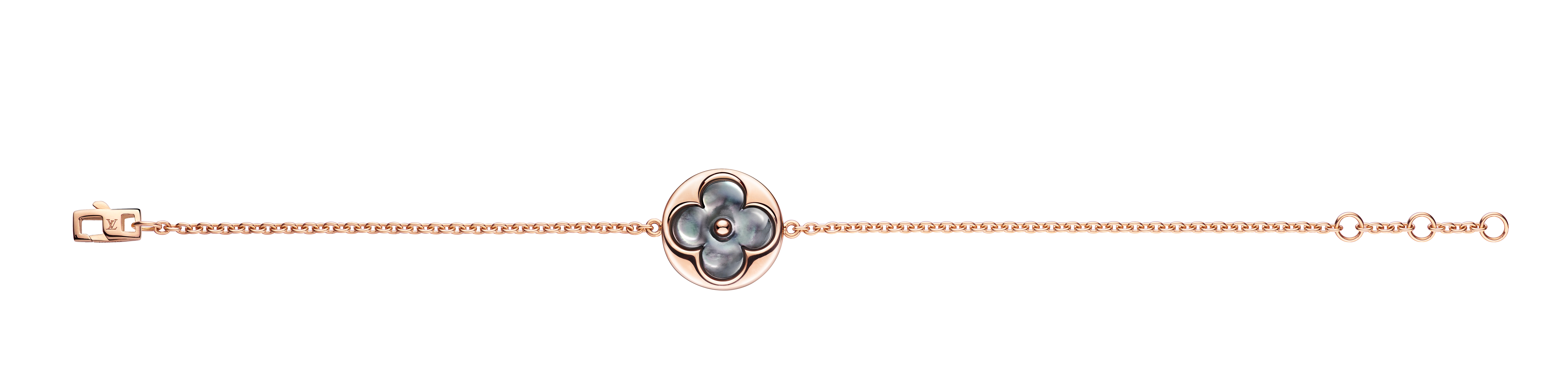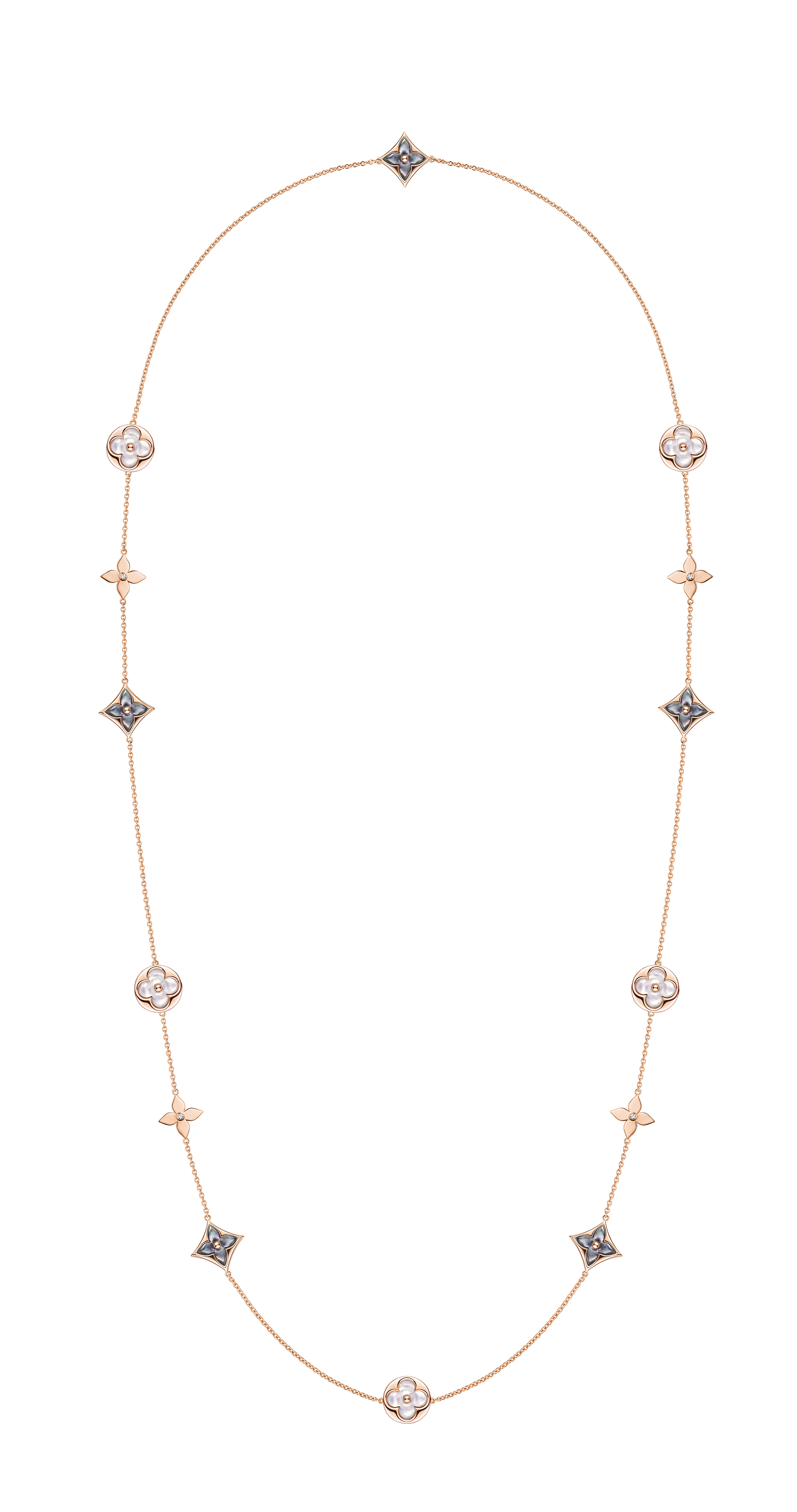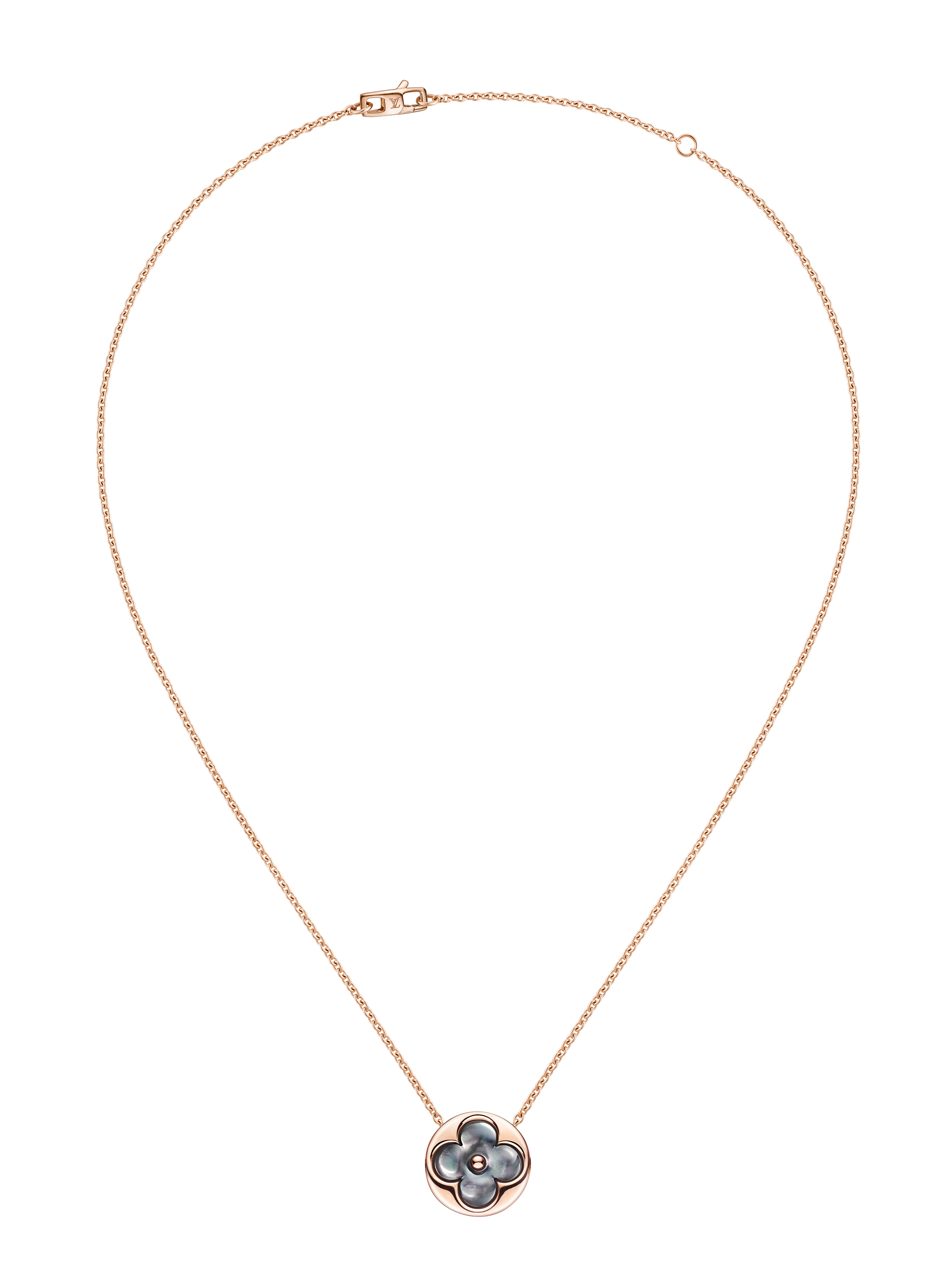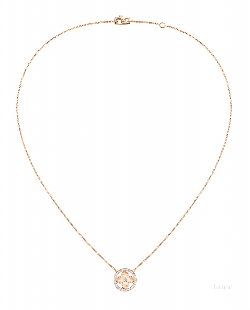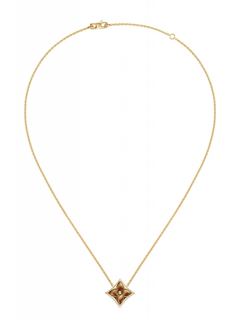 Un travail en trois dimensions de la nacre et de la pierre dure permet de faire s’épanouir la Fleur de Monogram sur les sautoirs, colliers, bracelets et boucles d’oreilles de la ligne de joaillerie Blossom. Nacre grise ou blanche, cornaline ou œil-de-tigre s’associent pour faire écho au colorama de la Maison Louis Vuitton, une harmonie chaleureuse de brun et d’or. Douceur que l’on retrouve dans le toucher des pièces : sculptées et polies à la main, pierres et nacre proposent un profil tout en bombé qui contraste avec la finesse des chaines en or jaune ou rose. Un clou doré, évocation de ceux utilisés sur les malles Louis Vuitton, vient se piquer au cœur de certains pétales. Enchâssée dans un cercle ou un losange, la Fleur de Monogram incarne à la fois le patrimoine et le savoir-faire de la Maison. Un éloge de la subtilité, sublimé par deux pièces de haute joaillerie dont un sautoir entièrement pavé de diamants et un collier aux médaillons de nacre sculptés sur un rang de perles de Tahiti. Entre harmonie et sensualité, la collection Blossom permet de faire fleurir l’un des grands symboles de Louis Vuitton dans les règles absolues de son art de la joaillerie.