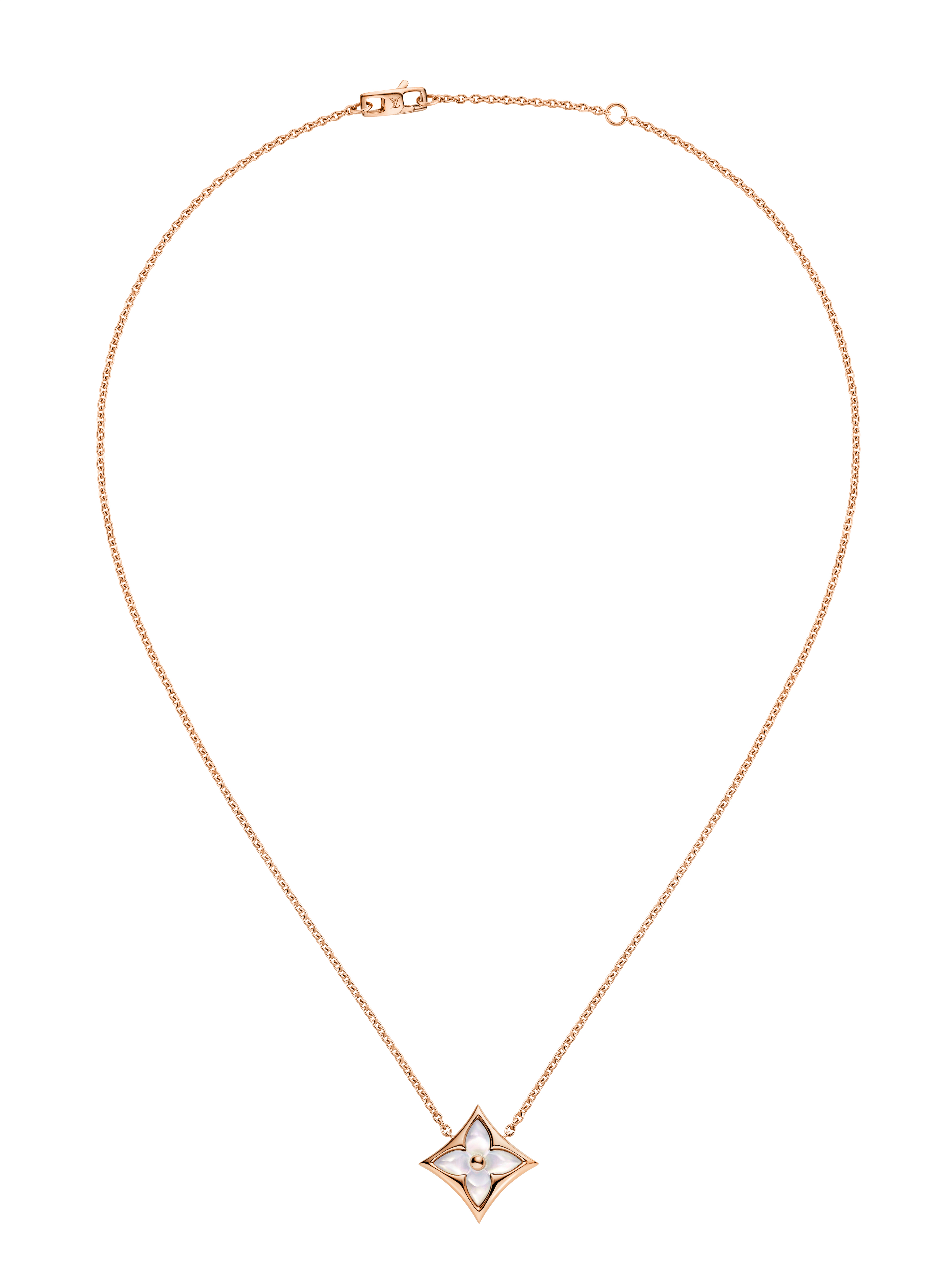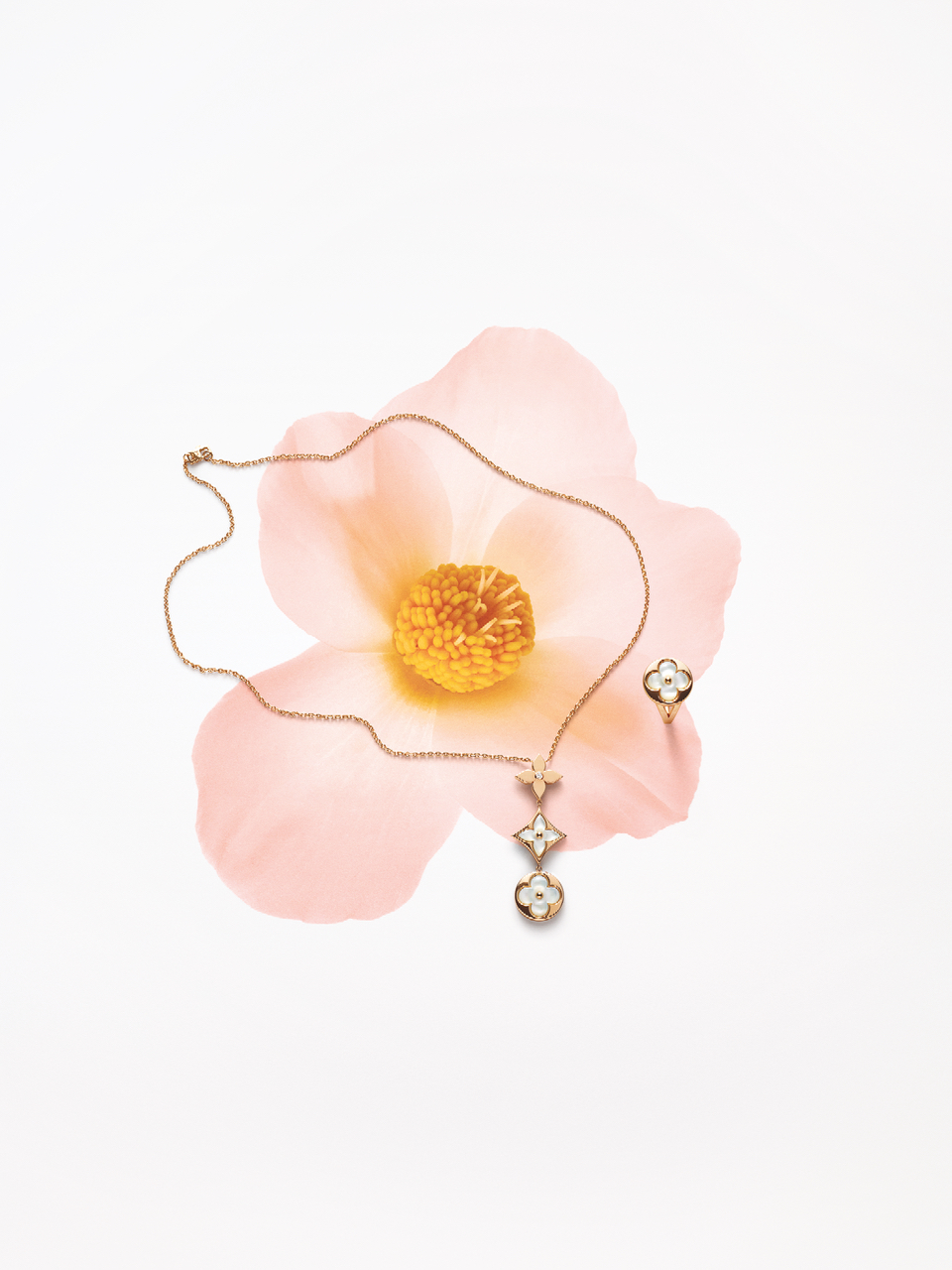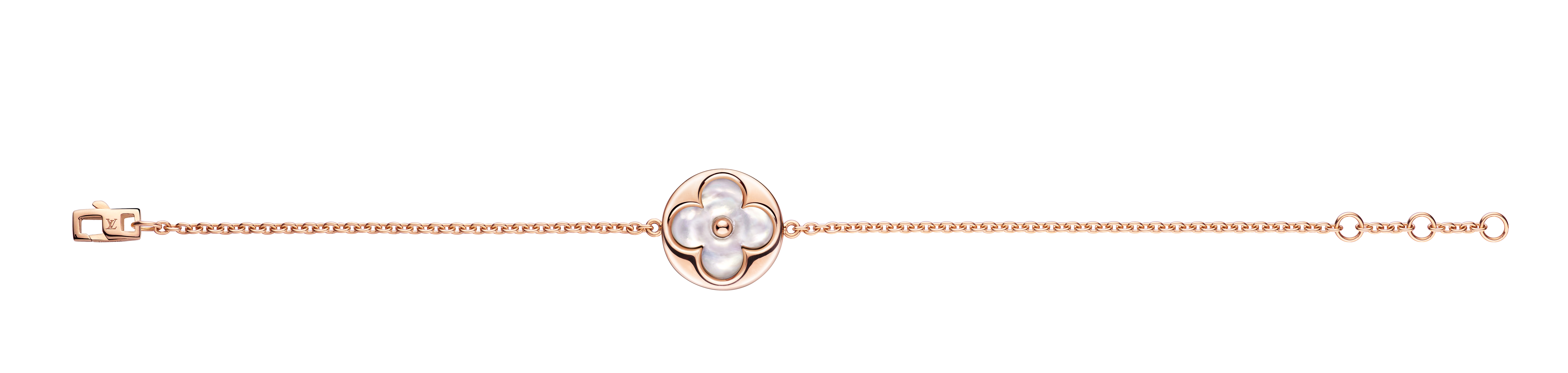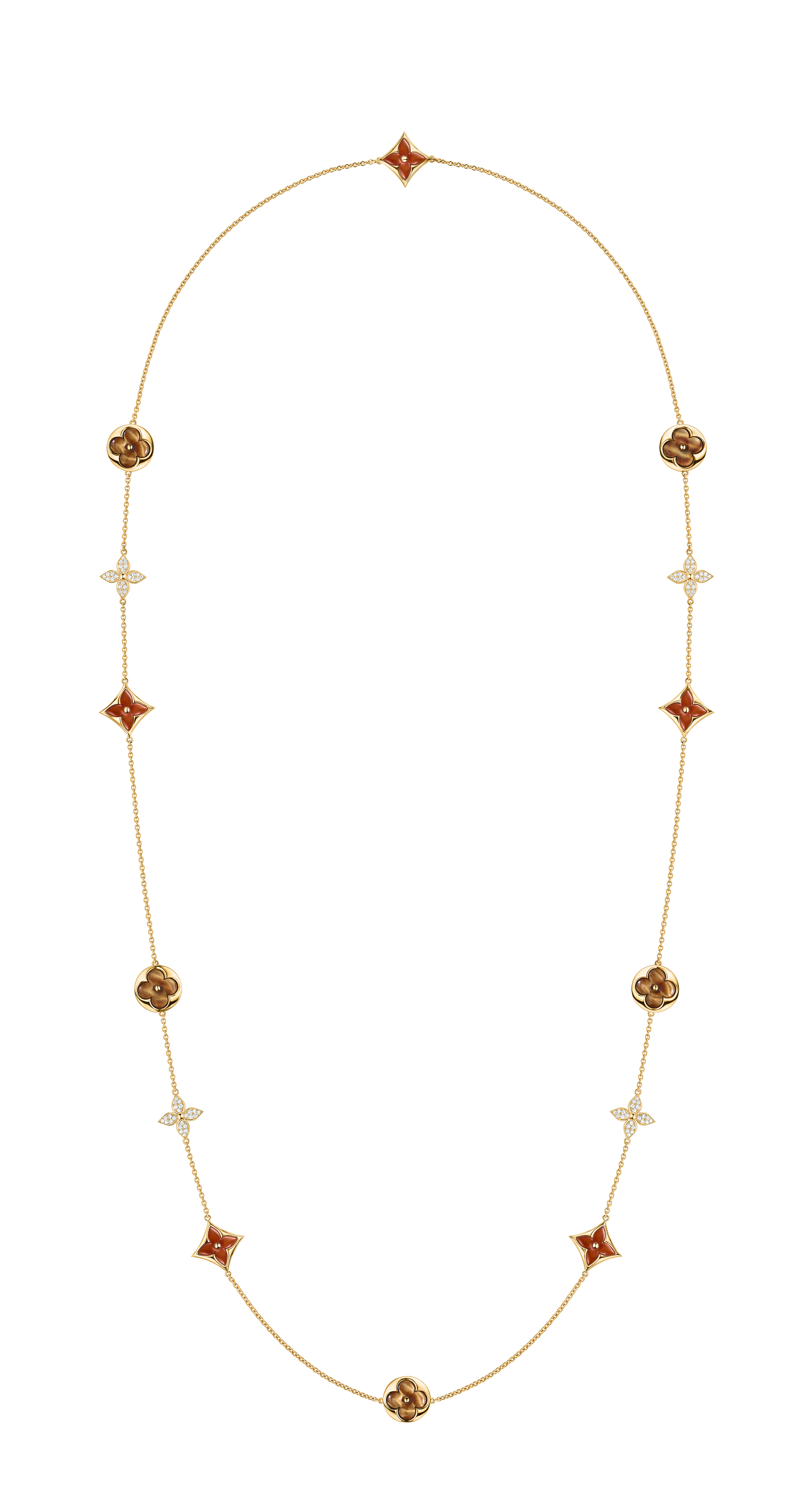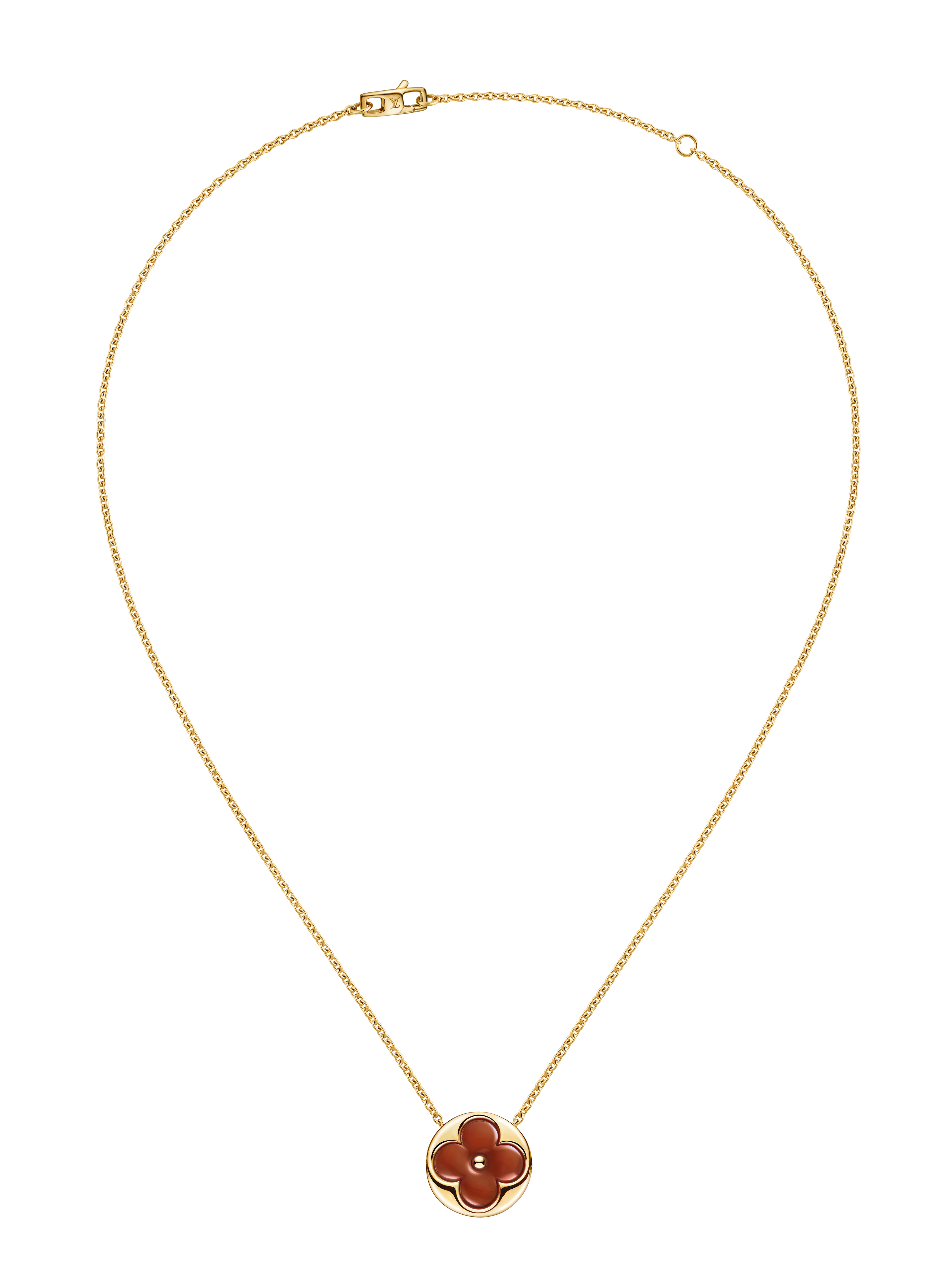 Un travail en trois dimensions de la nacre et de la pierre dure permet de faire s’épanouir la Fleur de Monogram sur les sautoirs, colliers, bracelets et boucles d’oreilles de la ligne de joaillerie Blossom. Nacre grise ou blanche, cornaline ou œil-de-tigre s’associent pour faire écho au colorama de la Maison Louis Vuitton, une harmonie chaleureuse de brun et d’or. Douceur que l’on retrouve dans le toucher des pièces : sculptées et polies à la main, pierres et nacre proposent un profil tout en bombé qui contraste avec la finesse des chaines en or jaune ou rose. Un clou doré, évocation de ceux utilisés sur les malles Louis Vuitton, vient se piquer au cœur de certains pétales. Enchâssée dans un cercle ou un losange, la Fleur de Monogram incarne à la fois le patrimoine et le savoir-faire de la Maison. Un éloge de la subtilité, sublimé par deux pièces de haute joaillerie dont un sautoir entièrement pavé de diamants et un collier aux médaillons de nacre sculptés sur un rang de perles de Tahiti. Entre harmonie et sensualité, la collection Blossom permet de faire fleurir l’un des grands symboles de Louis Vuitton dans les règles absolues de son art de la joaillerie.