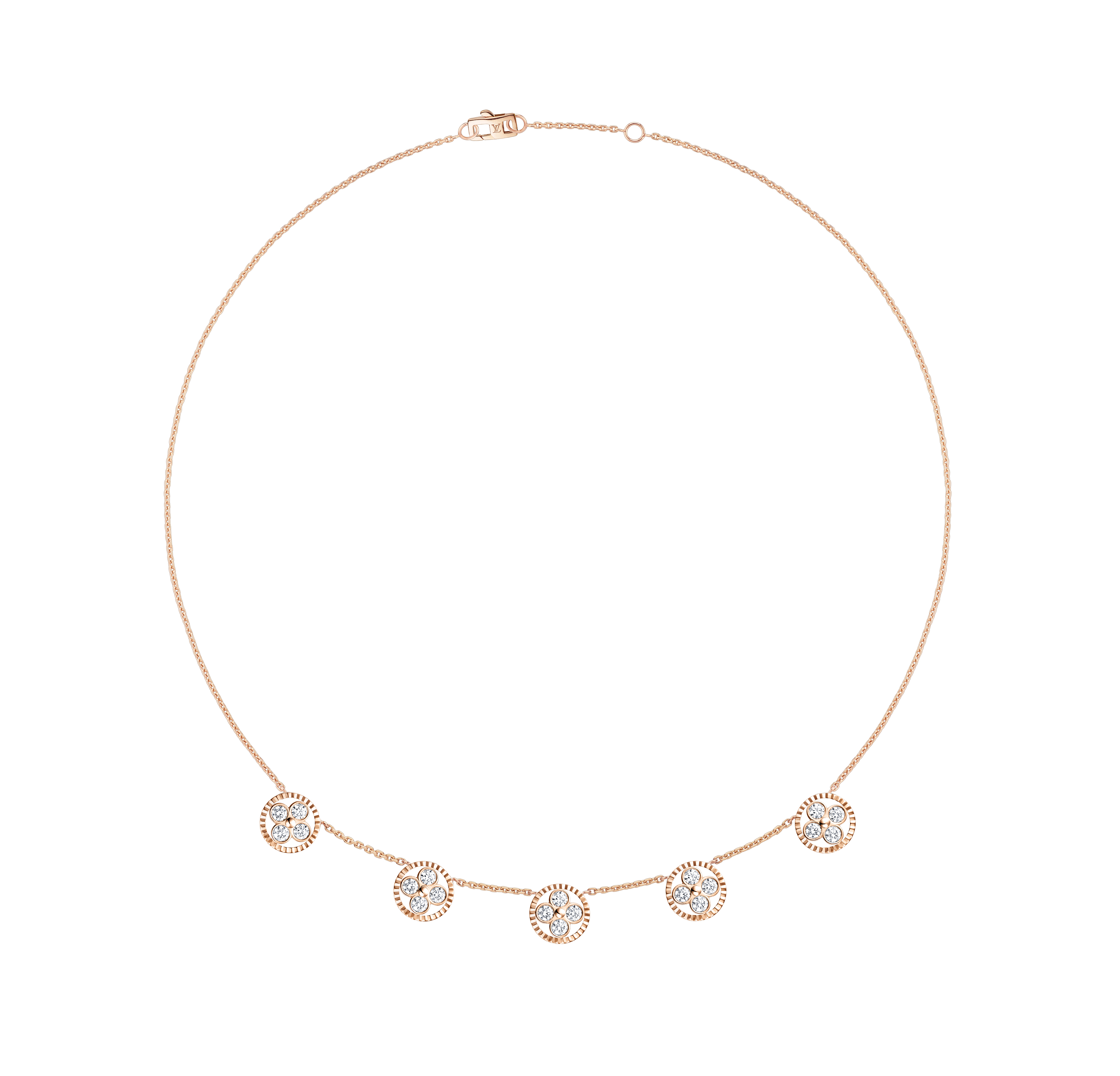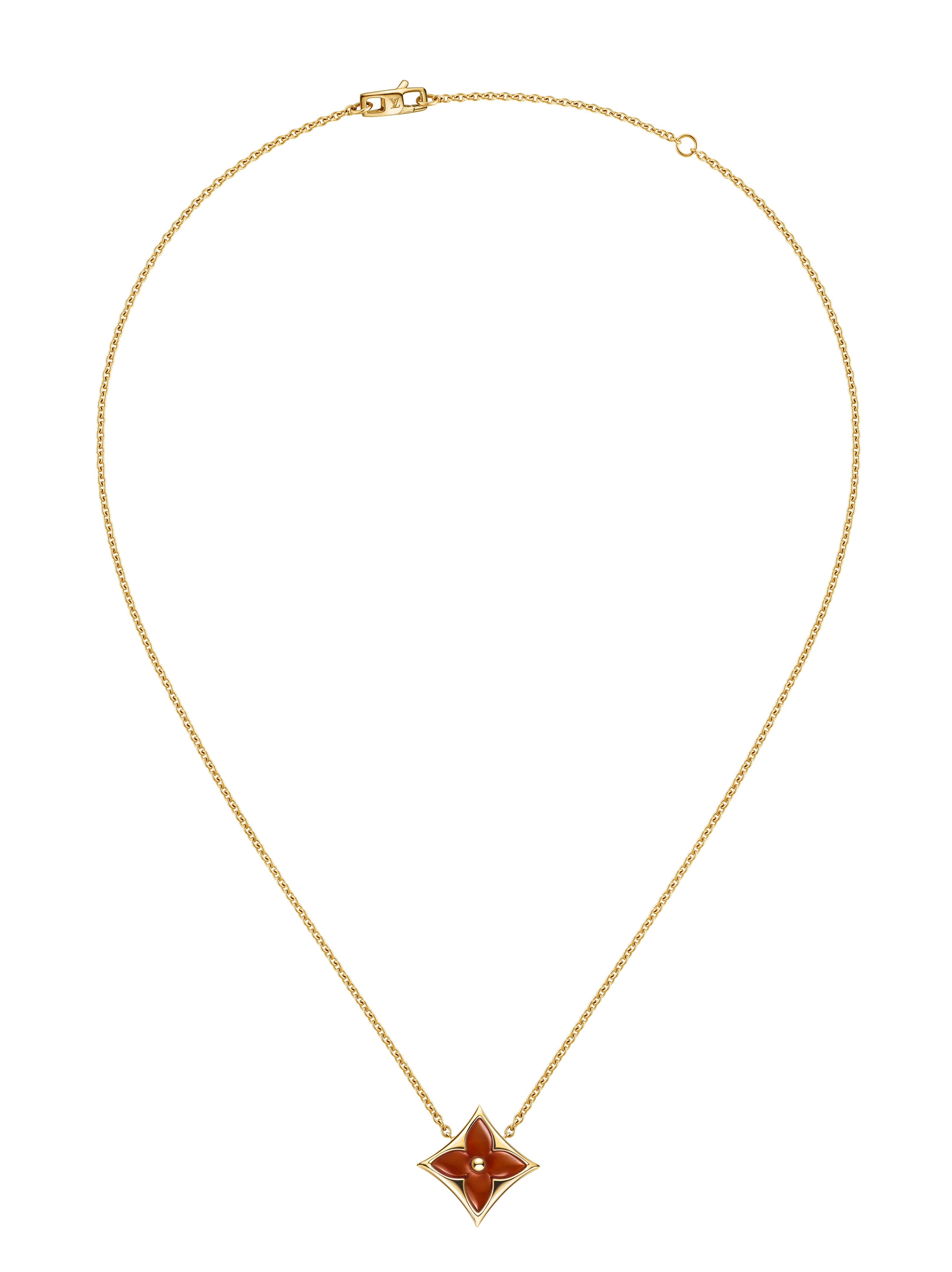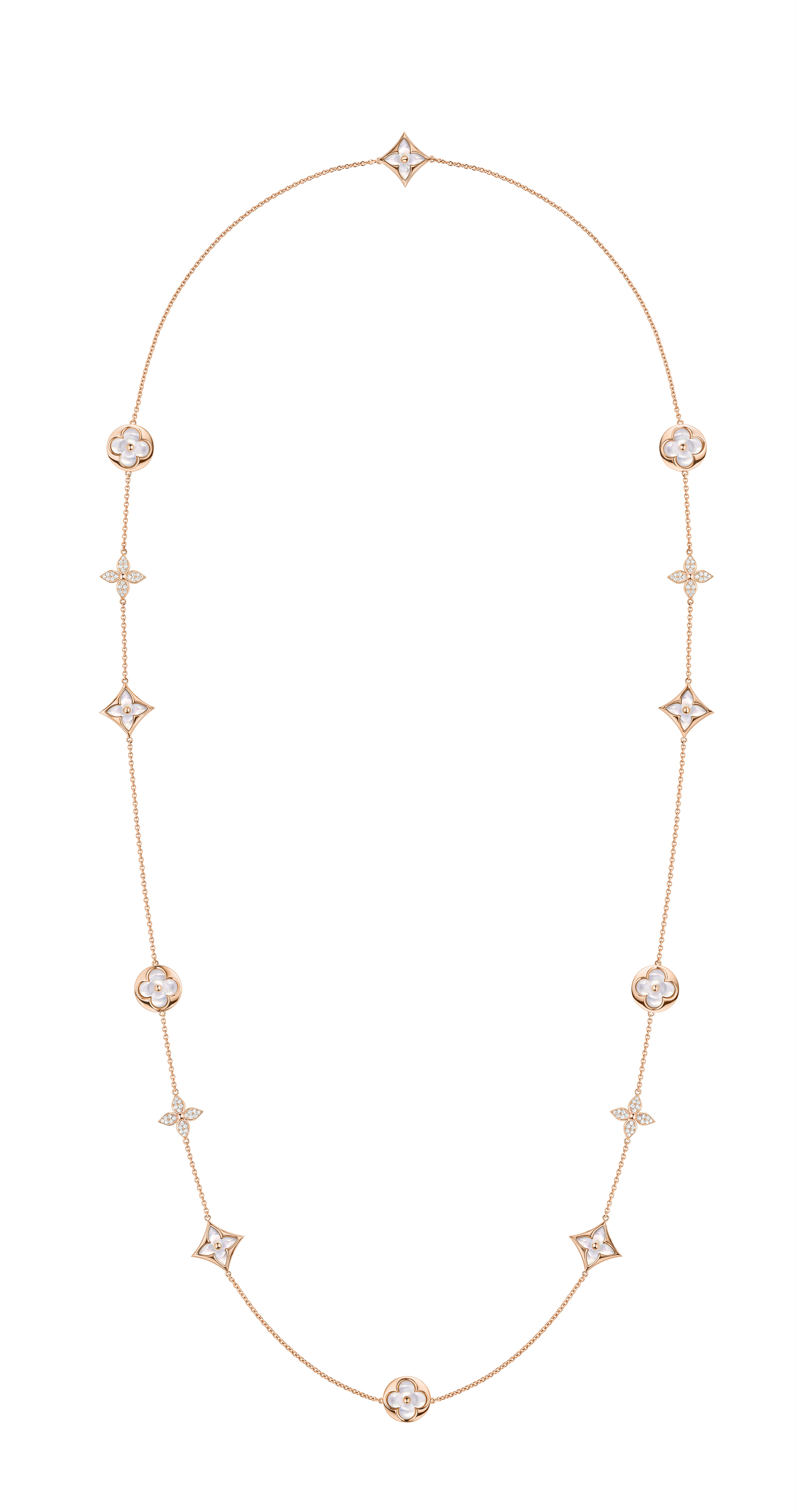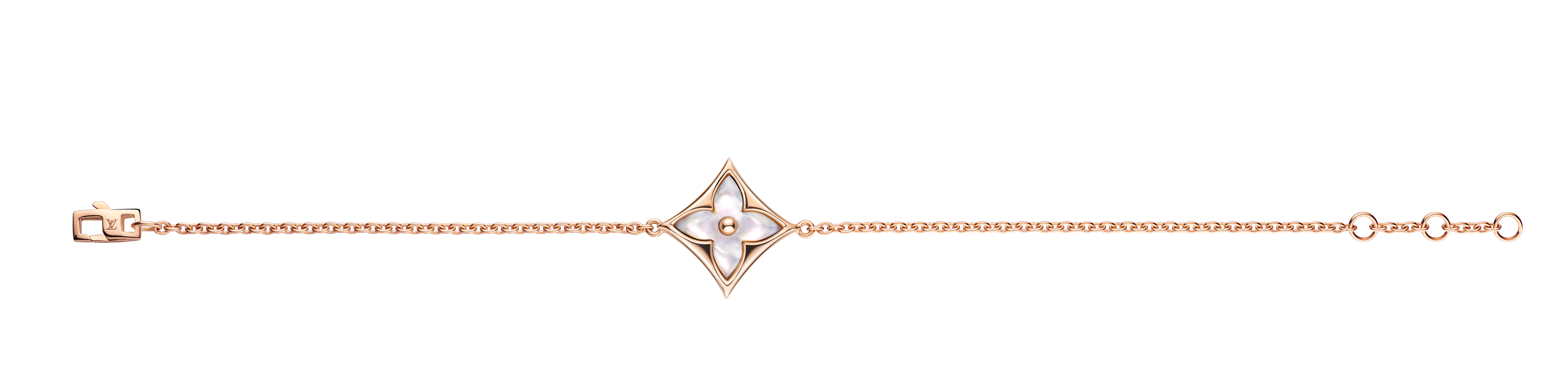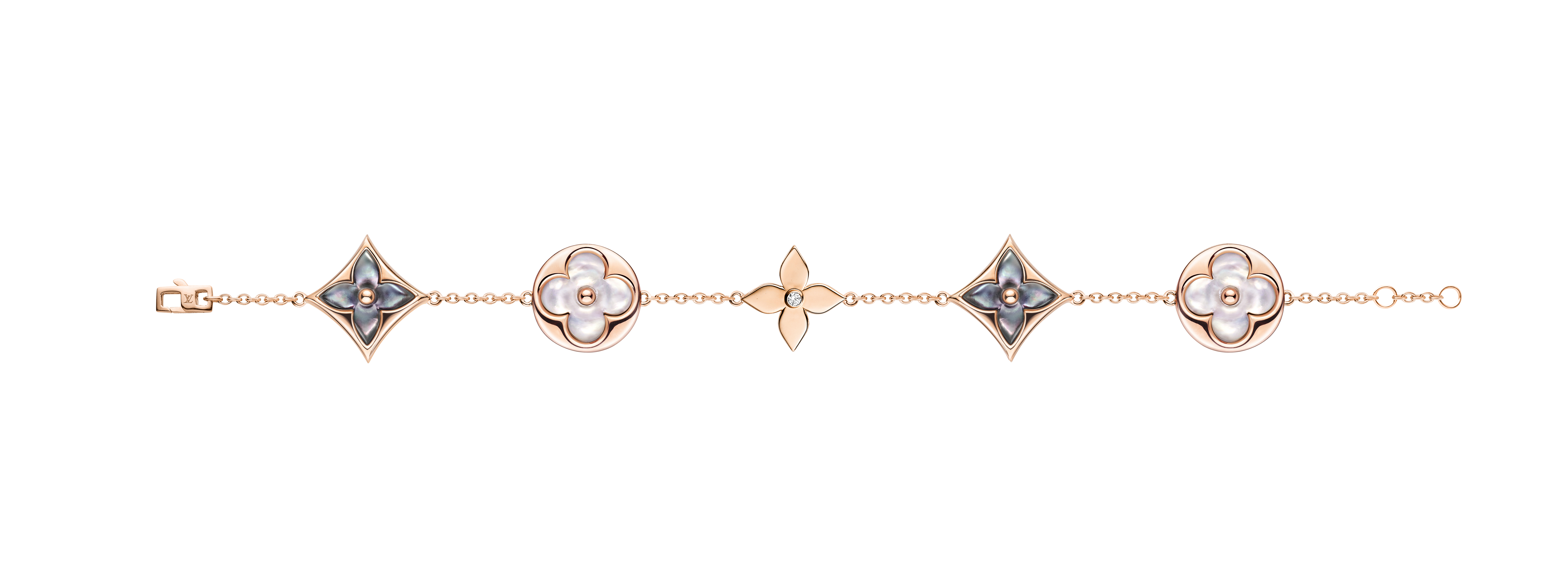 Un travail en trois dimensions de la nacre et de la pierre dure permet de faire s’épanouir la Fleur de Monogram sur les sautoirs, colliers, bracelets et boucles d’oreilles de la ligne de joaillerie Blossom. Nacre grise ou blanche, cornaline ou œil-de-tigre s’associent pour faire écho au colorama de la Maison Louis Vuitton, une harmonie chaleureuse de brun et d’or. Douceur que l’on retrouve dans le toucher des pièces : sculptées et polies à la main, pierres et nacre proposent un profil tout en bombé qui contraste avec la finesse des chaines en or jaune ou rose. Un clou doré, évocation de ceux utilisés sur les malles Louis Vuitton, vient se piquer au cœur de certains pétales. Enchâssée dans un cercle ou un losange, la Fleur de Monogram incarne à la fois le patrimoine et le savoir-faire de la Maison. Un éloge de la subtilité, sublimé par deux pièces de haute joaillerie dont un sautoir entièrement pavé de diamants et un collier aux médaillons de nacre sculptés sur un rang de perles de Tahiti. Entre harmonie et sensualité, la collection Blossom permet de faire fleurir l’un des grands symboles de Louis Vuitton dans les règles absolues de son art de la joaillerie.