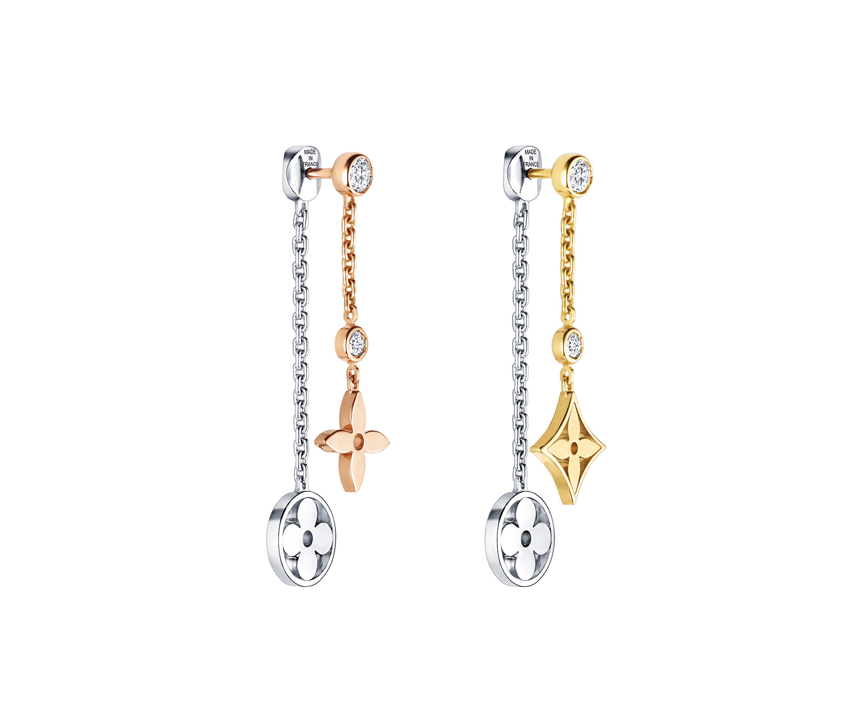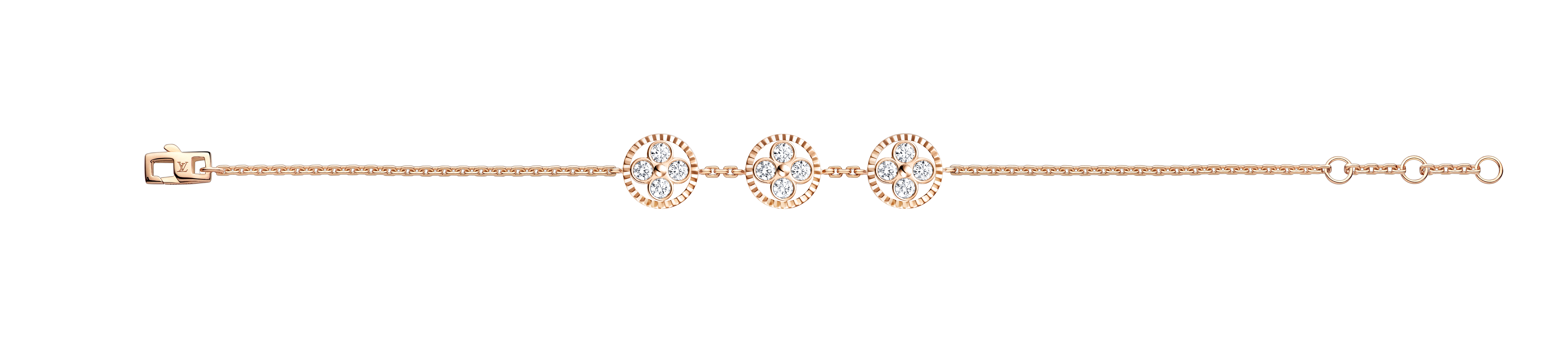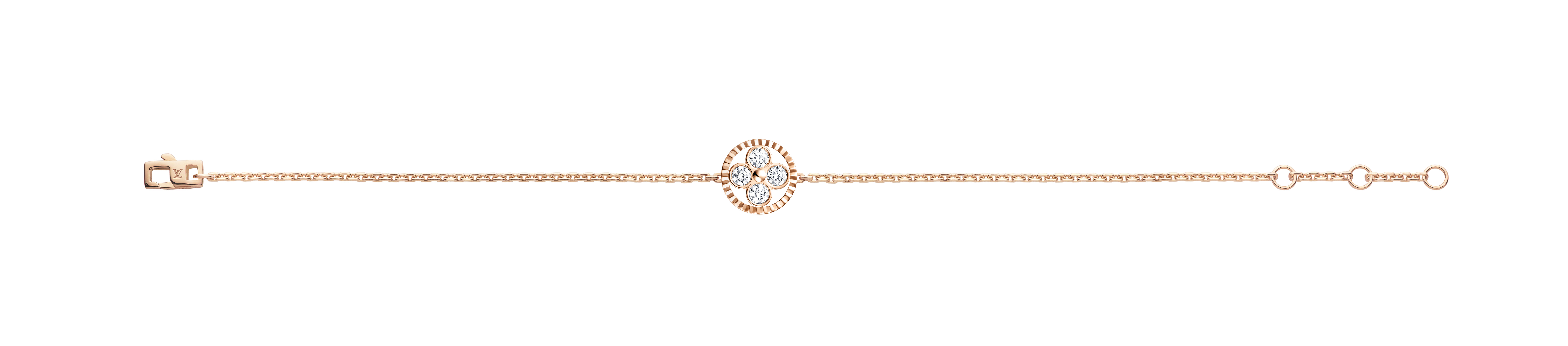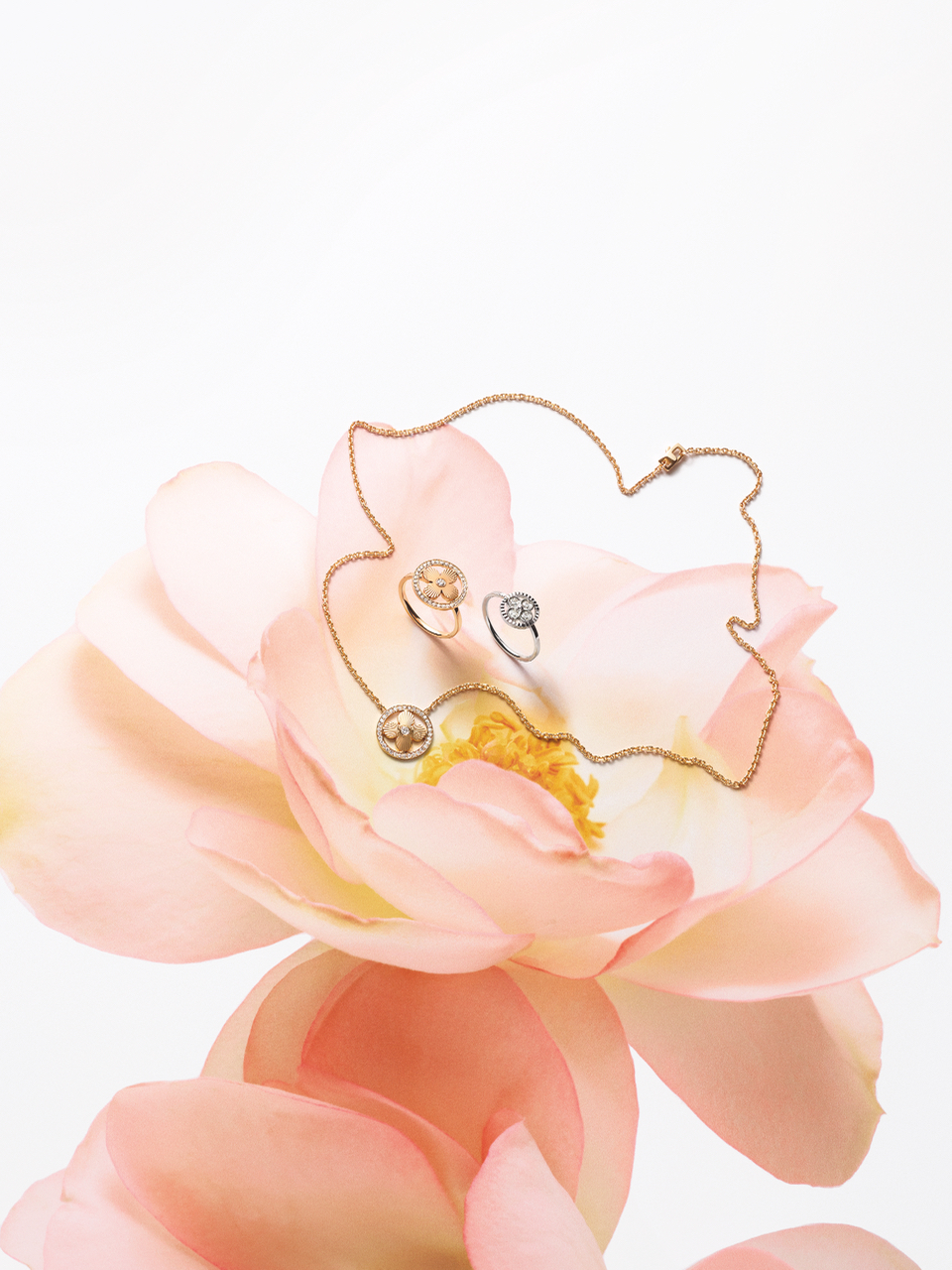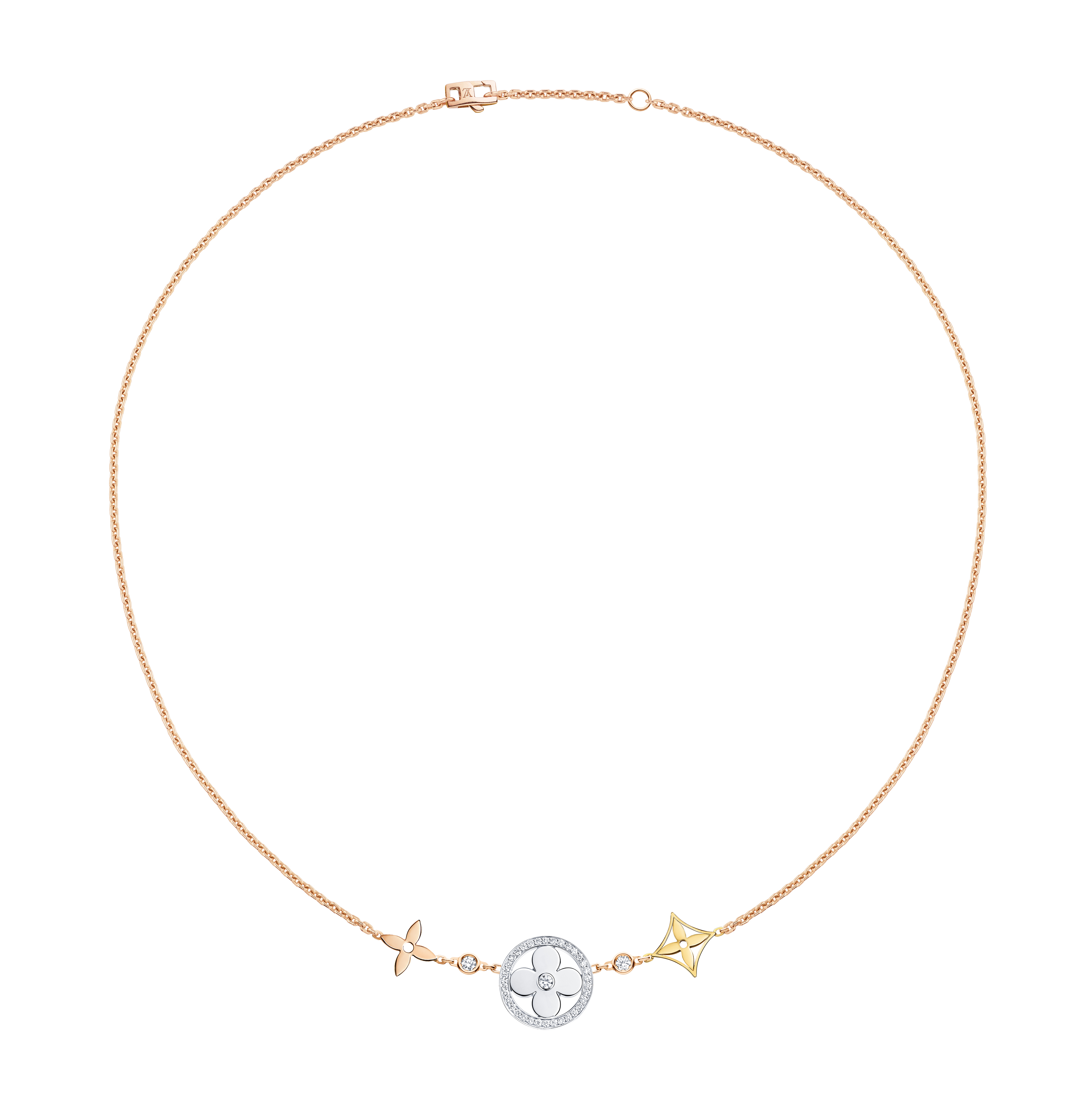 Un travail en trois dimensions de la nacre et de la pierre dure permet de faire s’épanouir la Fleur de Monogram sur les sautoirs, colliers, bracelets et boucles d’oreilles de la ligne de joaillerie Blossom. Nacre grise ou blanche, cornaline ou œil-de-tigre s’associent pour faire écho au colorama de la Maison Louis Vuitton, une harmonie chaleureuse de brun et d’or. Douceur que l’on retrouve dans le toucher des pièces : sculptées et polies à la main, pierres et nacre proposent un profil tout en bombé qui contraste avec la finesse des chaines en or jaune ou rose. Un clou doré, évocation de ceux utilisés sur les malles Louis Vuitton, vient se piquer au cœur de certains pétales. Enchâssée dans un cercle ou un losange, la Fleur de Monogram incarne à la fois le patrimoine et le savoir-faire de la Maison. Un éloge de la subtilité, sublimé par deux pièces de haute joaillerie dont un sautoir entièrement pavé de diamants et un collier aux médaillons de nacre sculptés sur un rang de perles de Tahiti. Entre harmonie et sensualité, la collection Blossom permet de faire fleurir l’un des grands symboles de Louis Vuitton dans les règles absolues de son art de la joaillerie.