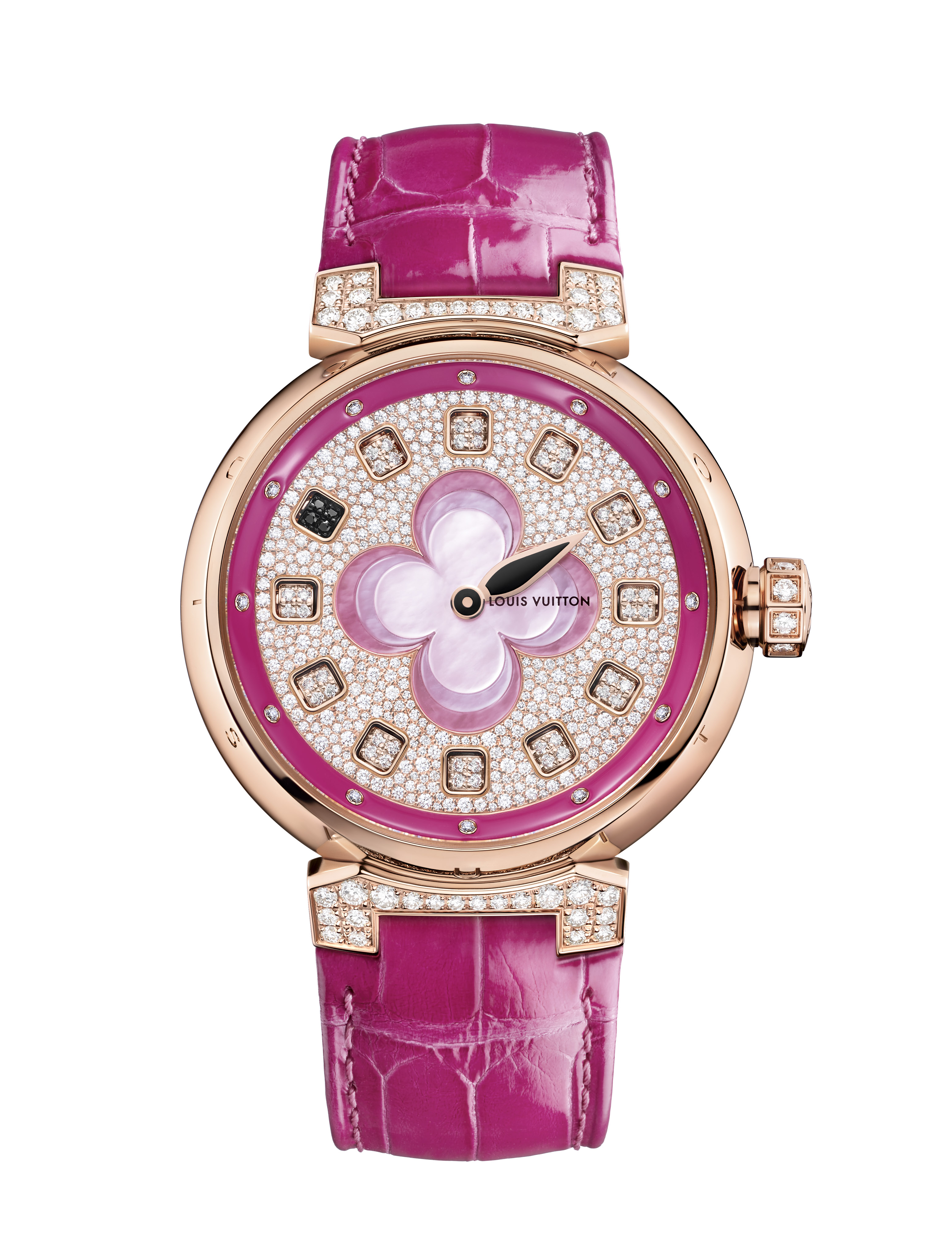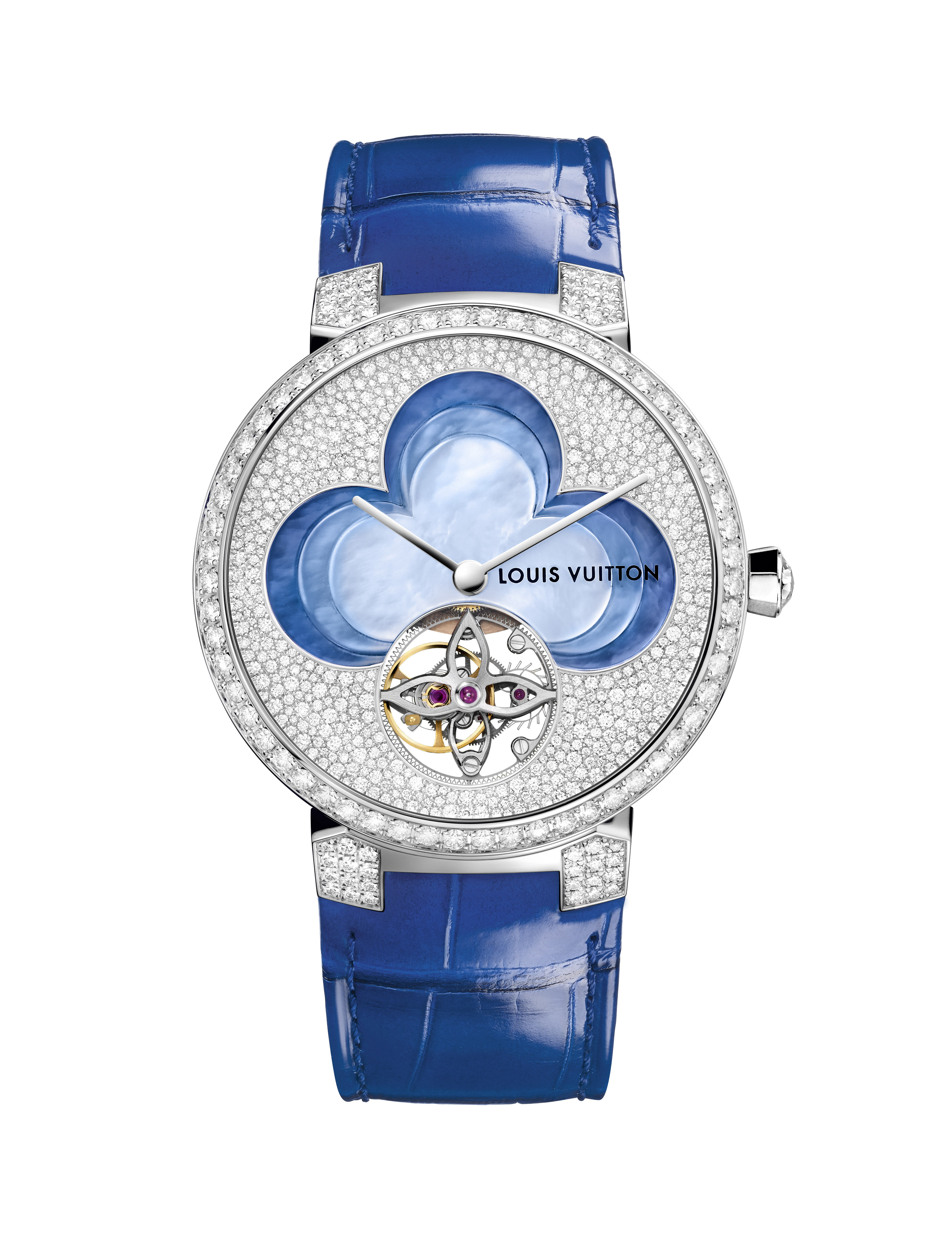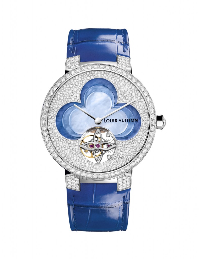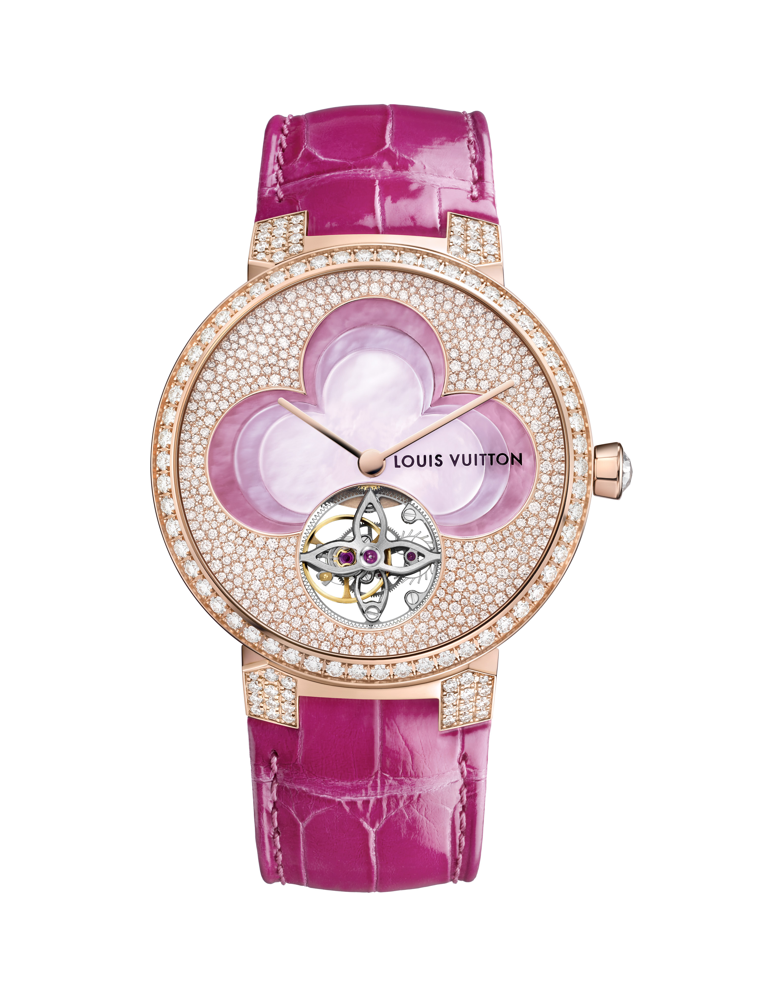 Sur la Tambour Monogram Tourbillon, l’un des pétales de la fleur laisse apparaître la cage en forme de fleur du tourbillon, mouvement conçu par la Fabrique du Temps Louis Vuitton. Comme sur la Tambour Spin Time, dont le mouvement permet de lire l’heure grâce à un système de cubes rotatifs pavés de diamants placés autour de la fleur centrale. Le bracelet en alligator ton sur ton s’associe à la Fleur de Monogram rose ou bleue.