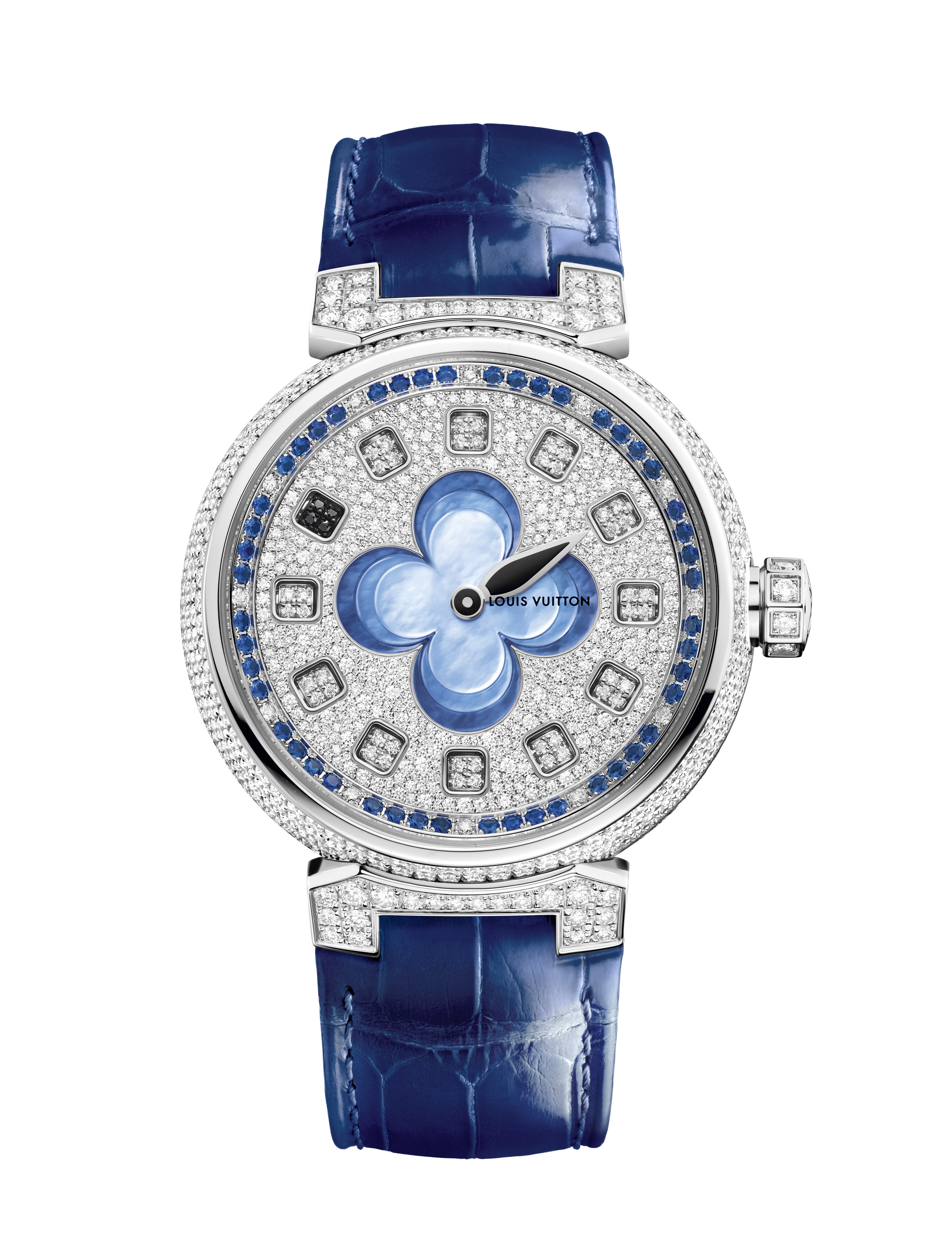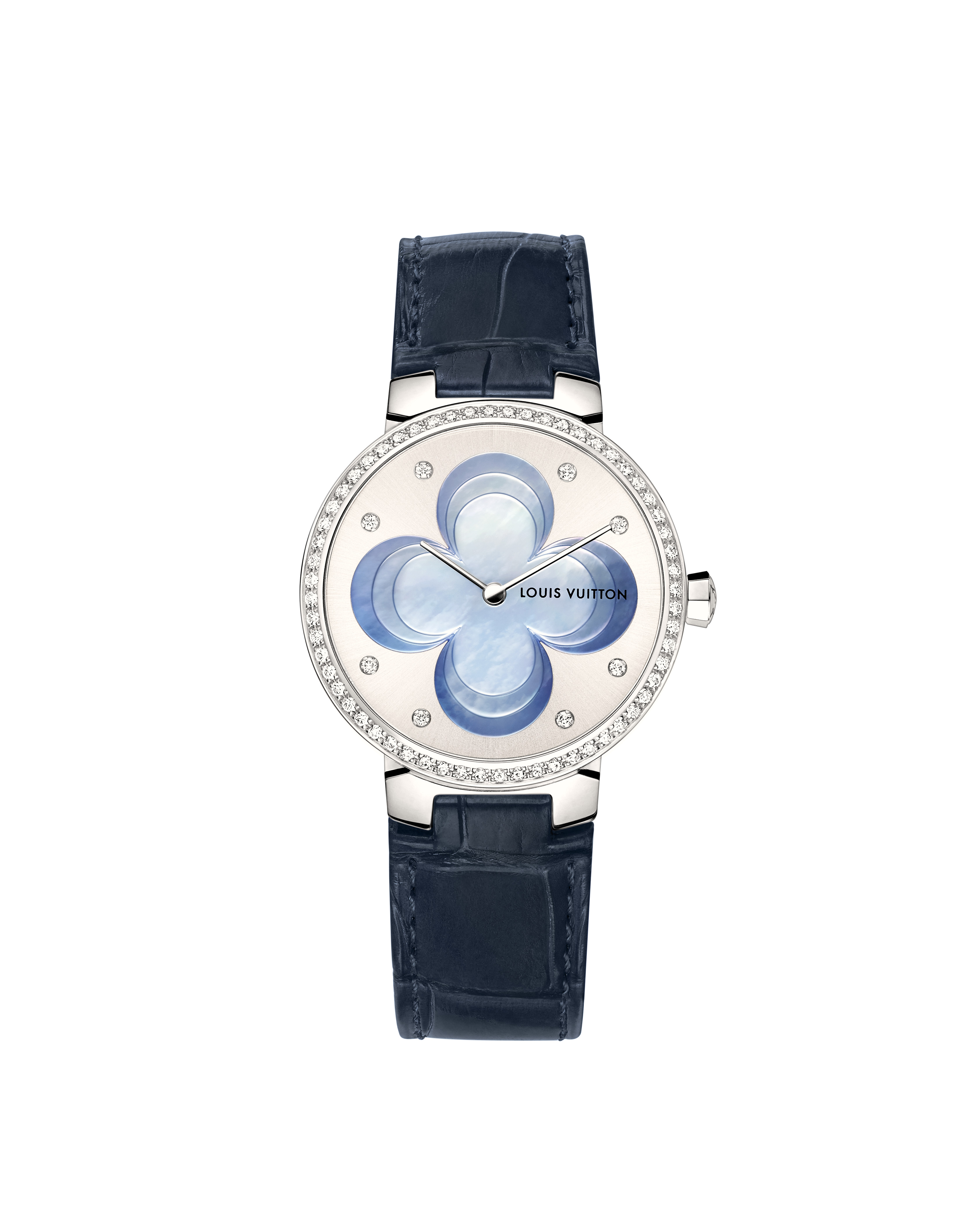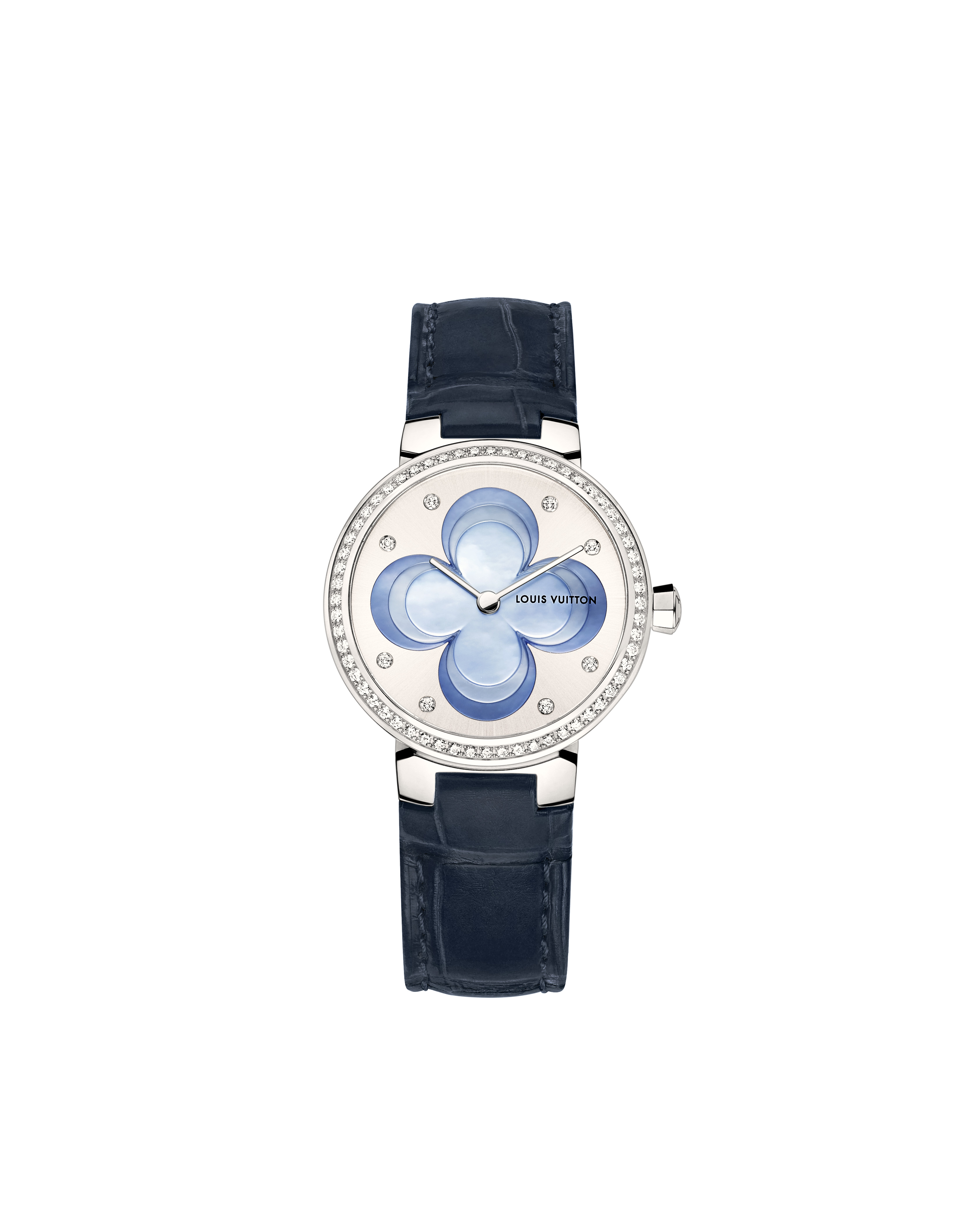 Sur la Tambour Monogram Tourbillon, l’un des pétales de la fleur laisse apparaître la cage en forme de fleur du tourbillon, mouvement conçu par la Fabrique du Temps Louis Vuitton. Comme sur la Tambour Spin Time, dont le mouvement permet de lire l’heure grâce à un système de cubes rotatifs pavés de diamants placés autour de la fleur centrale. Le bracelet en alligator ton sur ton s’associe à la Fleur de Monogram rose ou bleue.