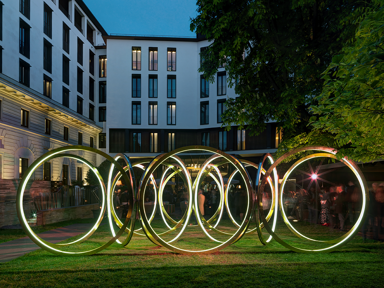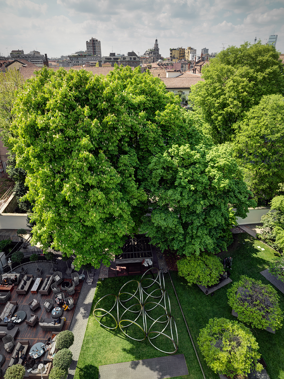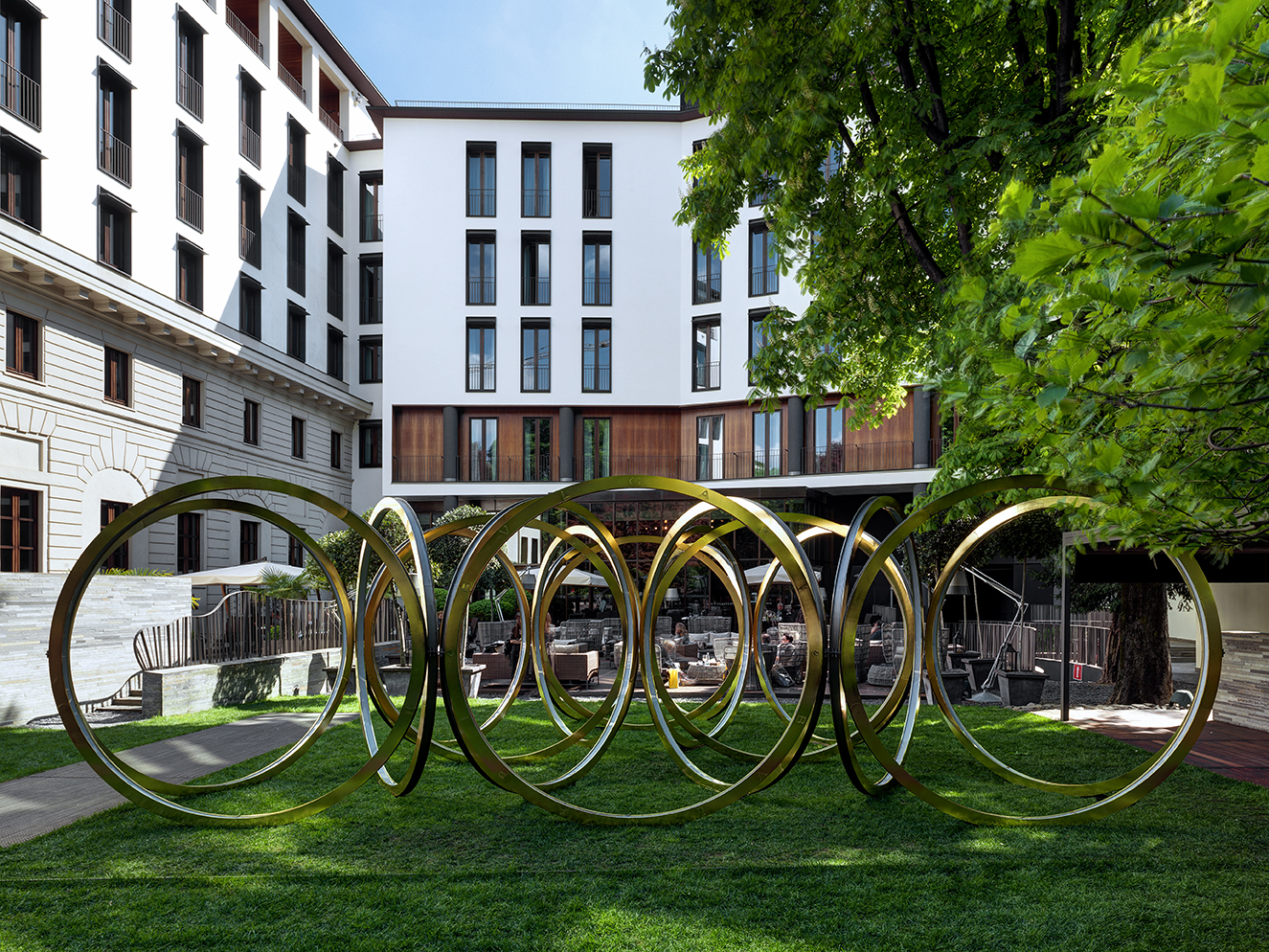 Créée par le cabinet d’architectes NaNa, l’impressionnante sculpture représentant l’emblématique bague en or se déploiera au coeur des jardins du Bulgari Hotel Milan pendant toute la durée de la Design Week, du 12 au 17 avril.