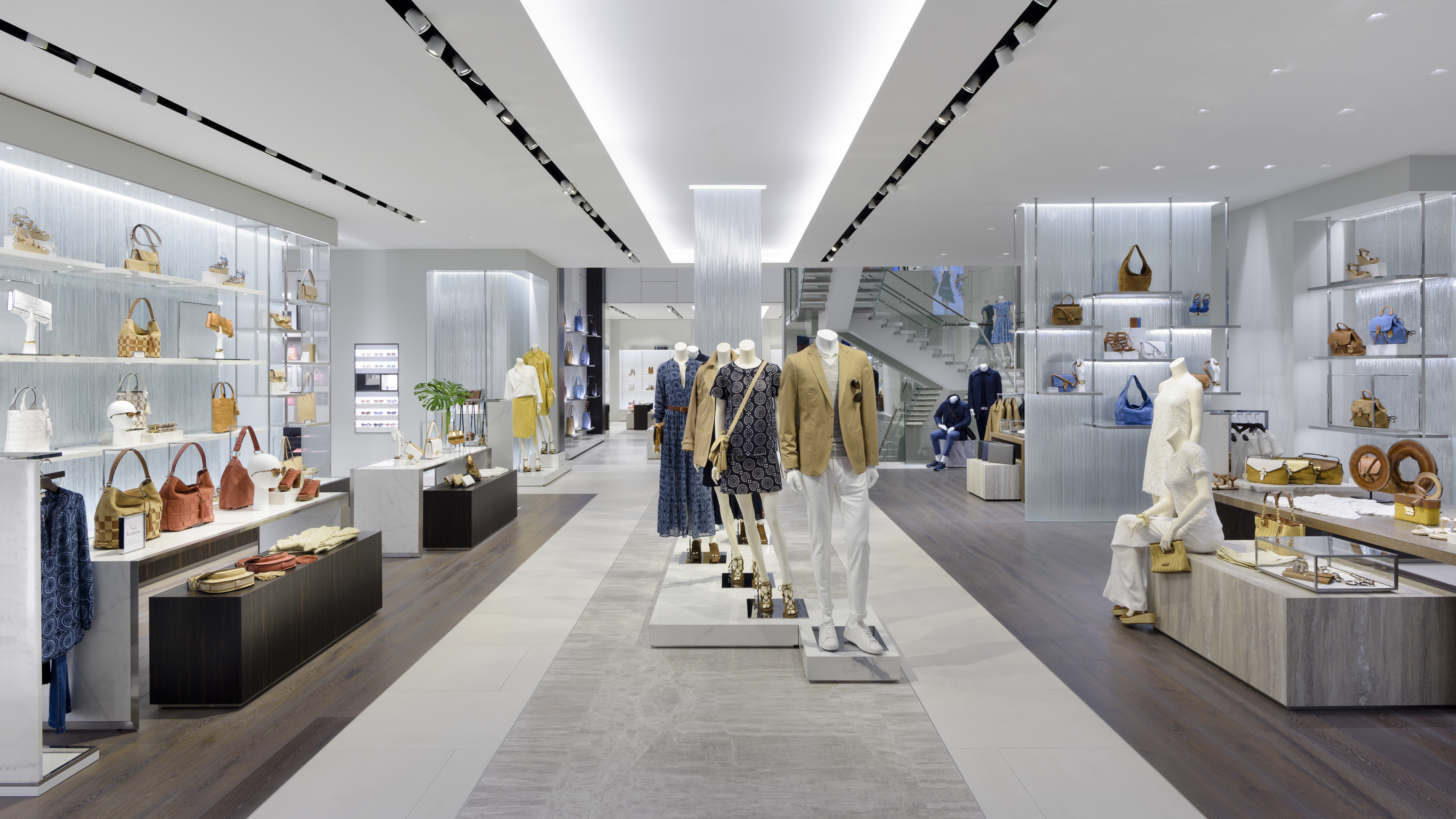 Le rez-de-chaussée accueille les accessoires des labels Michael Kors Collection et MICHAEL Michael Kors de la marque : sacs à main, petite maroquinerie, montres, bijoux et lunettes… Des salons séparés ont été installés pour les deux collections de chaussures de la marque. Un incroyable escalier flottant fait de dalles transparentes en acrylique avec des éclairages intégrés relie le rez-de-chaussée au premier étage. Le mur adjacent de deux étages est consacré aux sacs à main de Michael Kors Collection. Au premier étage, les clients retrouvent le prêt-à-porter de la marque, avec des espaces distincts pour les articles Michael Kors Collection et MICHAEL Michael Kors, chacun disposant de ses propres cabines d’essayage.