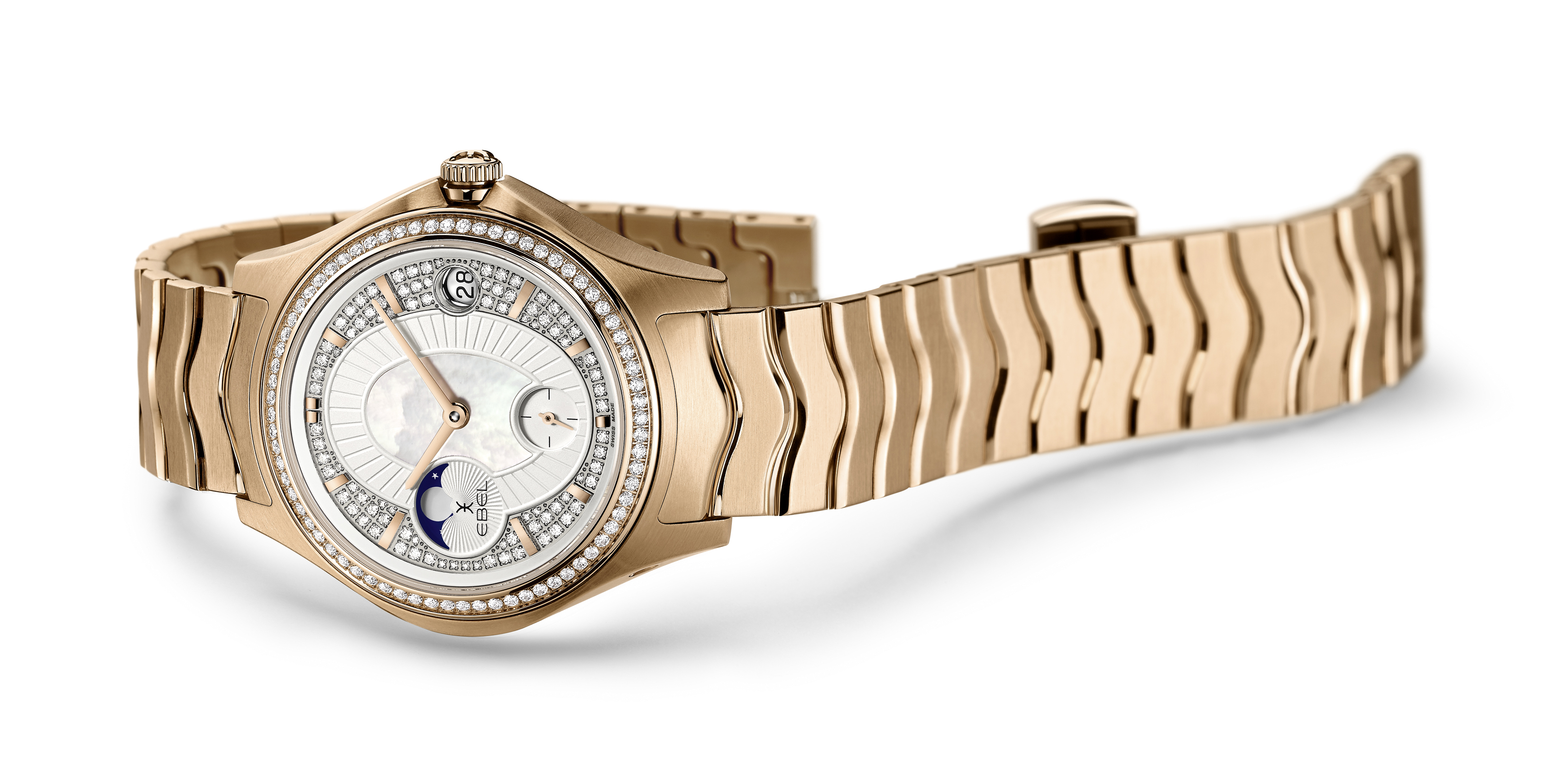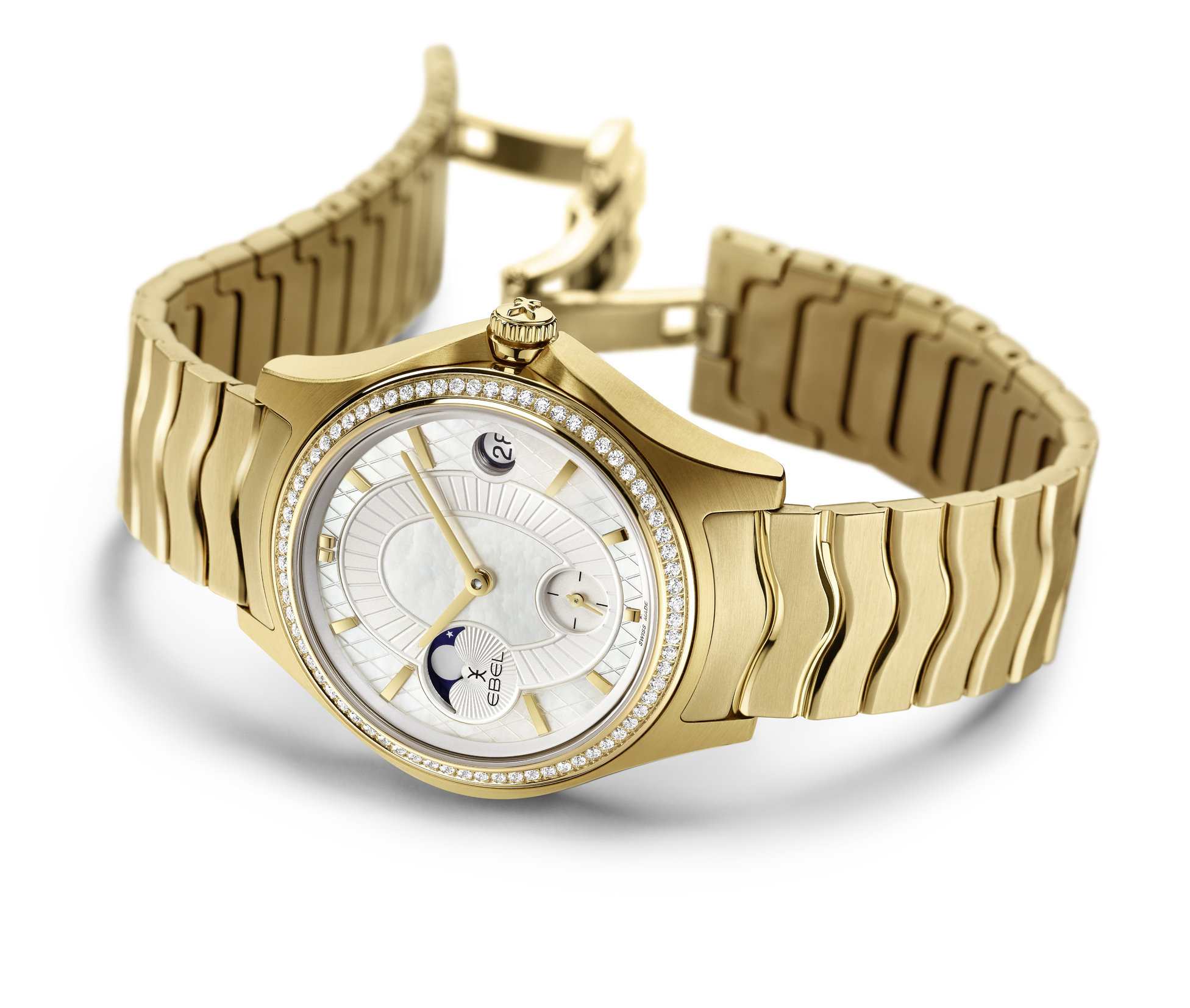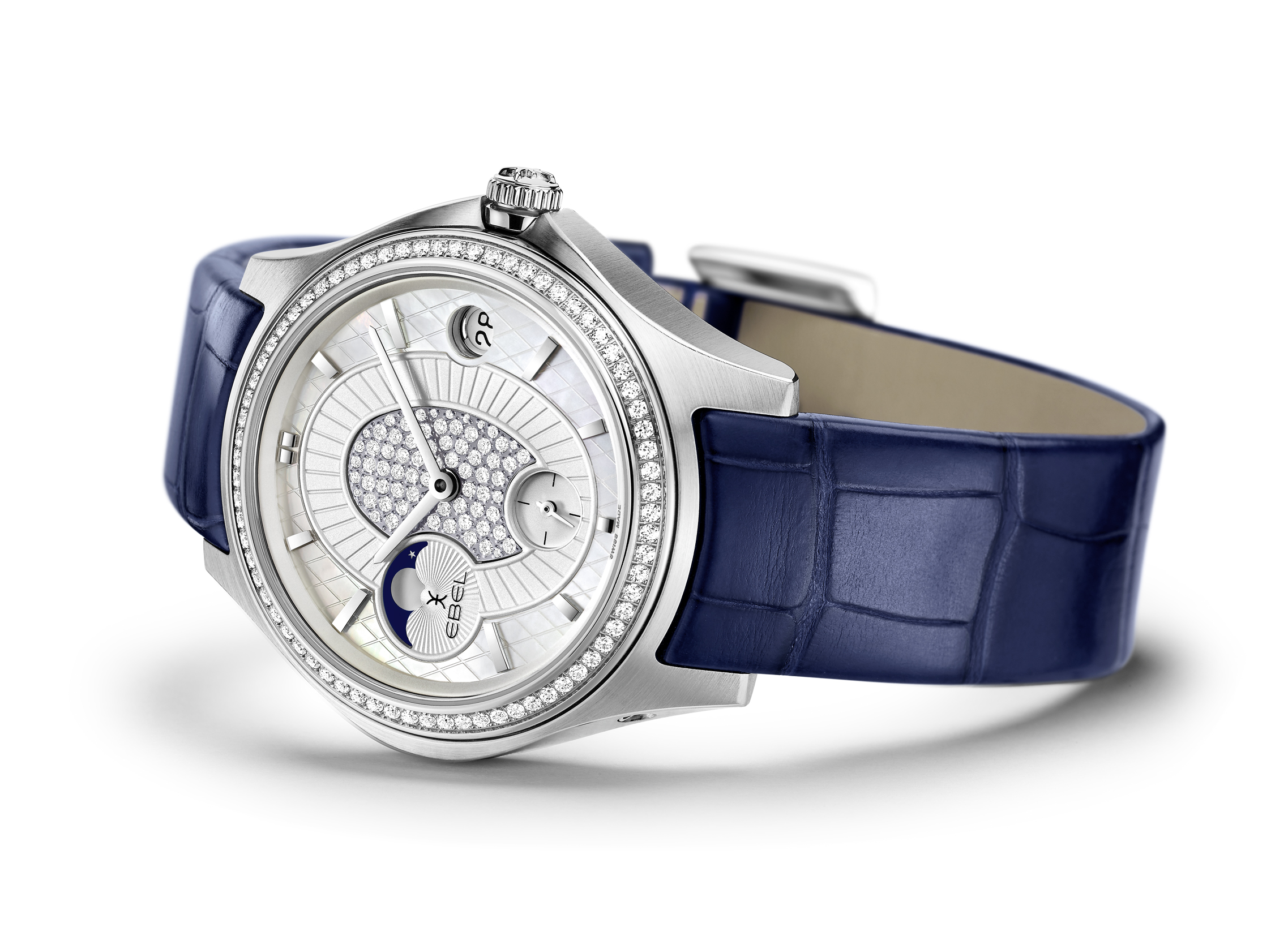 LA MAISON EBEL LIMITED EDITION est disponible en or jaune, blanc ou rose, muni d’un bracelet assorti ou une couleur cognac, bleu nuit ou bracelet en alligator noir. Ces modèles possèdent tous un mouvement automatique dans la plus fidèle tradition suisse. Cette pièce d’horlogerie chef-d’œuvre est en outre mis en évidence dans la phase de lune de son sunray, qui représente le passage du temps, la nuit et le jour et les saisons. En touche finale, le fond du boîtier ouvert révèle la masse oscillante personnalisée, ainsi qu’un vibrant hommage à la Villa Turque, maison mère de la marque EBEL.