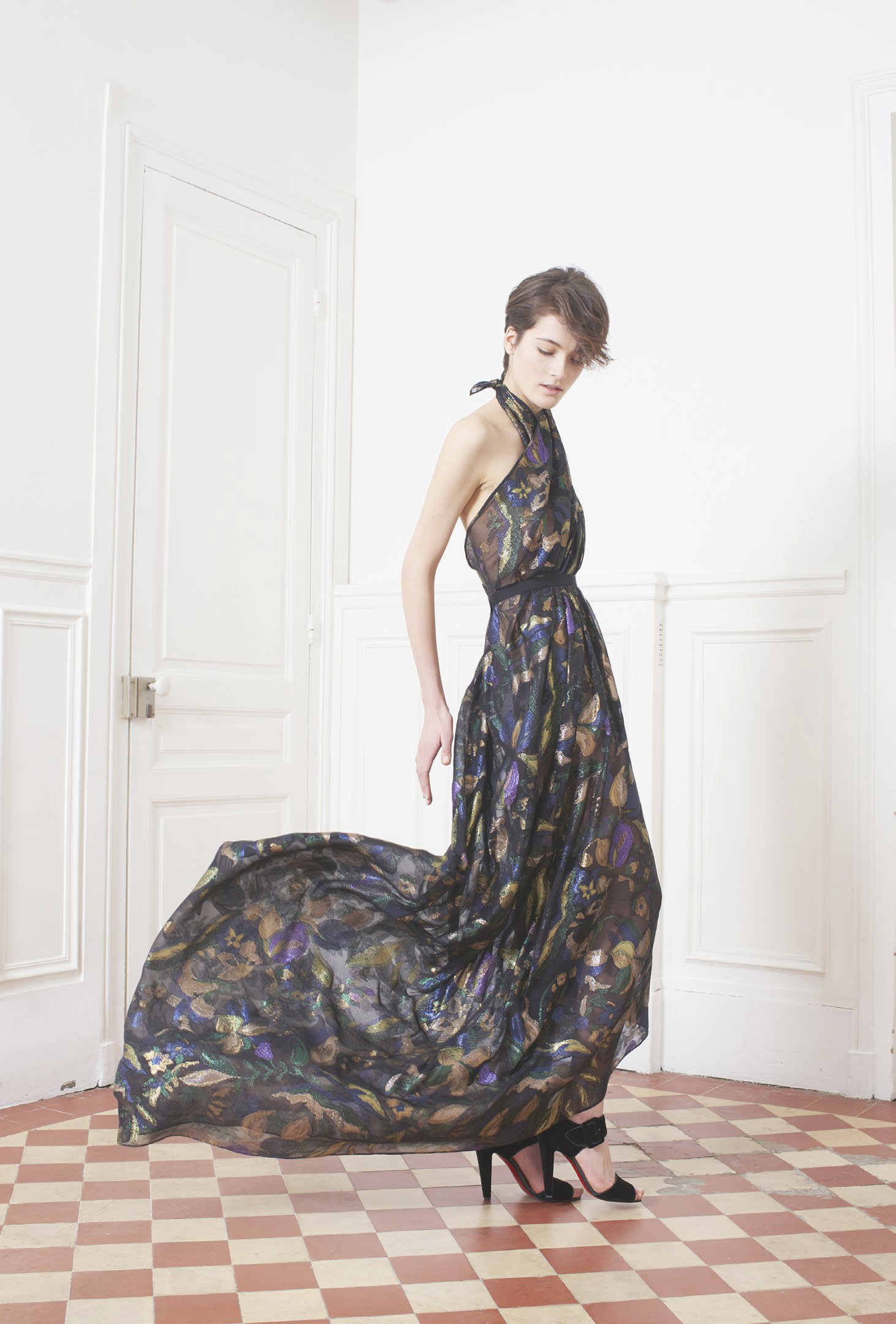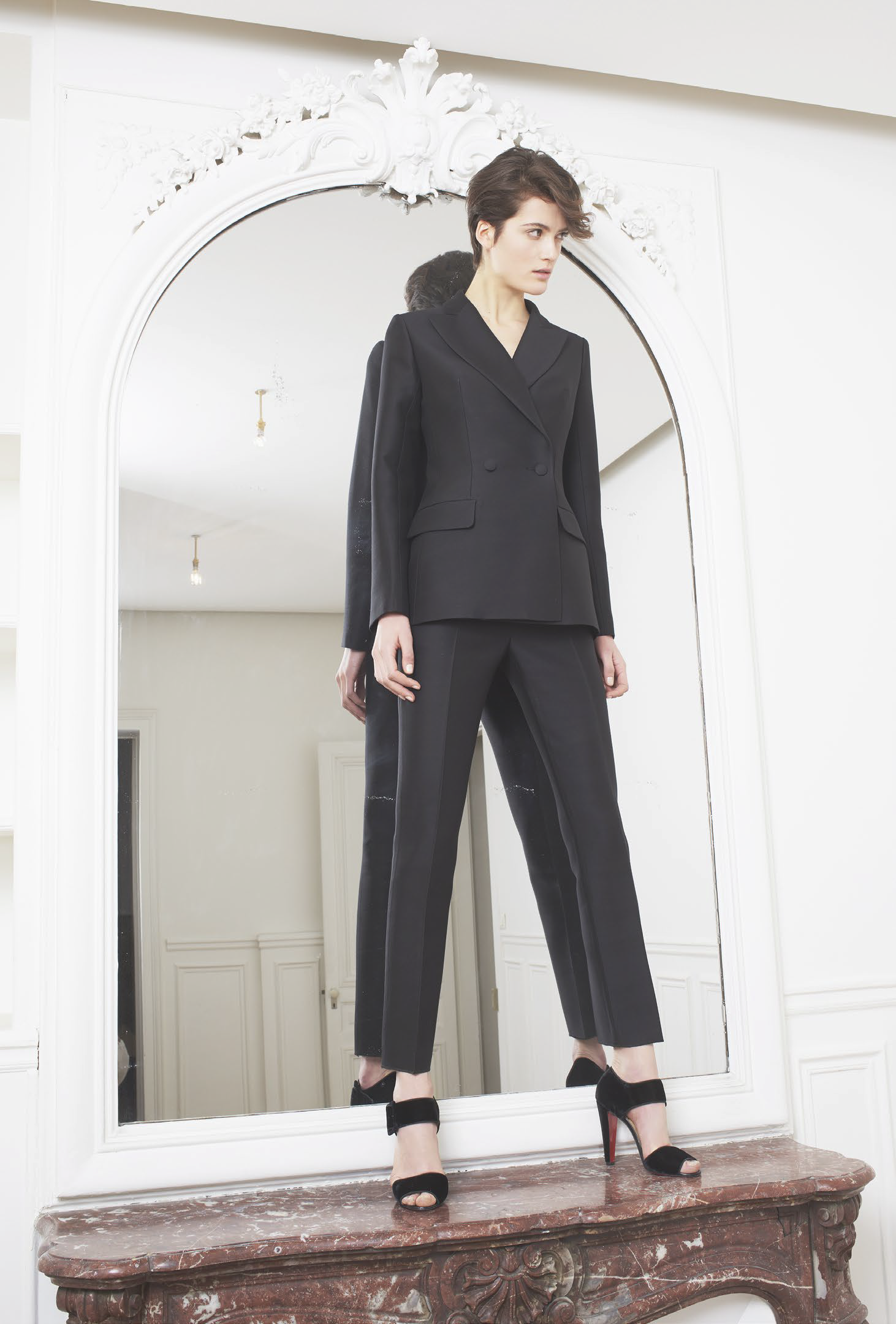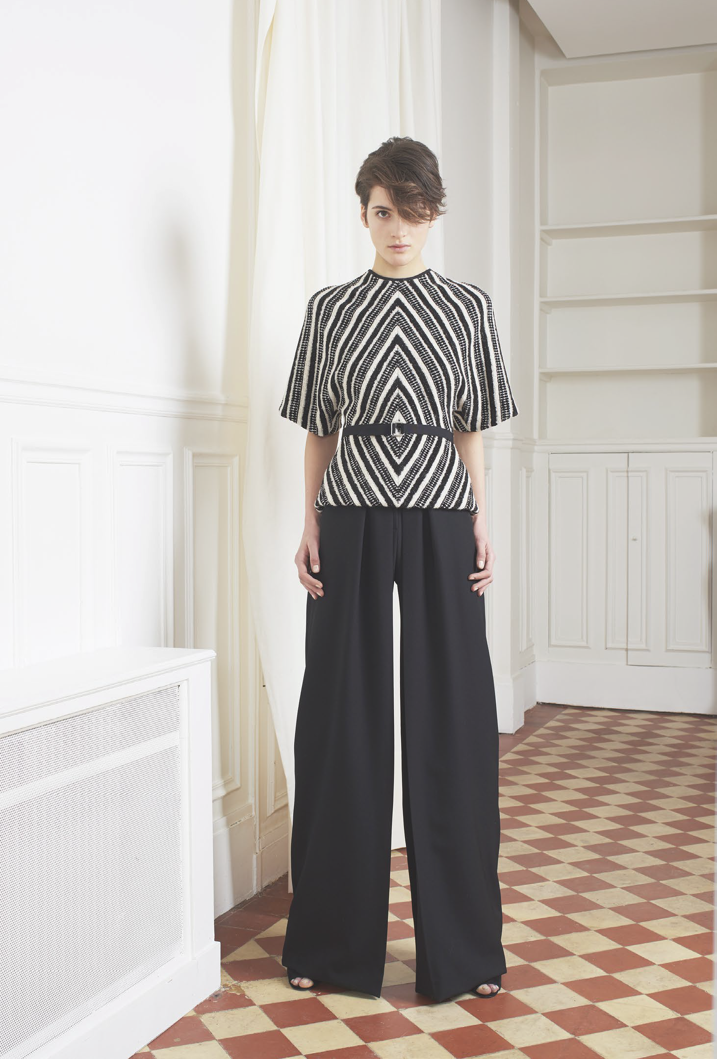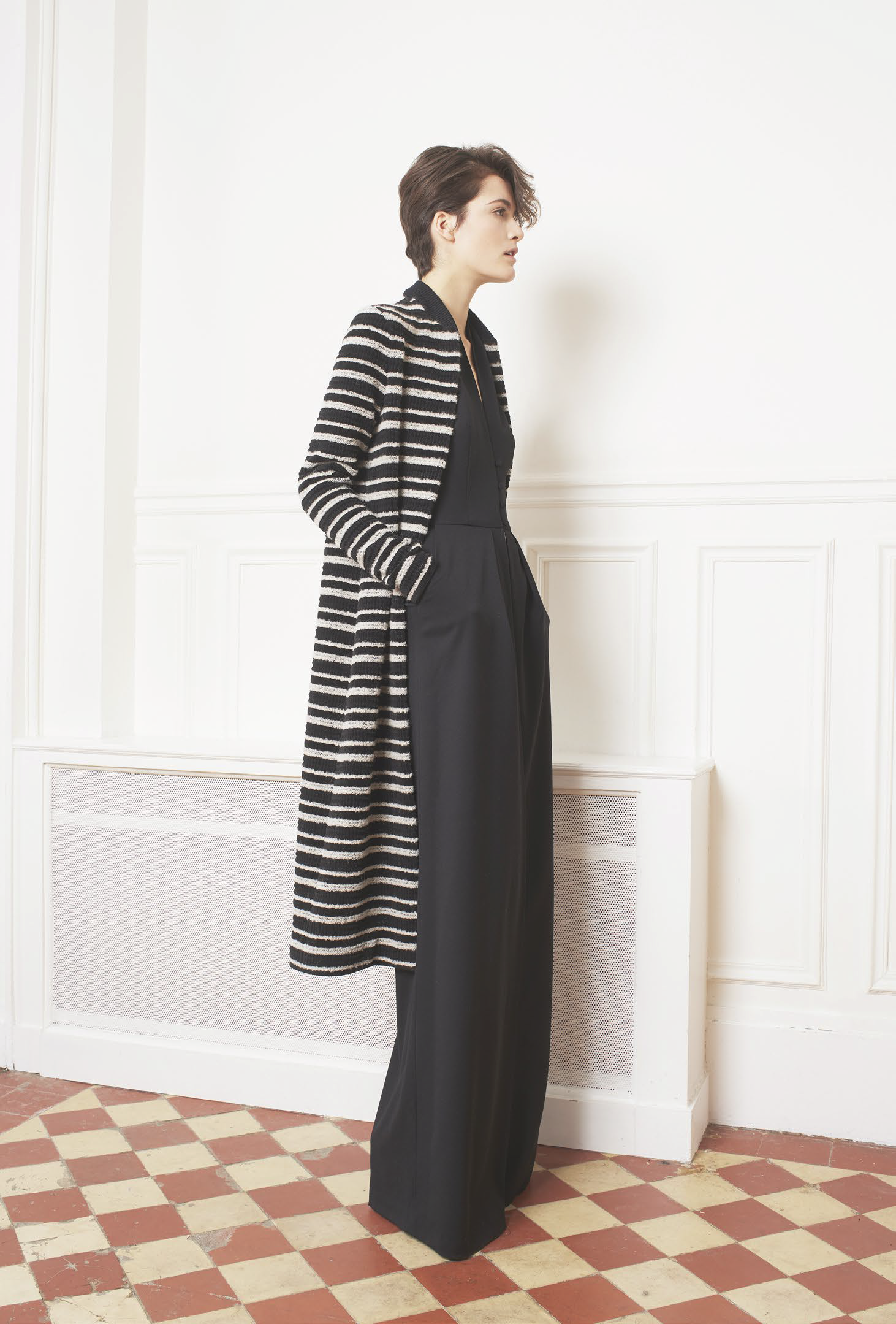 L’accent est mis sur des tenues festives, avec des combinaisons, des ensembles et des robes alliant soie ou tulle. Des pièces qui mêlent élégance et sensualité dans des tonalités de camel, gris ou vert. Les jumpsuits arborent sans complexe des décolletés plongeants pour un effet graphique. Une tendance géométrique qu’on retrouve dans les imprimés diamants noirs et blancs, qui se répondent comme dans un miroir. Les robes du soir ne quittent pas leurs ceintures et les pantalons de smokings se plissent, chaque détail compte.