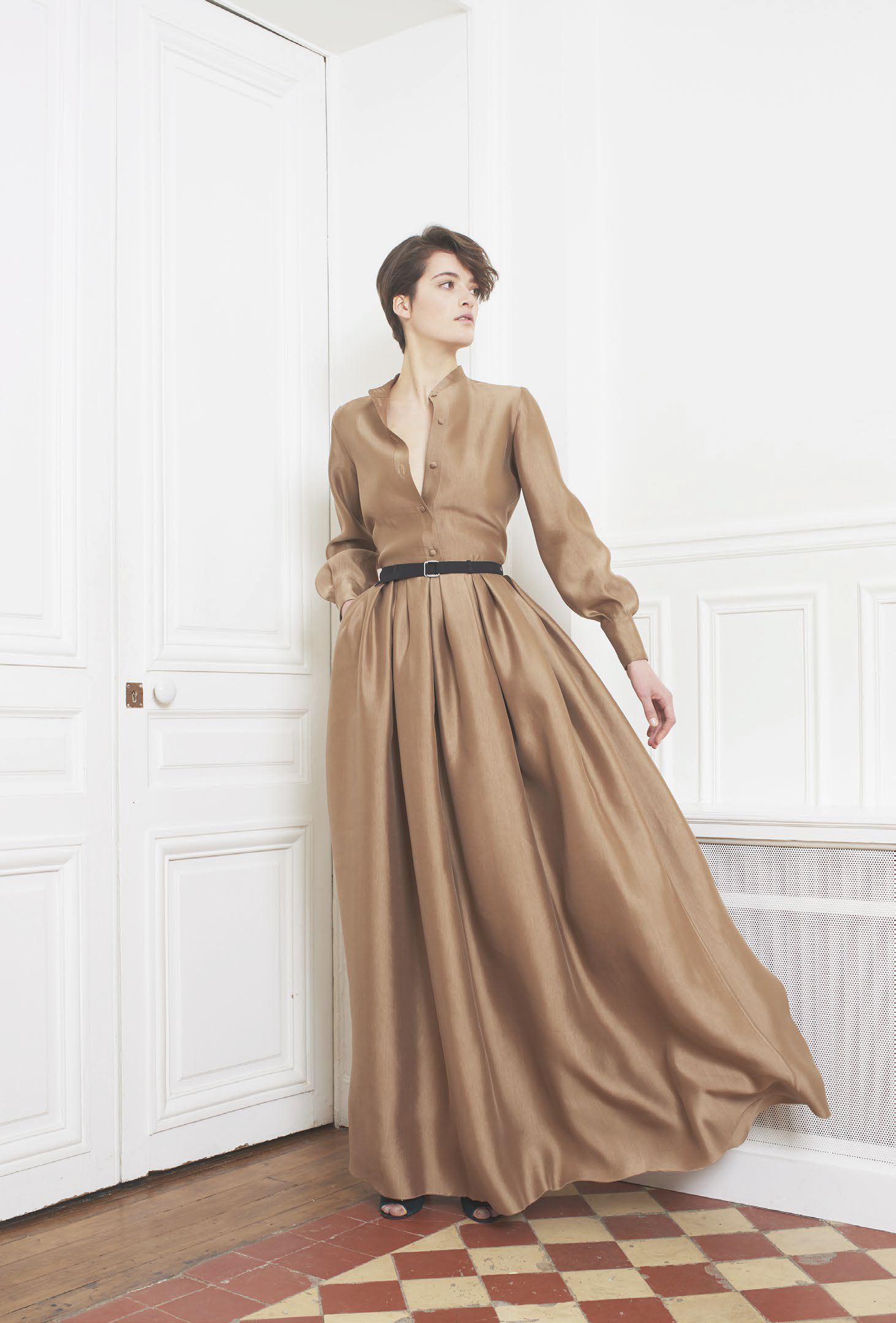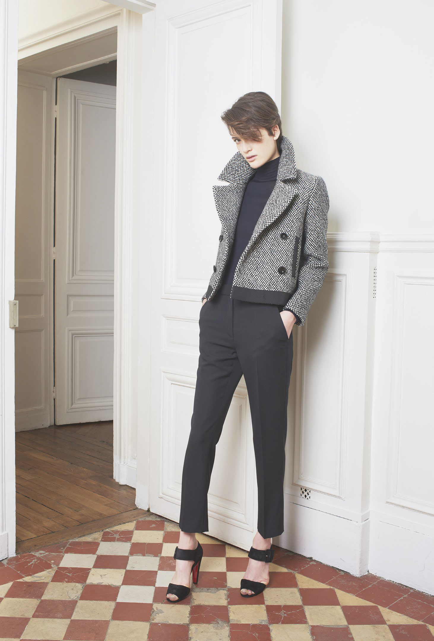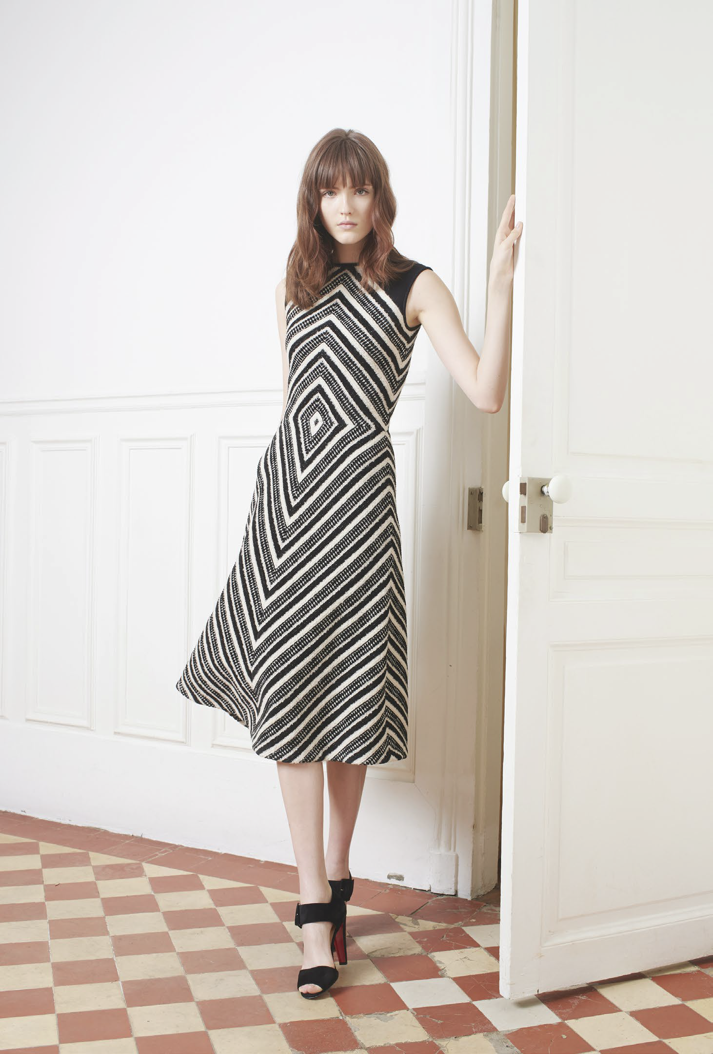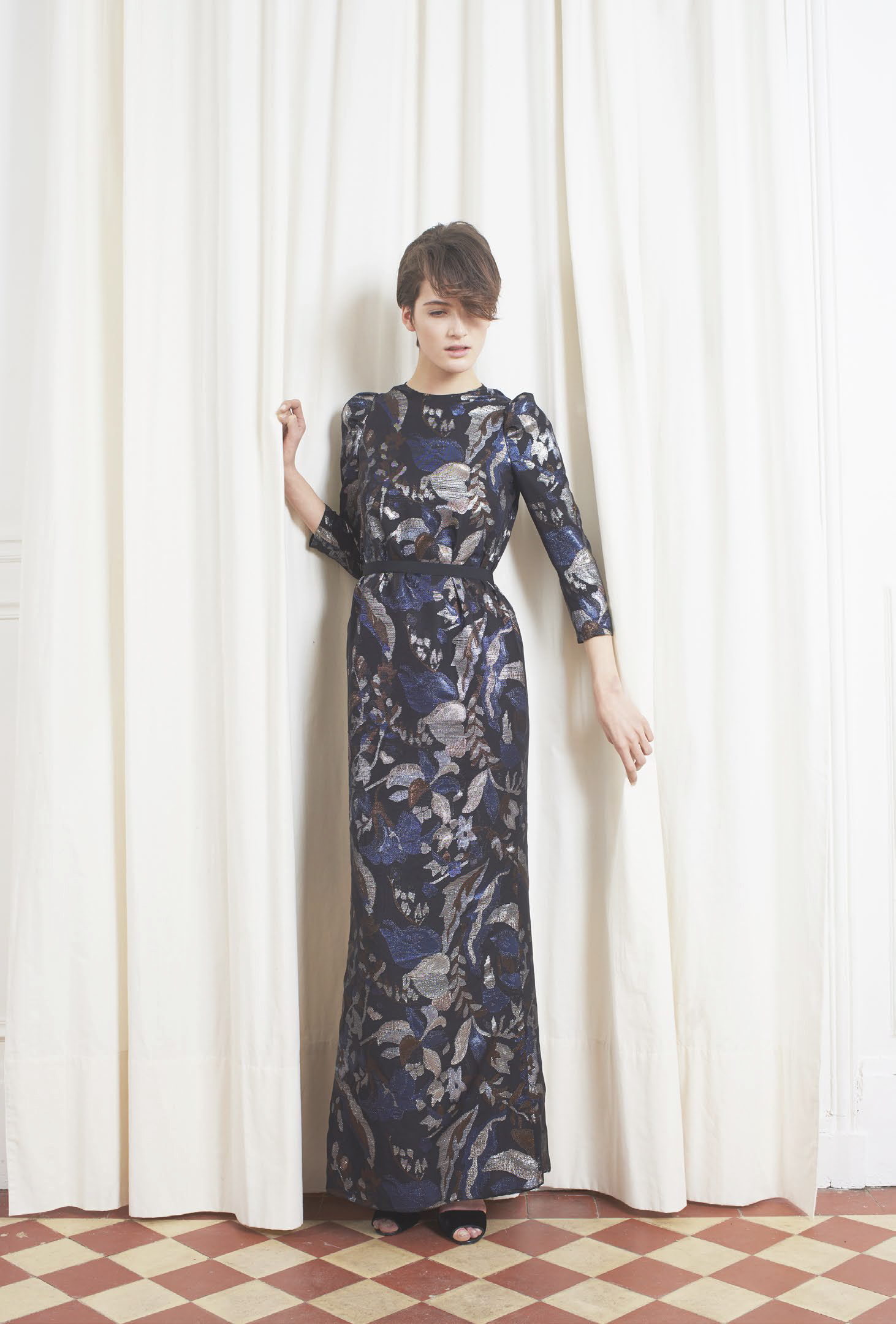 L’accent est mis sur des tenues festives, avec des combinaisons, des ensembles et des robes alliant soie ou tulle. Des pièces qui mêlent élégance et sensualité dans des tonalités de camel, gris ou vert. Les jumpsuits arborent sans complexe des décolletés plongeants pour un effet graphique. Une tendance géométrique qu’on retrouve dans les imprimés diamants noirs et blancs, qui se répondent comme dans un miroir. Les robes du soir ne quittent pas leurs ceintures et les pantalons de smokings se plissent, chaque détail compte.