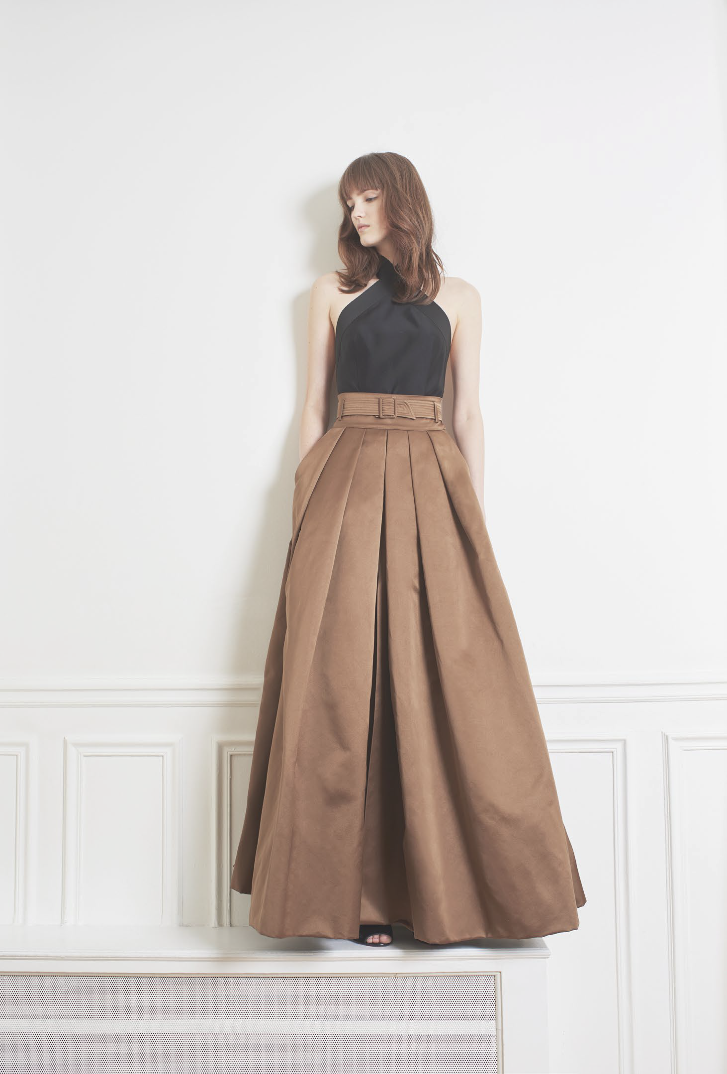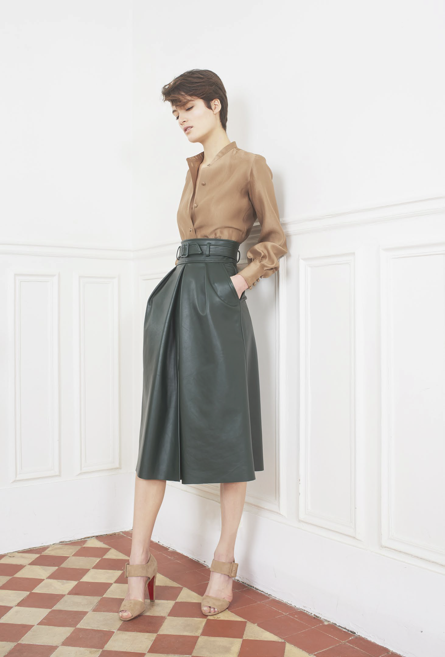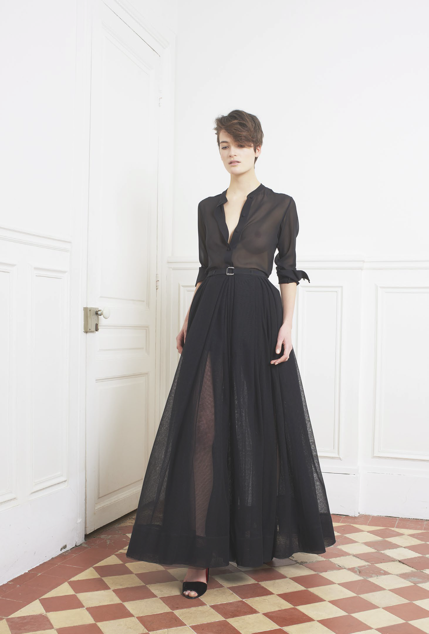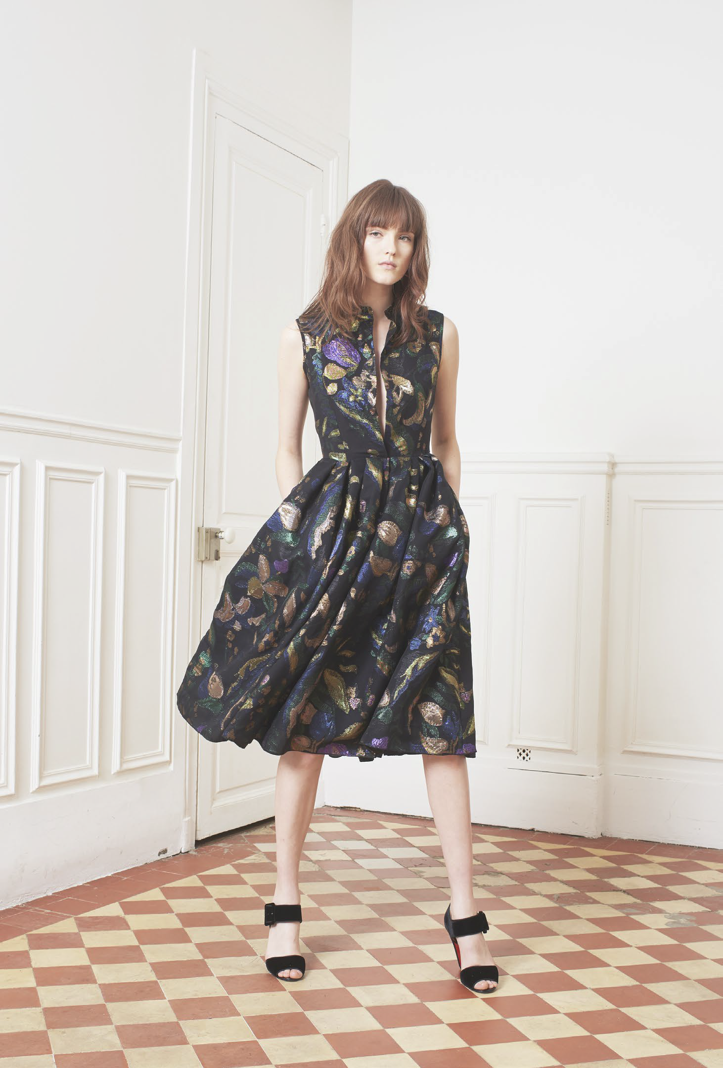 L’accent est mis sur des tenues festives, avec des combinaisons, des ensembles et des robes alliant soie ou tulle. Des pièces qui mêlent élégance et sensualité dans des tonalités de camel, gris ou vert. Les jumpsuits arborent sans complexe des décolletés plongeants pour un effet graphique. Une tendance géométrique qu’on retrouve dans les imprimés diamants noirs et blancs, qui se répondent comme dans un miroir. Les robes du soir ne quittent pas leurs ceintures et les pantalons de smokings se plissent, chaque détail compte.