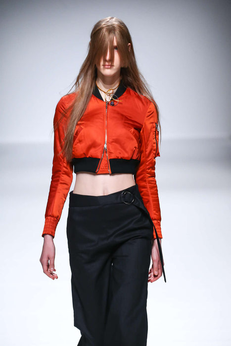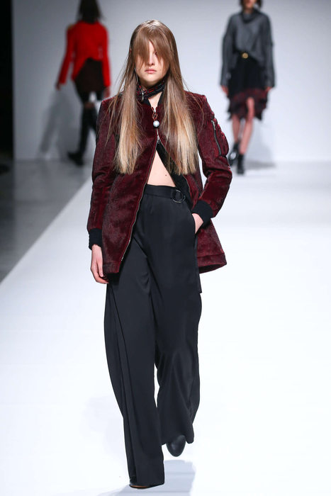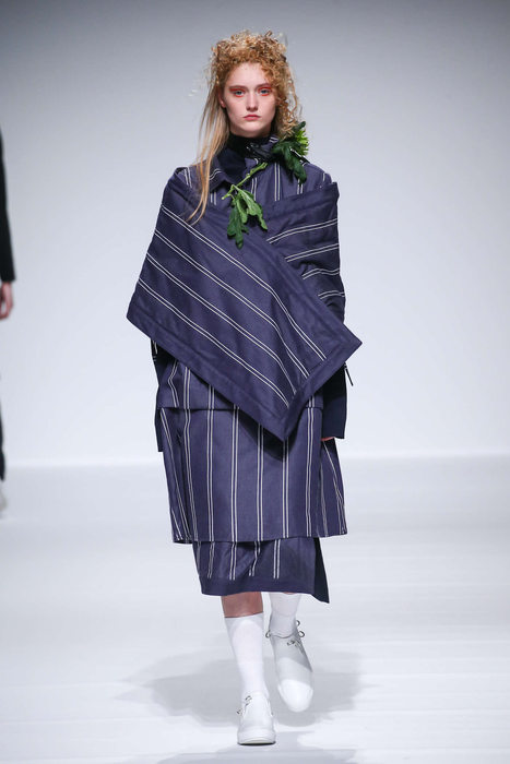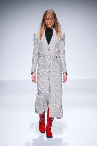« Injury », « blessure » en anglais, est créé par Eugène Leung et sa femme, Dan Tse en 2004. Né à Hong Kong, il s’installe avec sa famille en Australie et c’est à Sydney qu’il présente sa première collection en 2005. Pour cet hiver 2016, couleurs sobres, gris, noir et blanc, mélange de rayures, superpositions de formes et de longueurs, vêtements amples et fluides, longues vestes ceinturées, formes enveloppantes donnent une forte identité à cette garde robe très contemporaine. Le choix des longues cuissardes en PVC bullantes rajoutent du caractère et une certaine luminosité aux modèles.