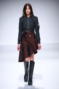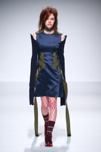 Chez « Kenaxleung » au contraire, on trouve des coupes déstructurées, des ajouts de volumes sur les manches, des mélanges de formes, des manches allongées à l’extrême, de larges vestes sur des robes courtes et des patchworks. Certains détails donnent une originalité, et une fraîcheur adolescente: franges courtes sur un blouson façon denim, ceintures en cordes de couleurs vives, mousquetons portés en collier ou en attache de ceinture, collants en résilles largement ajourés portés sur des chaussettes rayées.