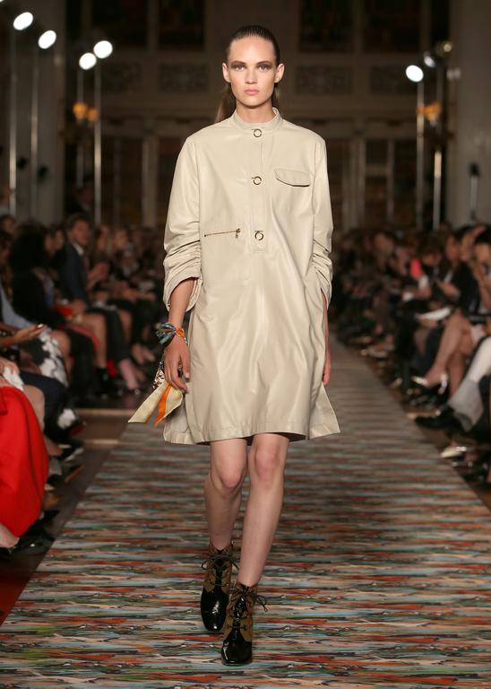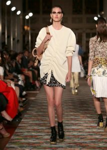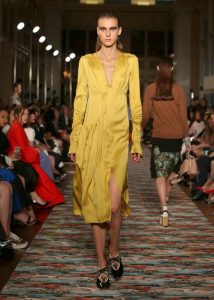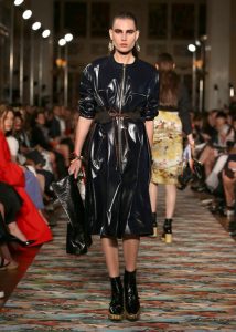 C’est la parisienne des années New Look revisitée à l’heure de 2017, pleine de nouveauté et de créativité, de fraîcheur, de silhouettes élégantes et ultra féminine. Les basques sont retravaillées en drapés rappelant les paniers du XVIII ème siècle, posées sur des robes près du corps. Les silhouettes sont plus allongées, plus souples, les robes sont fluides. Le chic et l’élégance sont les maîtres mots de cette collection. Raffinée dans les moindres détails avec des broderies, des perles et des sequins. Le manteau reste incontestablement la pièce maîtresse de Dior: manteau long, rose pastel à large poche, ceinturé de noir, ou jaune avec des manches froncées, large poche, demi devant asymétrique, volanté d’un côté et plat de l’autre.