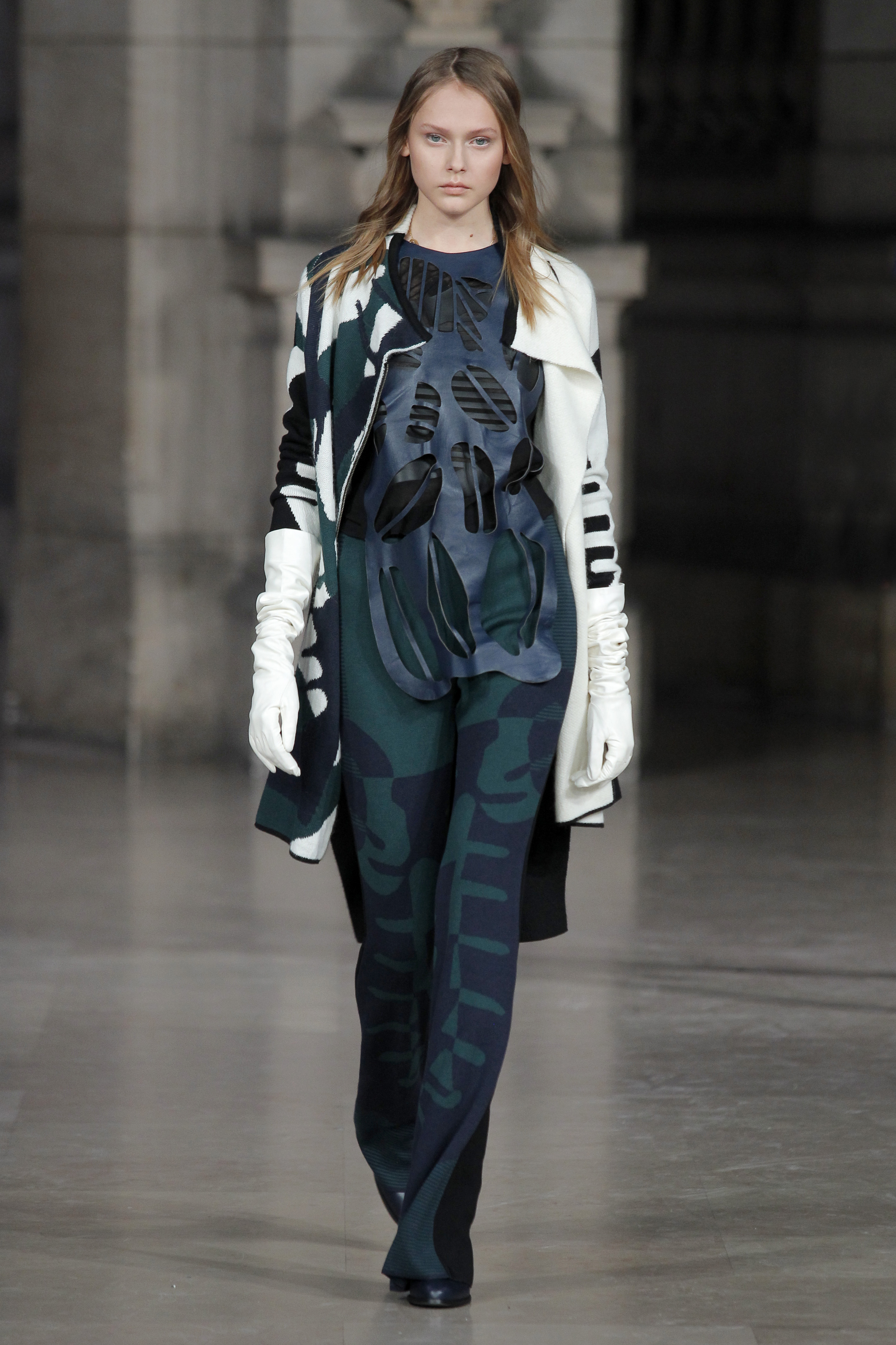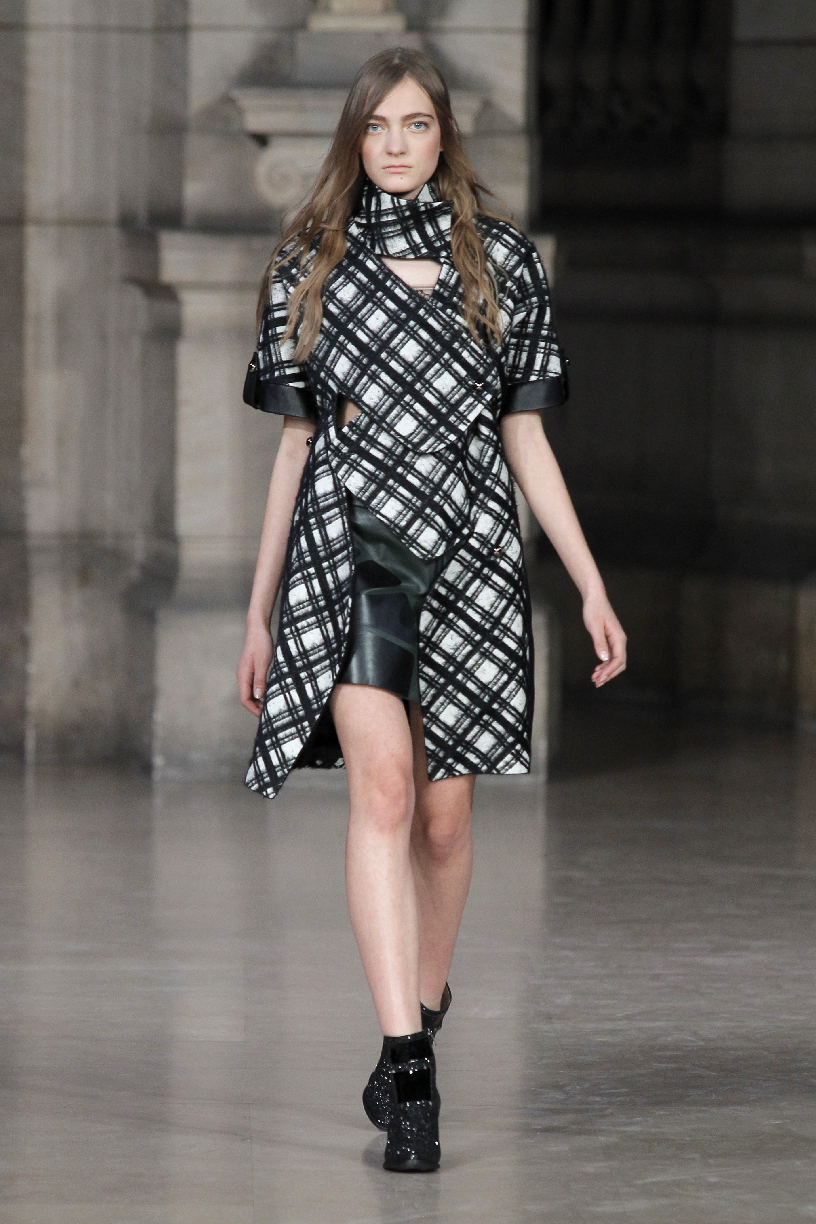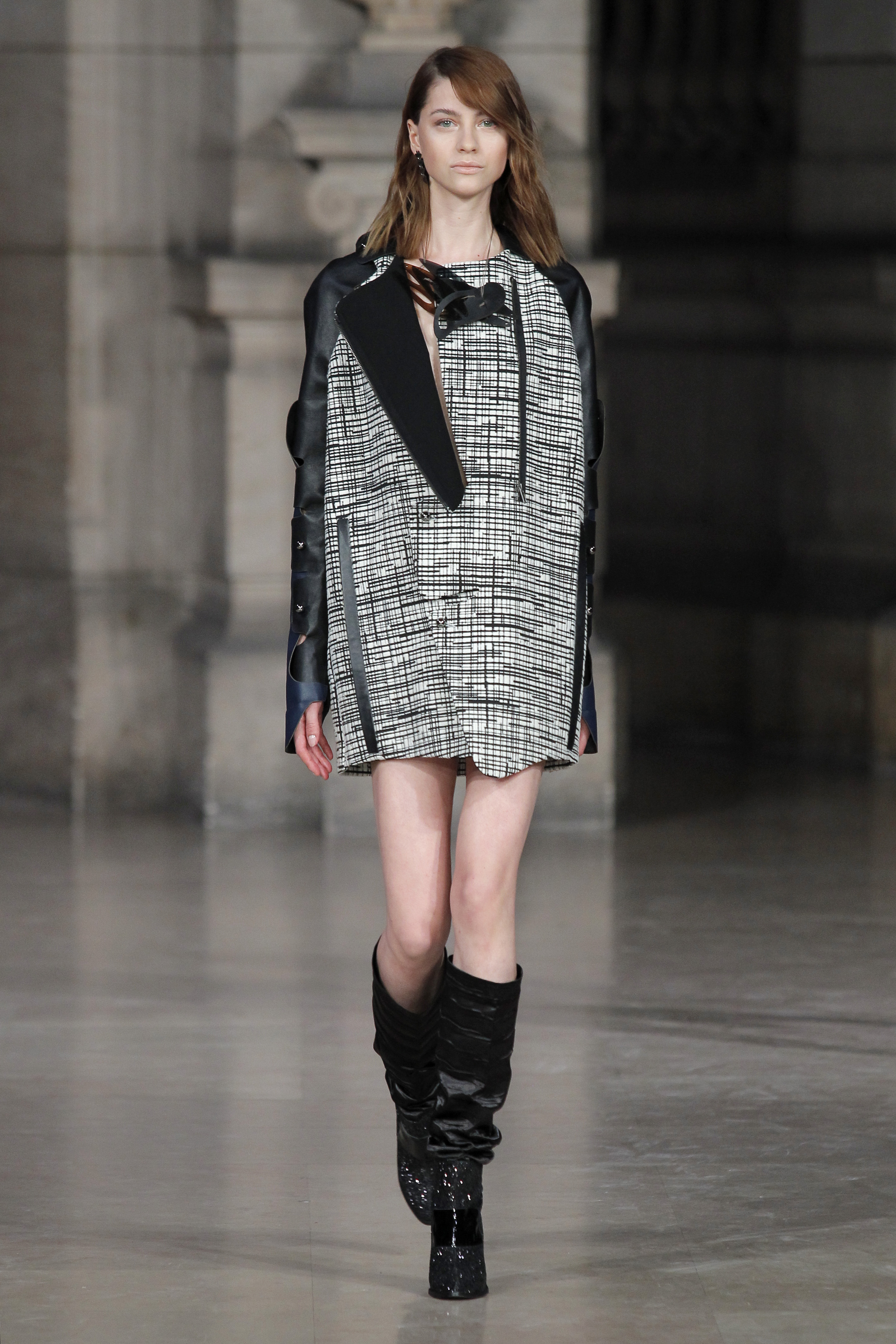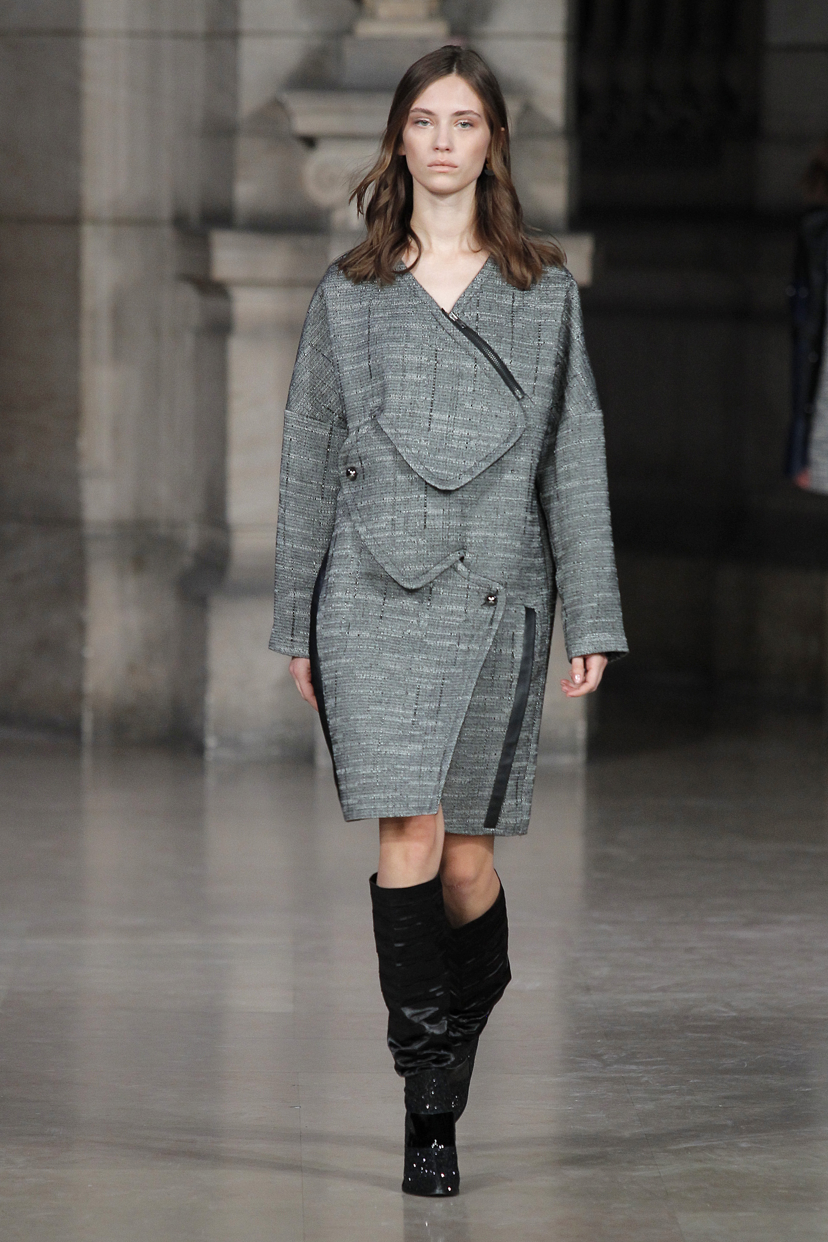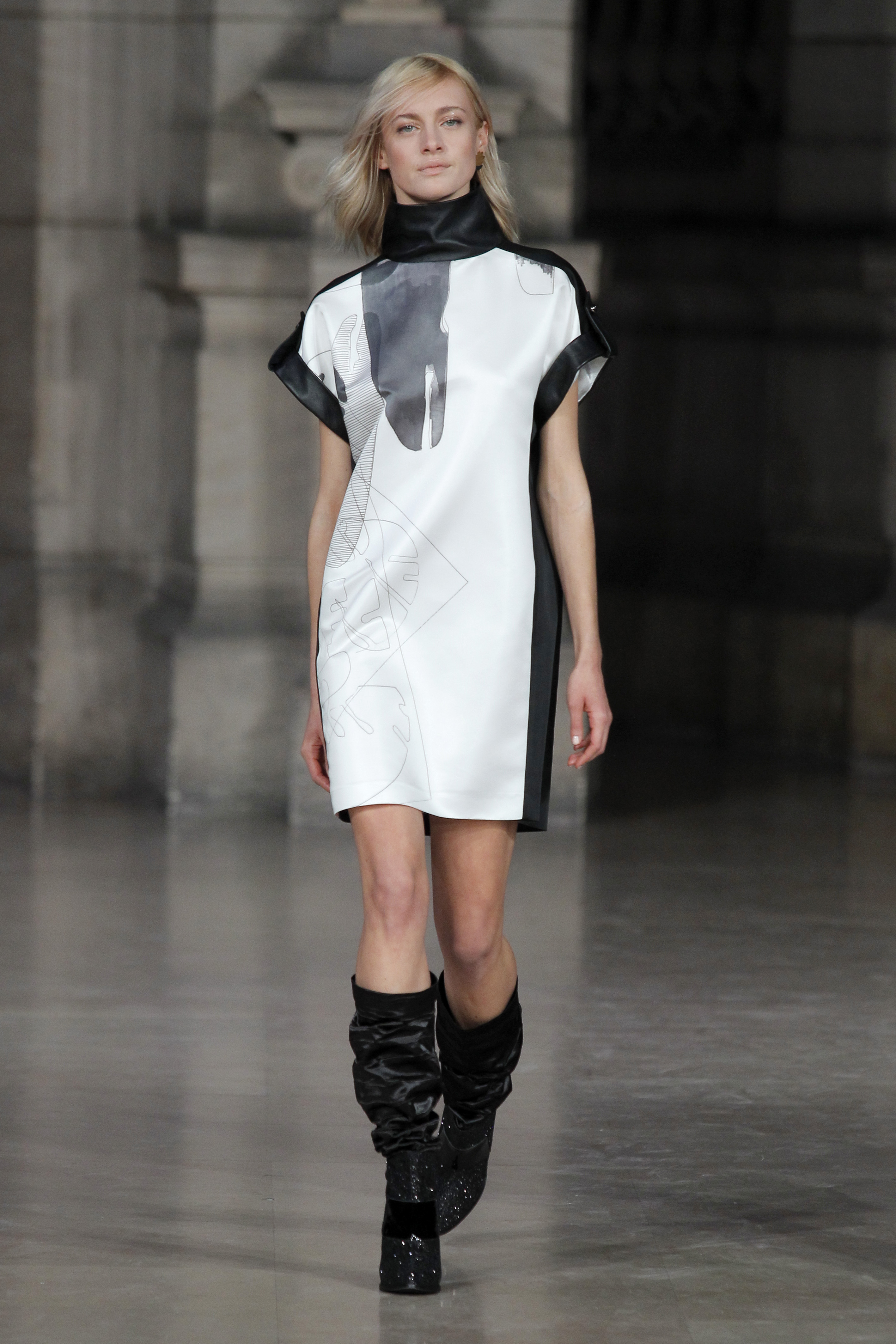 Subtile et technique, la collection ne déroge pas au style Luis Buchinho. Dans une palette de neutres, les graphismes s’expriment. Le vêtement reste fidèle à la rayure mais flirte avec le carreau et le cercle. La laine, la star du défilé, se décline dans des superpositions élaborées. Les découpes et les effets patchworks sont les bienvenues pour moderniser robes et manteaux. Et puis les sketchs conceptuels dessinés à même les tenues ne passent pas inaperçus.