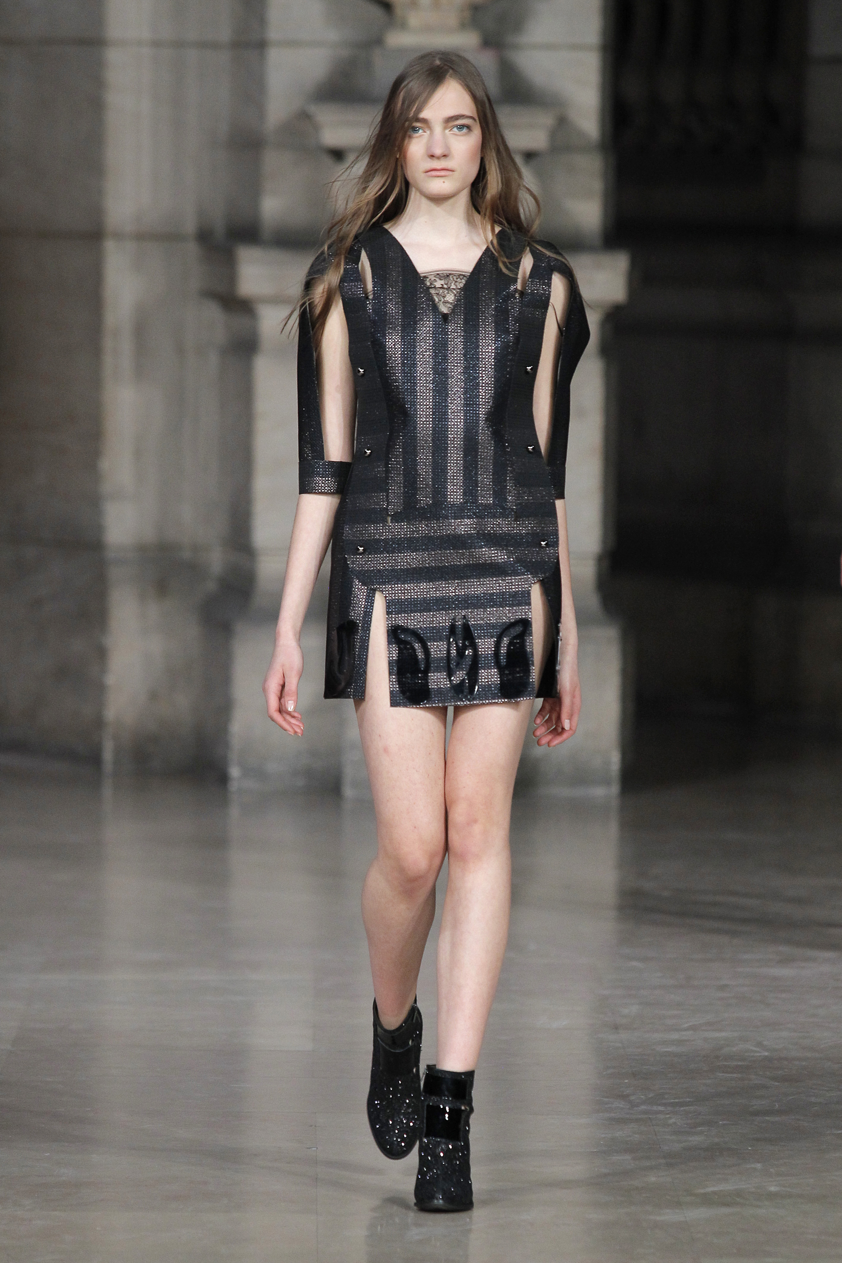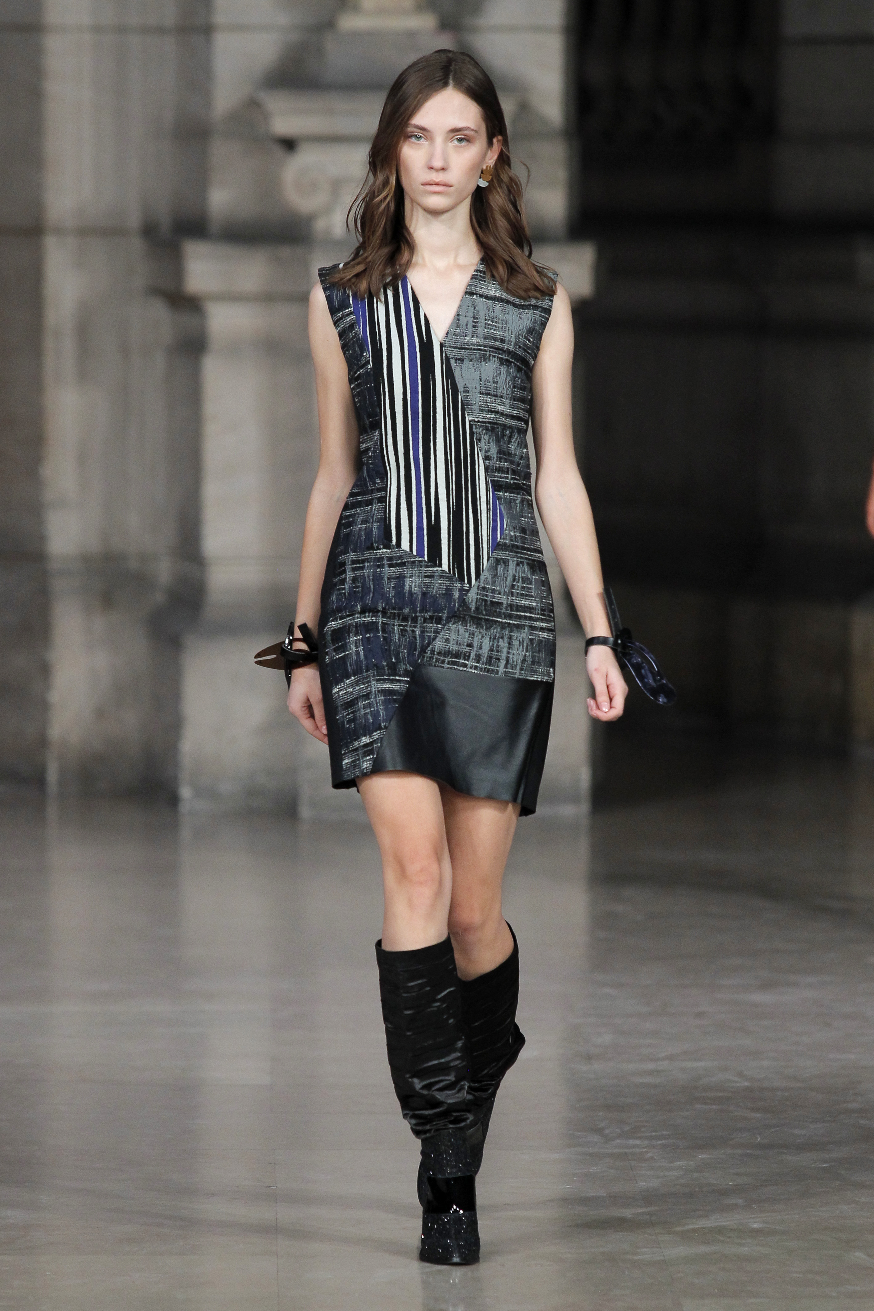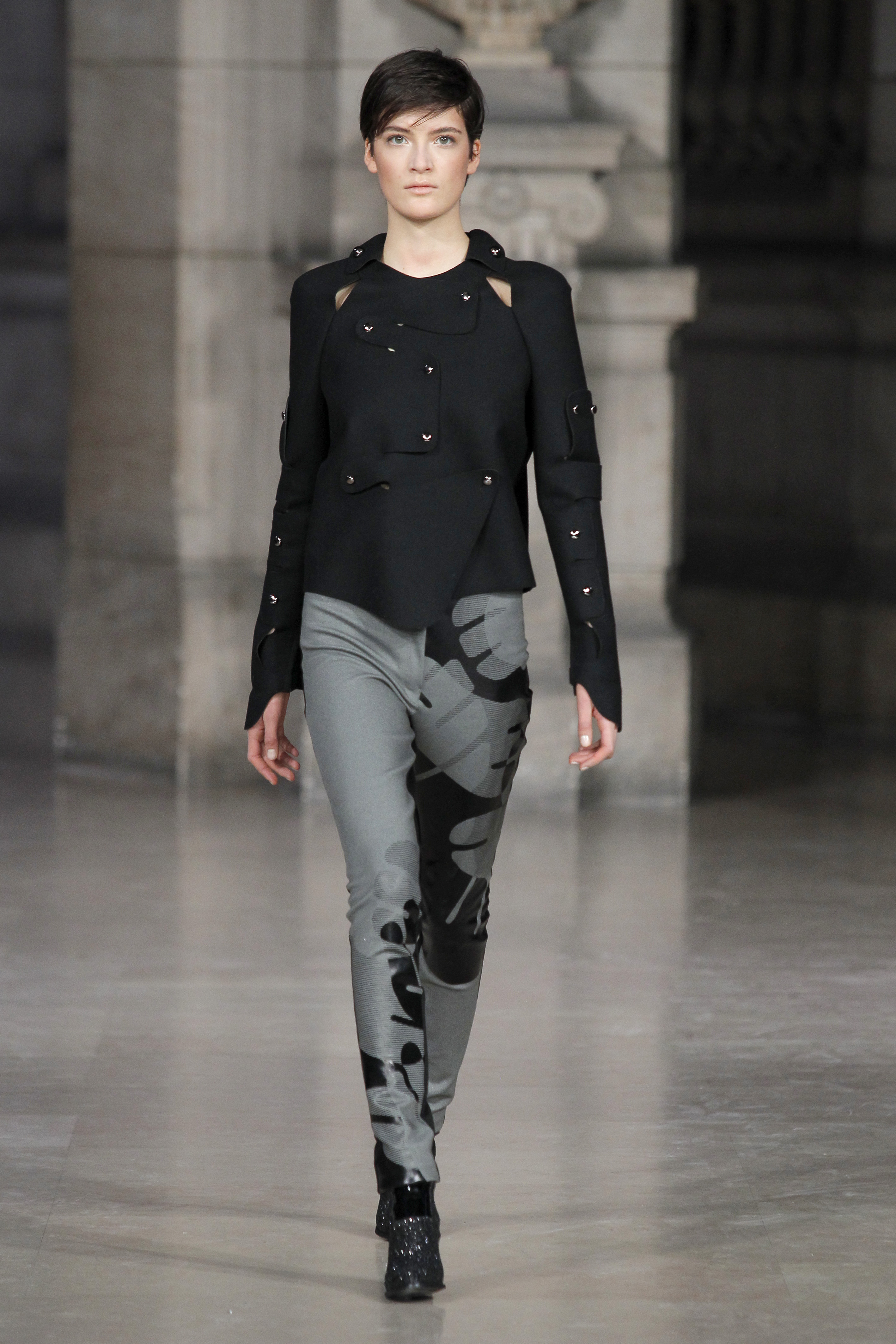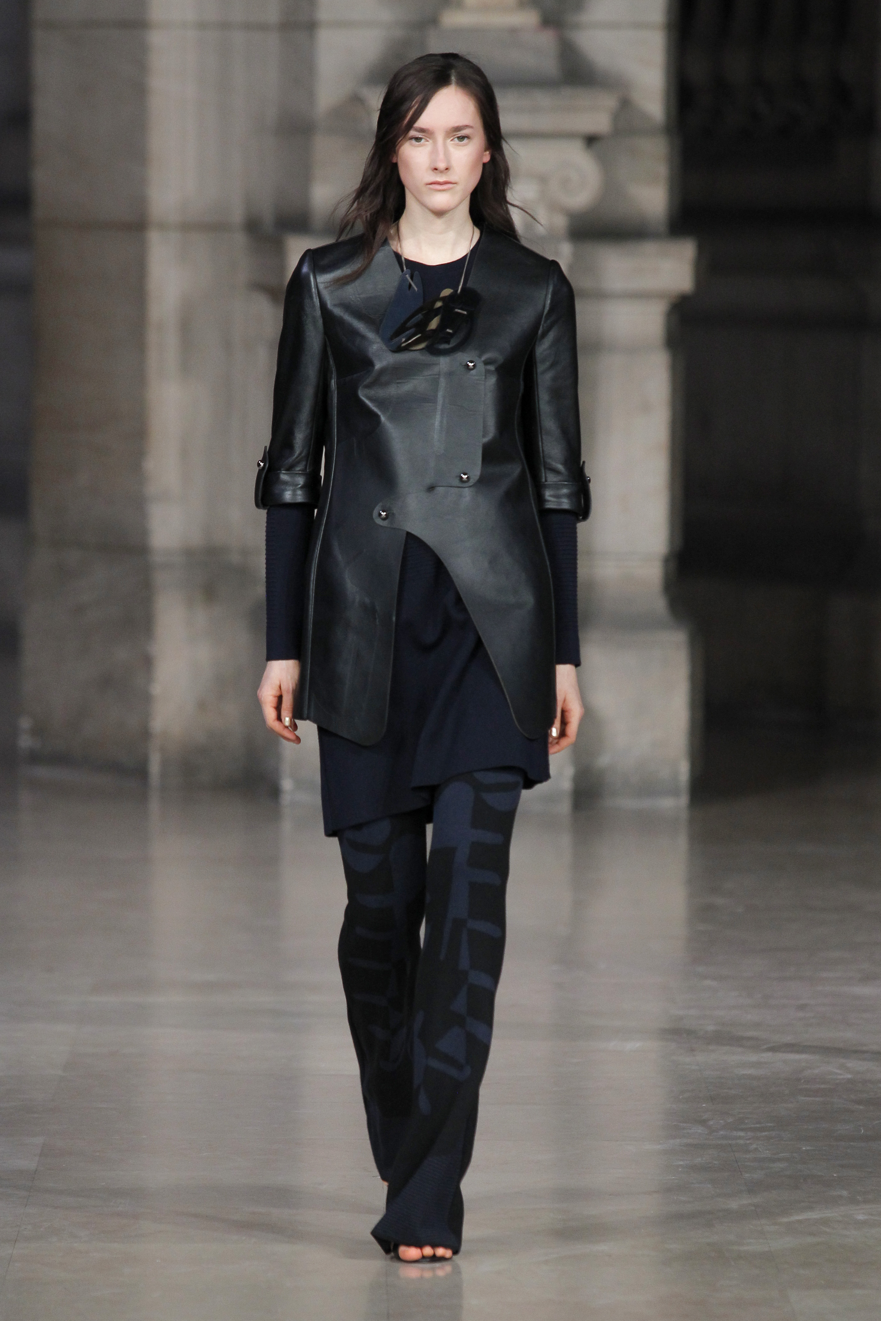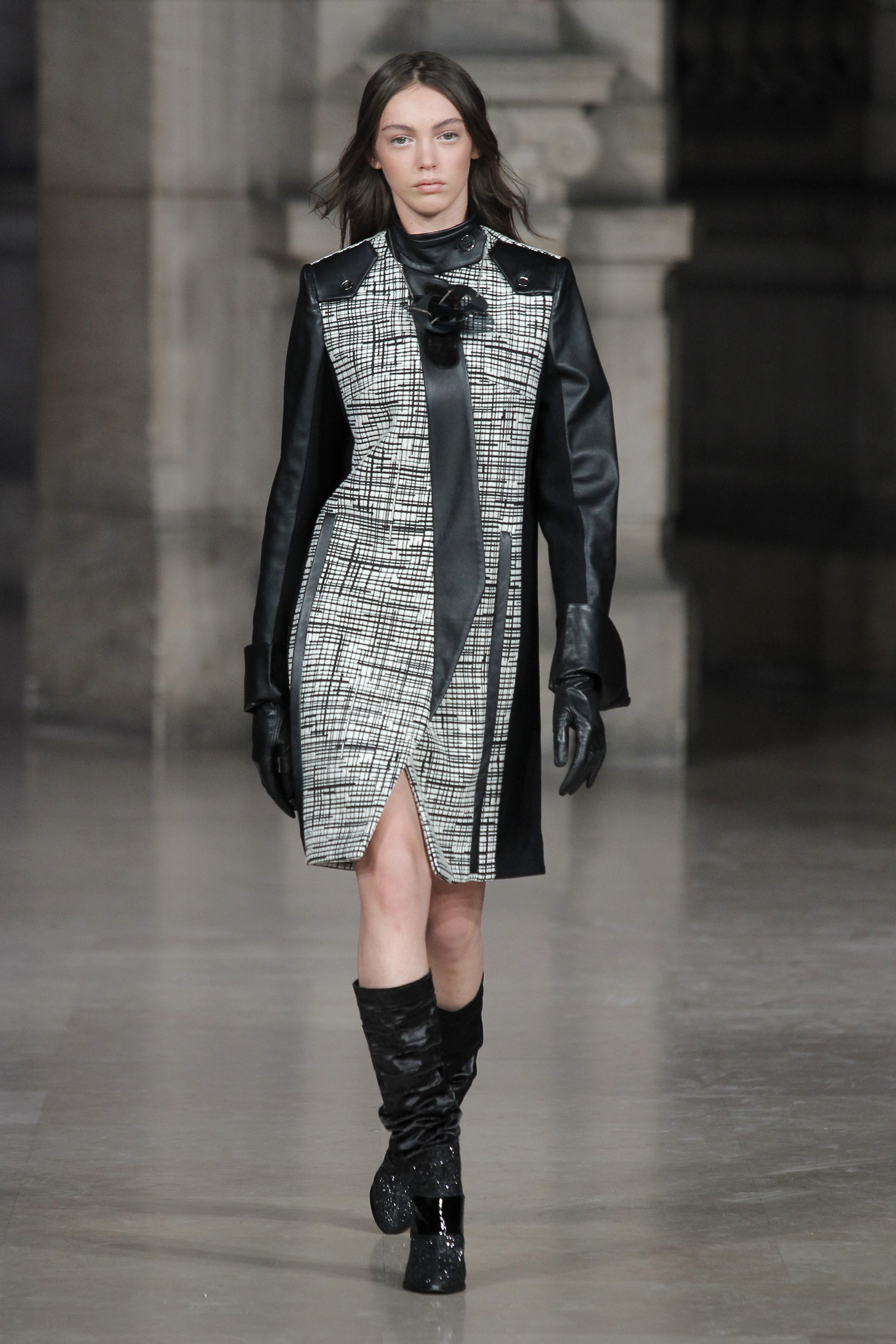 Subtile et technique, la collection ne déroge pas au style Luis Buchinho. Dans une palette de neutres, les graphismes s’expriment. Le vêtement reste fidèle à la rayure mais flirte avec le carreau et le cercle. La laine, la star du défilé, se décline dans des superpositions élaborées. Les découpes et les effets patchworks sont les bienvenues pour moderniser robes et manteaux. Et puis les sketchs conceptuels dessinés à même les tenues ne passent pas inaperçus.
