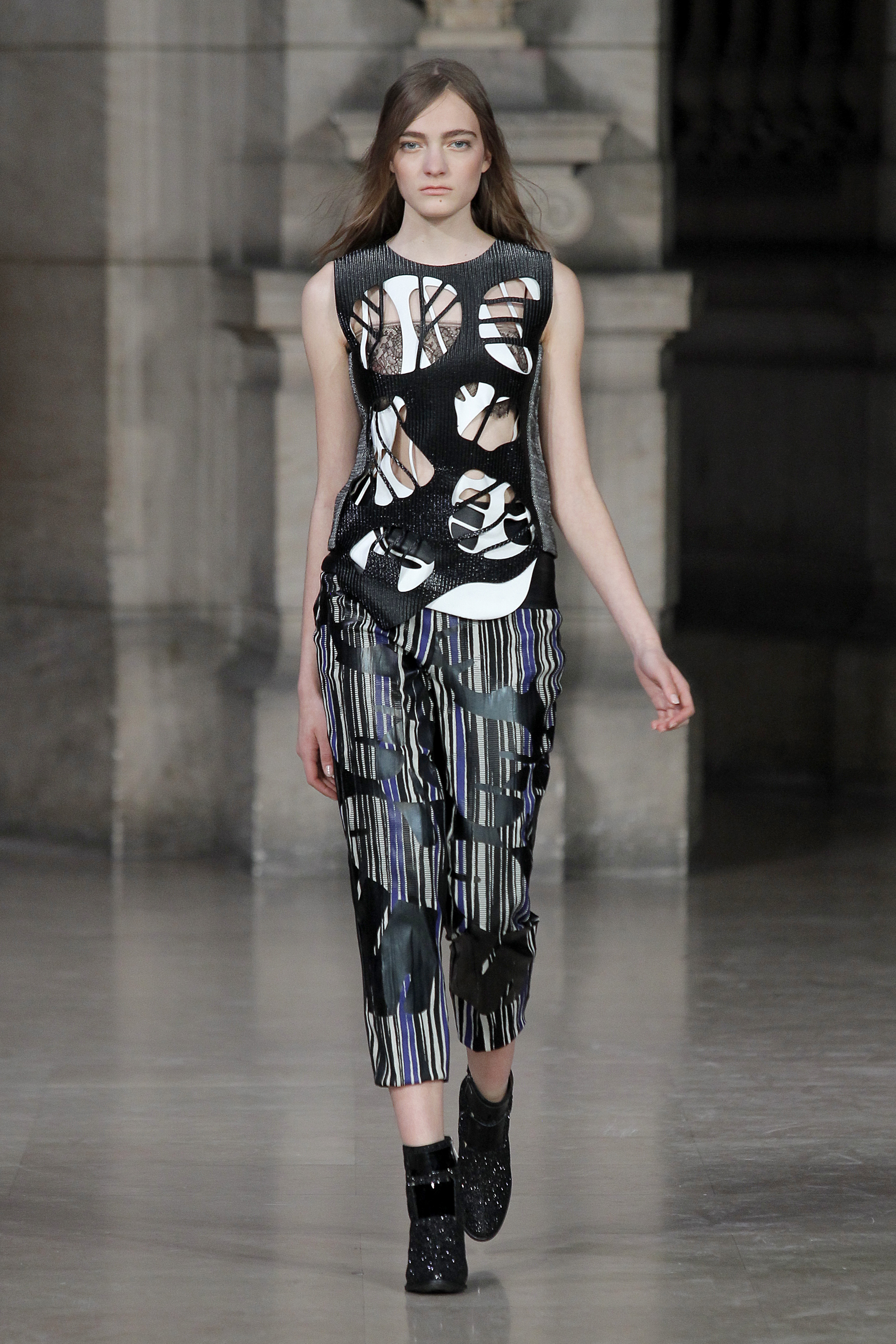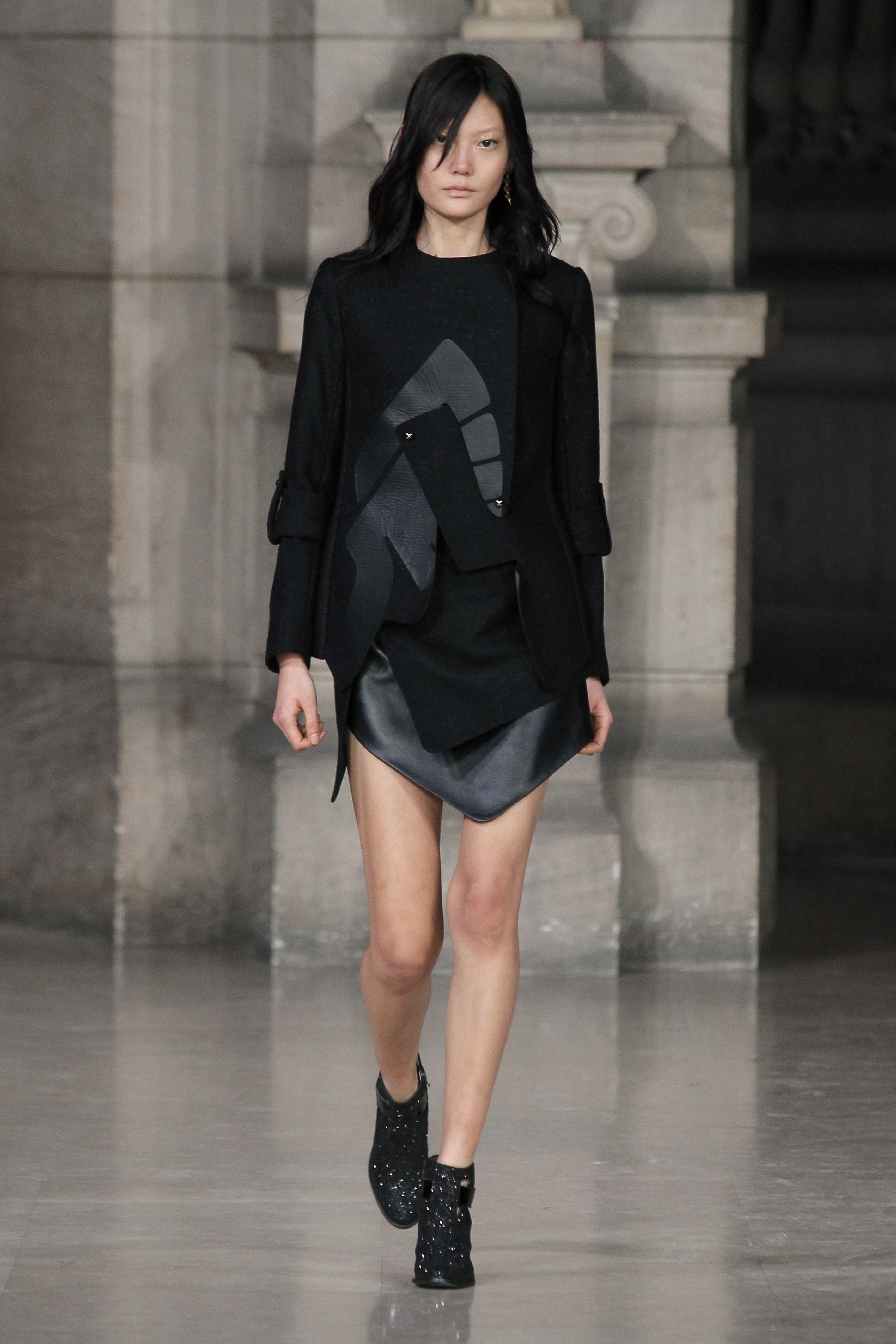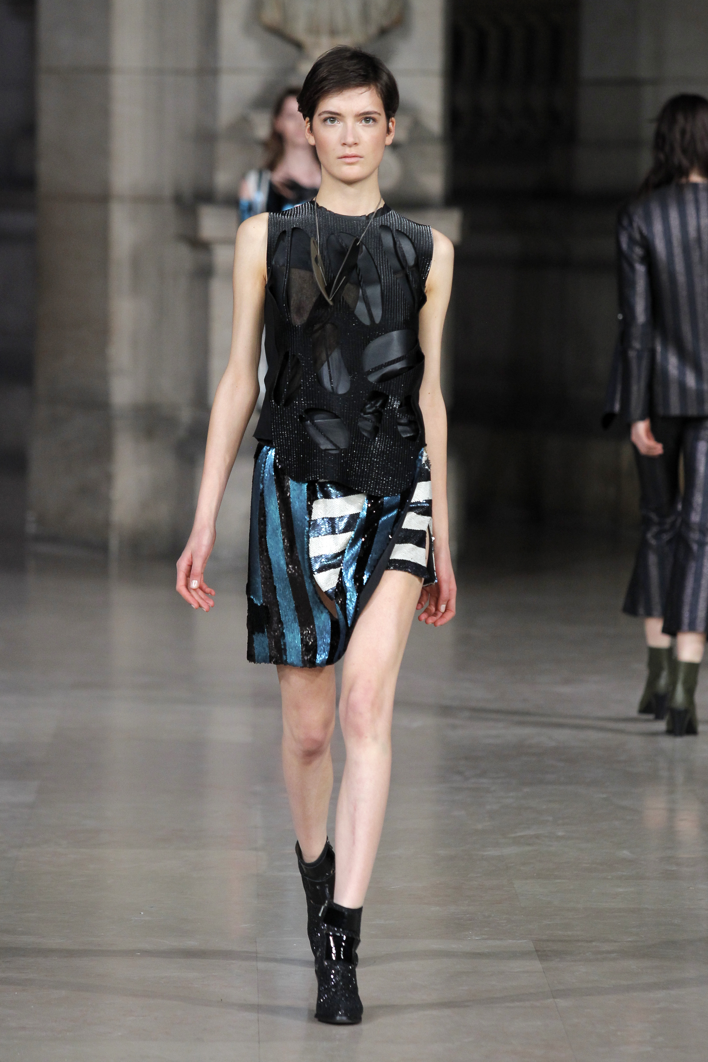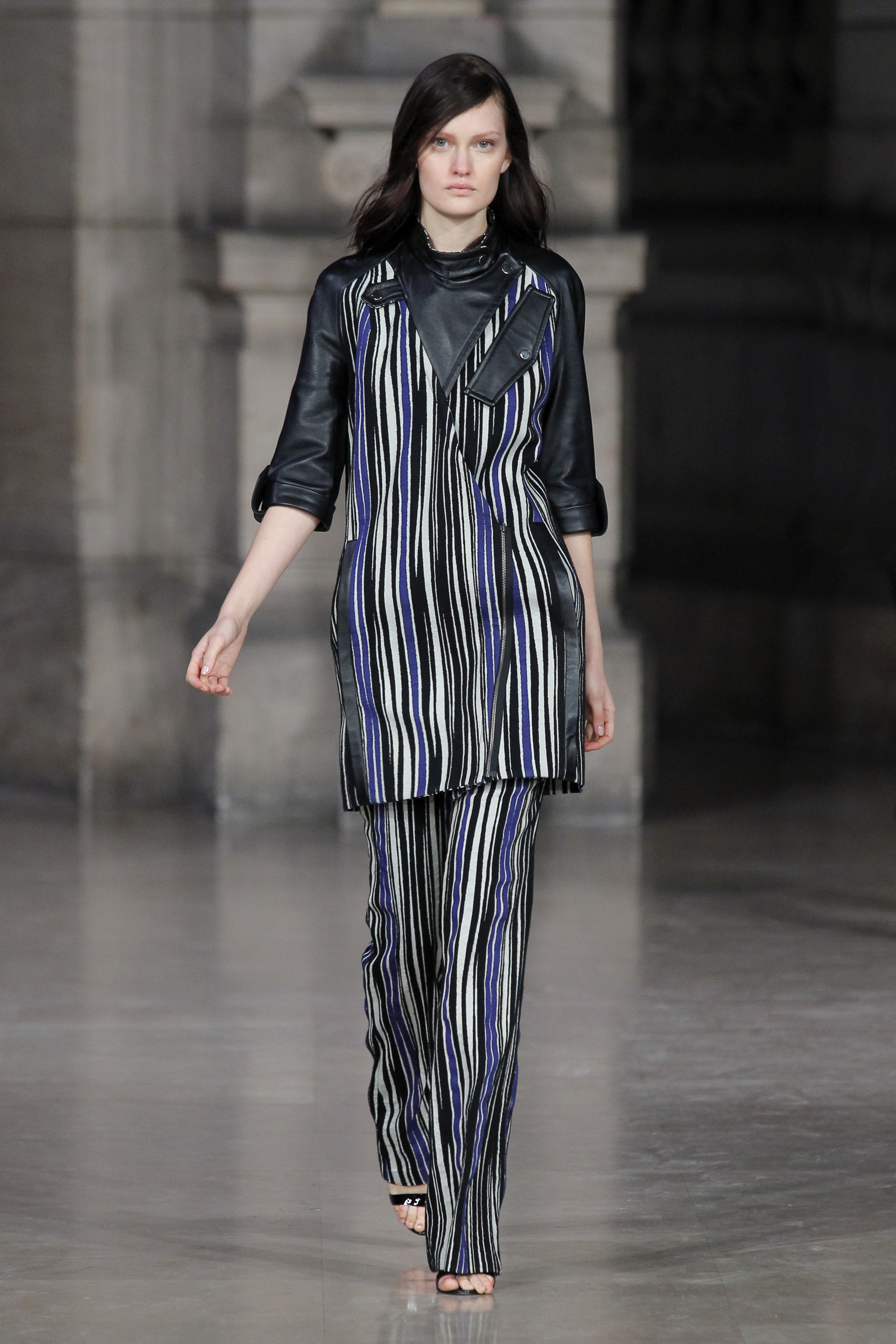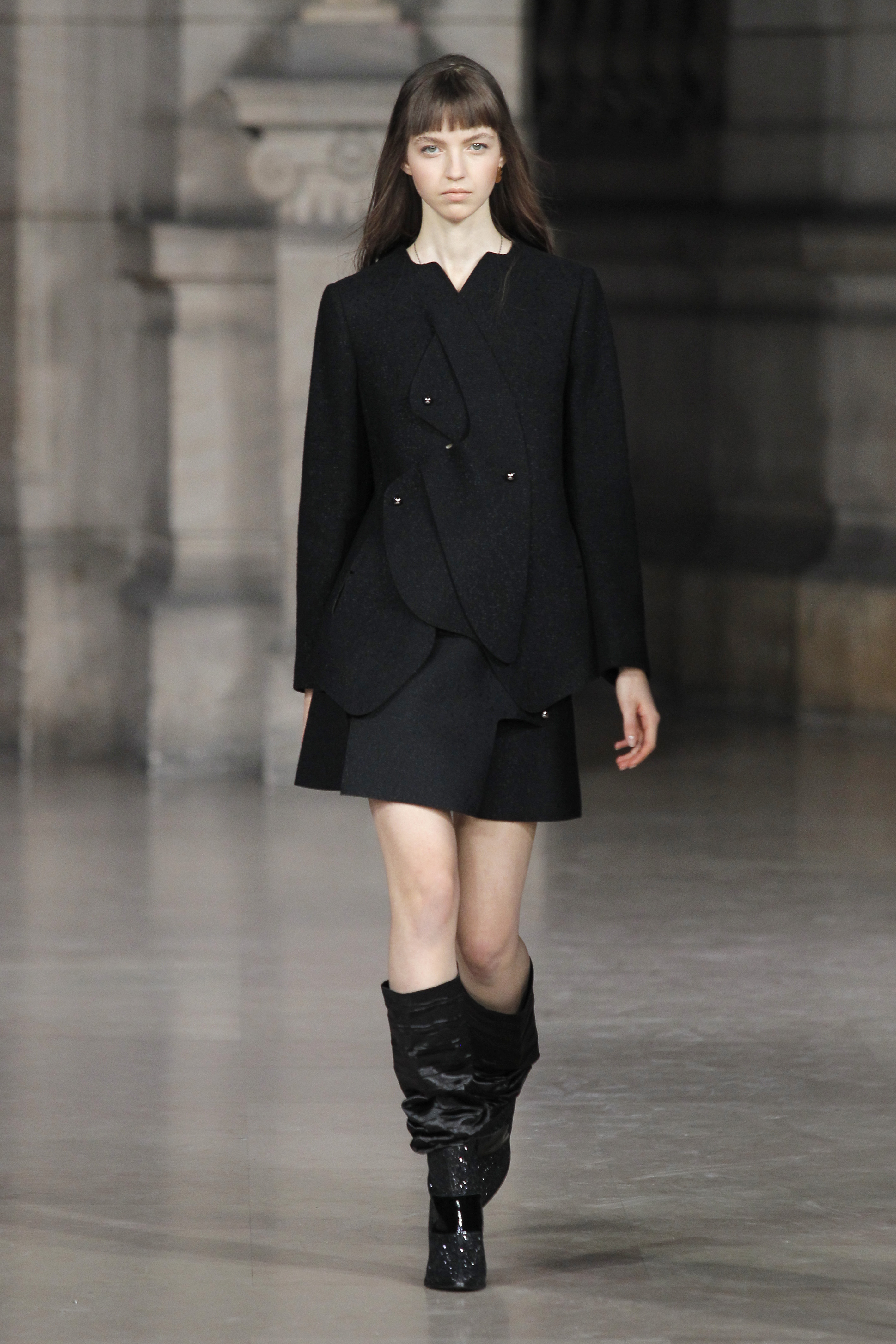Subtile et technique, la collection ne déroge pas au style Luis Buchinho. Dans une palette de neutres, les graphismes s’expriment. Le vêtement reste fidèle à la rayure mais flirte avec le carreau et le cercle. La laine, la star du défilé, se décline dans des superpositions élaborées. Les découpes et les effets patchworks sont les bienvenues pour moderniser robes et manteaux. Et puis les sketchs conceptuels dessinés à même les tenues ne passent pas inaperçus.