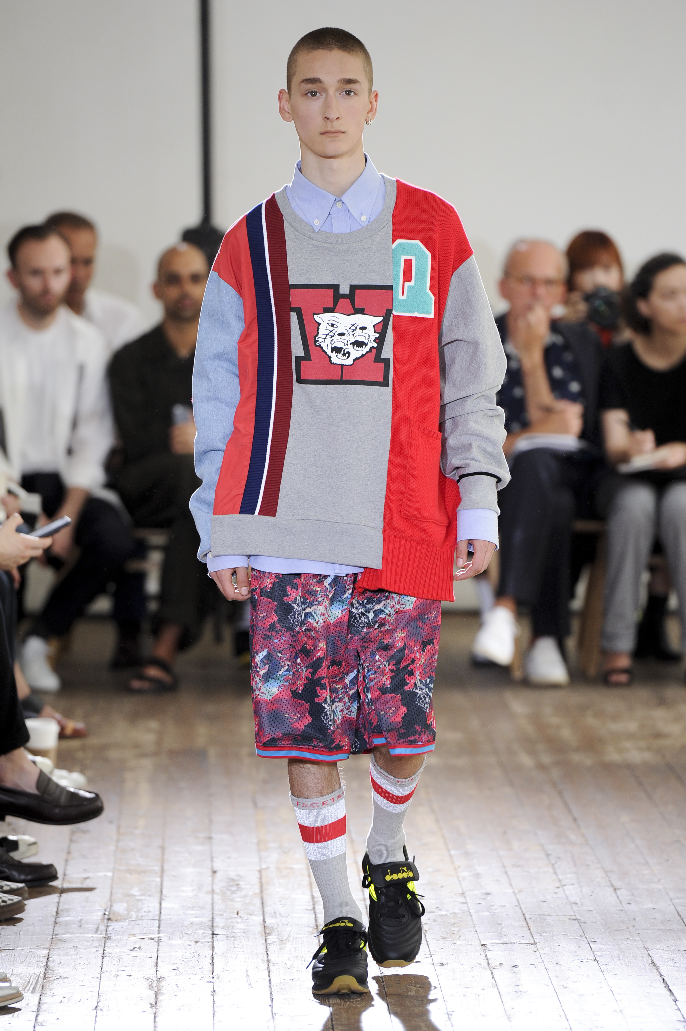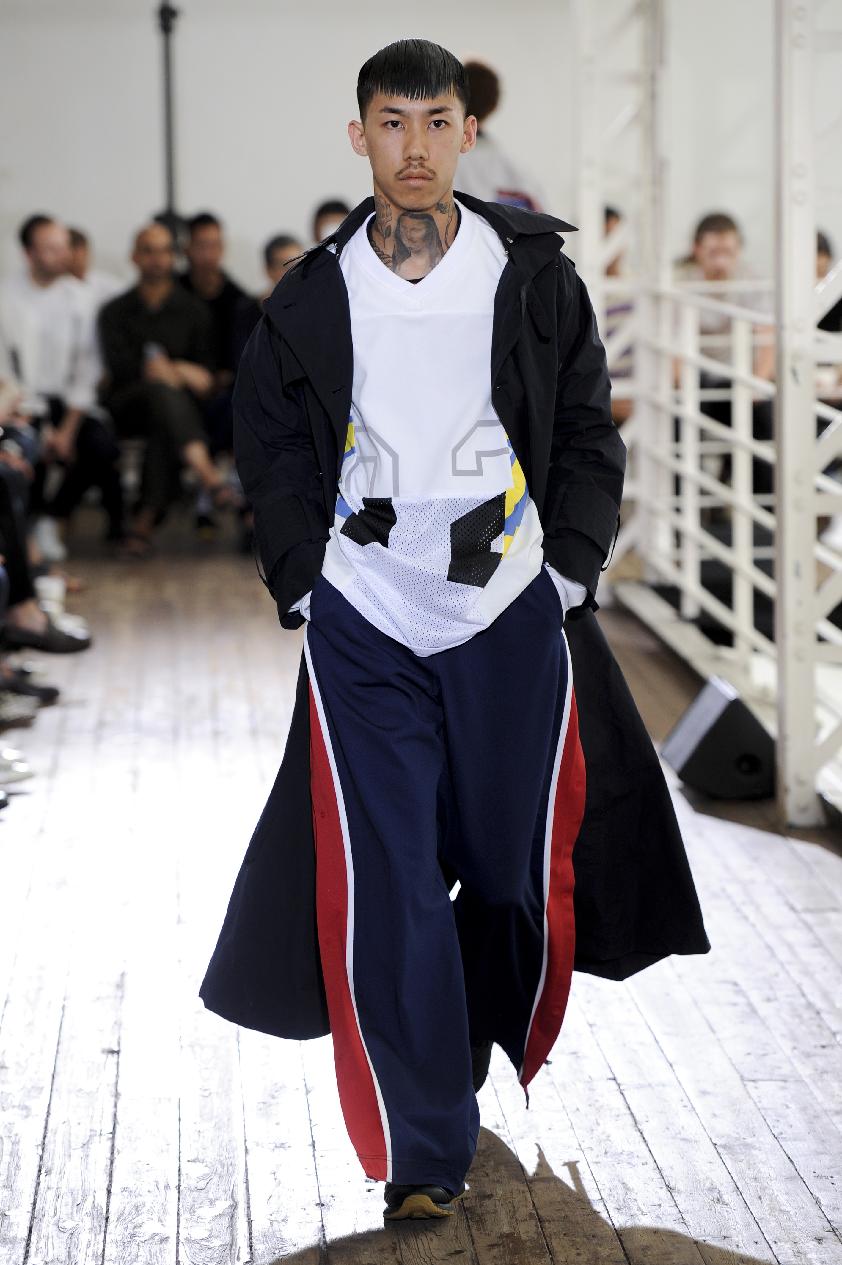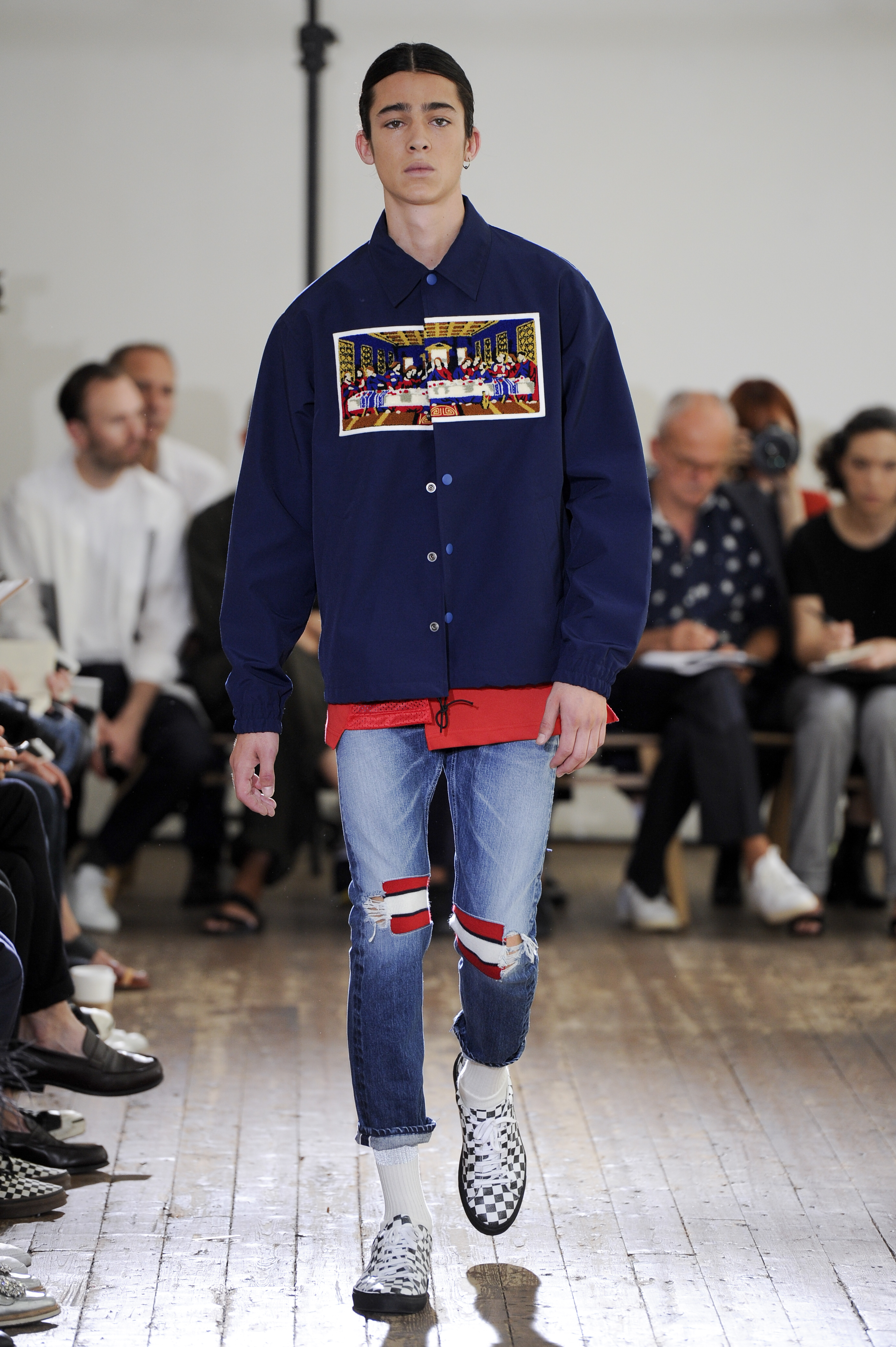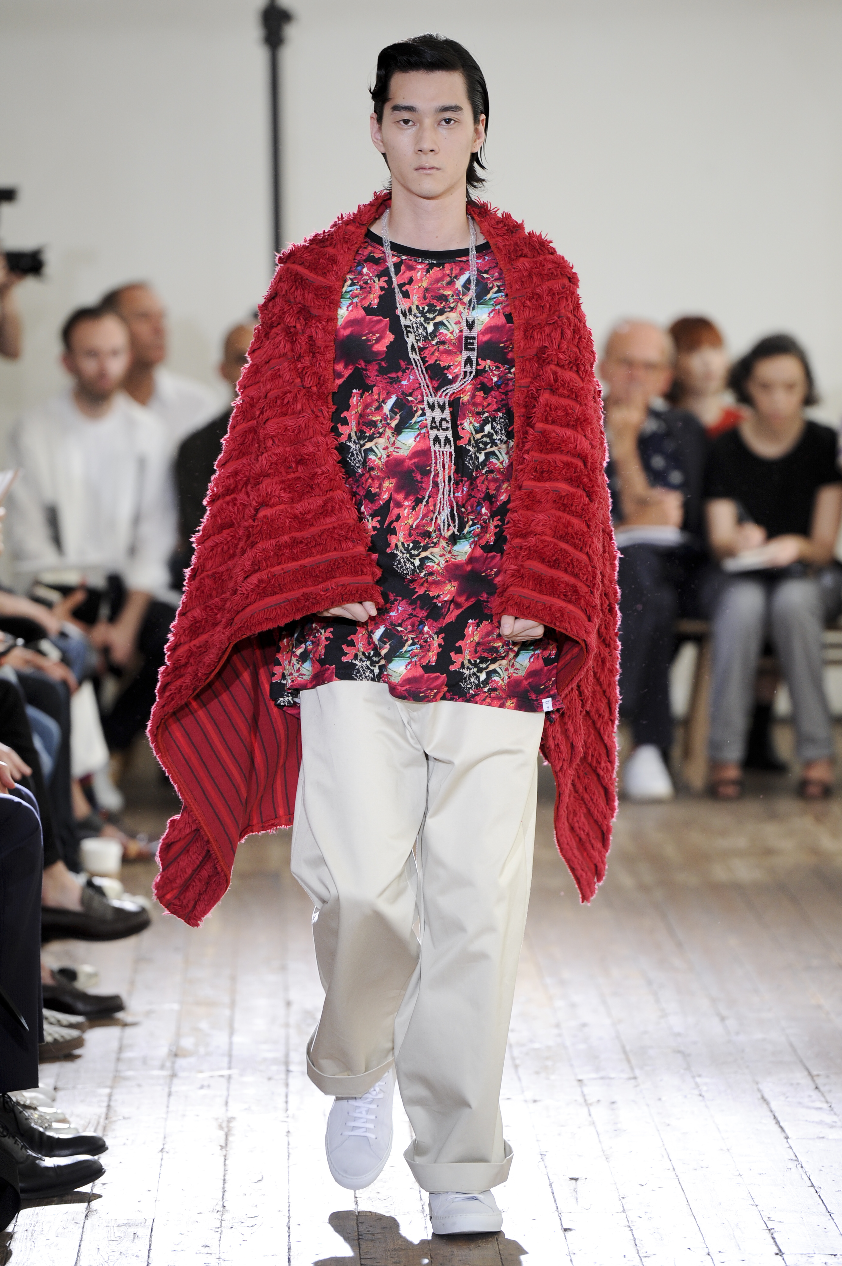 C’est la toute première fois que la marque japonaise défile lors de la semaine de la mode parisienne. Orchestrée par le créateur Hiromichi Ochiai depuis 2007, sa collection éclectique fait souffler un vent de liberté sur la mode. Des silhouettes désinvoltes envahissent les lieux, ce sont les détails qui interpellent : des plumes au dos d’un sweat, des ouvertures qui laissent entrevoir le nombril ou des patchworks de matières inattendues, Hiromichi à le sens du détail. Les dimensions des vêtements sont revisitées, parfois trop longs, parfois trop larges. La norme n’existe pas. Les femmes portent des pantalons qui se terminent en immenses volants et les hommes des costumes déstructurés. Le mélange des styles domine et les motifs sont associés avec une aisance déconcertante. Tantôt, le camo effleure le motif fleuri, tantôt le damier s’oppose aux carreaux colorés sans fausses notes. Les chaussettes tricolores sont remontées jusqu’au mollet, l’esprit est sport. Comme les sweats oversize grieffés d’un numéro et des pantalons larges style jogging. L’homme se plait avec des superpositions bigarrées. Le designer s’amuse à revisiter le vestiaire masculin, le costume se porte sans manches. La déstructuration est reine. Coup de cœur pour la veste bleu « La Cène » version pop. Facetasm vous salue.