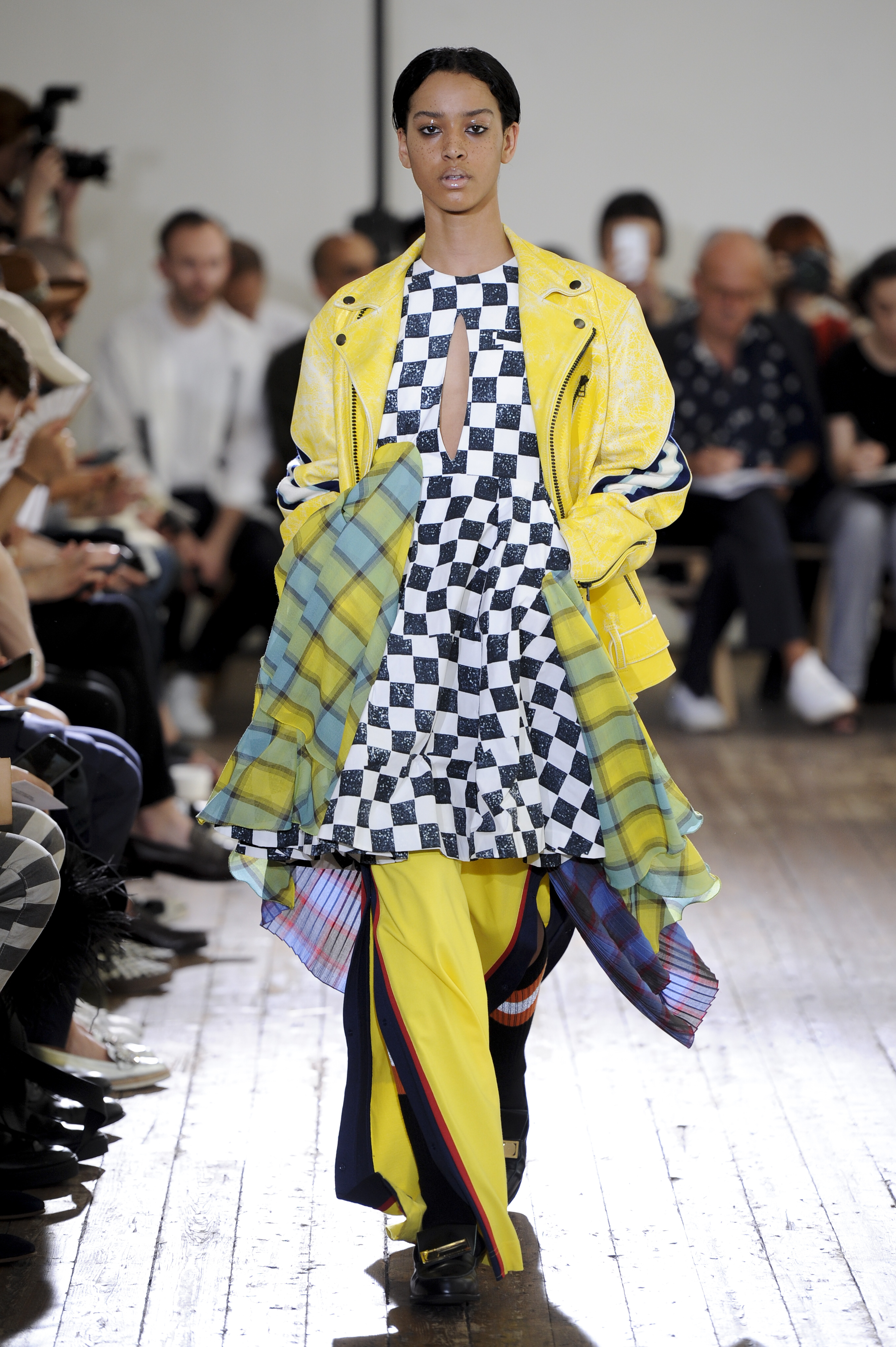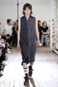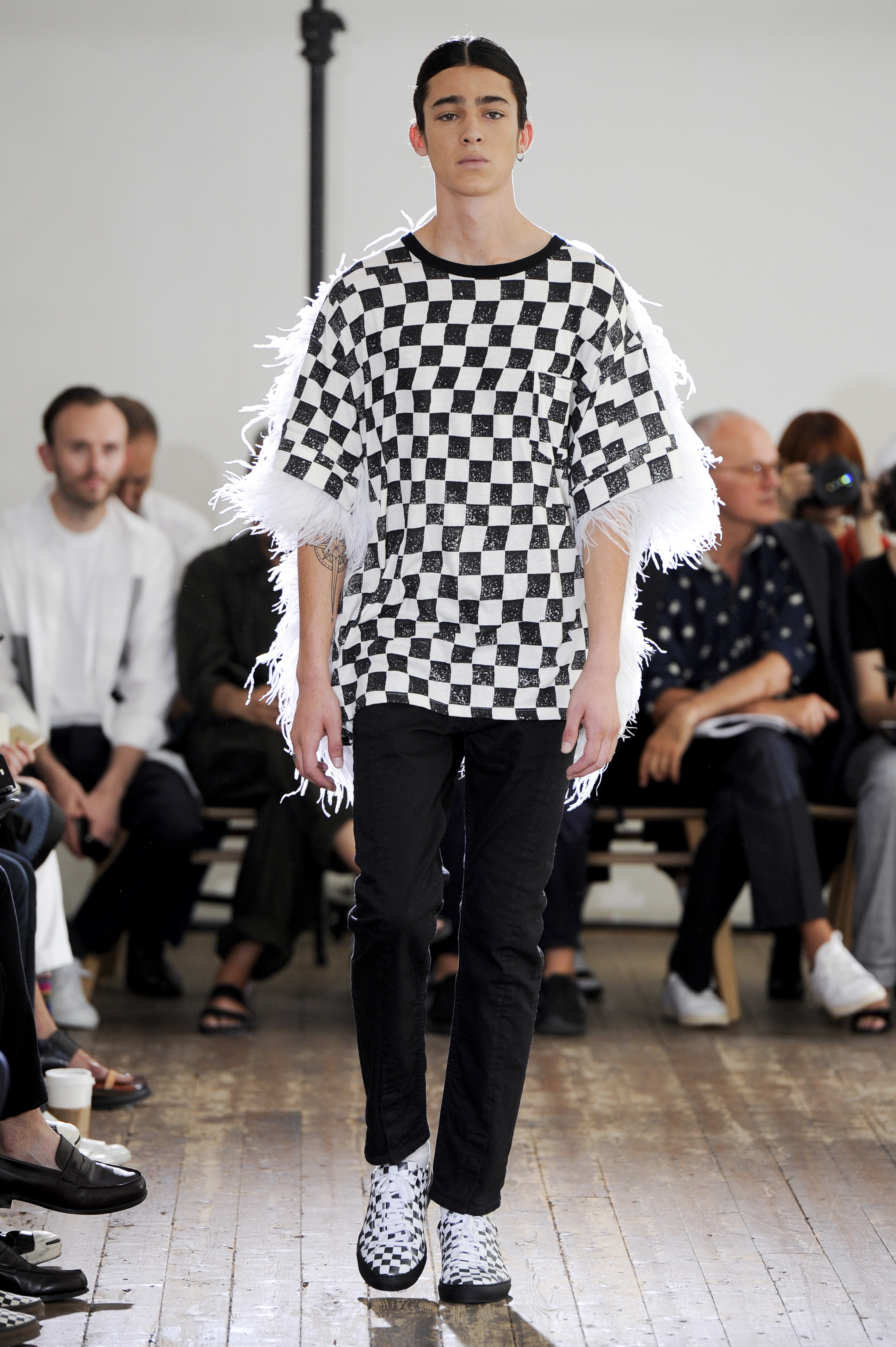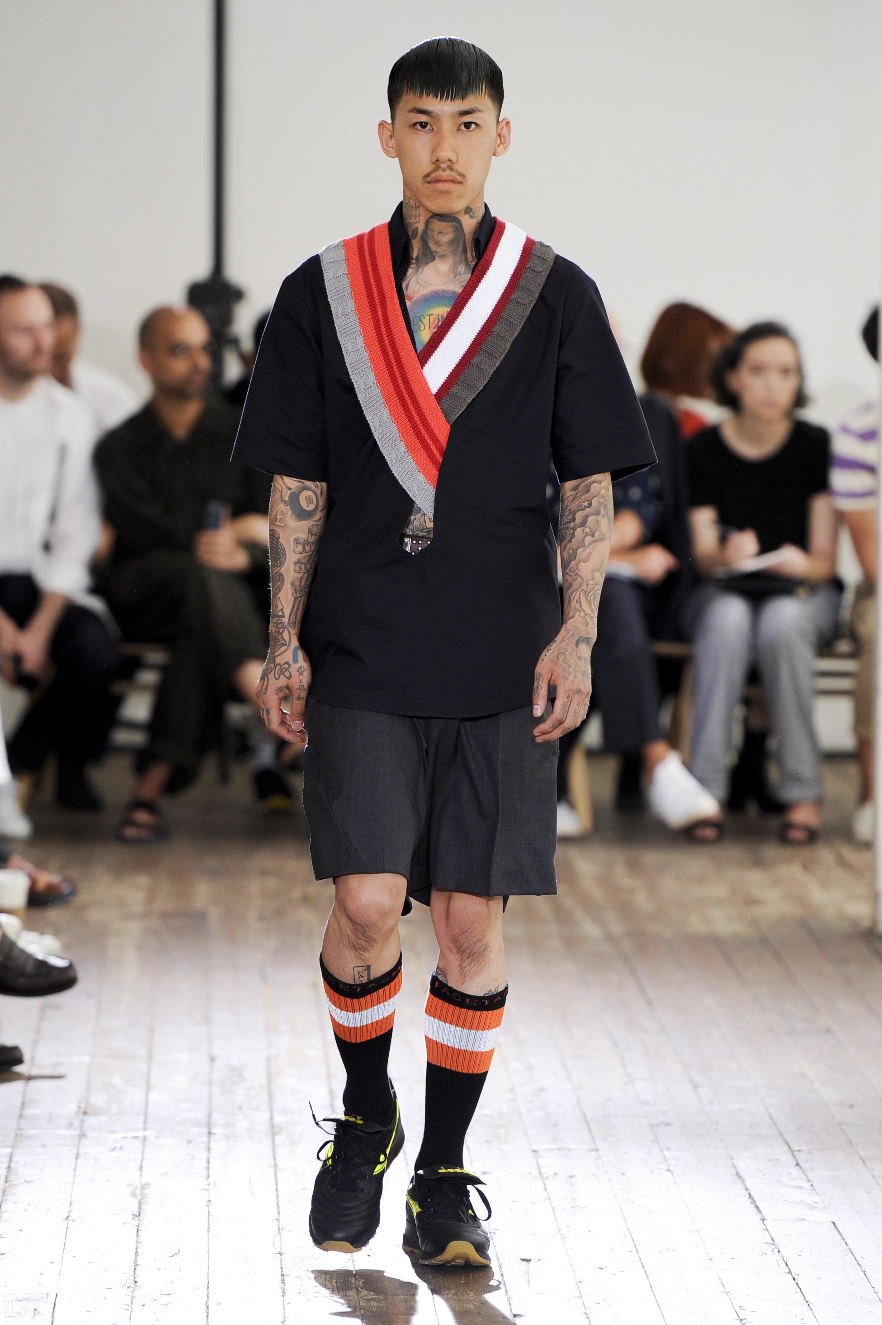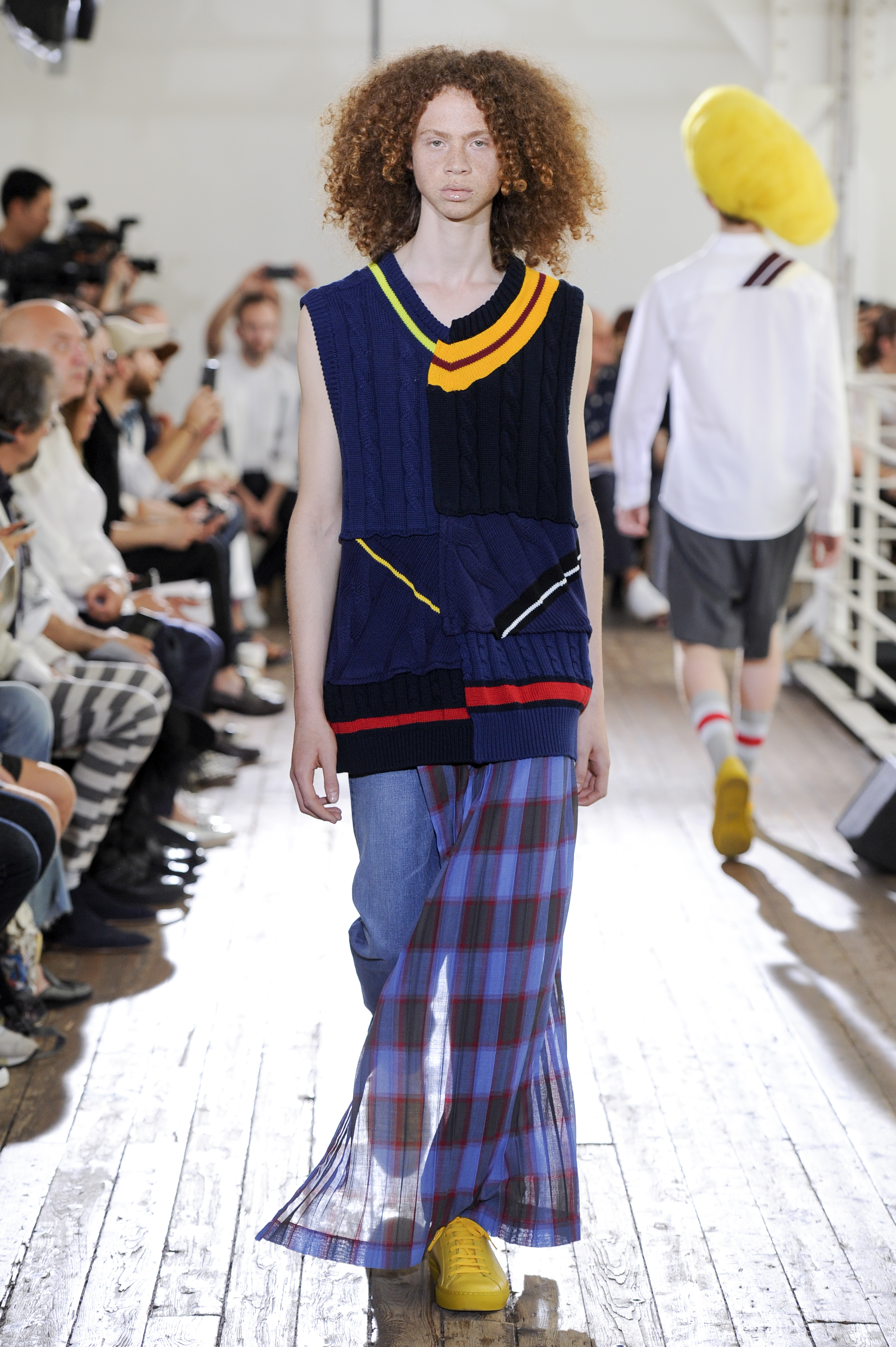 C’est la toute première fois que la marque japonaise défile lors de la semaine de la mode parisienne. Orchestrée par le créateur Hiromichi Ochiai depuis 2007, sa collection éclectique fait souffler un vent de liberté sur la mode. Des silhouettes désinvoltes envahissent les lieux, ce sont les détails qui interpellent : des plumes au dos d’un sweat, des ouvertures qui laissent entrevoir le nombril ou des patchworks de matières inattendues, Hiromichi à le sens du détail. Les dimensions des vêtements sont revisitées, parfois trop longs, parfois trop larges. La norme n’existe pas. Les femmes portent des pantalons qui se terminent en immenses volants et les hommes des costumes déstructurés. Le mélange des styles domine et les motifs sont associés avec une aisance déconcertante. Tantôt, le camo effleure le motif fleuri, tantôt le damier s’oppose aux carreaux colorés sans fausses notes. Les chaussettes tricolores sont remontées jusqu’au mollet, l’esprit est sport. Comme les sweats oversize grieffés d’un numéro et des pantalons larges style jogging. L’homme se plait avec des superpositions bigarrées. Le designer s’amuse à revisiter le vestiaire masculin, le costume se porte sans manches. La déstructuration est reine. Coup de cœur pour la veste bleu « La Cène » version pop. Facetasm vous salue.