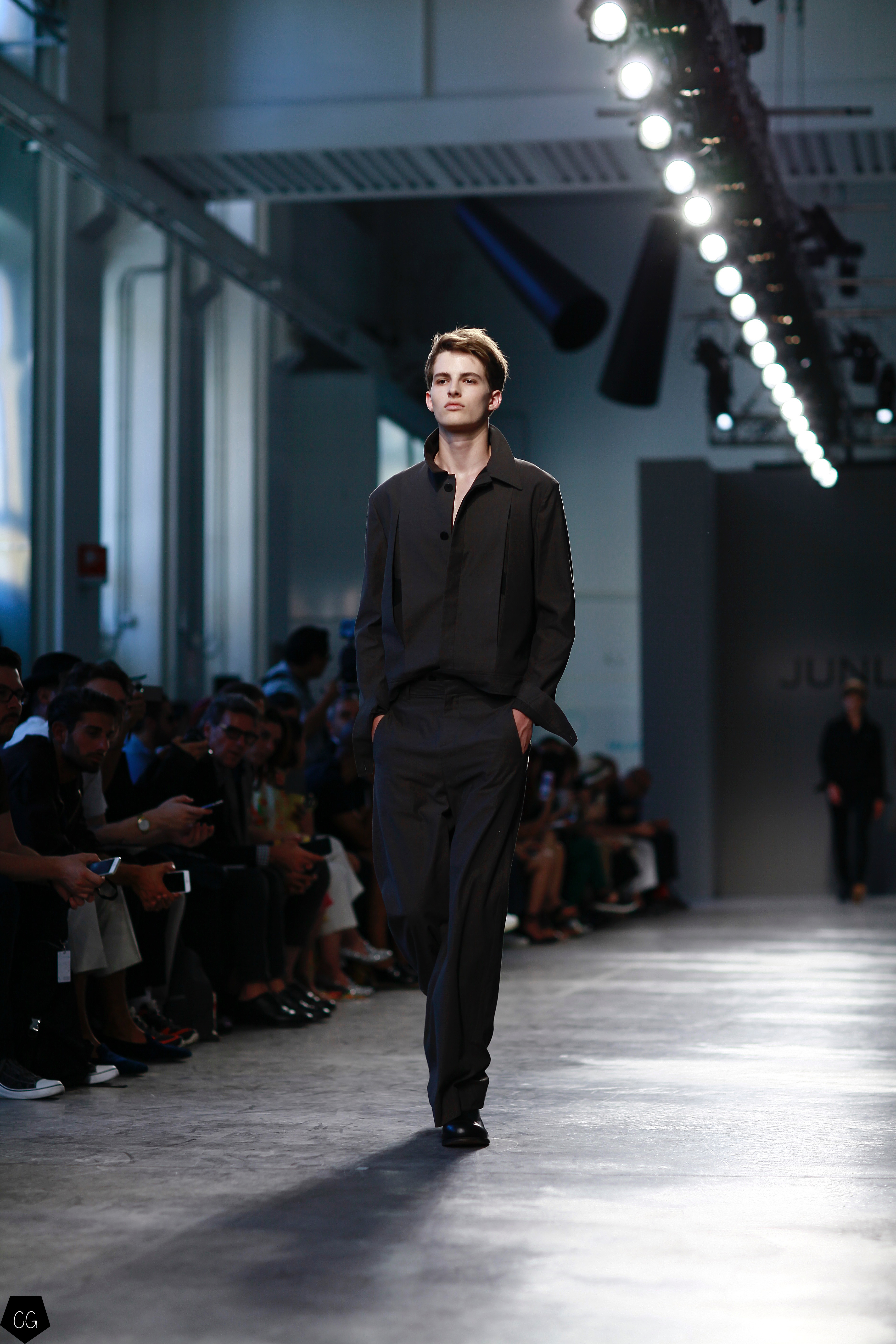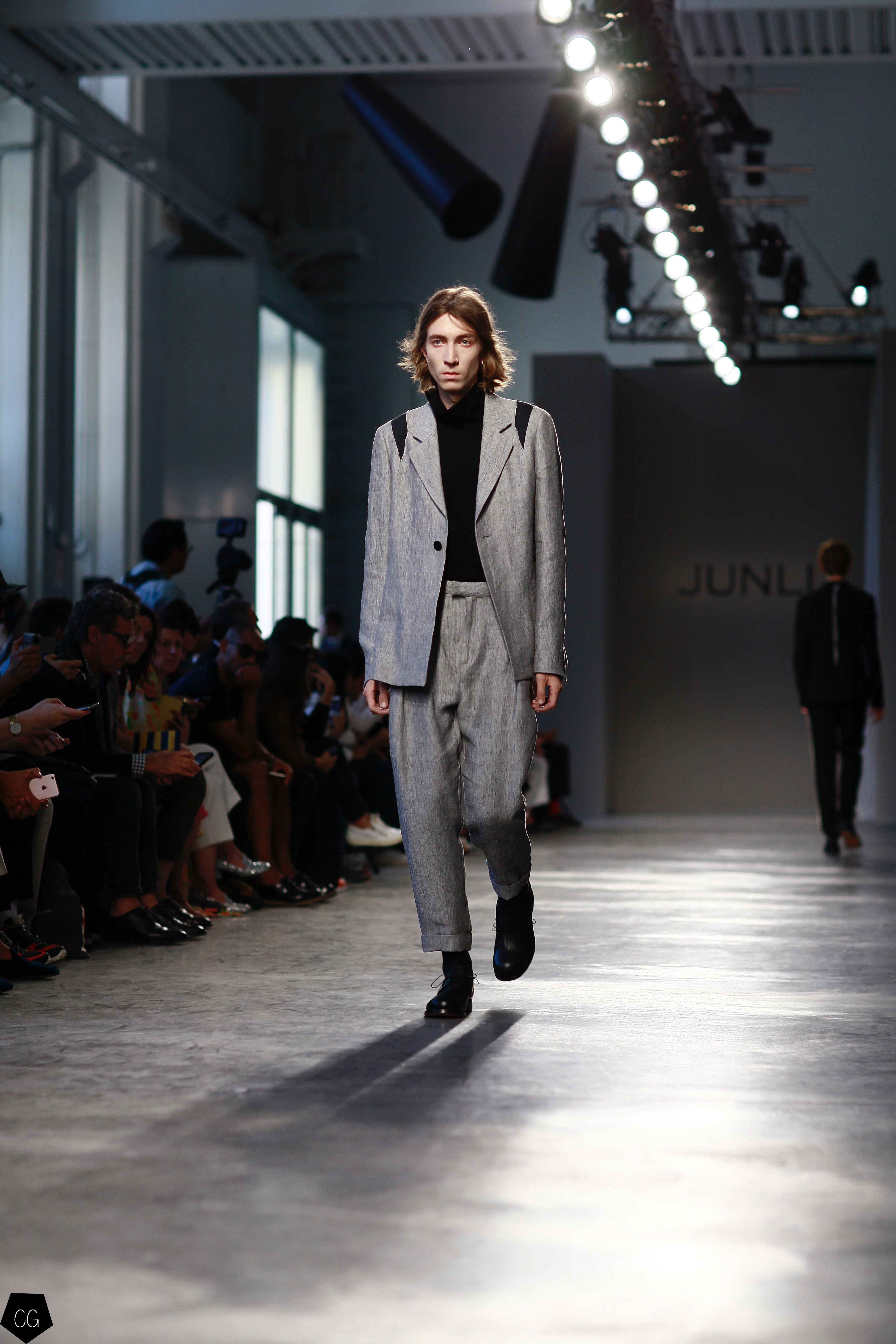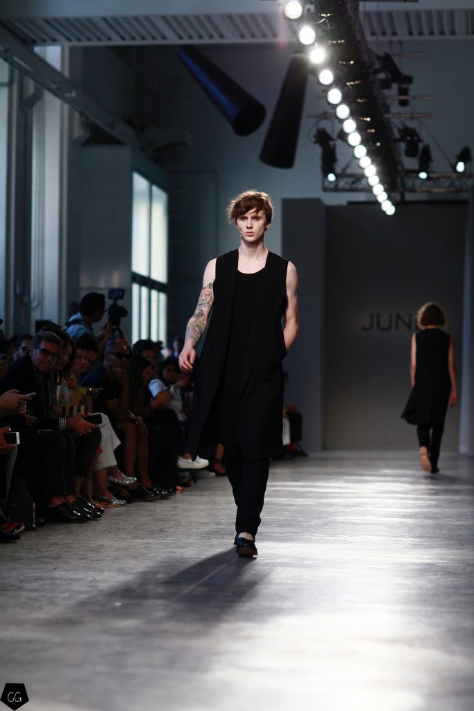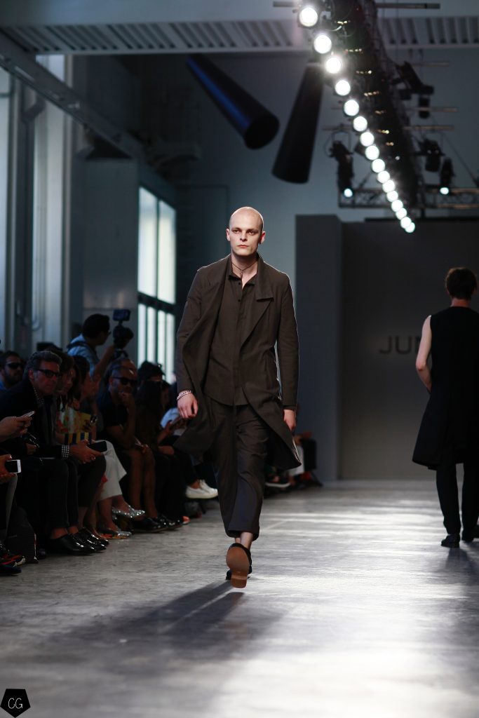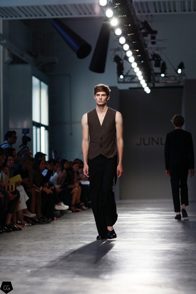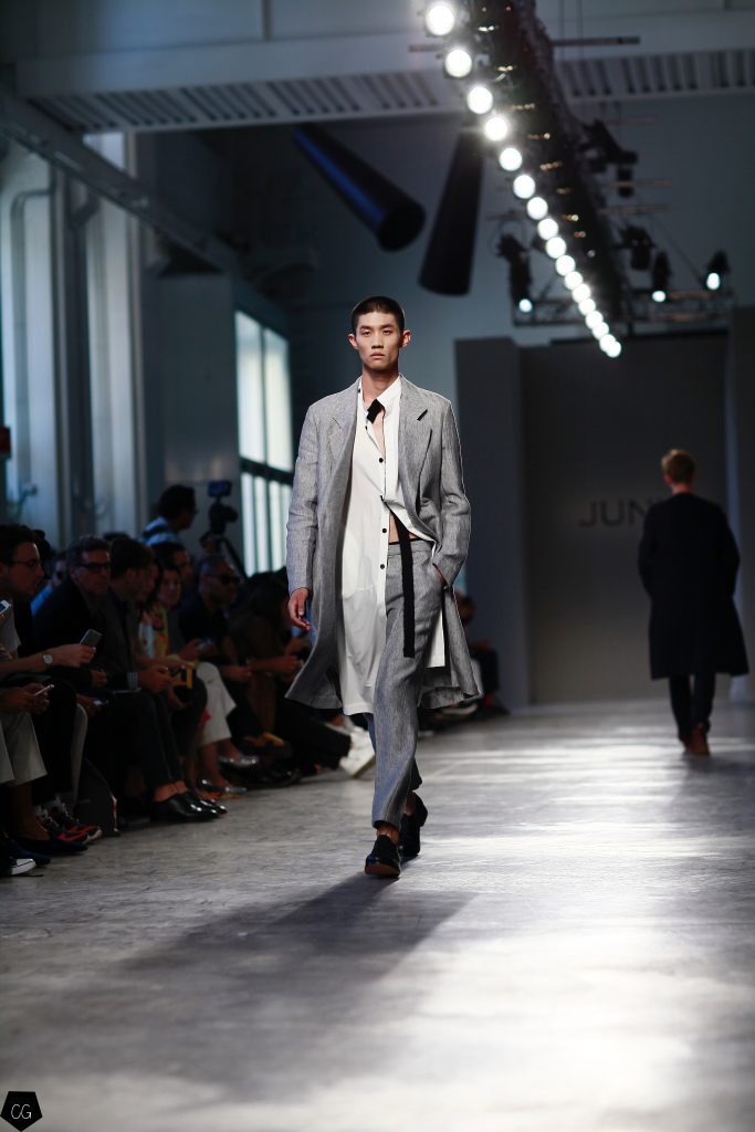 Manteaux longs, chemises ouvertes et côté jeune et un peu rebelle, Jun Li partage son image de l’homme moderne. La marque qui allie équilibre et contraste, mise sur un mixe entre costume masculin très stricte, avec le pantalon droit et la veste, et le confort avec des tissus fluides et des chemises au style rebelle. Tout le travail est dans le détail et la précision des modèles.
