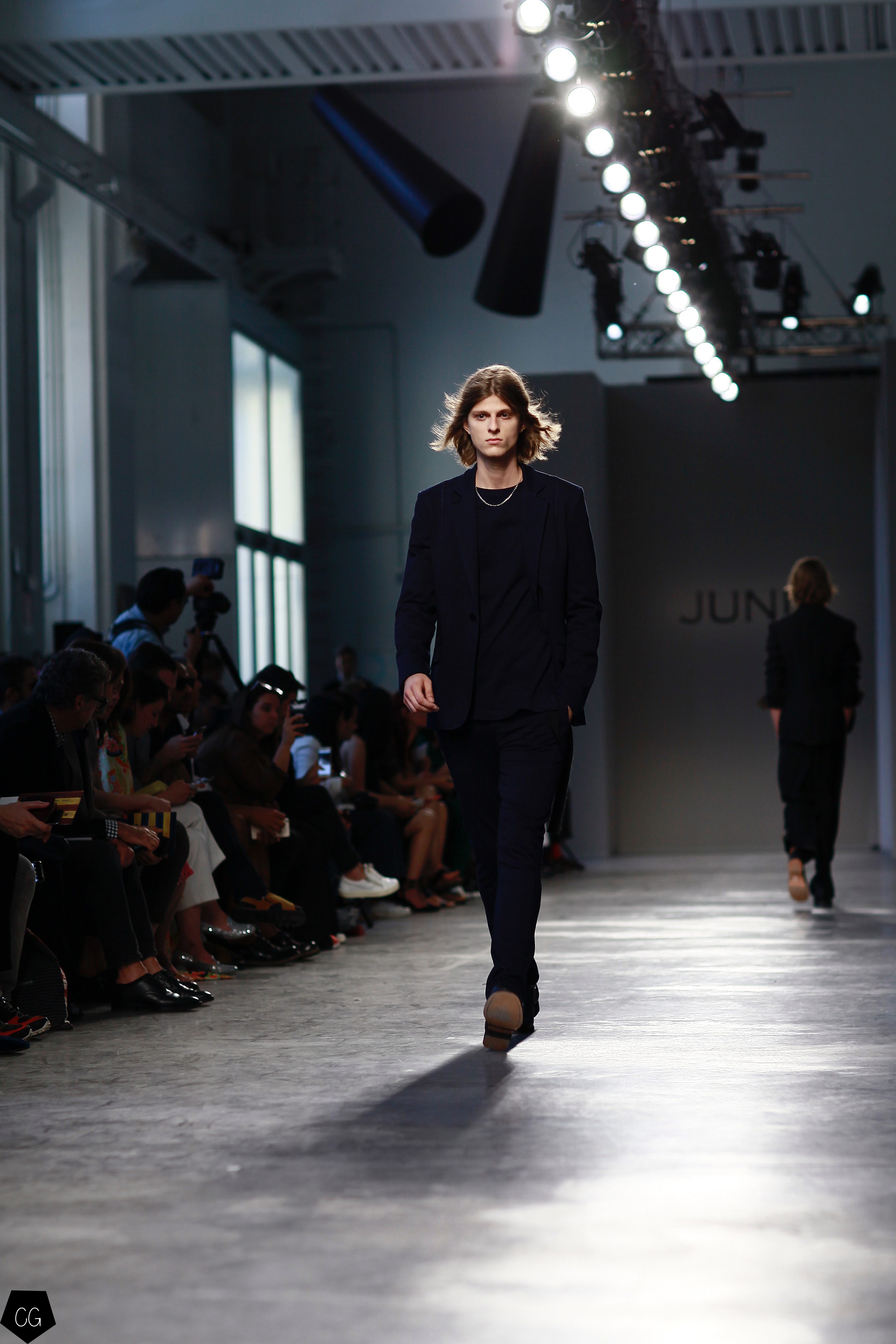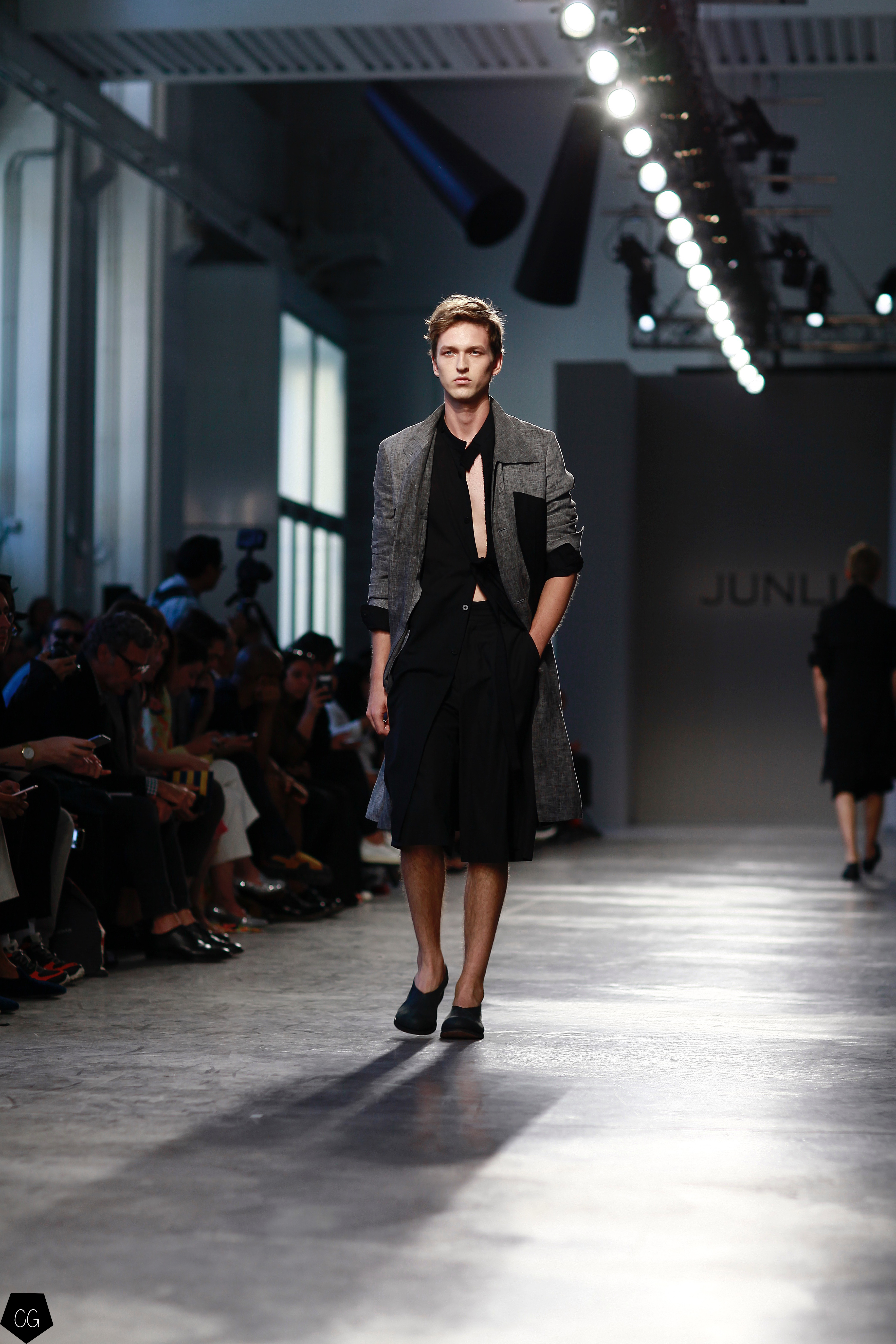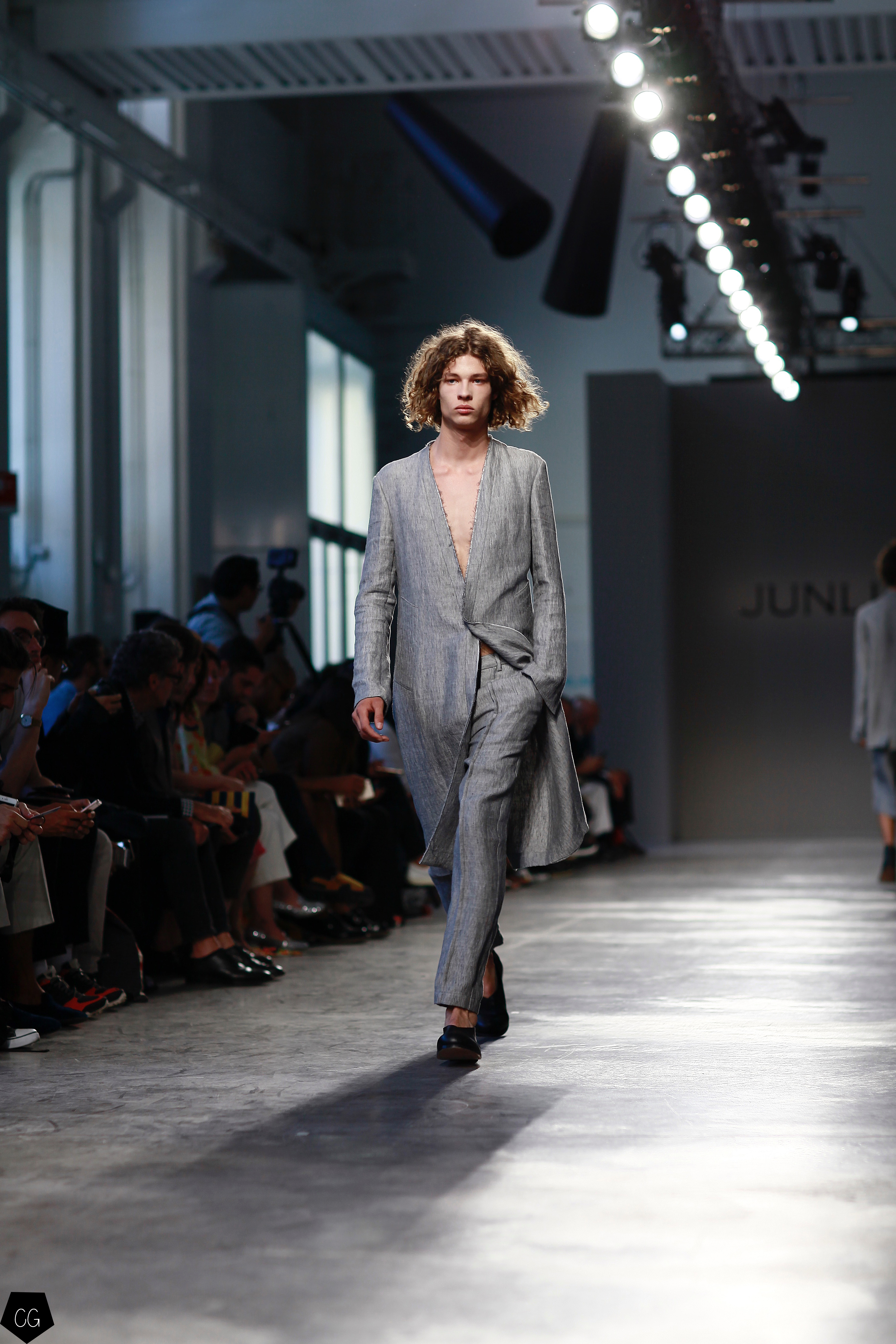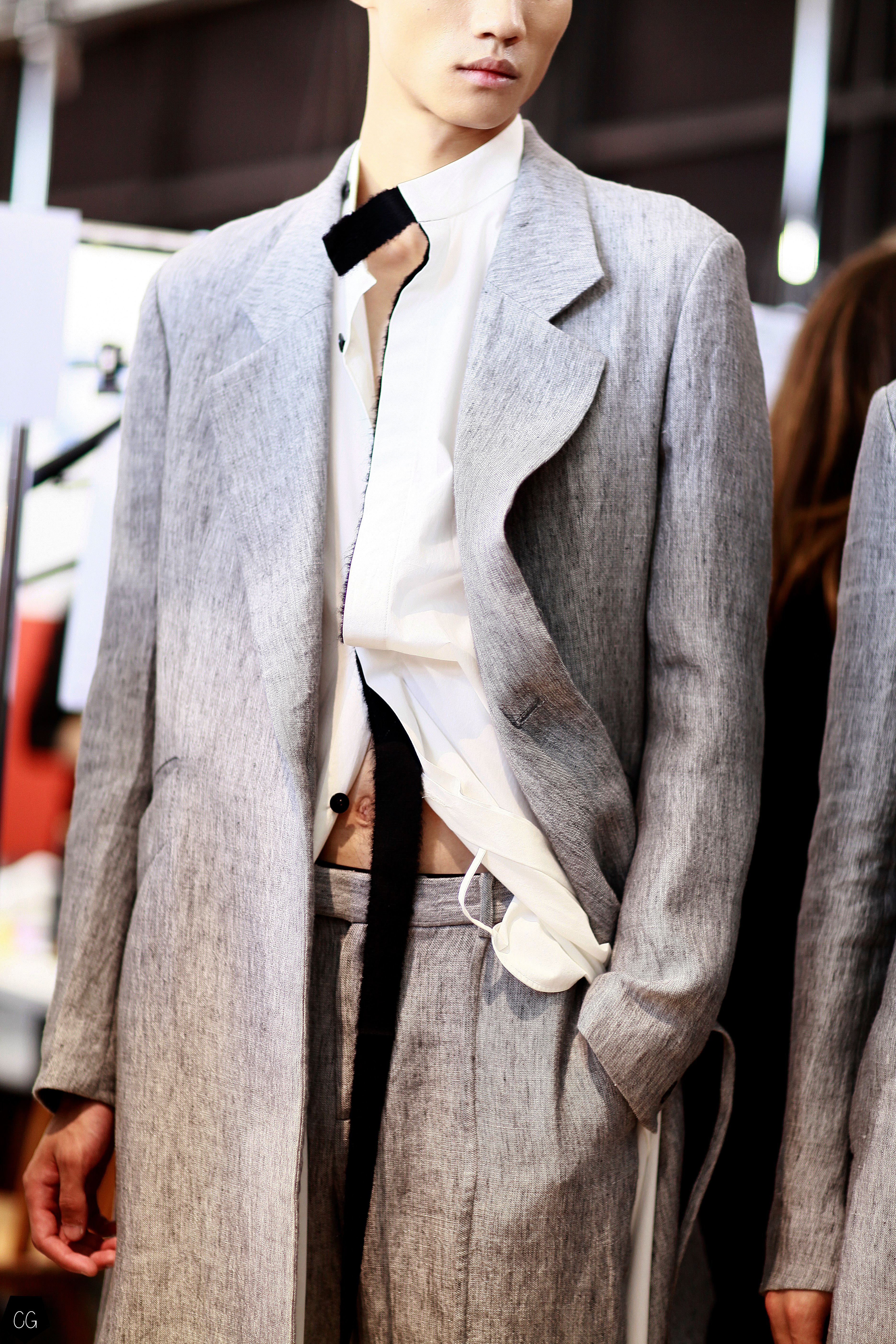 Manteaux longs, chemises ouvertes et côté jeune et un peu rebelle, Jun Li partage son image de l’homme moderne. La marque qui allie équilibre et contraste, mise sur un mixe entre costume masculin très stricte, avec le pantalon droit et la veste, et le confort avec des tissus fluides et des chemises au style rebelle. Tout le travail est dans le détail et la précision des modèles.