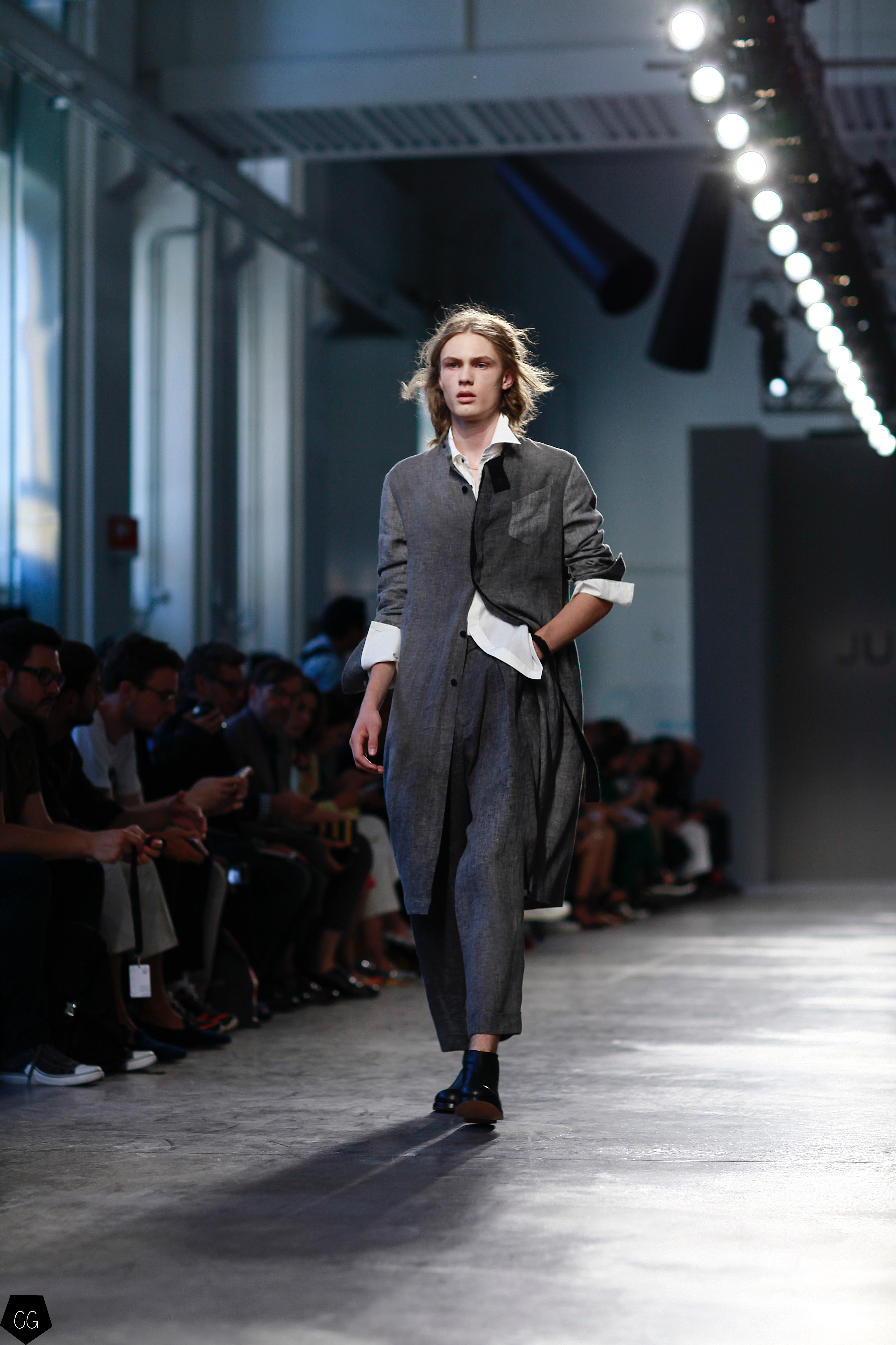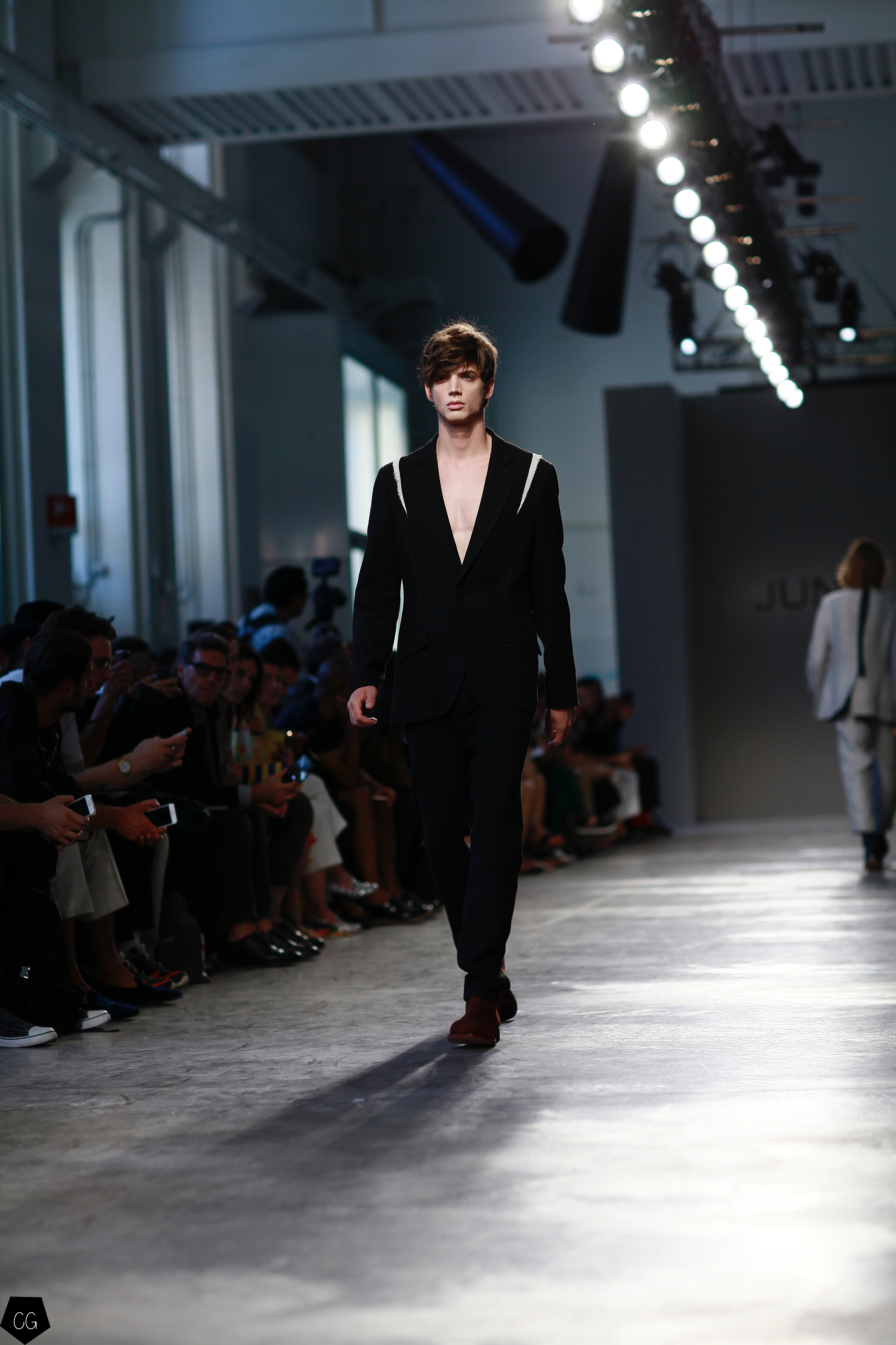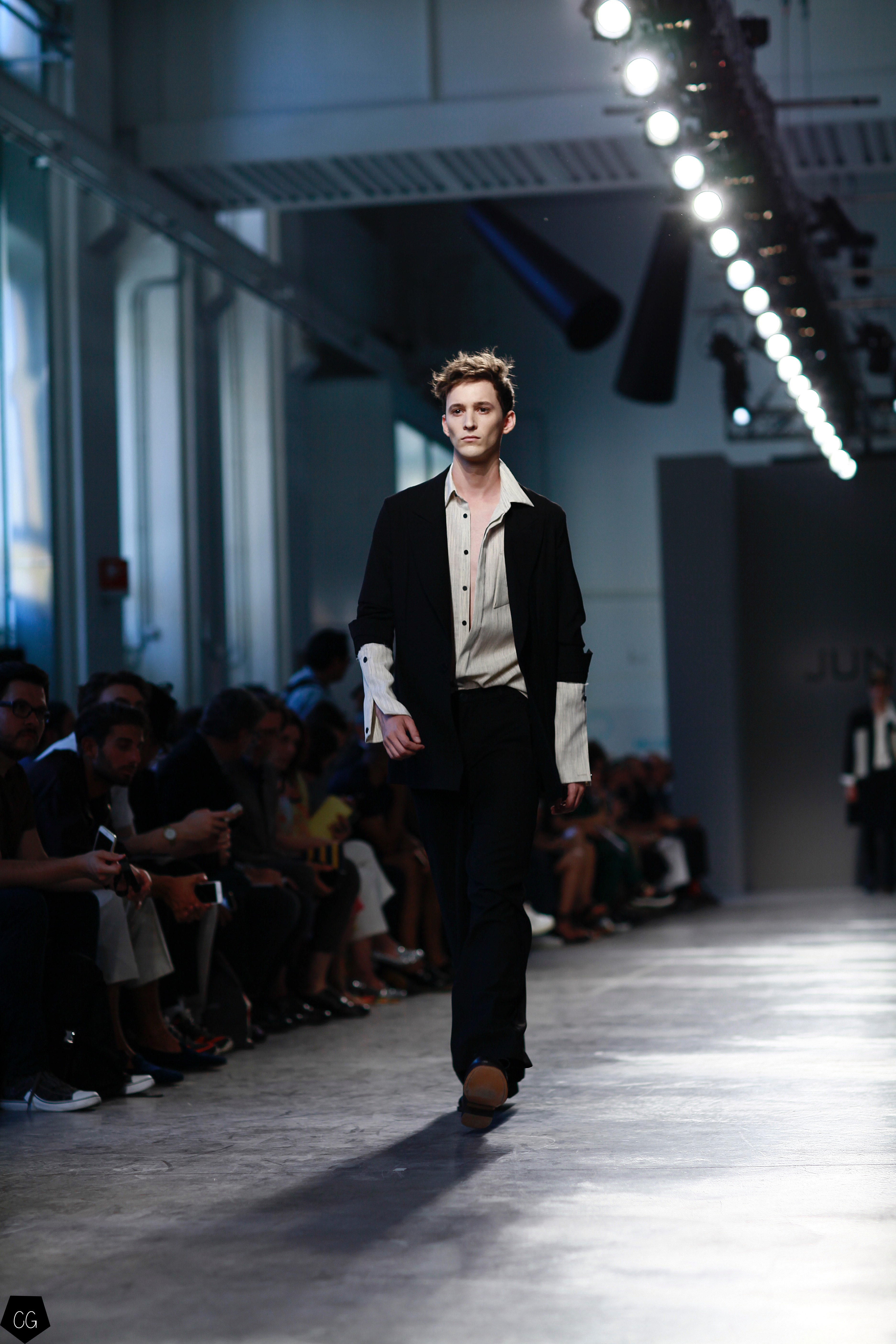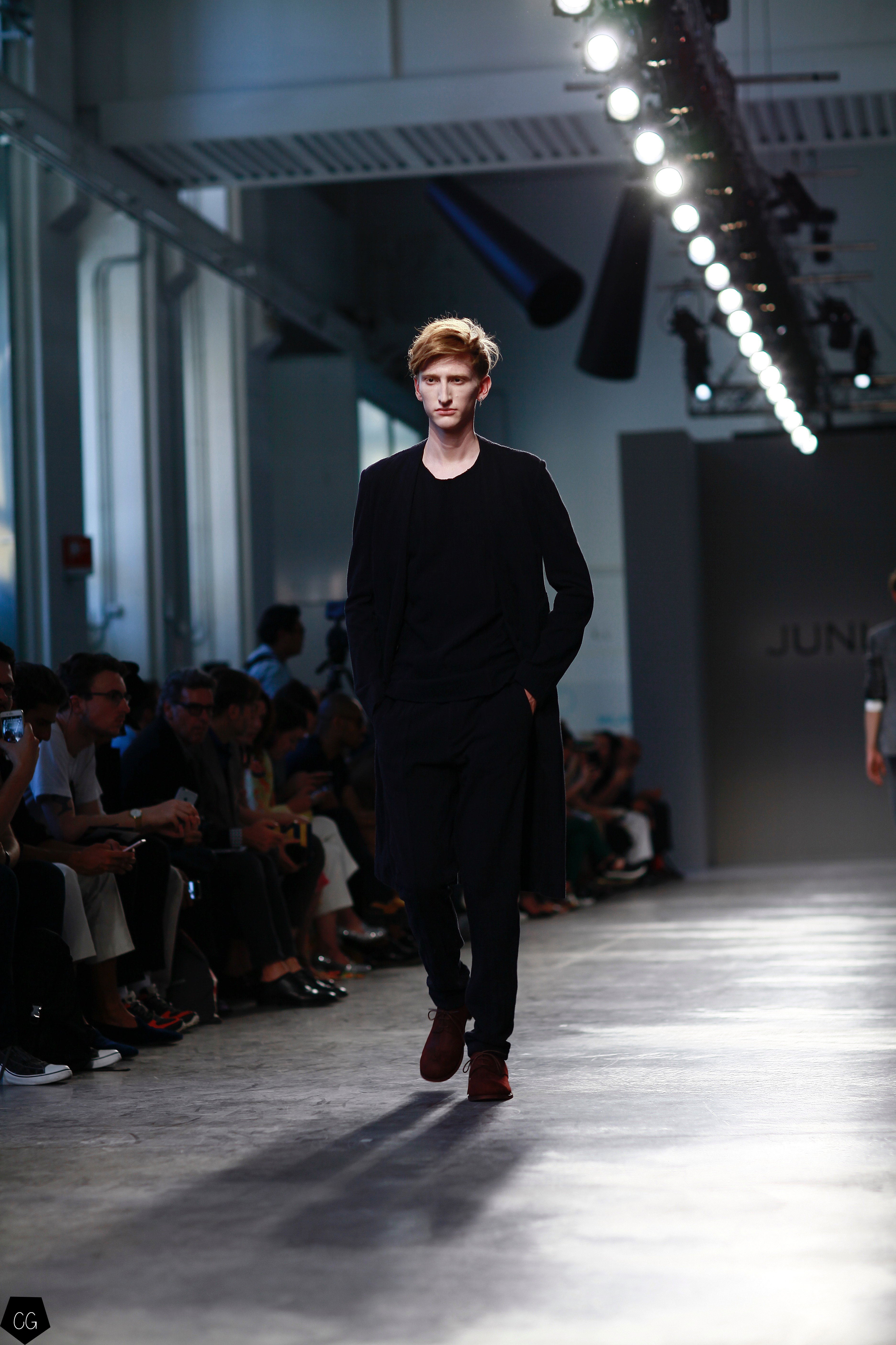 Manteaux longs, chemises ouvertes et côté jeune et un peu rebelle, Jun Li partage son image de l’homme moderne. La marque qui allie équilibre et contraste, mise sur un mixe entre costume masculin très stricte, avec le pantalon droit et la veste, et le confort avec des tissus fluides et des chemises au style rebelle. Tout le travail est dans le détail et la précision des modèles.