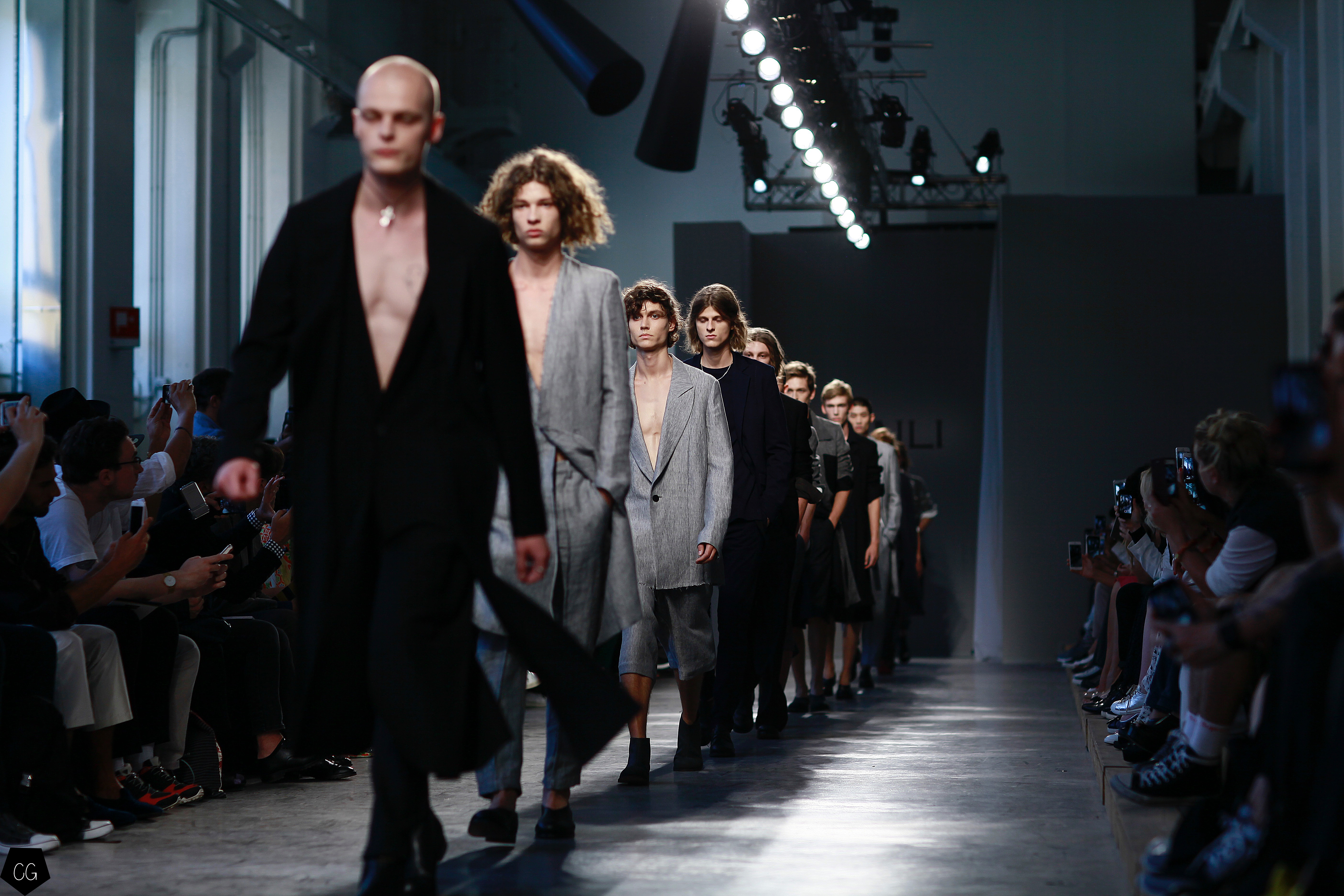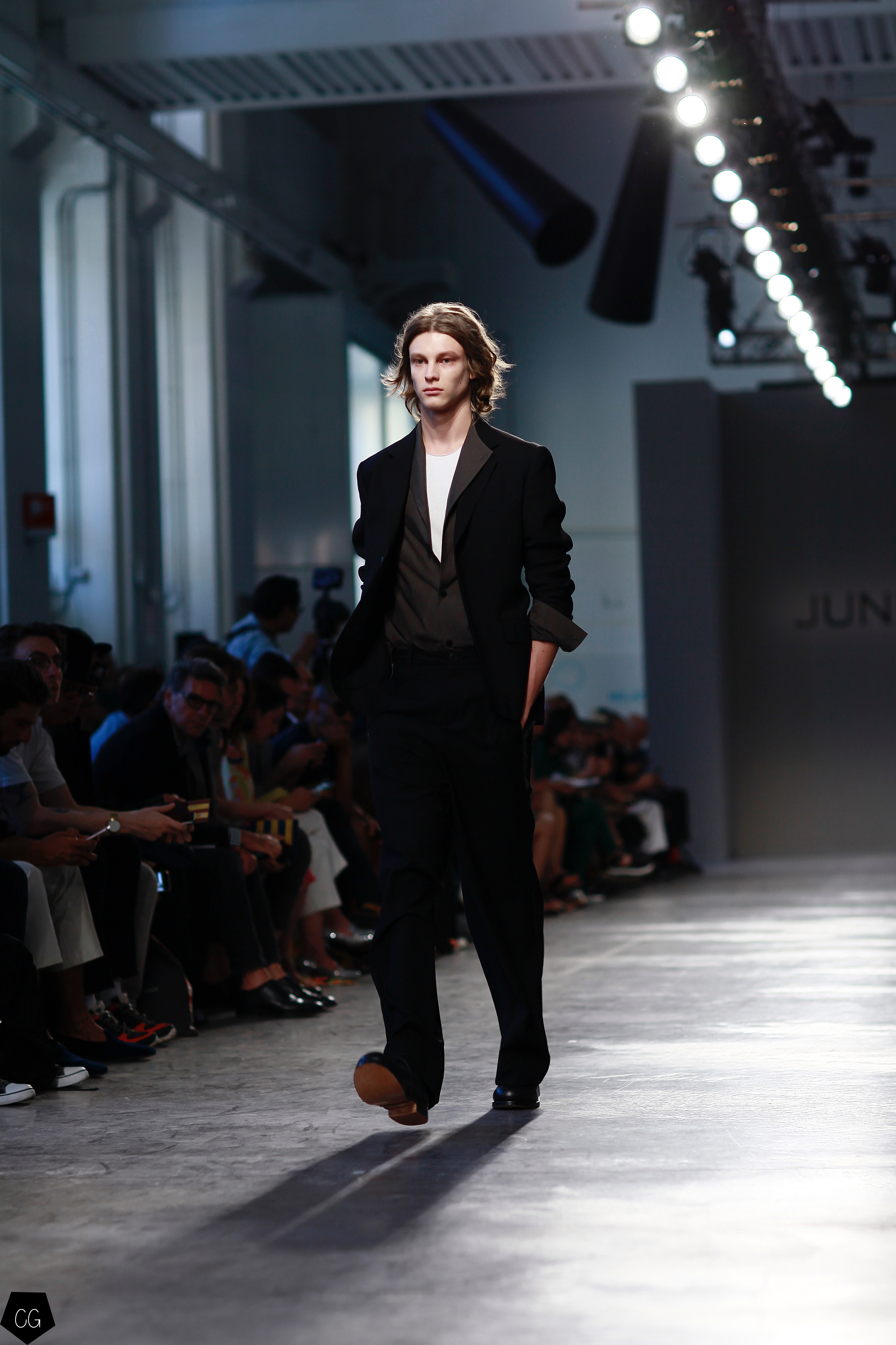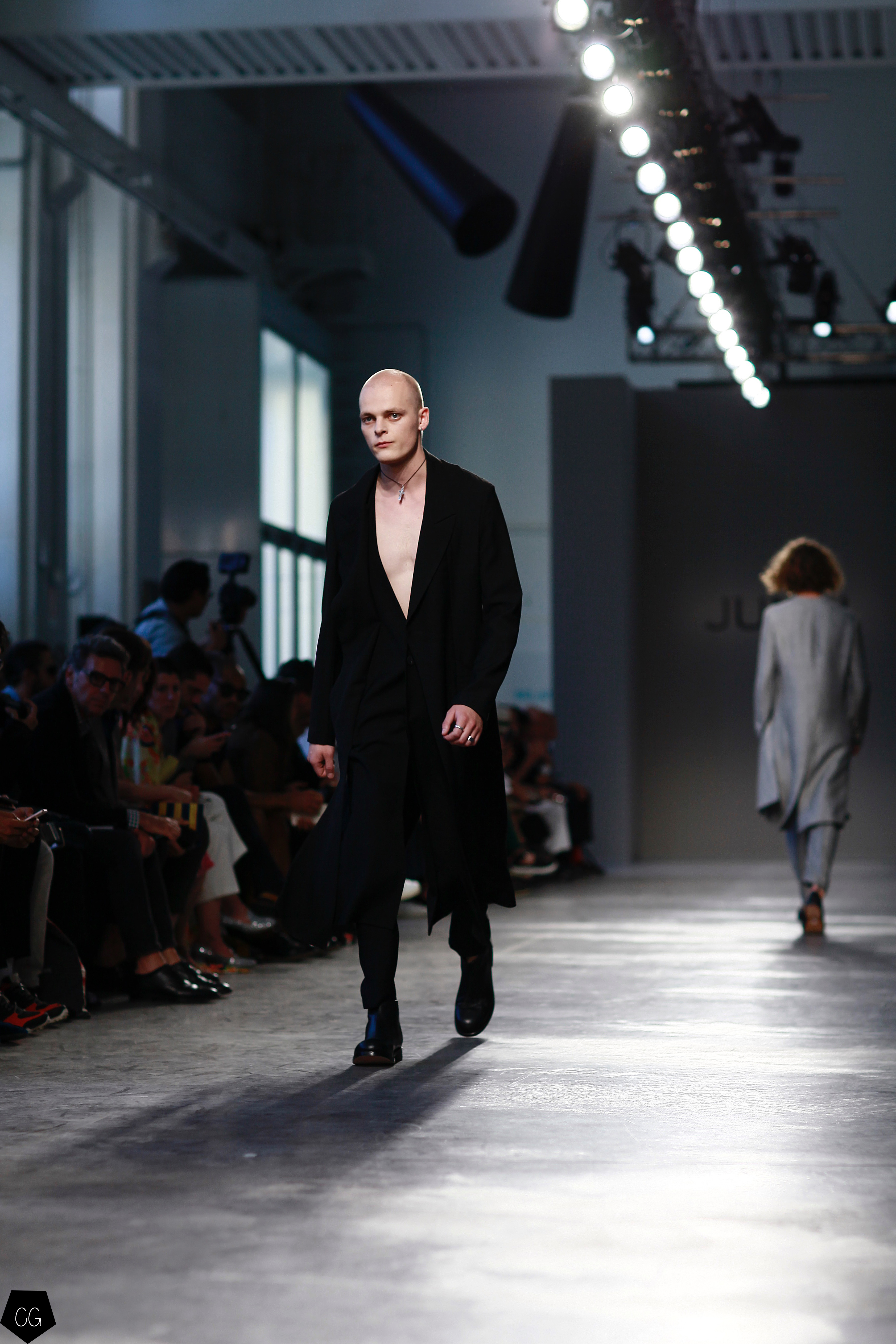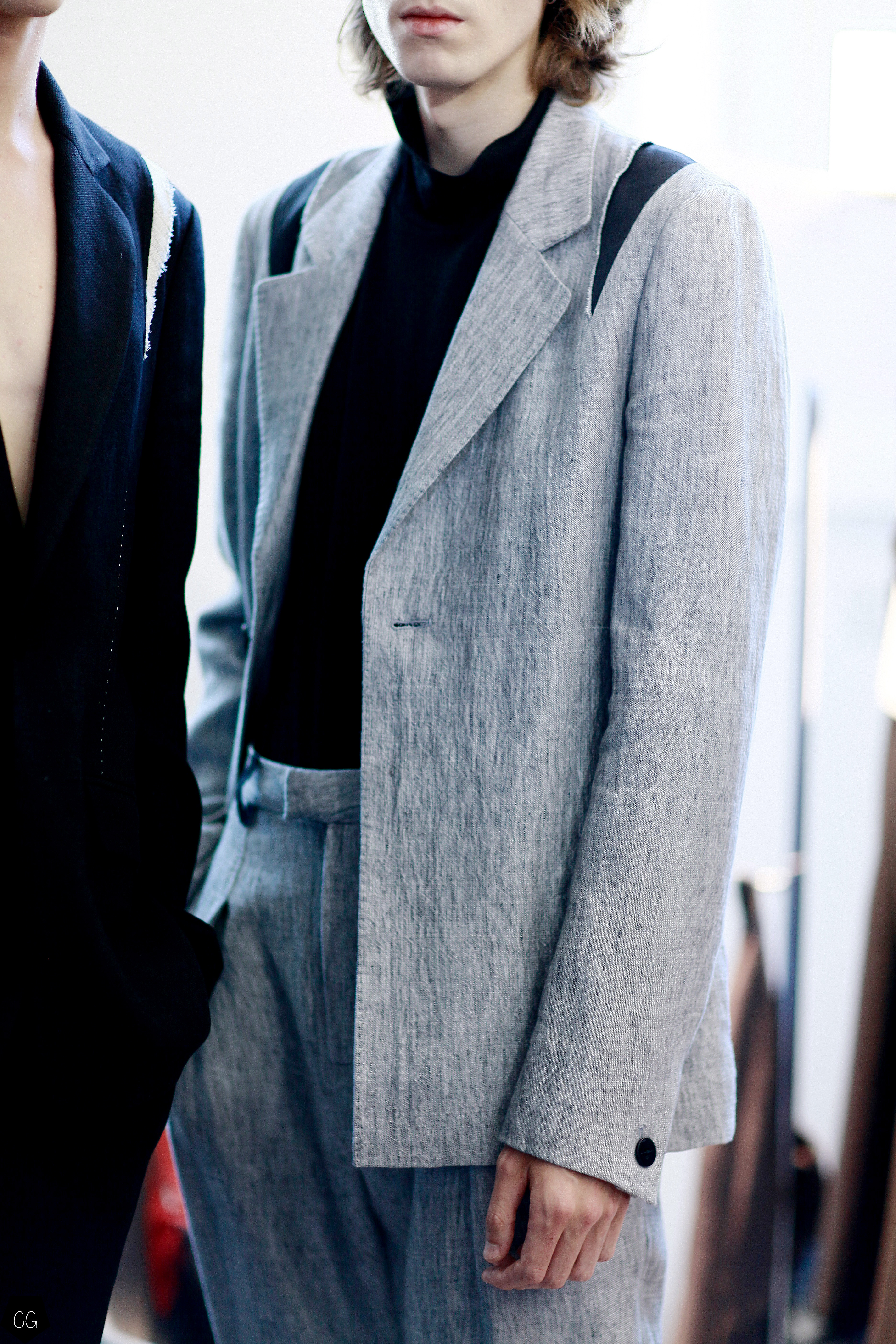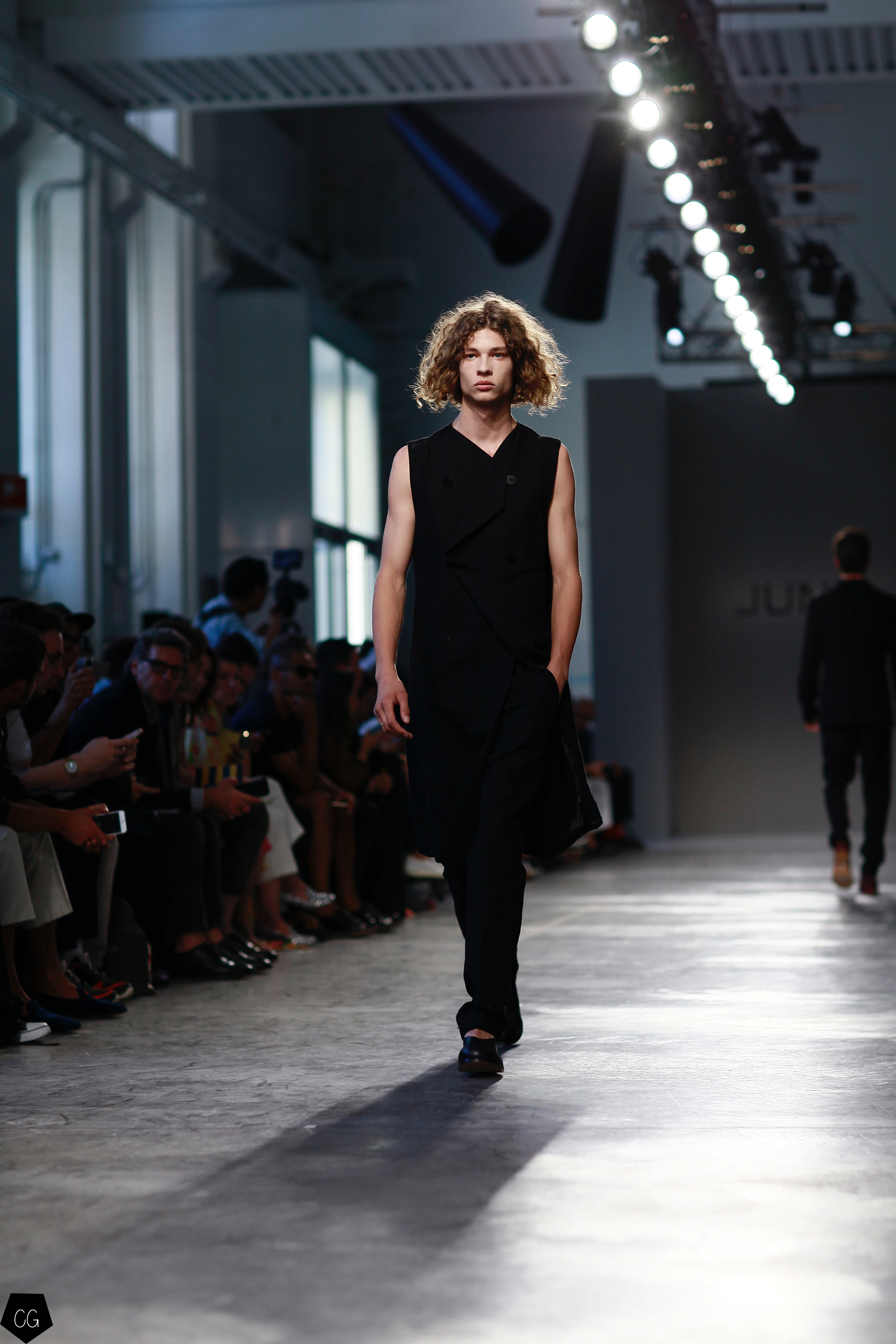 Manteaux longs, chemises ouvertes et côté jeune et un peu rebelle, Jun Li partage son image de l’homme moderne. La marque qui allie équilibre et contraste, mise sur un mixe entre costume masculin très stricte, avec le pantalon droit et la veste, et le confort avec des tissus fluides et des chemises au style rebelle. Tout le travail est dans le détail et la précision des modèles.