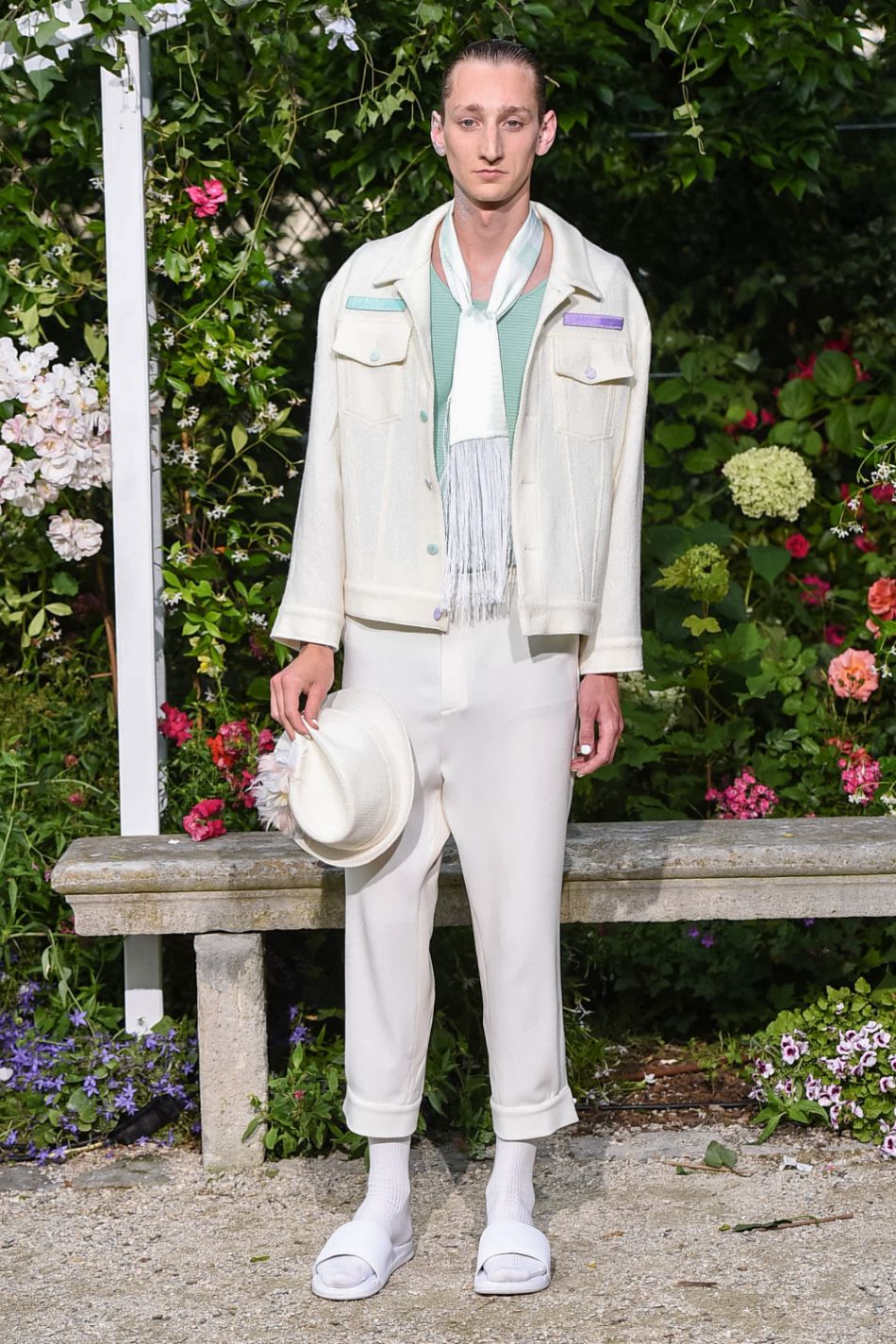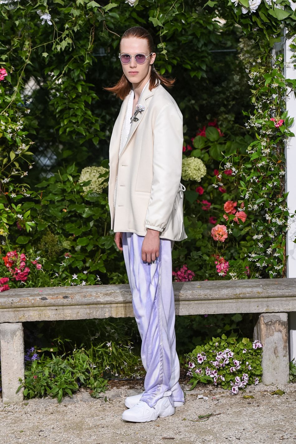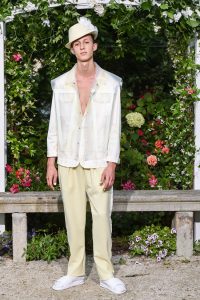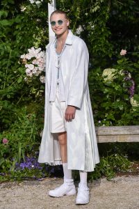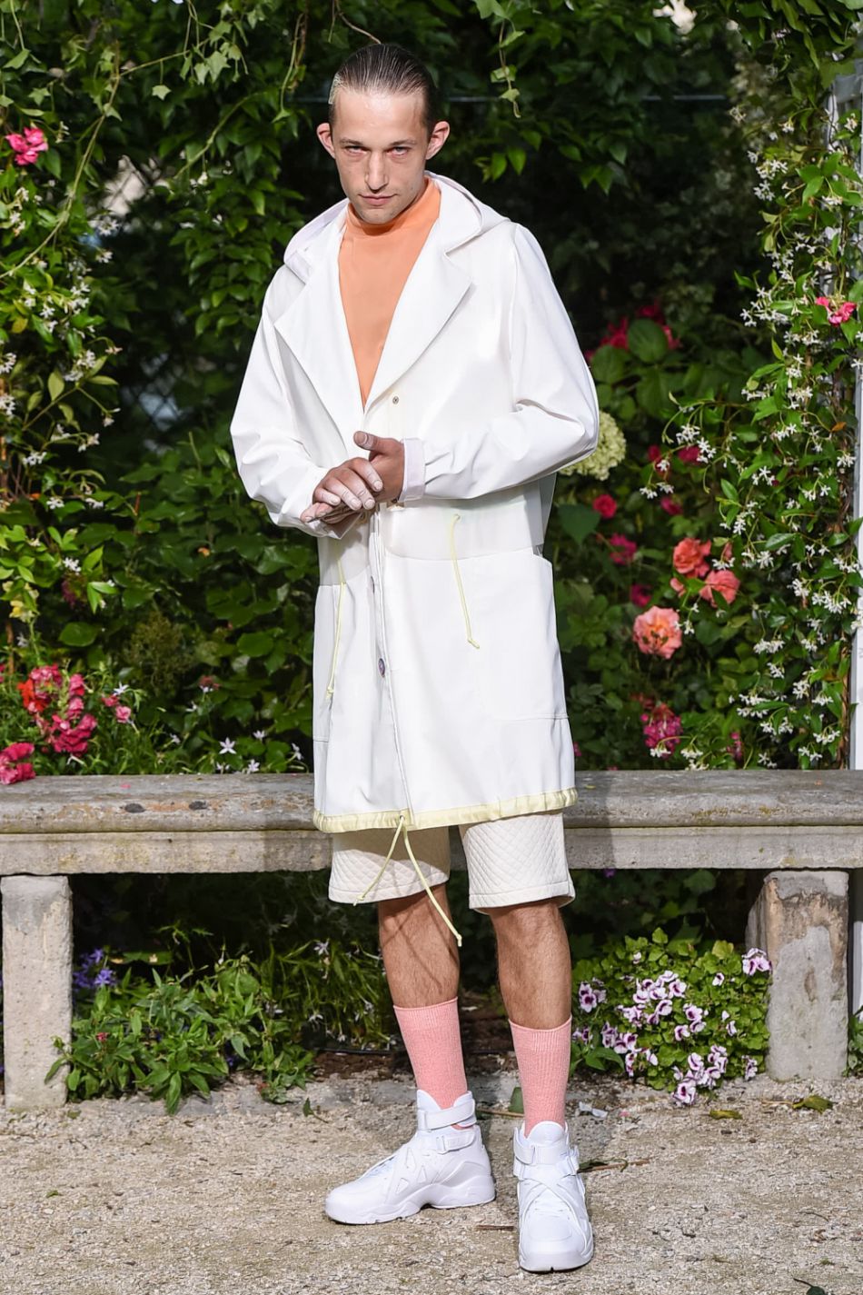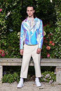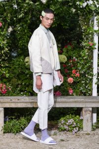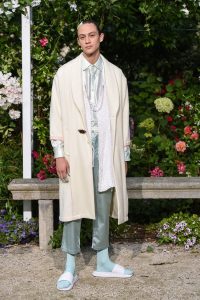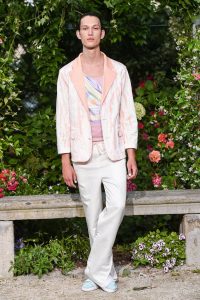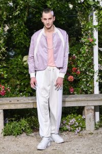 Les silhouettes sont douces grâce aux différentes nuances de couleurs utilisées : sweet mauve, vert pâle ou rose vieilli. Des choix audacieux qui tranchent avec la palette traditionnelle d’une cérémonie classique. Matelassées, satinées, brillantes et aériennes, les matières sont précieuses. Notre seul désir, réussir à les palper. L’hologramme se décline sur une veste ou sur un sac banane. Il n’est plus réservé qu’à la gente féminine. Les détails sont importants, les chaussettes montantes sont coordonnées aux couleurs des tenues. Des plissés se cachent sur le coté d’un long manteau blanc et des poches se dessinent à l’arrière d’une veste afin de nous duper. Les hommes portent même des colliers de perles autour du cou.