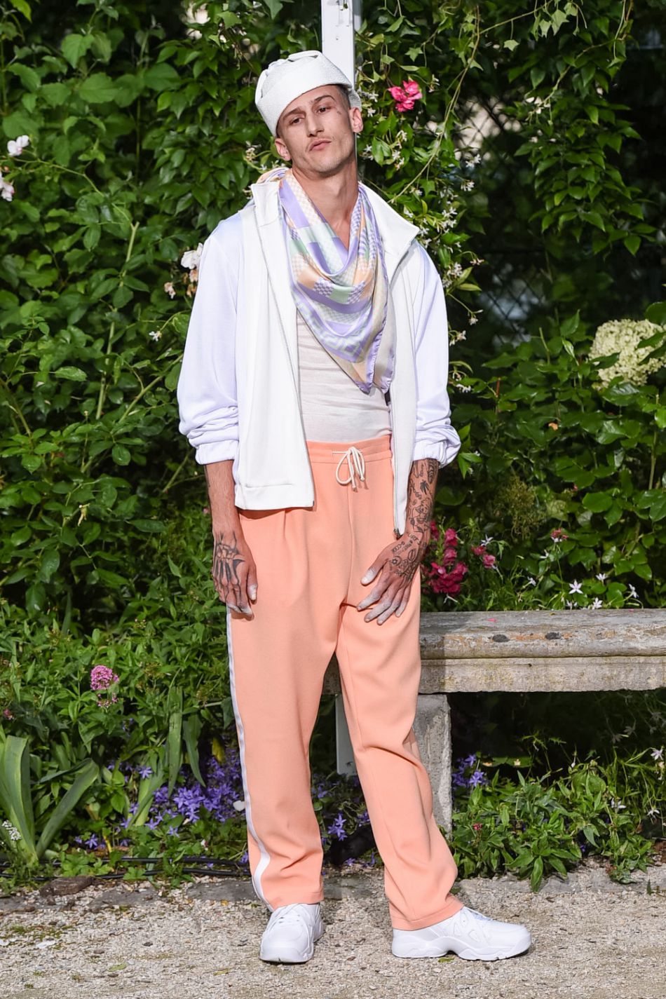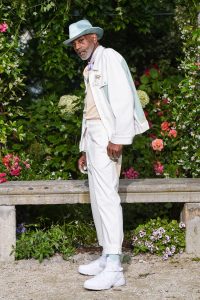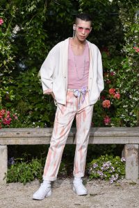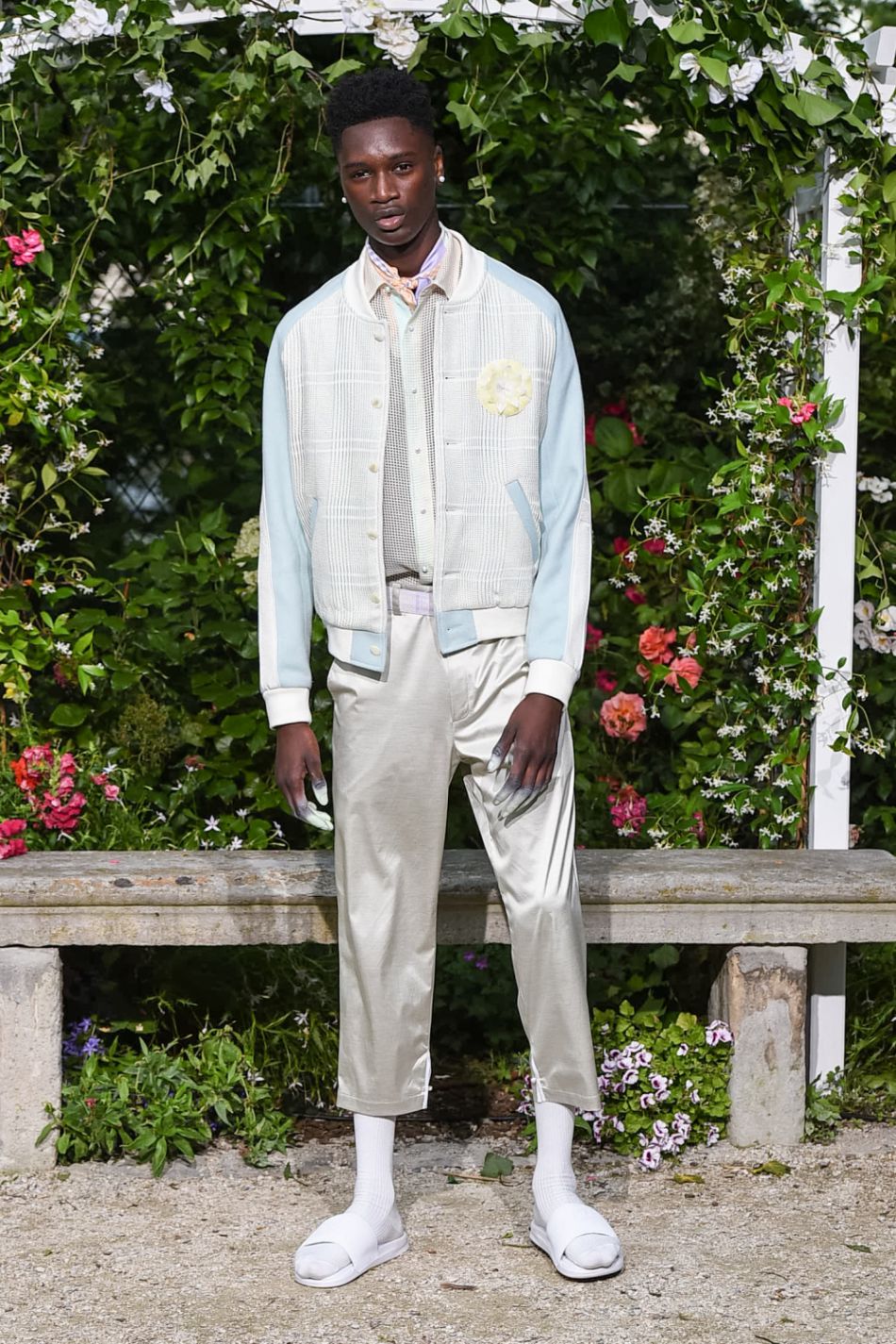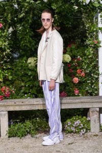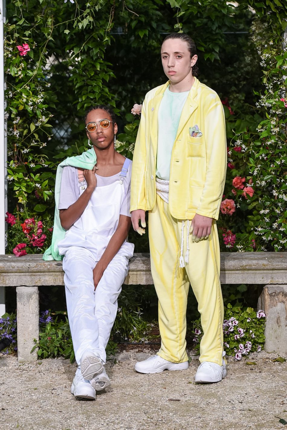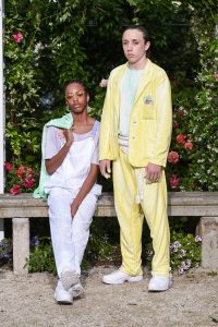 Le ton est donné à l’entrée des lieux : un jardin bucolique, une ribambelle de fleurs et des tables blanches dressées façon mariage en plein air. Les fleurs envahissent l’espace et composent même le logo du label français placé au fond de la cour. Pour cette nouvelle collection, Stéphane Ashpool tire son inspiration d’un souvenir d’enfance : le mariage de ses parents. Cérémonie oblige, les mannequins sont sur leurs 31. Cependant, le costume traditionnel a été évincé. A la place, on découvre des ensembles monochromes pastels à l’esprit sportswear. Elégance d’un nouveau genre, de la dégaine des modèles émane une assurance folle. Les cheveux sont gominés avec des paillettes multicolores, non sans rappeler l’audace de jeunes gangsters presque trop charmeurs.