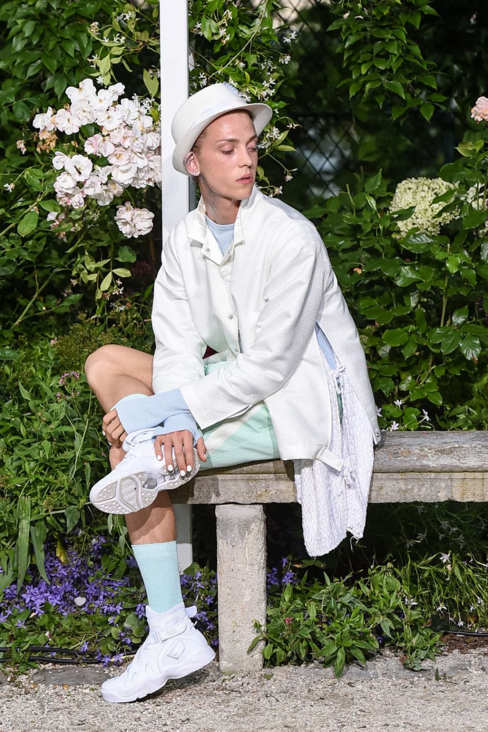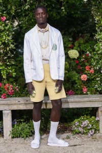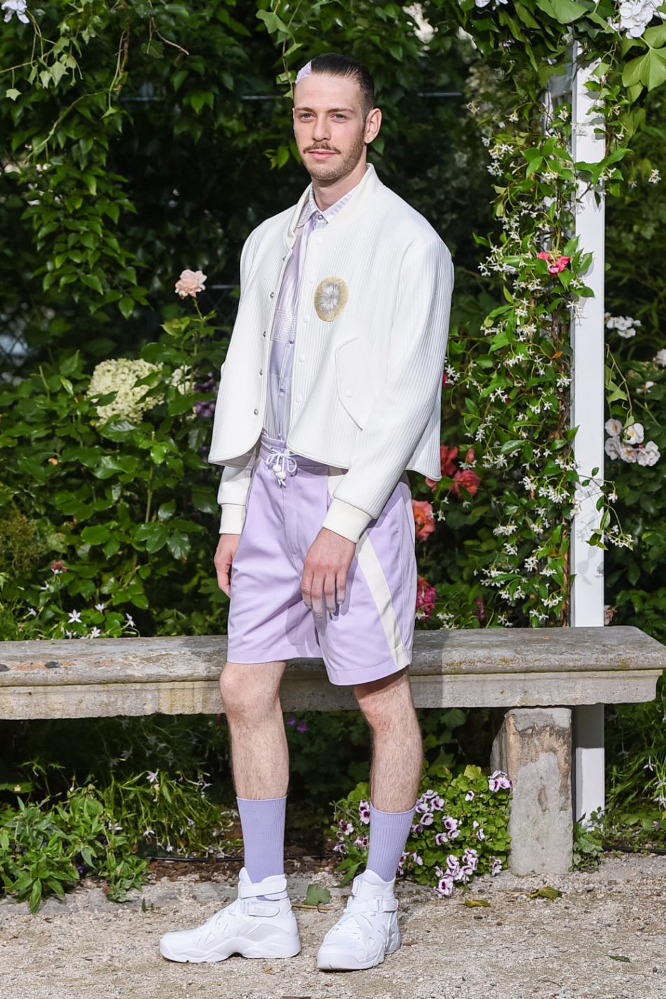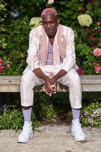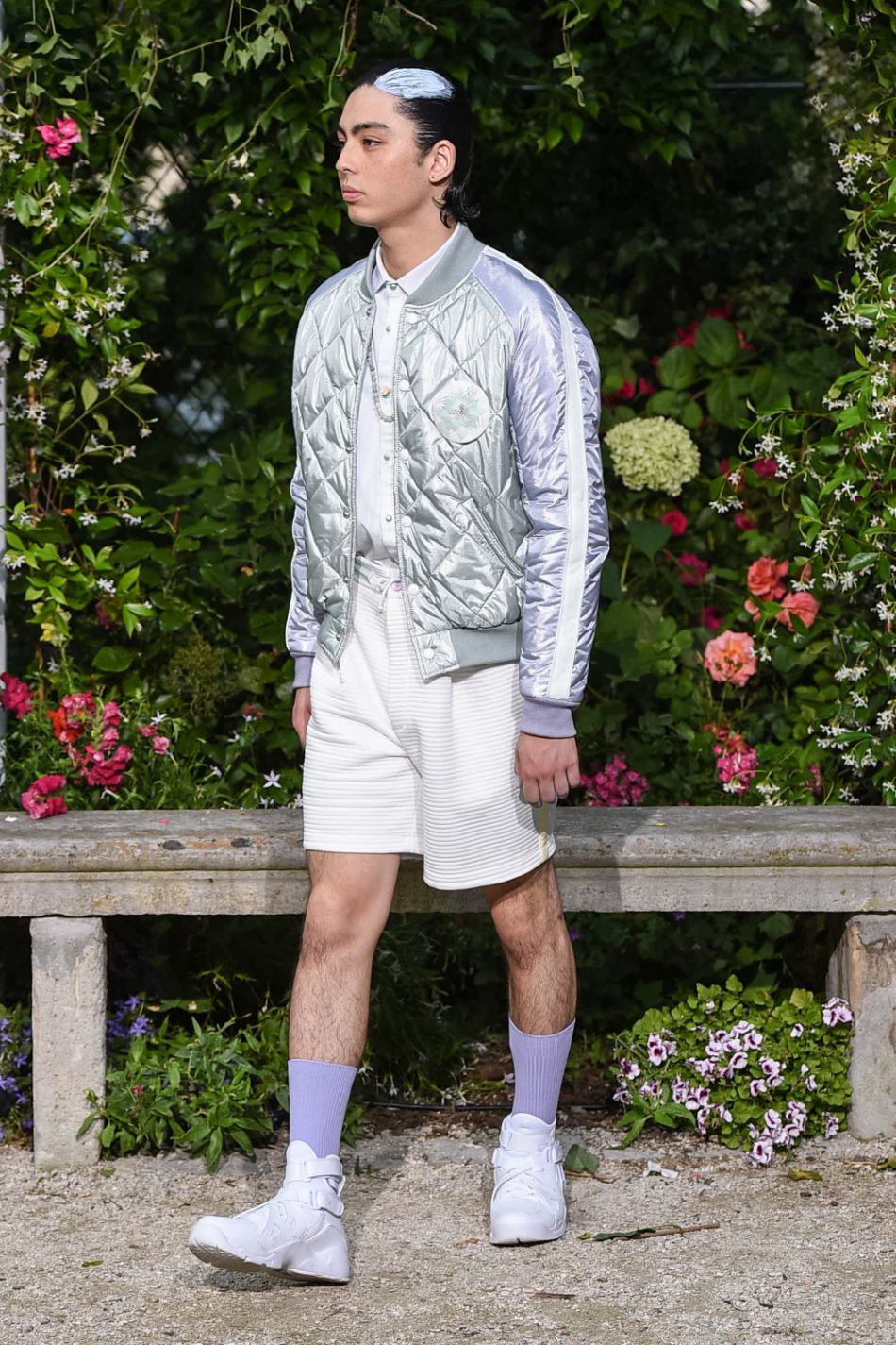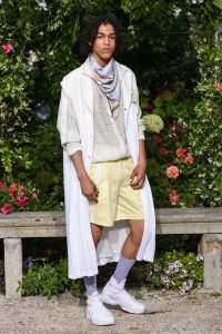 Le ton est donné à l’entrée des lieux : un jardin bucolique, une ribambelle de fleurs et des tables blanches dressées façon mariage en plein air. Les fleurs envahissent l’espace et composent même le logo du label français placé au fond de la cour. Pour cette nouvelle collection, Stéphane Ashpool tire son inspiration d’un souvenir d’enfance : le mariage de ses parents. Cérémonie oblige, les mannequins sont sur leurs 31. Cependant, le costume traditionnel a été évincé. A la place, on découvre des ensembles monochromes pastels à l’esprit sportswear. Elégance d’un nouveau genre, de la dégaine des modèles émane une assurance folle. Les cheveux sont gominés avec des paillettes multicolores, non sans rappeler l’audace de jeunes gangsters presque trop charmeurs.