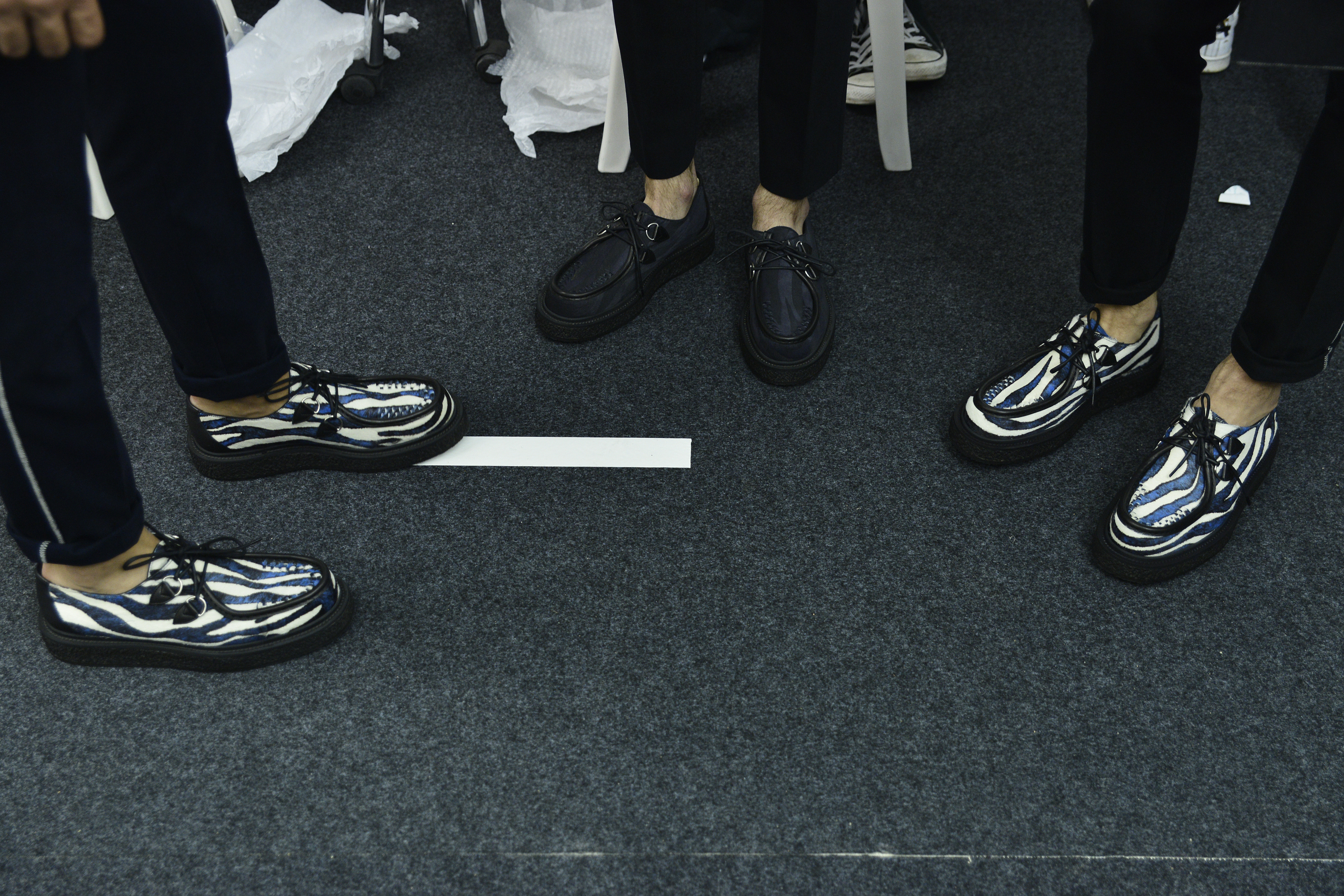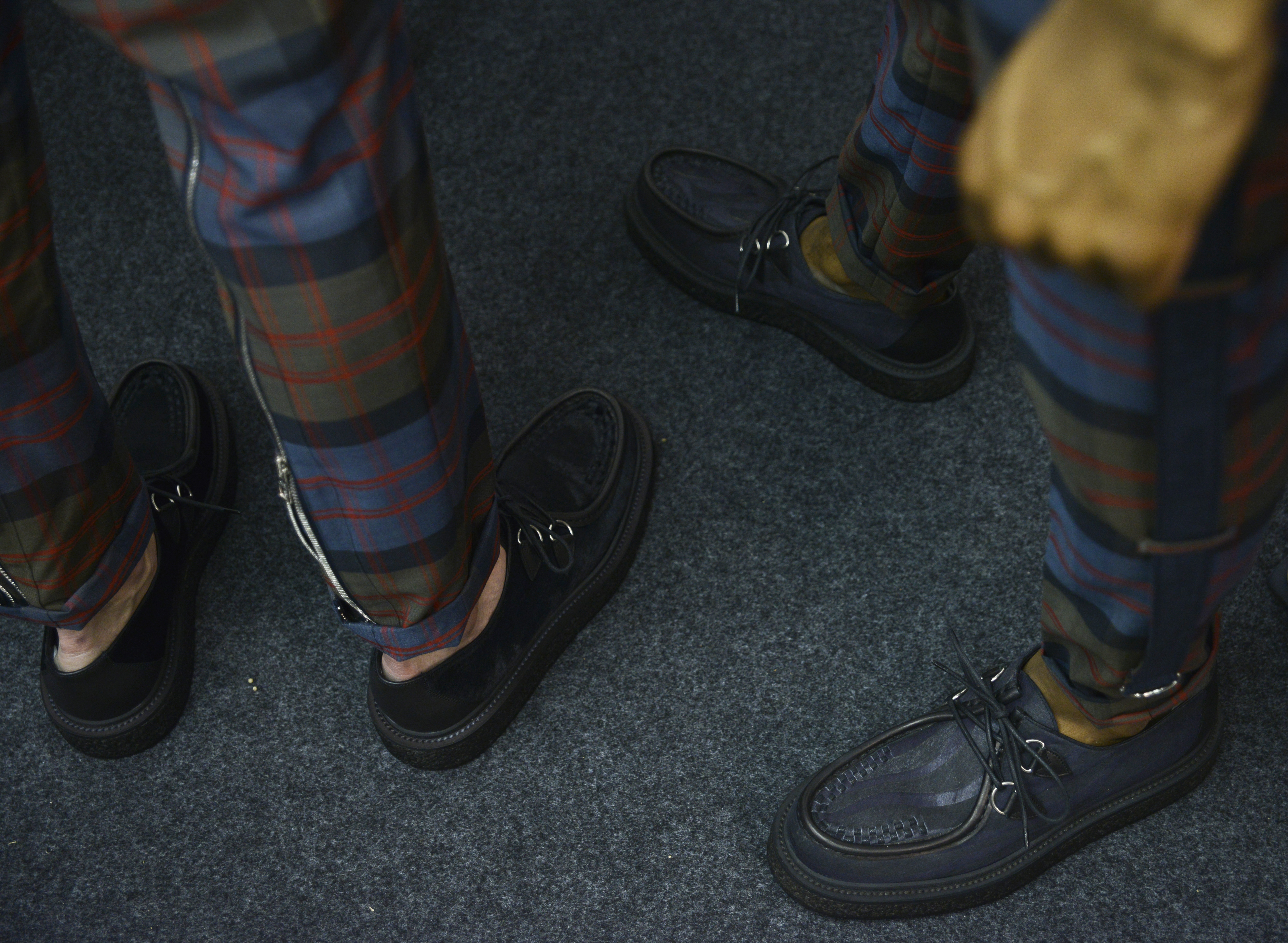 Imprimés d’animaux sauvages, blousons et trench en croco et cuir d’autruche, zèbres colorés dans un bleu de pétrole et peaux exotiques viennent s’assortir au style londonien : caoutchouc transparent, mohair, sangles, costumes revisités avec zip sur les jambes, vestes de motard, pantalons punk.
