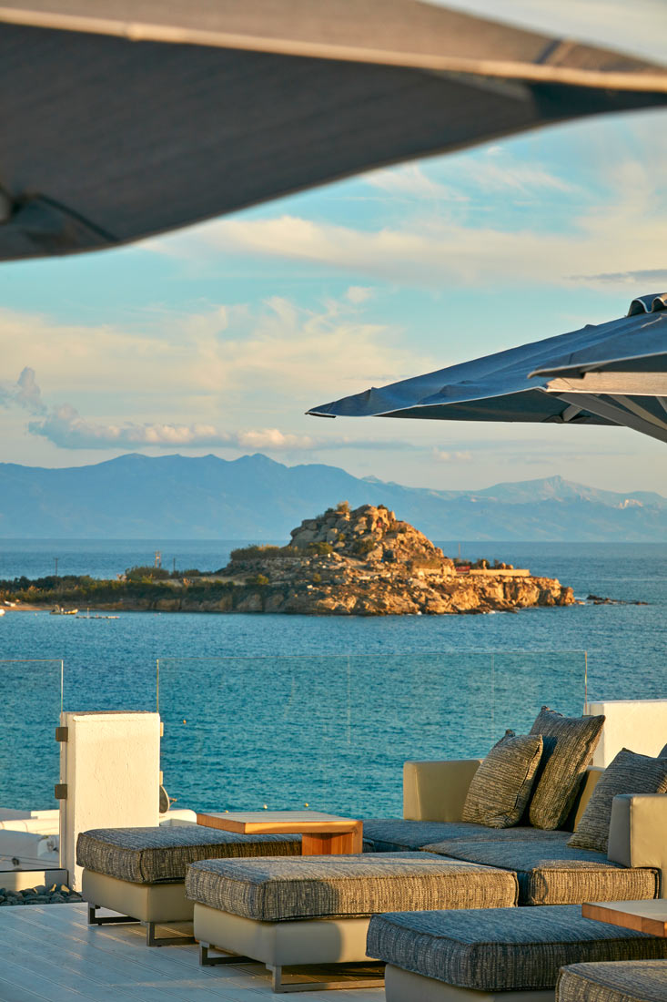 Mykonos se reflète dans chaque coin et recoin de l’hôtel : les lignes et textures du Myconian Ambassador évoquent les roches, la mer et le ciel grec. Les intérieurs se veulent aérés et spacieux, avec de larges fenêtres et miroirs qui invitent sans cesse à la contemplation.