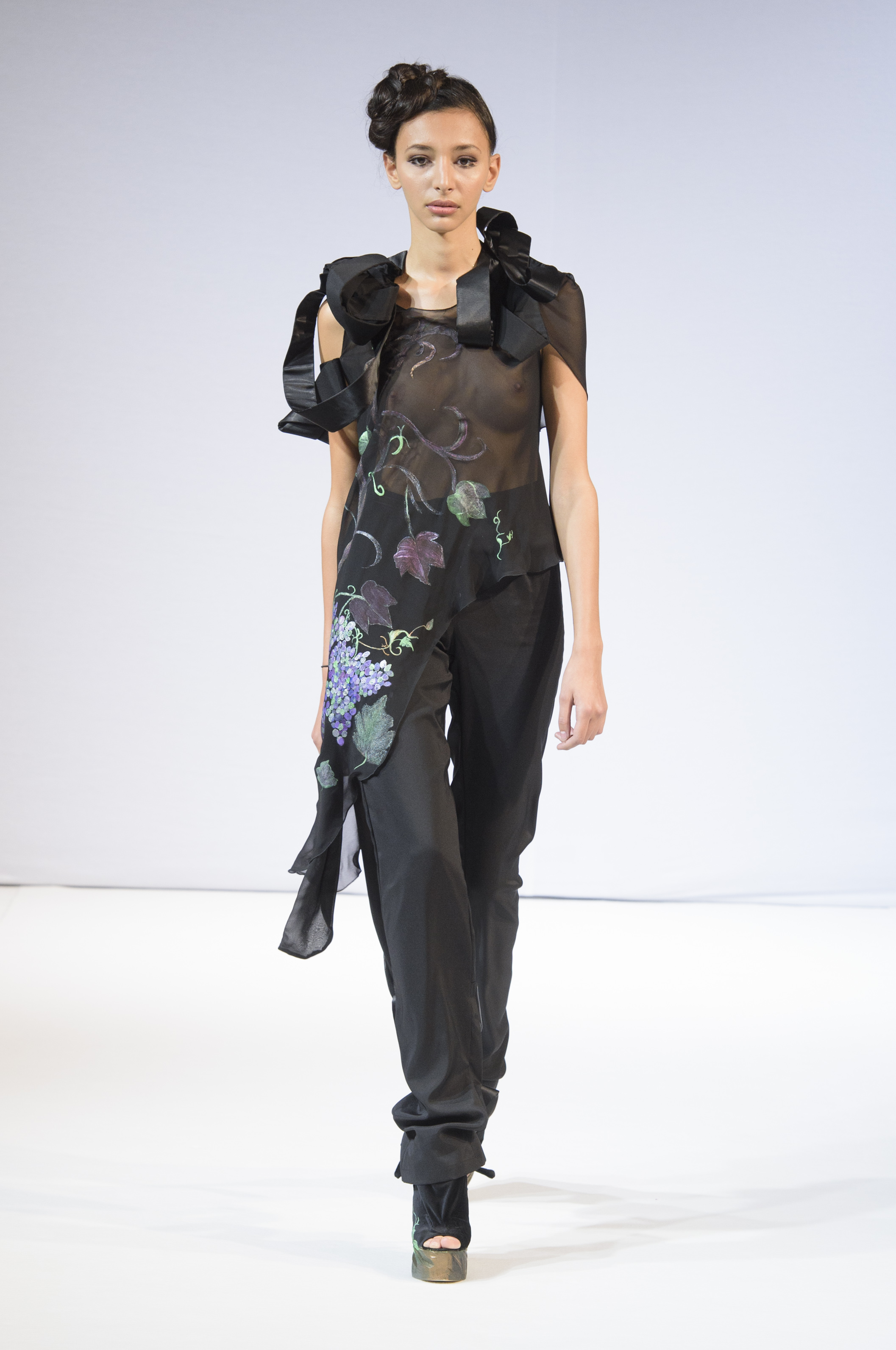 Ce défilé est un hymne à la joie de vivre et au bon goût, celui du grand vin. Silhouettes en ceps de vignes, ornements en feuilles découpées et chaussures sculptées dans le bois intensifient cette déclaration d’amour et l’immortalisent. De Jolies créatures électrisantes sortent de la nature pour nous faire goûter à ce millésime 2016.