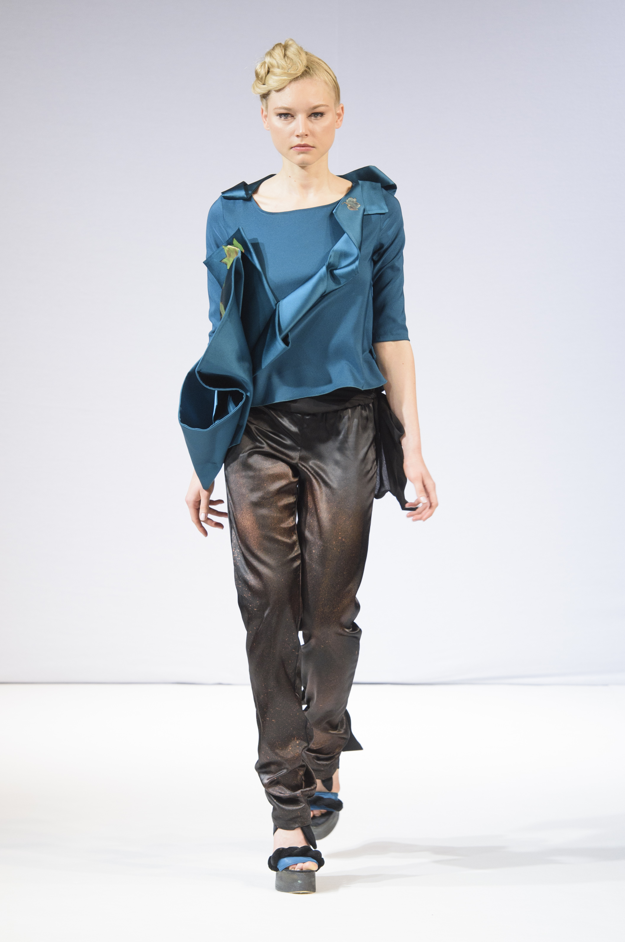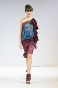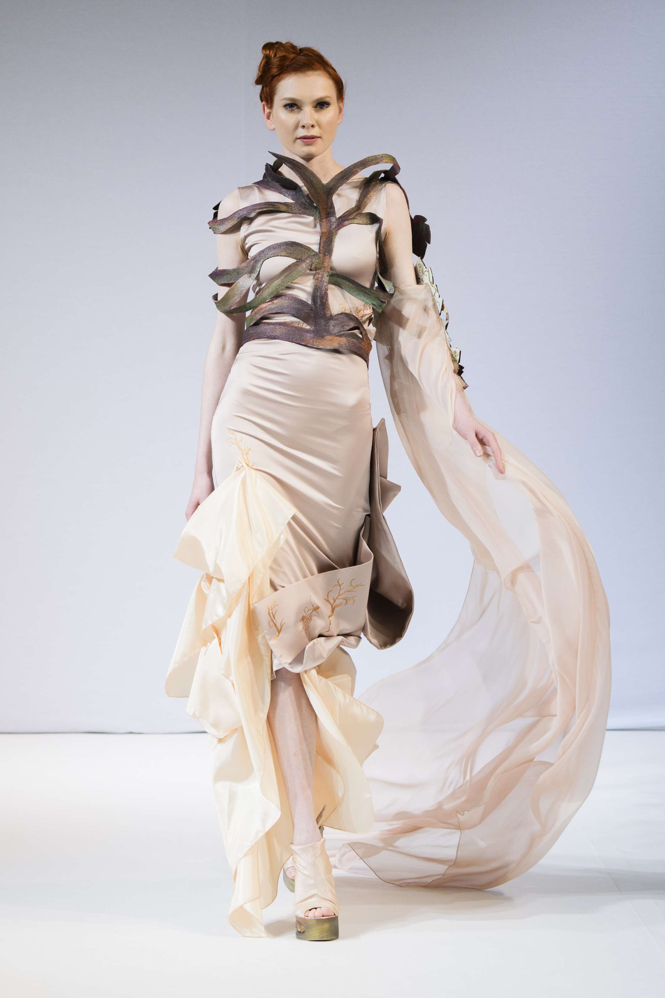 La soie, le velour et crêpe Goergette et mousseline mettent en valeur les formes dans les drapés et la fluidité. Le corps et le vêtement ne forment qu’un et pour mettre en avant le côté très nature et authentique de la vigne, ni fermeture éclair ni boutons ne sont présents sur les pièces.