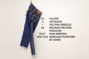 Elle déclare à propos de ses réalisations: » Je crée des pièces que tout le monde a ou a eu dans sa garde robe, excepté que je les réalise avec des techniques artisanales. Je trouve que notre relation actuelle à acheter et posséder très dégoûtante. On n’achète plus seulement les choses qu’on aime, ni des choses que nous avons l’intention de garder, nous sommes seulement intéressé par les choses qui sont bon marché et aisément accessible. Tout est jetable. Mon travail est une réaction à ces façons d’agir. Je me concentre sur le denim comme le symbole de l’industrie du vêtement, un objet de tous les jours, sans valeur pour la plupart, porté par tant de personnes. J’ai travaillé de longues heures dessus pour ajouter de la valeur où très peu de choses sont habituellement observée. Pourquoi une paire de denim que vous portez tous les jours devrait être au même degré d’attention que la couture d’une robe destinée à être porter qu’une seule fois ? »