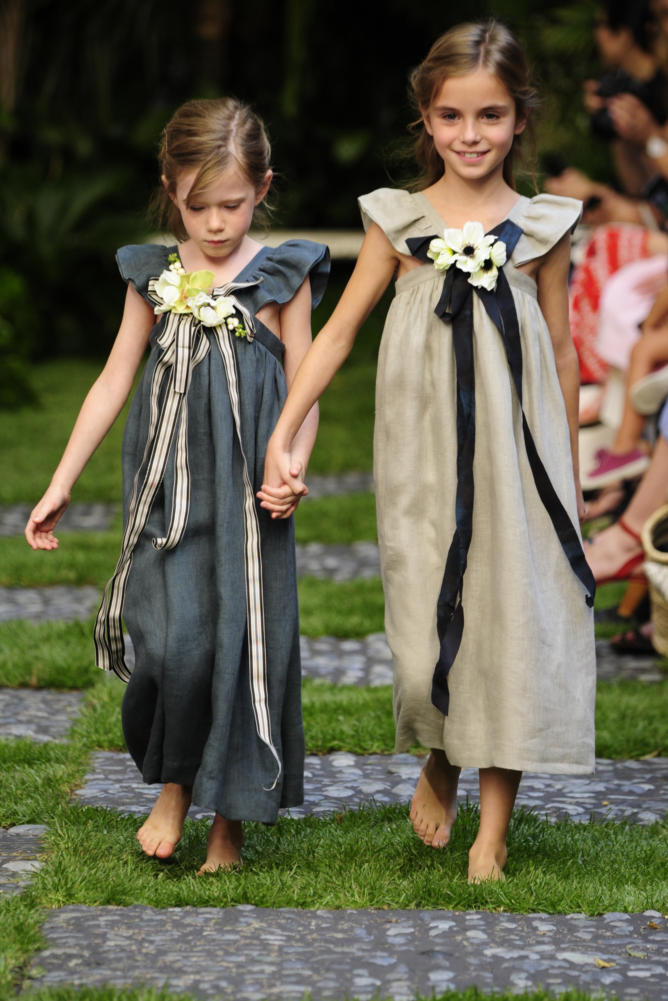 Les fillettes enfilent des robes et jupons brodés, des shorts de marquises, réinterprétées et modernisées. Les tenues rendant hommage à la période de Gauguin vibrent au rythme de la couleur avec harmonie et naïveté. Les textiles s’illuminent de rouges pavots profonds, de jaunes citron, de verts émeraude, et d’imprimes fleuris.