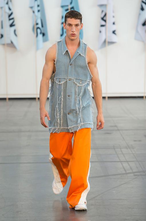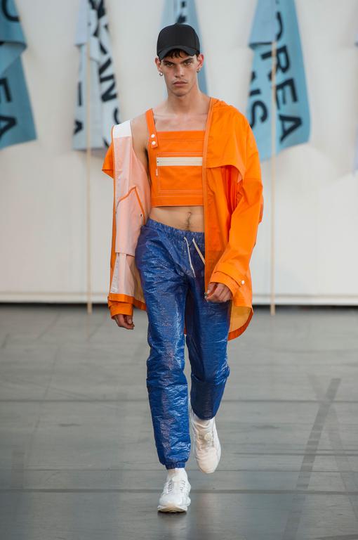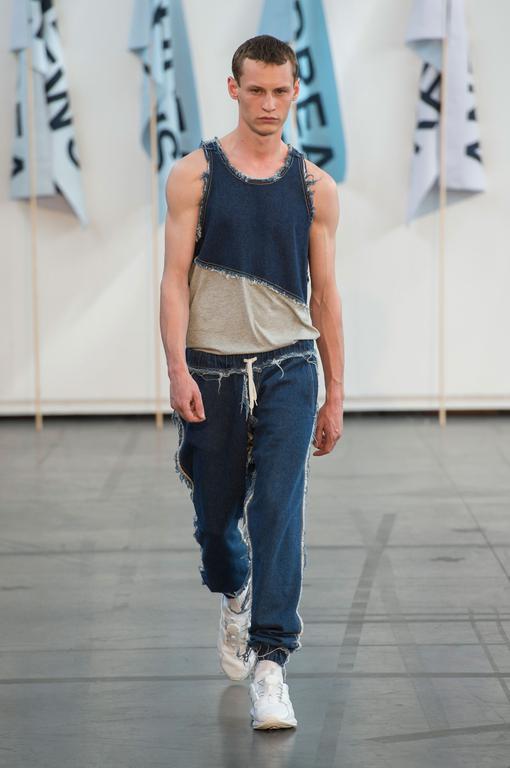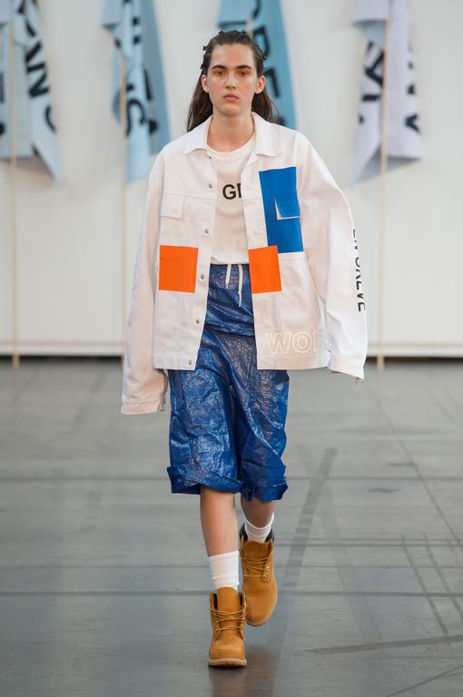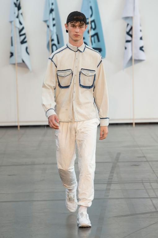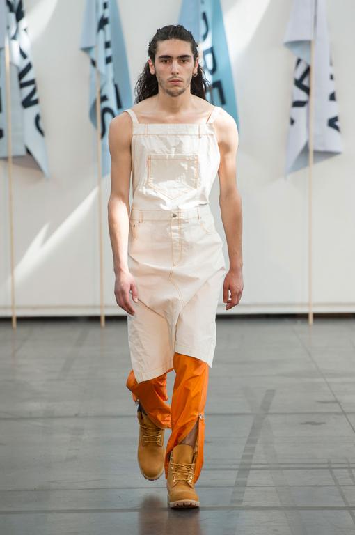 Les silhouettes sont relativement épurées, pas d’accessoires ou de détails superflus, seules les pièces sont misent à l’honneur. Elles même sont assez minimalistes, tee shirt blanc, tablier simple et salopette en denim épurée, la marque se concentre sur l’essentiel. Du côté de la présentation, la marque a opté pour une levée de drapeau au nom d’Andrea Crews, qui peut nous faire penser à une levée de drapeaux lors de mai 68, et donc de la révolution industrielle. Ce qui accentue toujours plus le thème mis en avant.